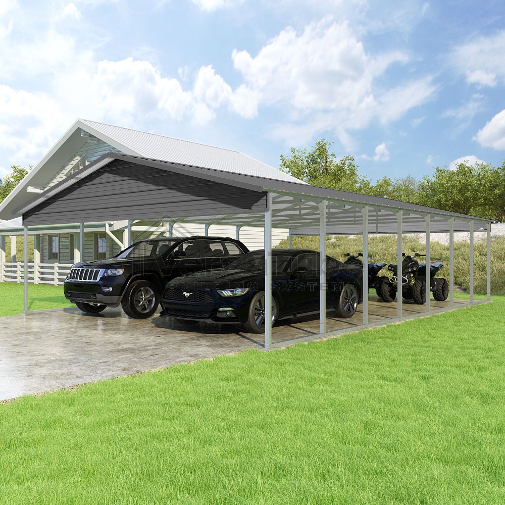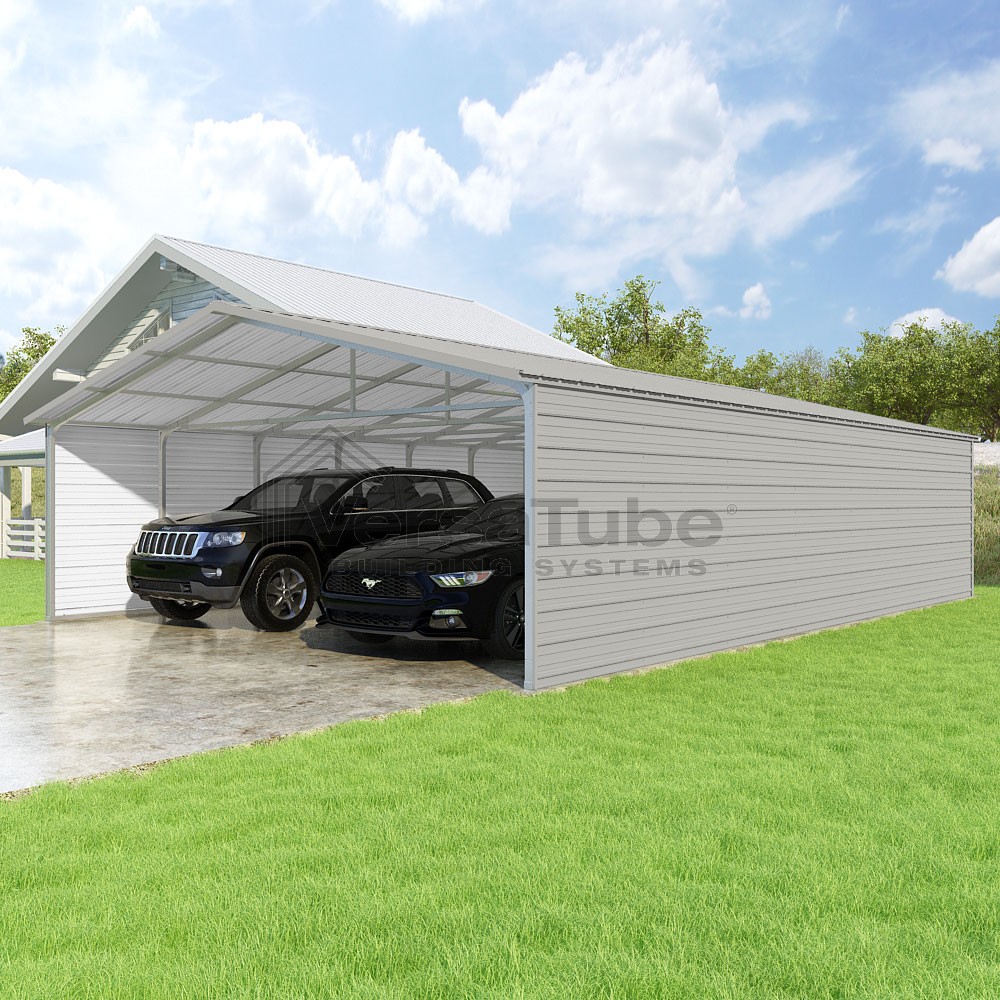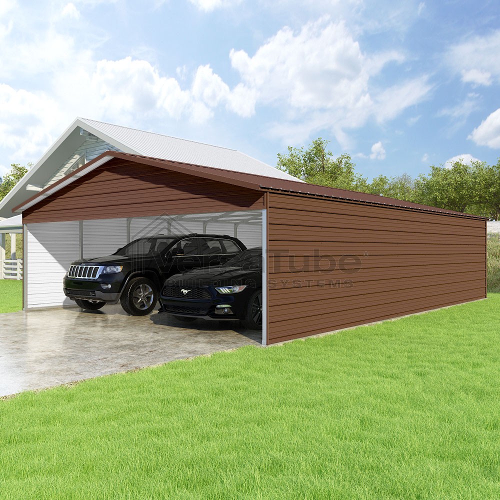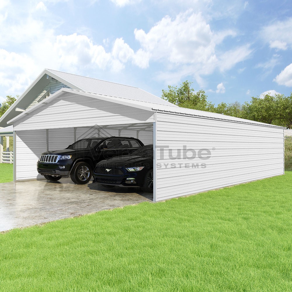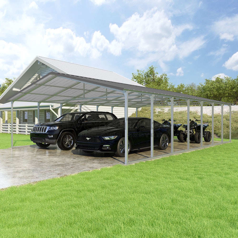 Pinnacle Series DIY carport kit features vertical sheet metal roof panels with ridge cap, gable and eave trim for an A-frame roof style and extended coverage on both ends.