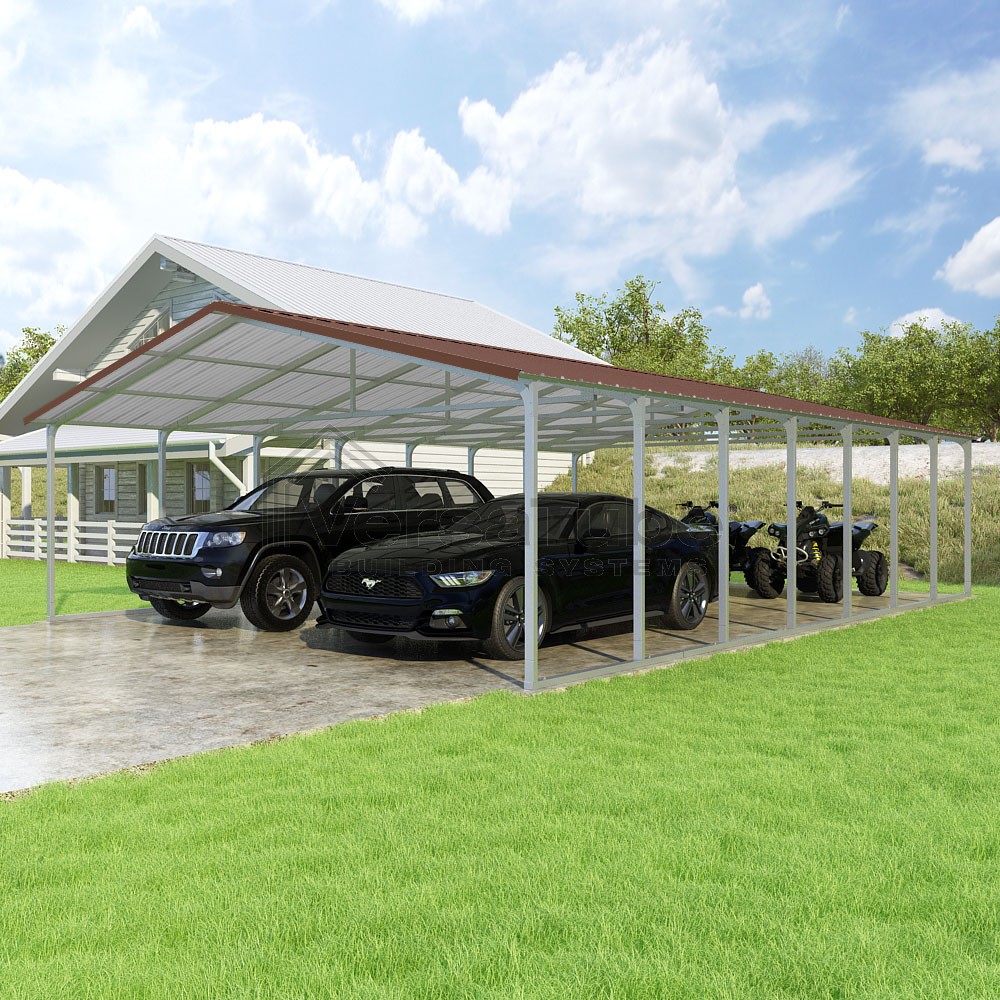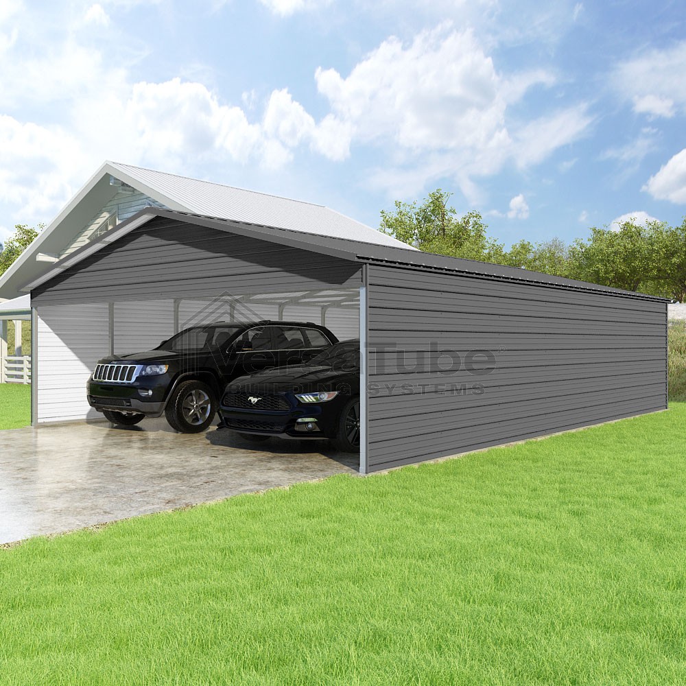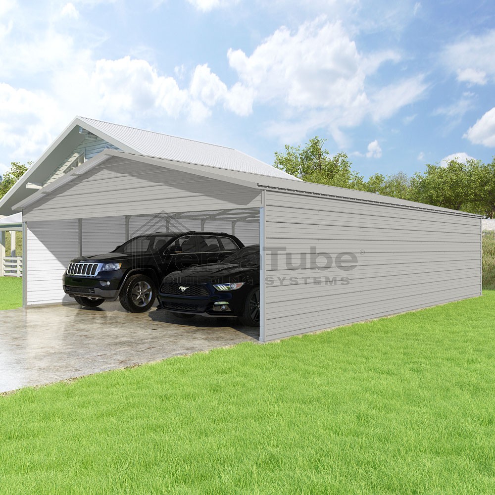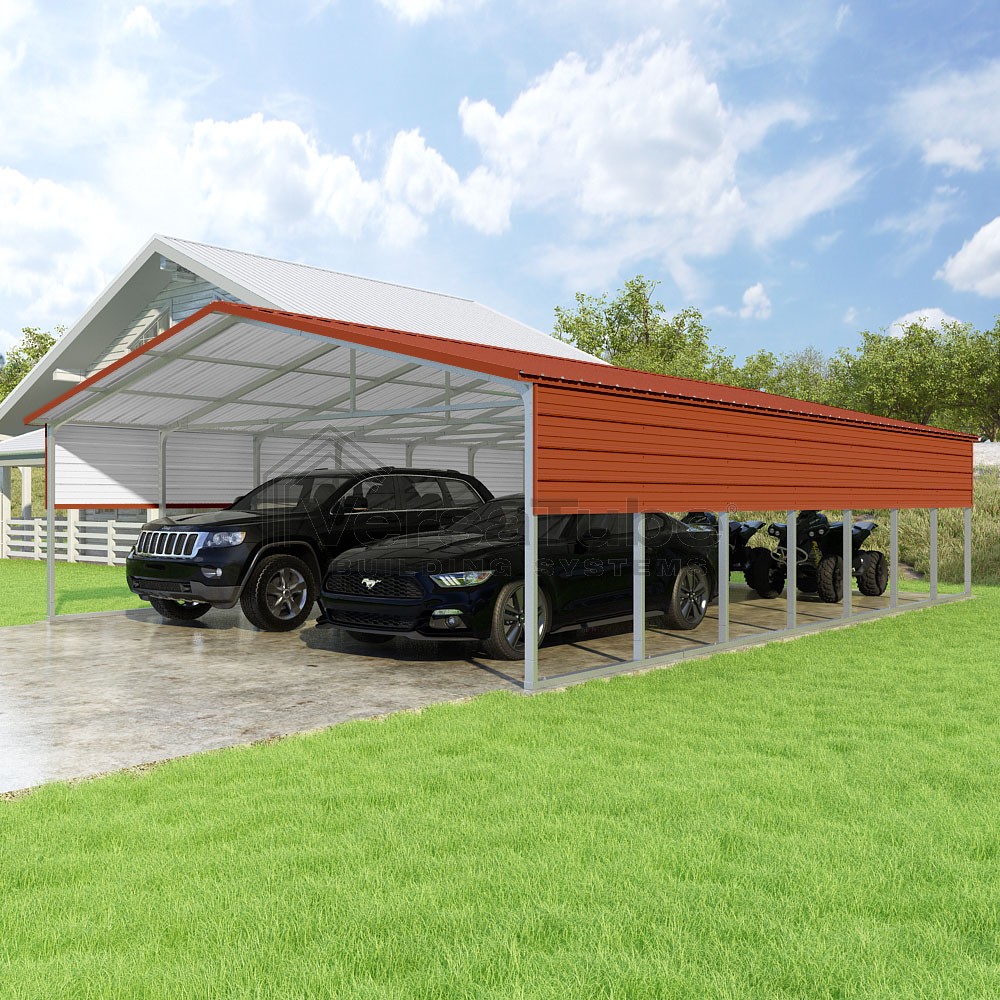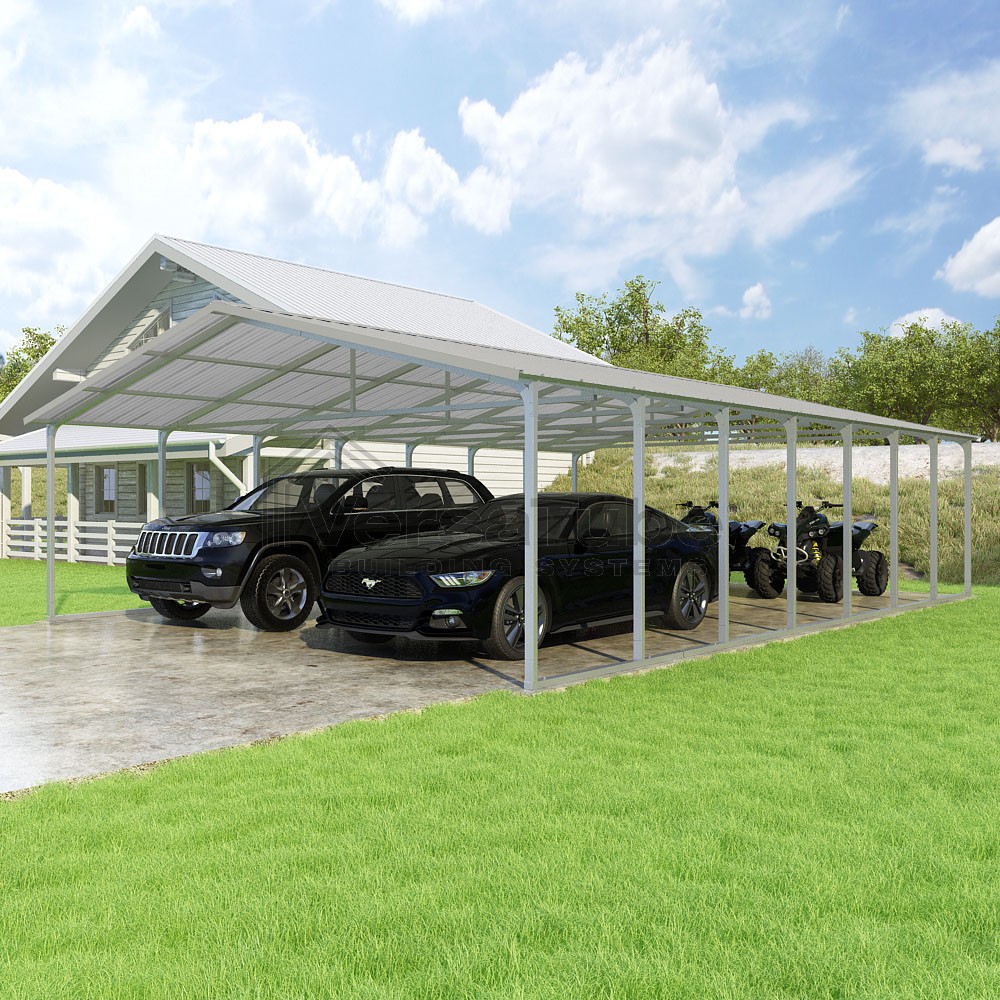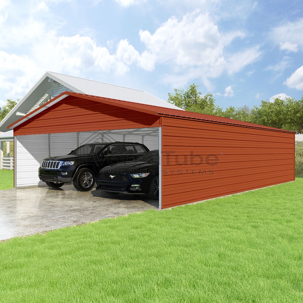 Pinnacle Series DIY carport kit features vertical sheet metal roof panels with ridge cap, gable and eave trim for an A-frame roof style and extended coverage on both ends.