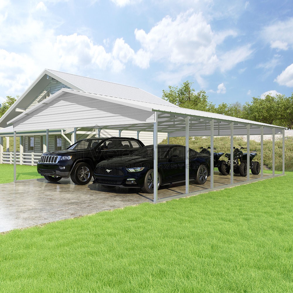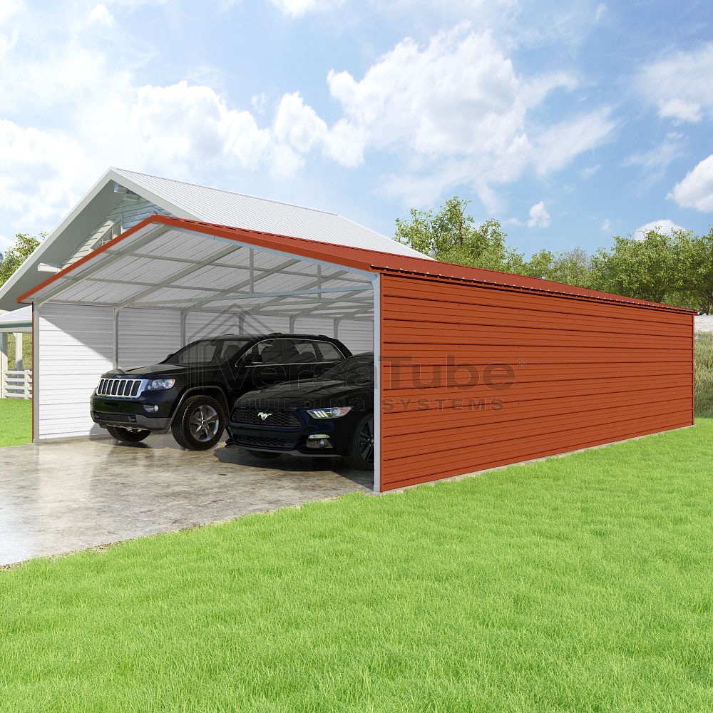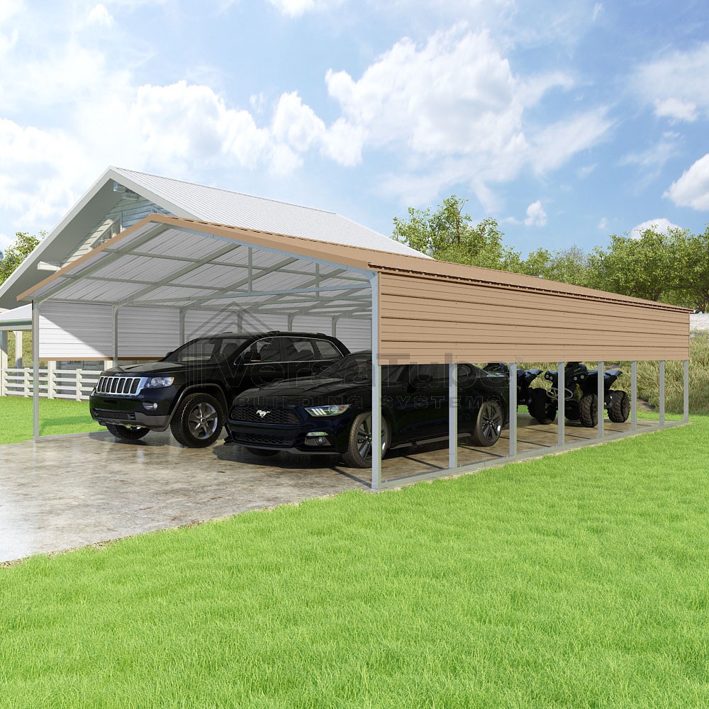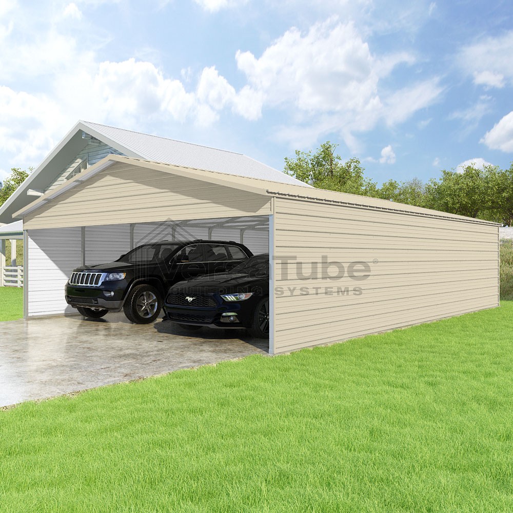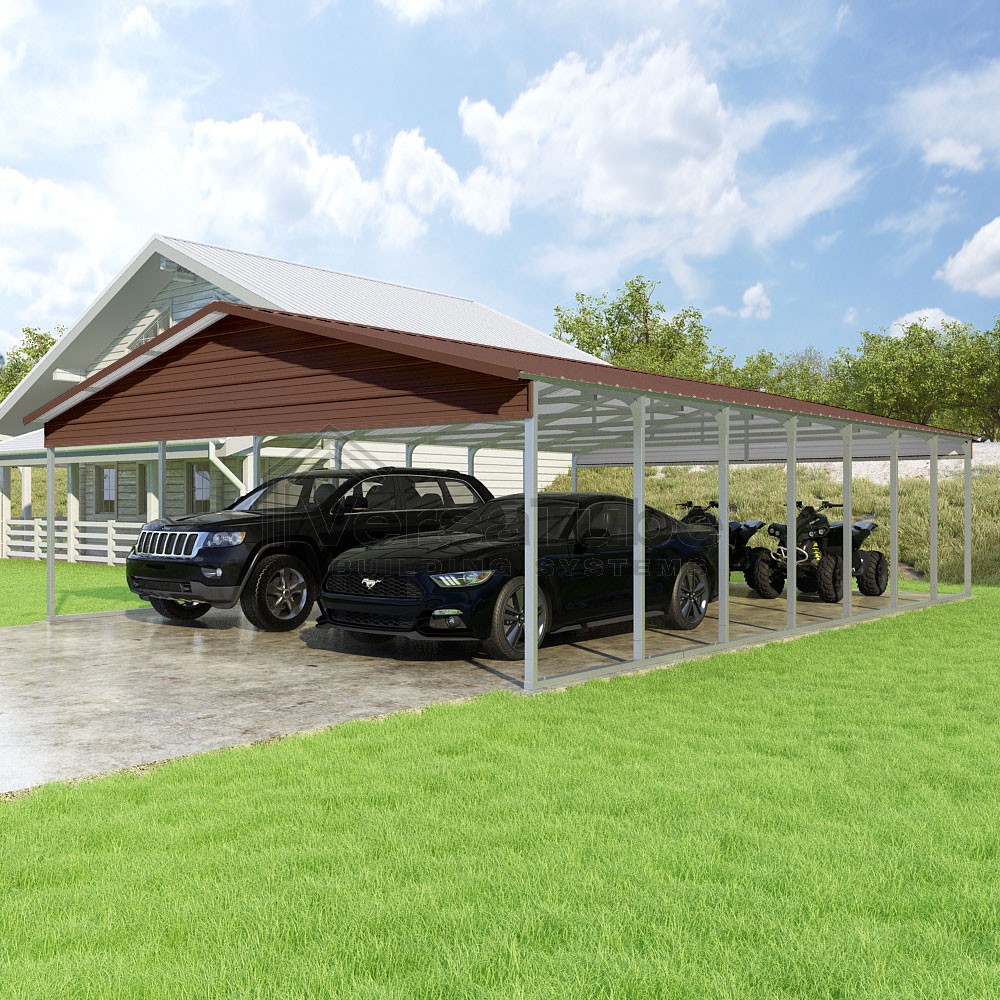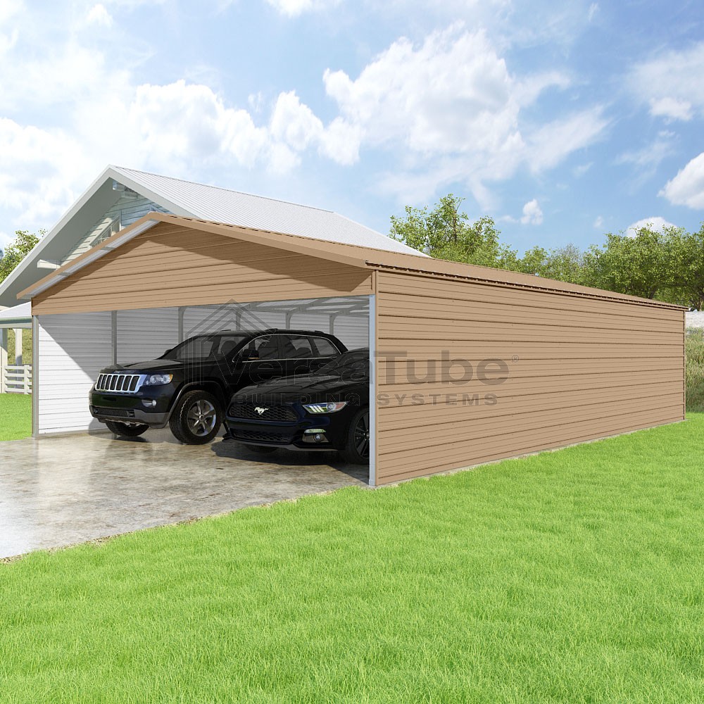 Pinnacle Series DIY carport kit features vertical sheet metal roof panels with ridge cap, gable and eave trim for an A-frame roof style and extended coverage on both ends.