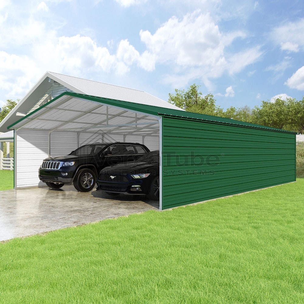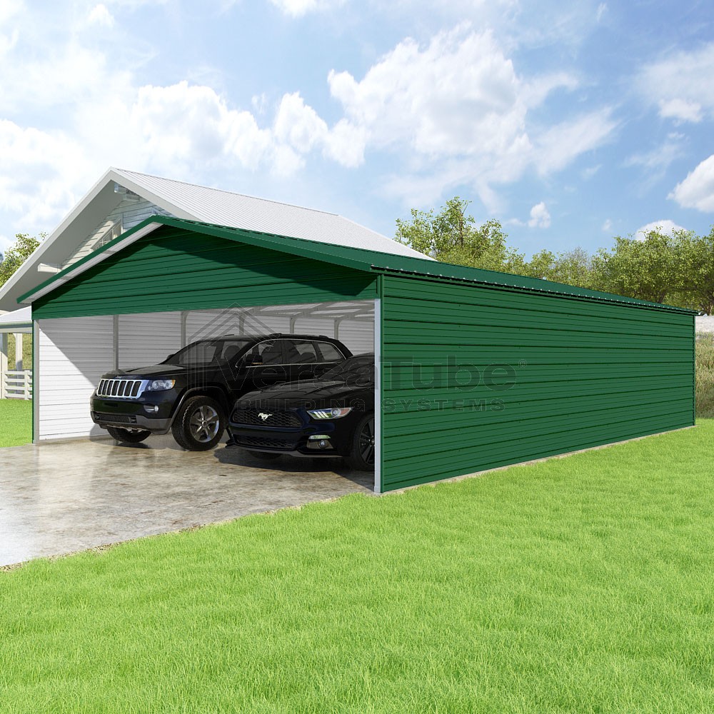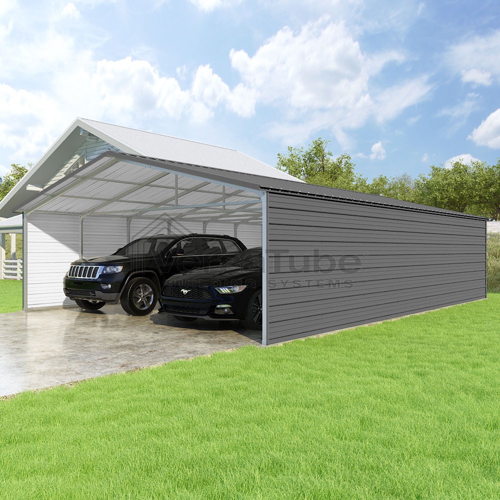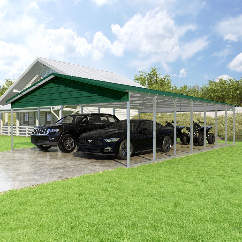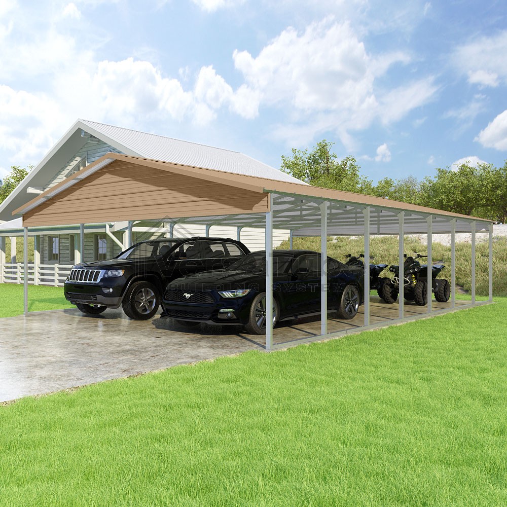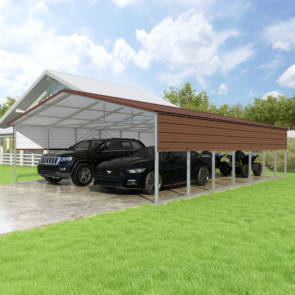 Pinnacle Series DIY carport kit features vertical sheet metal roof panels with ridge cap, gable and eave trim for an A-frame roof style and extended coverage on both ends.