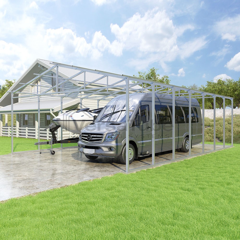 The Pinnacle design utilizes a vertical sheet metal roof application allowing for greater snow, rain, and debris run-off which is ideal for higher snow load areas. Adding a side kit run ensures structural performance in more extreme snow or high wind areas, as well, additional protection from elements entering from the sides. With the VersaTube Slip-Fit frame system, you can get your carport frame kit assembled in a single afternoon using common tools.