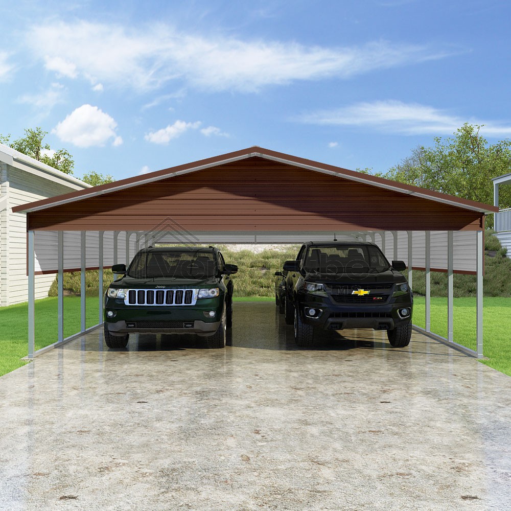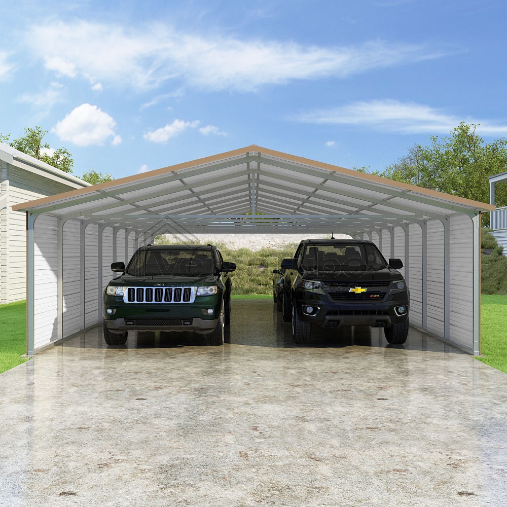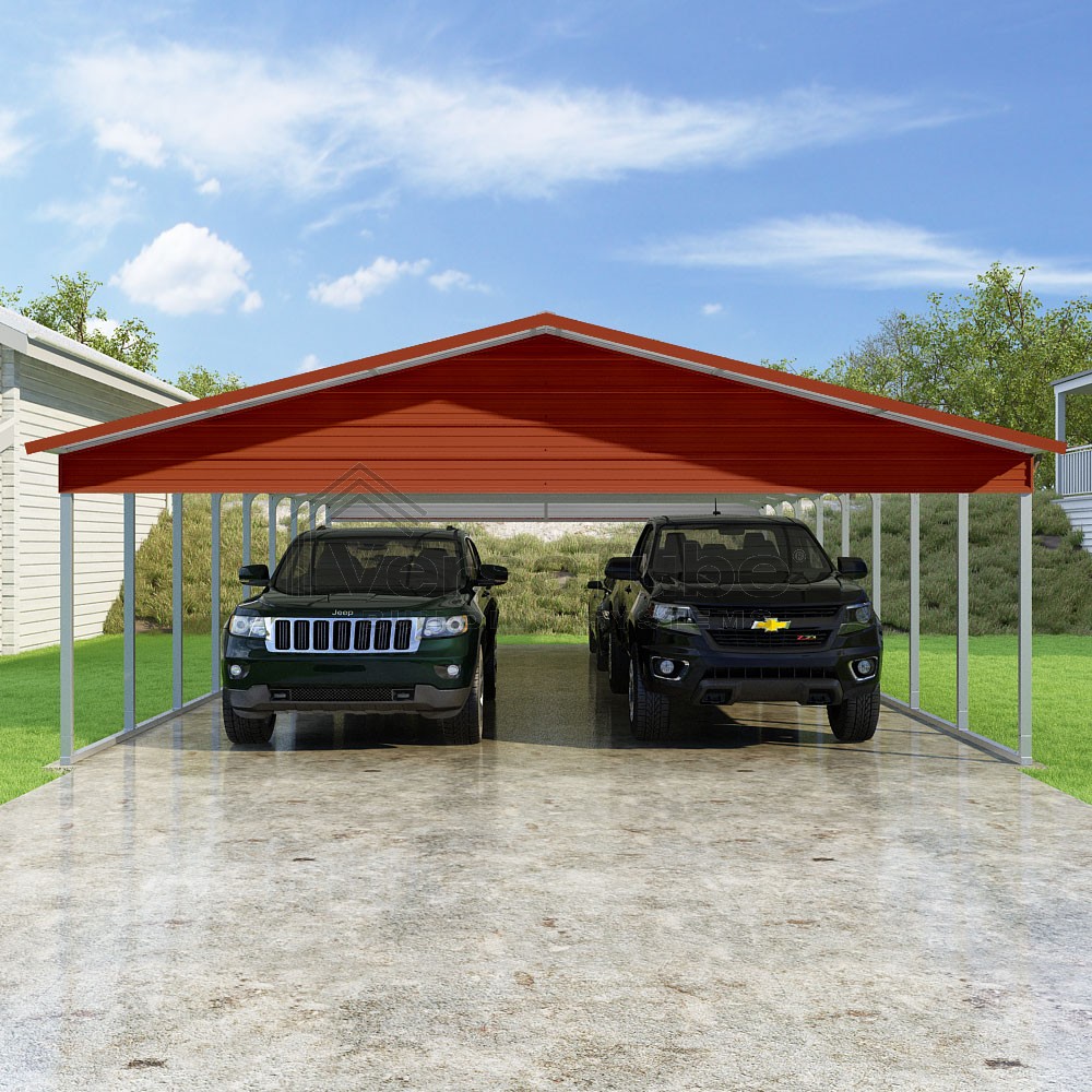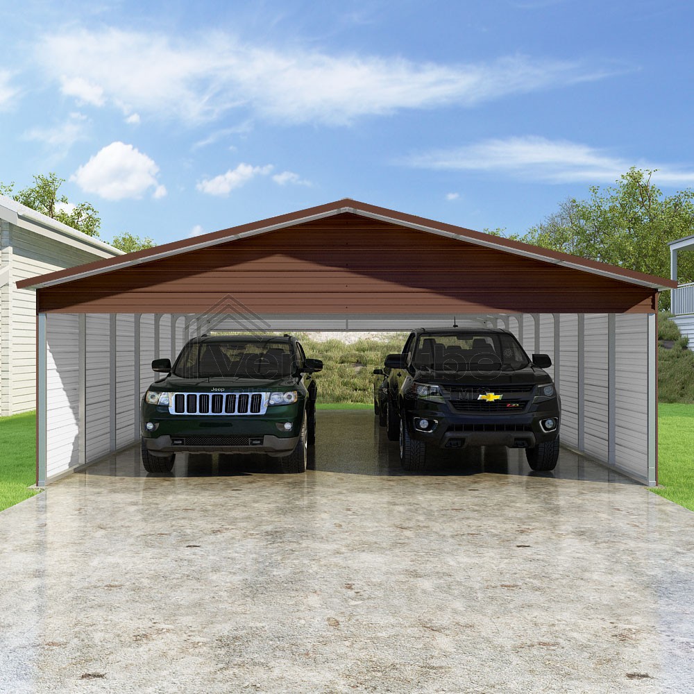Pinnacle Series DIY carport kit features vertical sheet metal roof panels with ridge cap, gable and eave trim for an A-frame roof style and extended coverage on both ends.