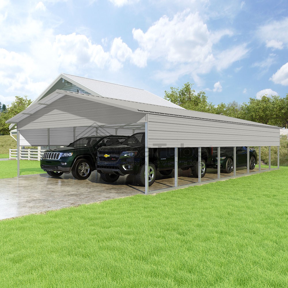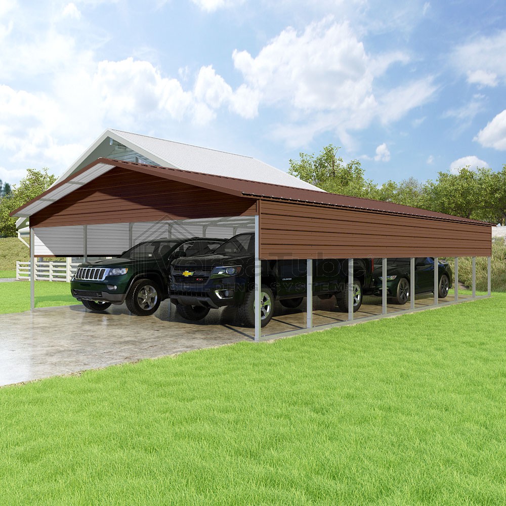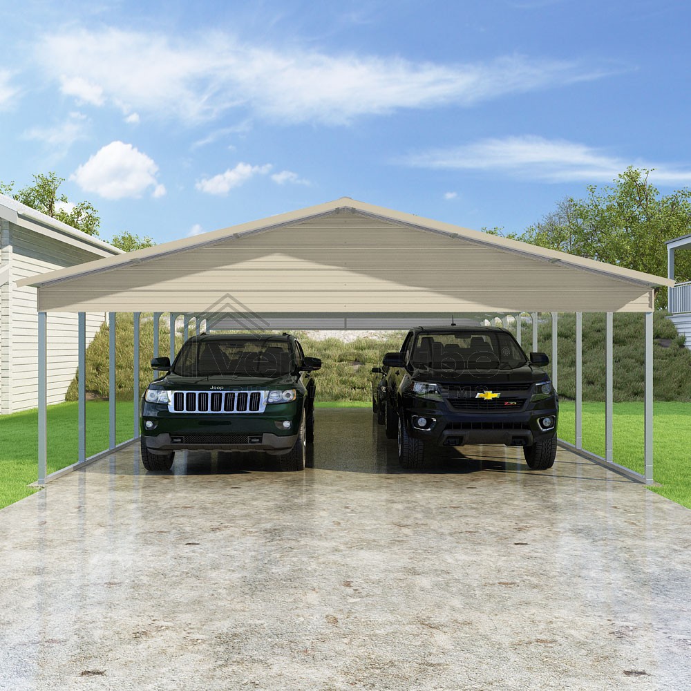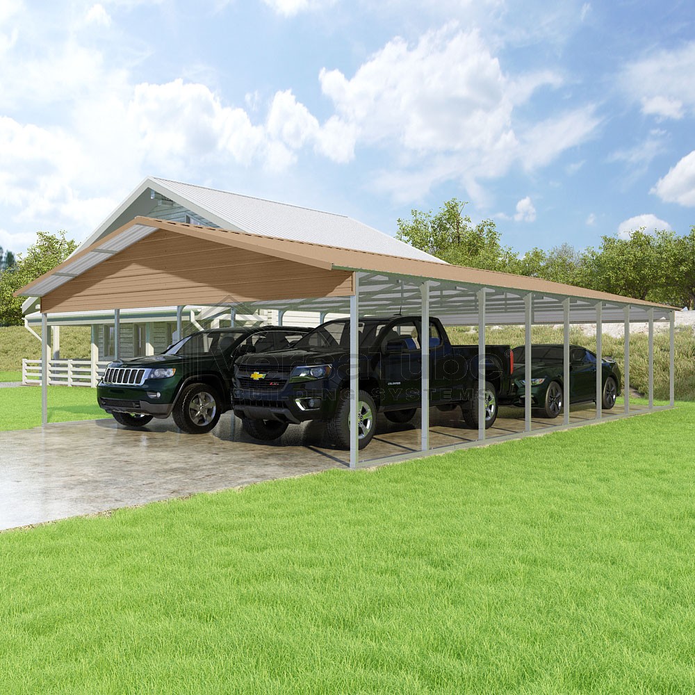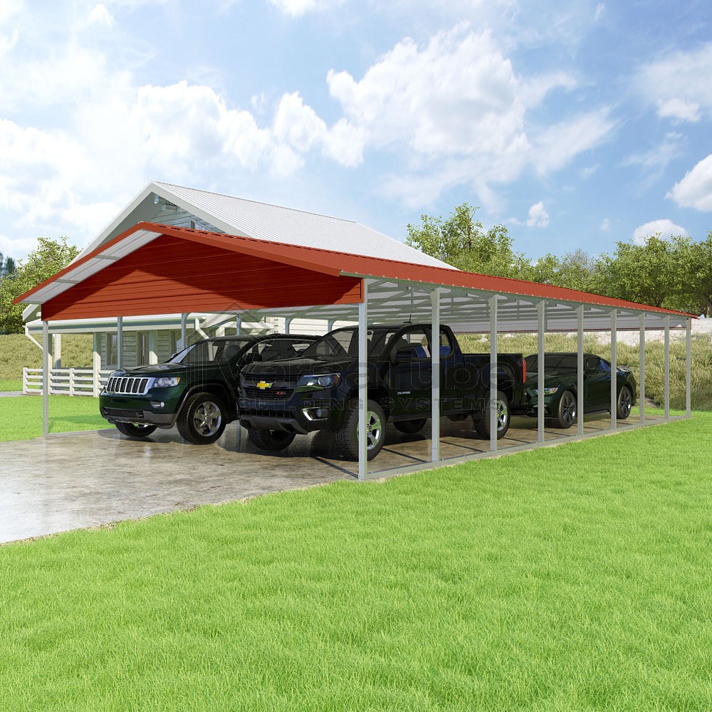 Pinnacle Series DIY carport kit features vertical sheet metal roof panels with ridge cap, gable and eave trim for an A-frame roof style and extended coverage on both ends.