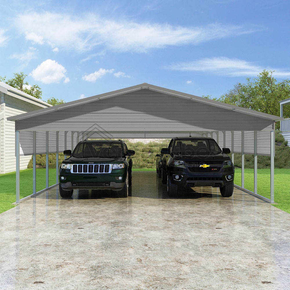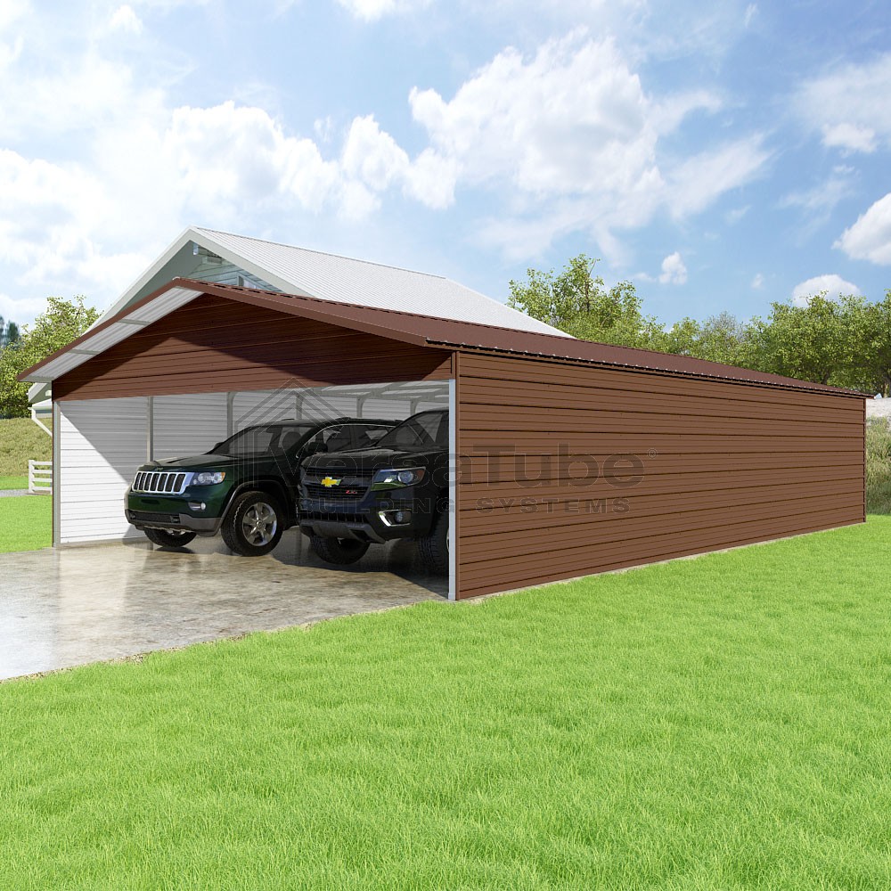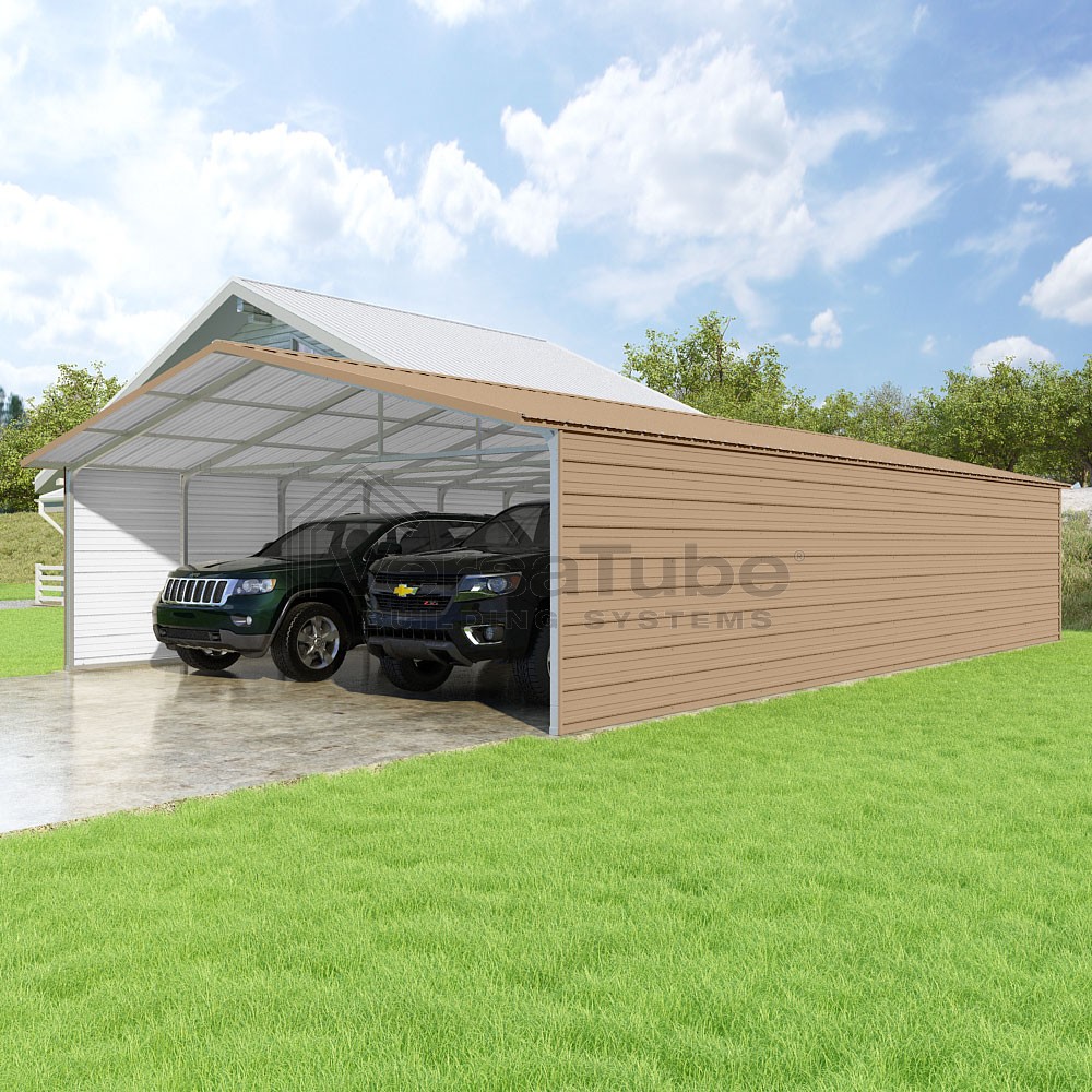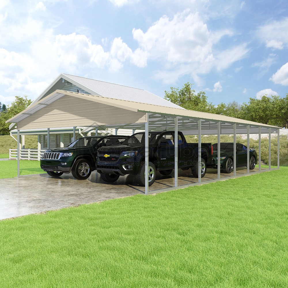 Pinnacle Series DIY carport kit features vertical sheet metal roof panels with ridge cap, gable and eave trim for an A-frame roof style and extended coverage on both ends.