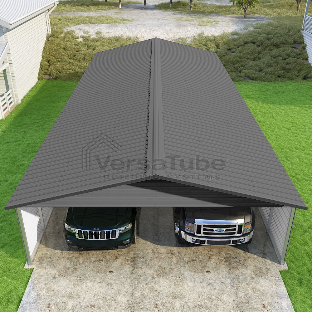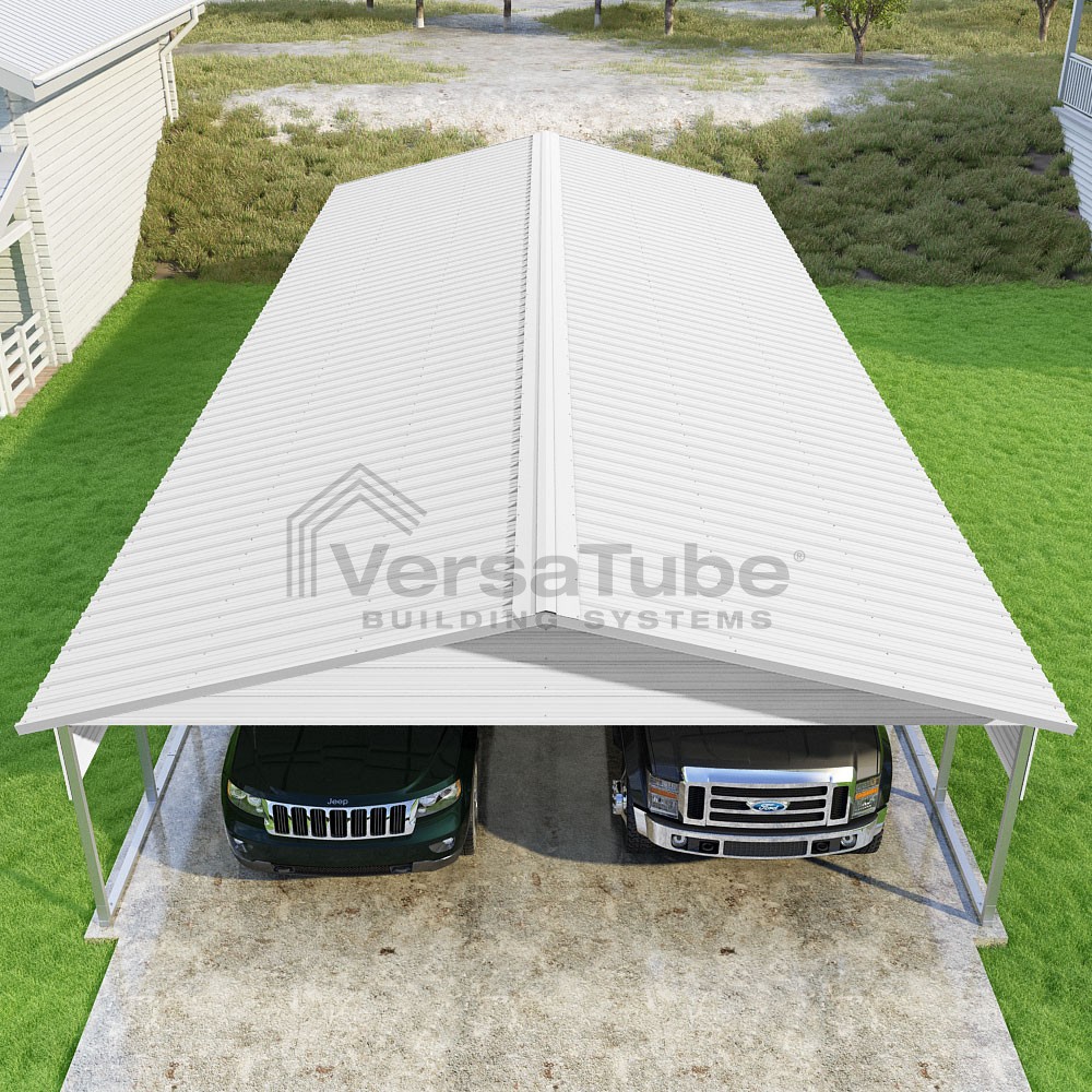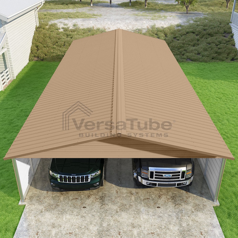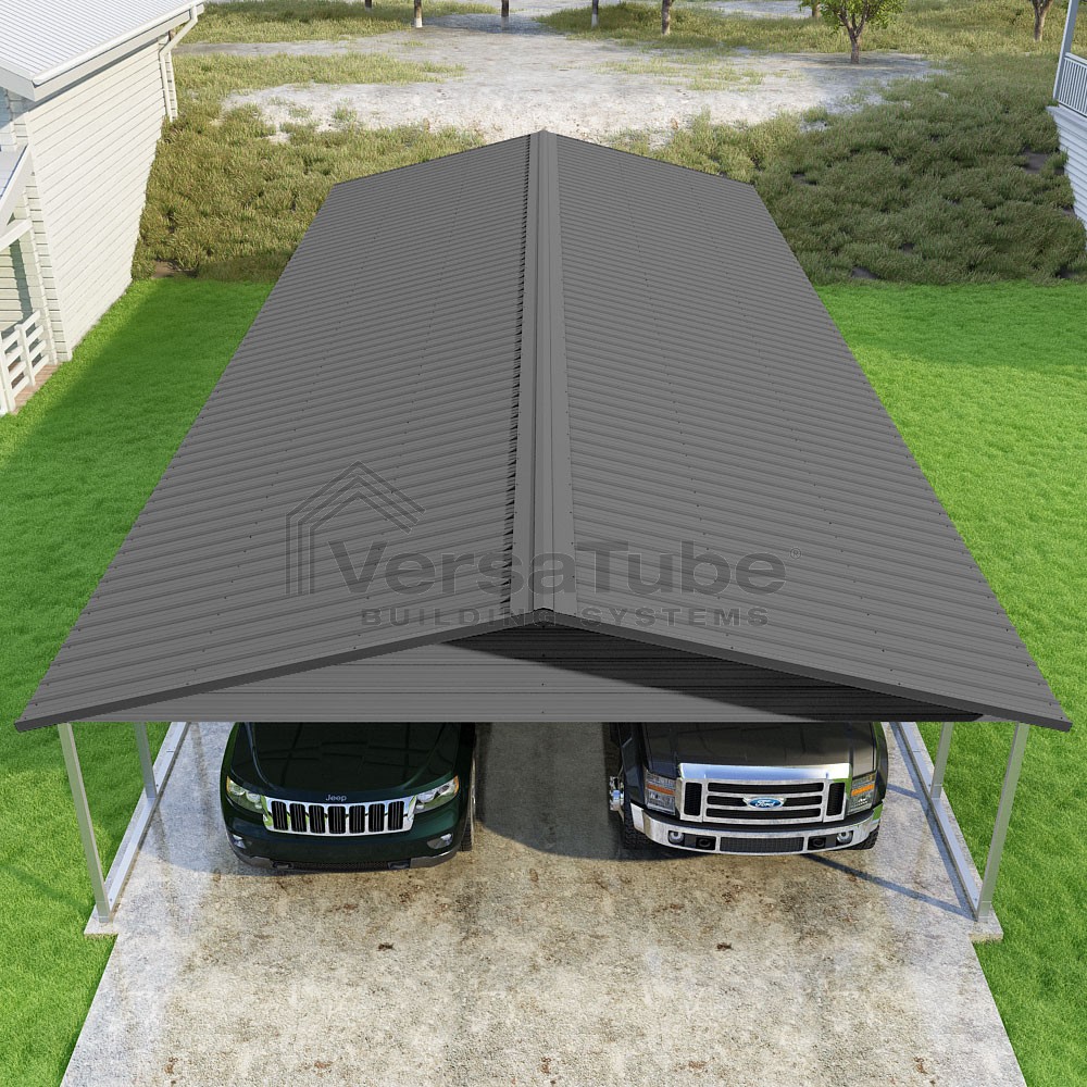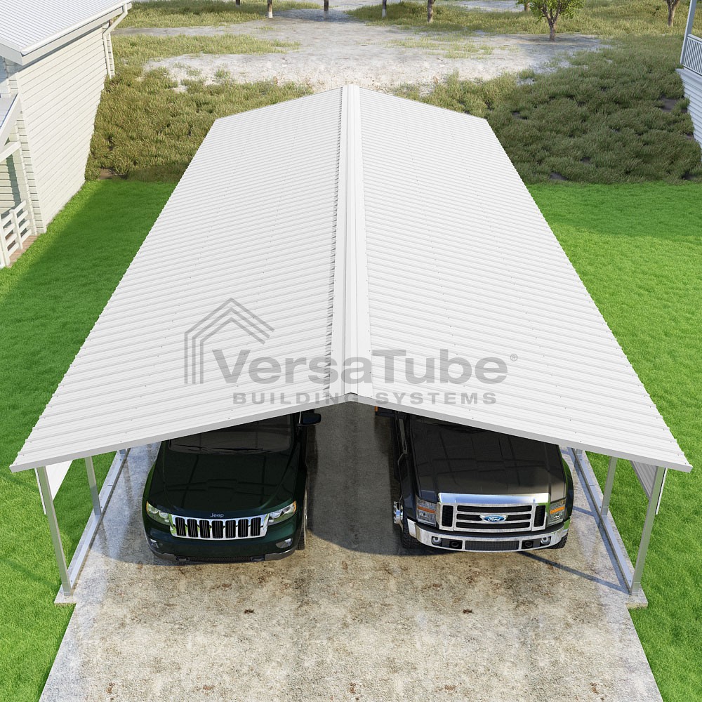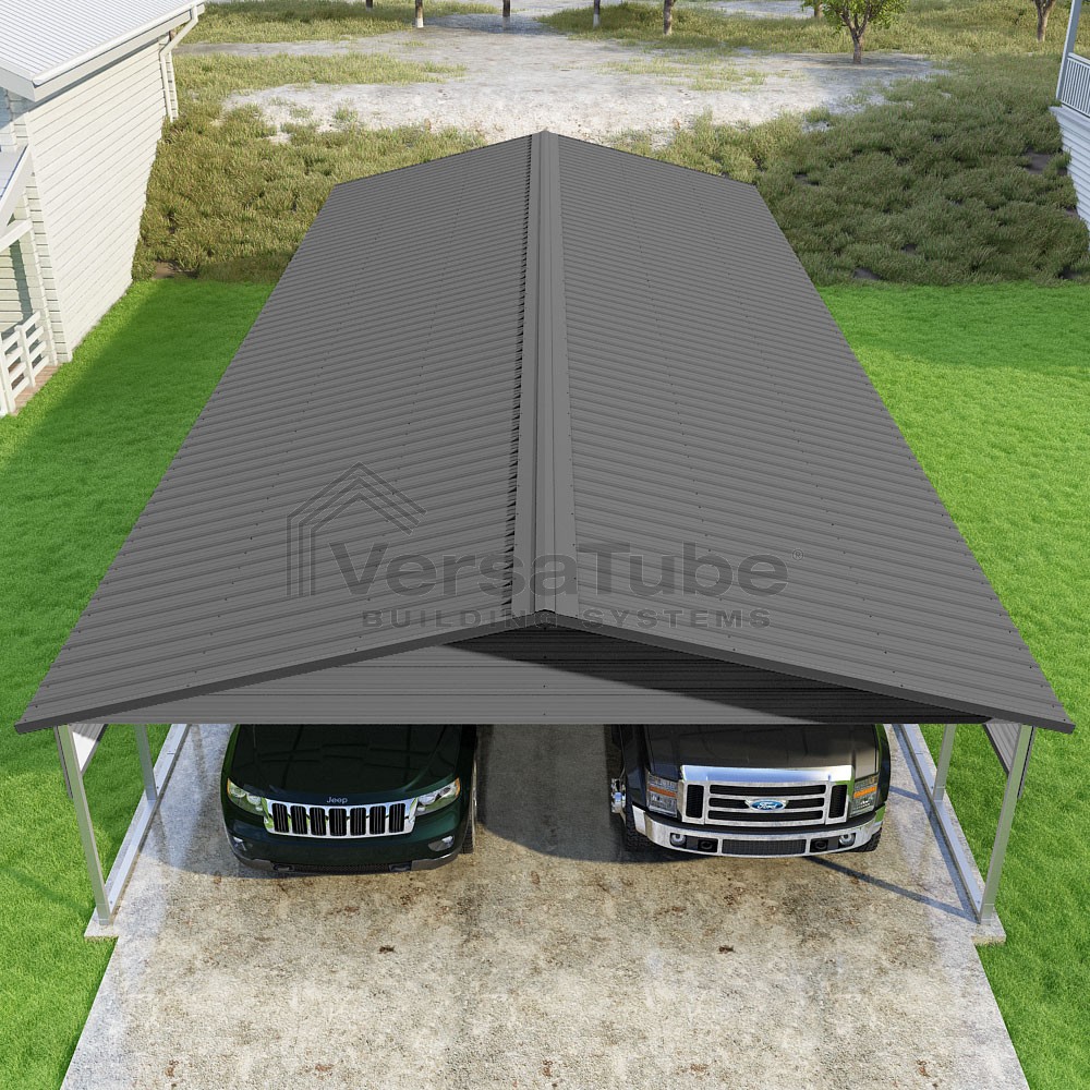 Pinnacle Series DIY carport kit features vertical sheet metal roof panels with ridge cap, gable and eave trim for an A-frame roof style and extended coverage on both ends.