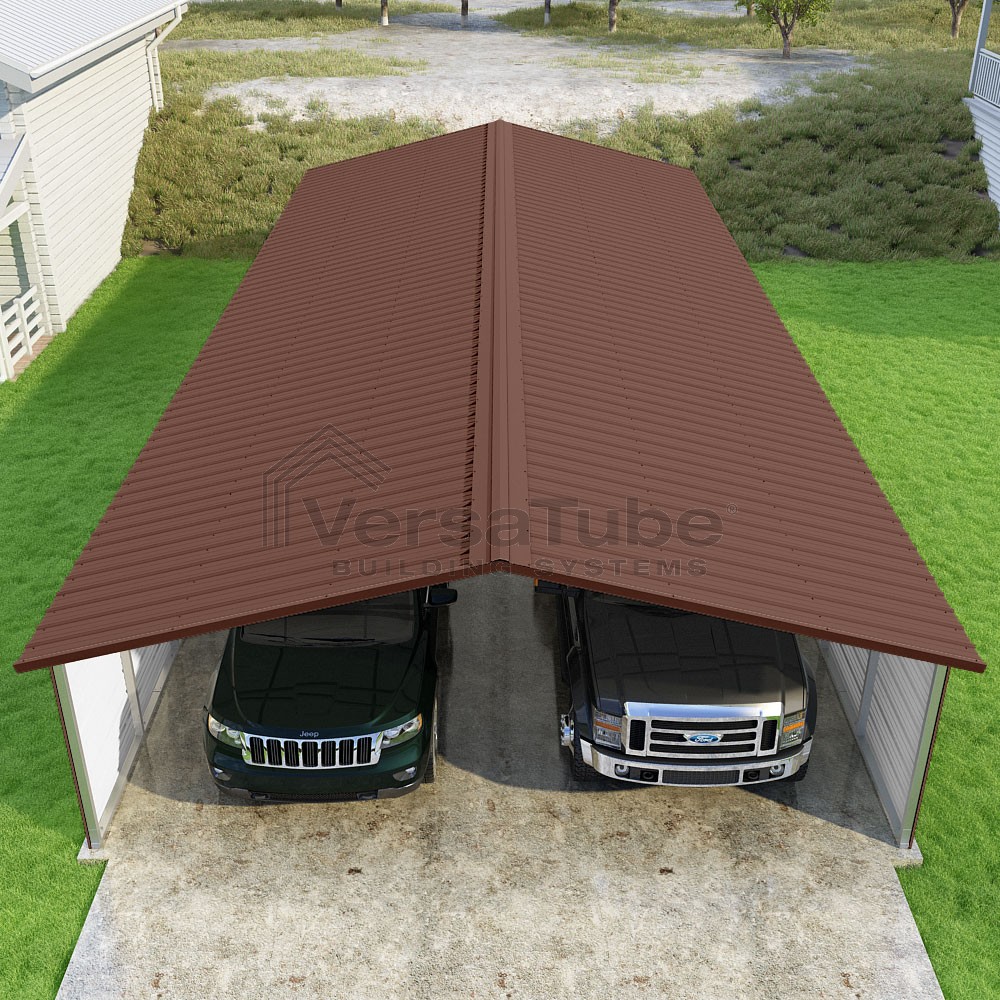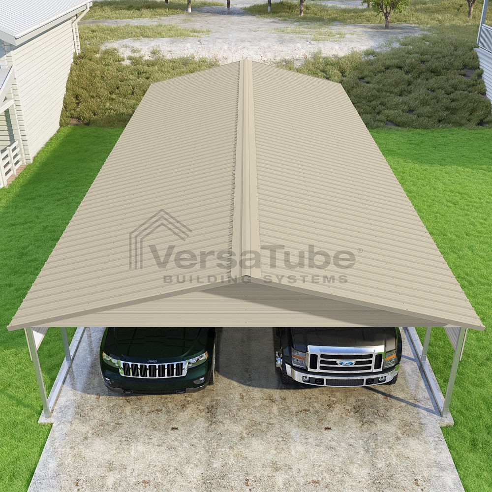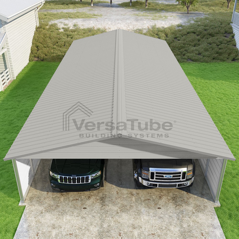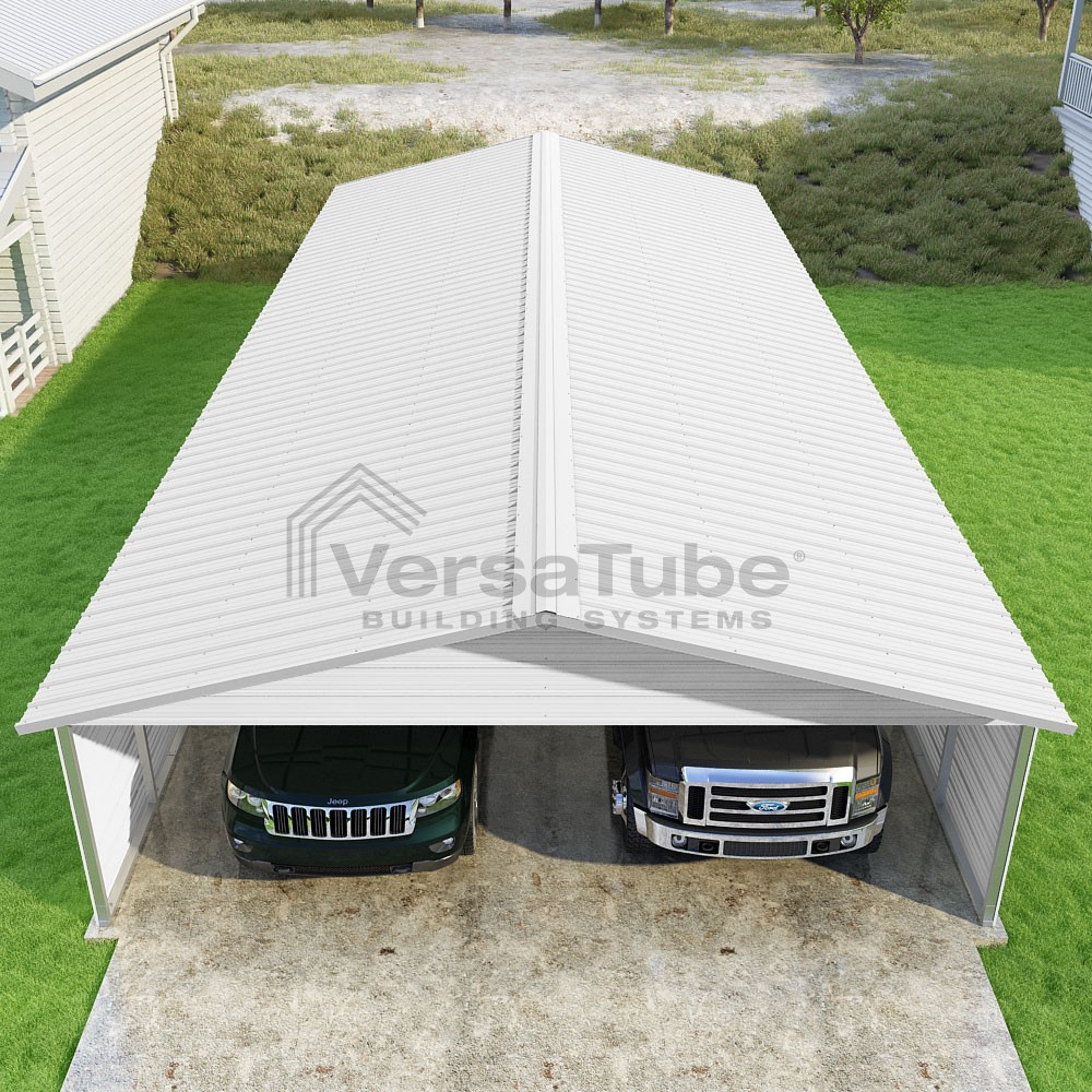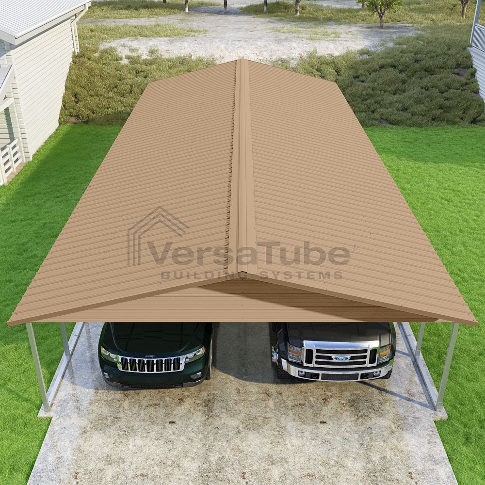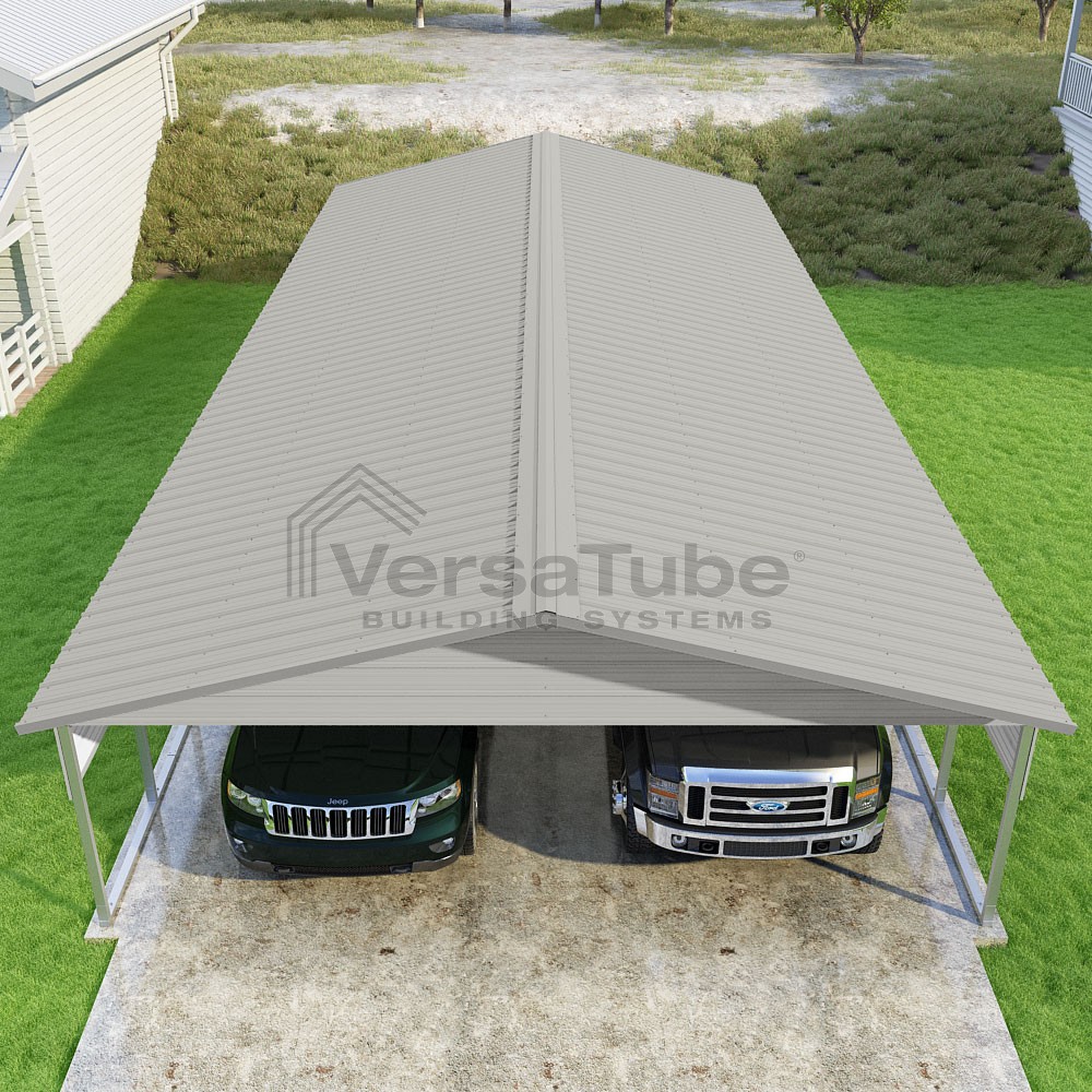 Pinnacle Series DIY carport kit features vertical sheet metal roof panels with ridge cap, gable and eave trim for an A-frame roof style and extended coverage on both ends.