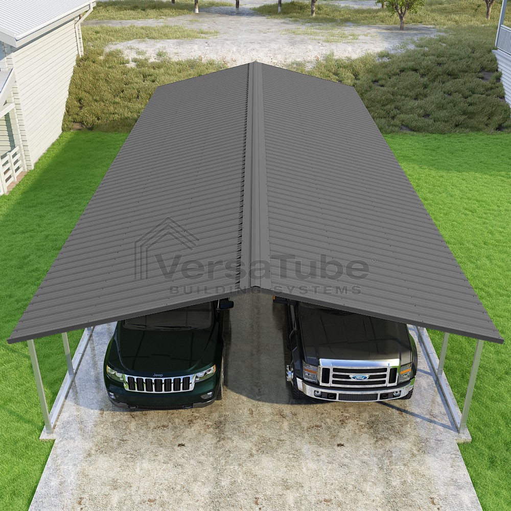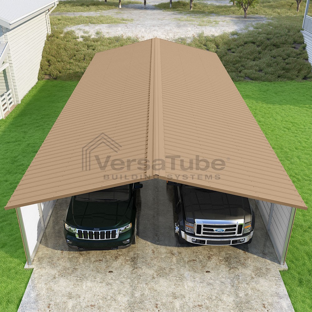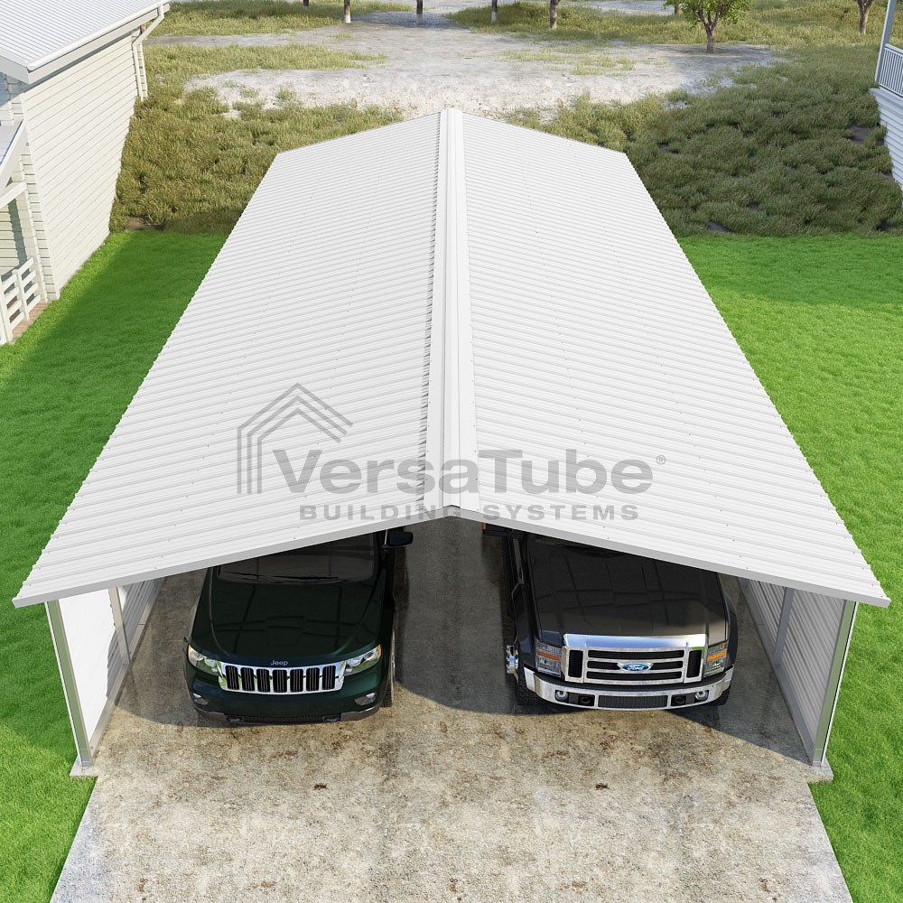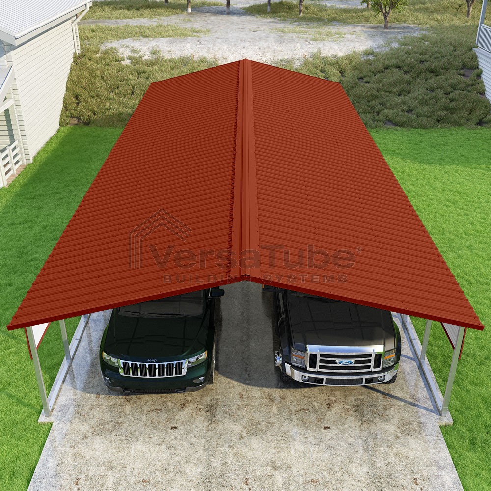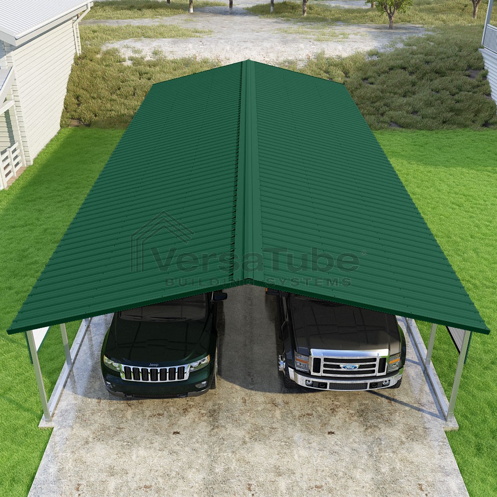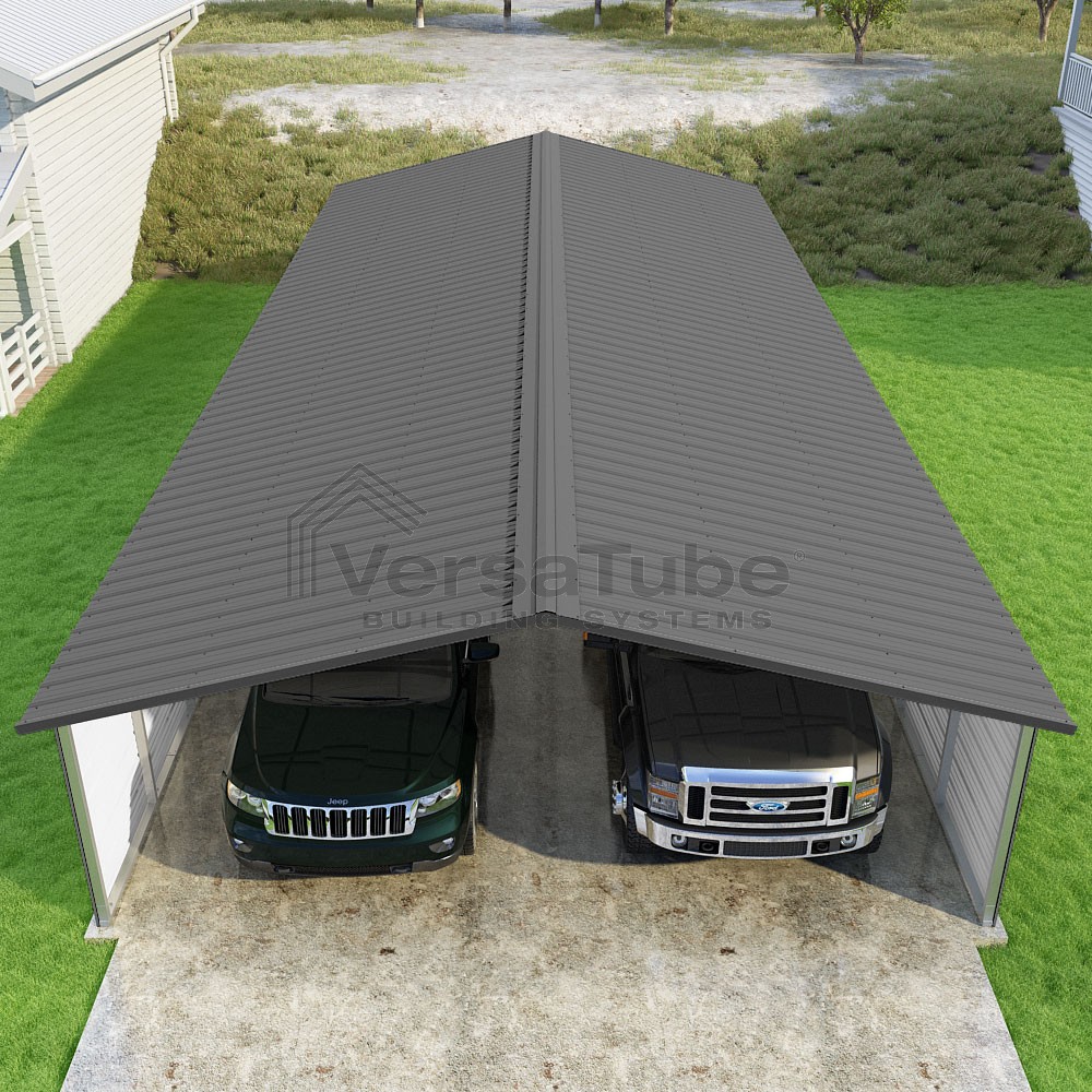 Pinnacle Series DIY carport kit features vertical sheet metal roof panels with ridge cap, gable and eave trim for an A-frame roof style and extended coverage on both ends.