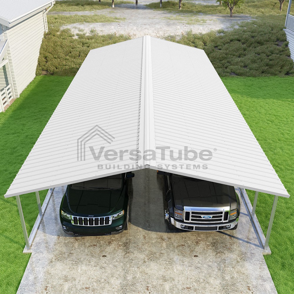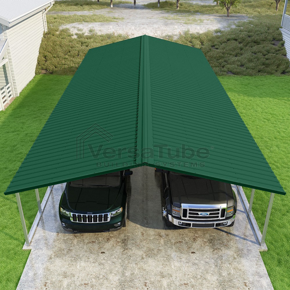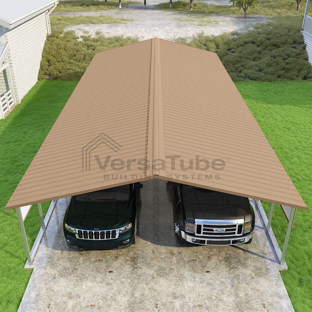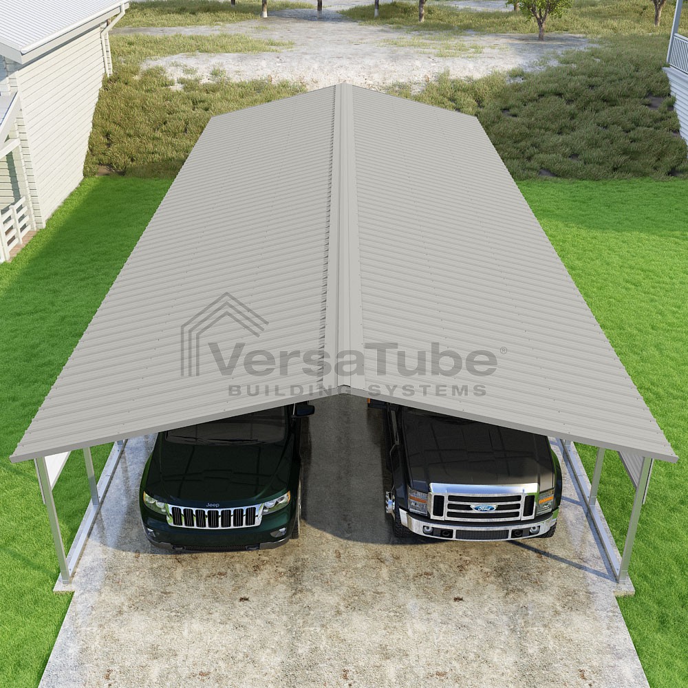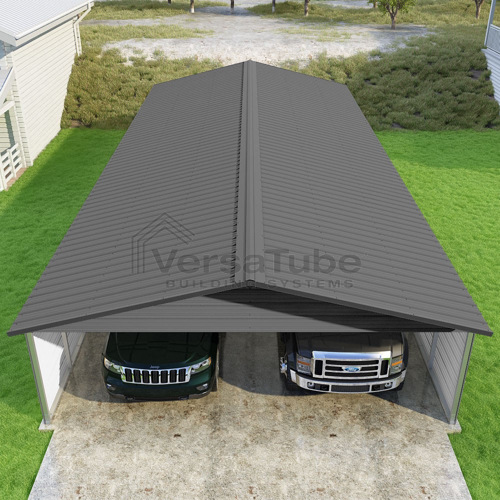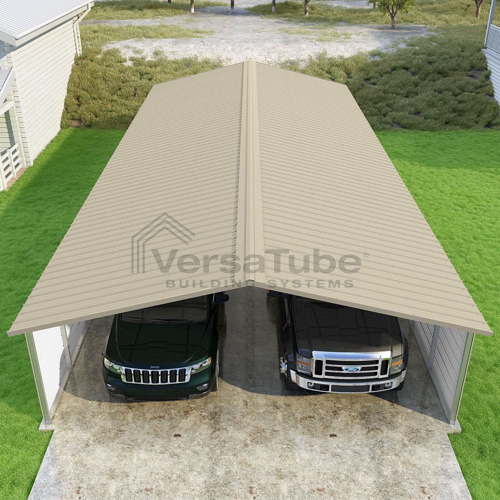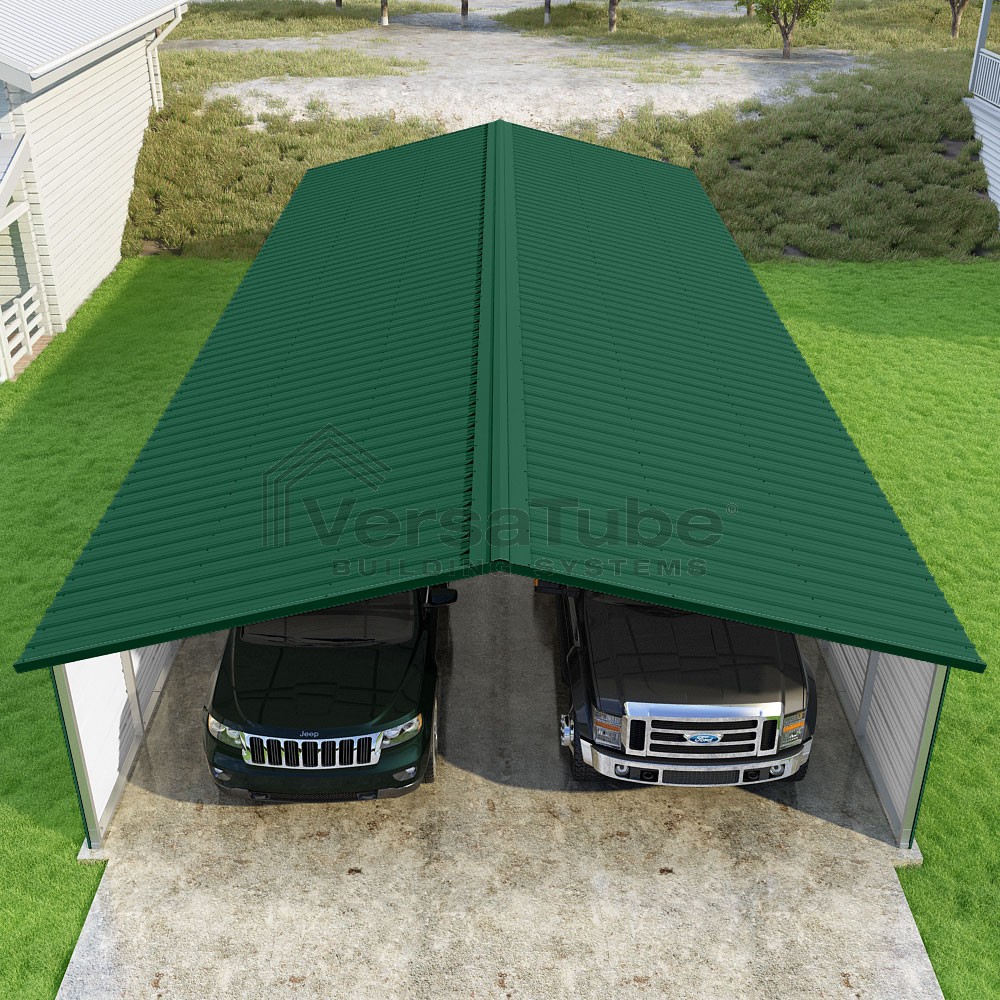 Pinnacle Series DIY carport kit features vertical sheet metal roof panels with ridge cap, gable and eave trim for an A-frame roof style and extended coverage on both ends.