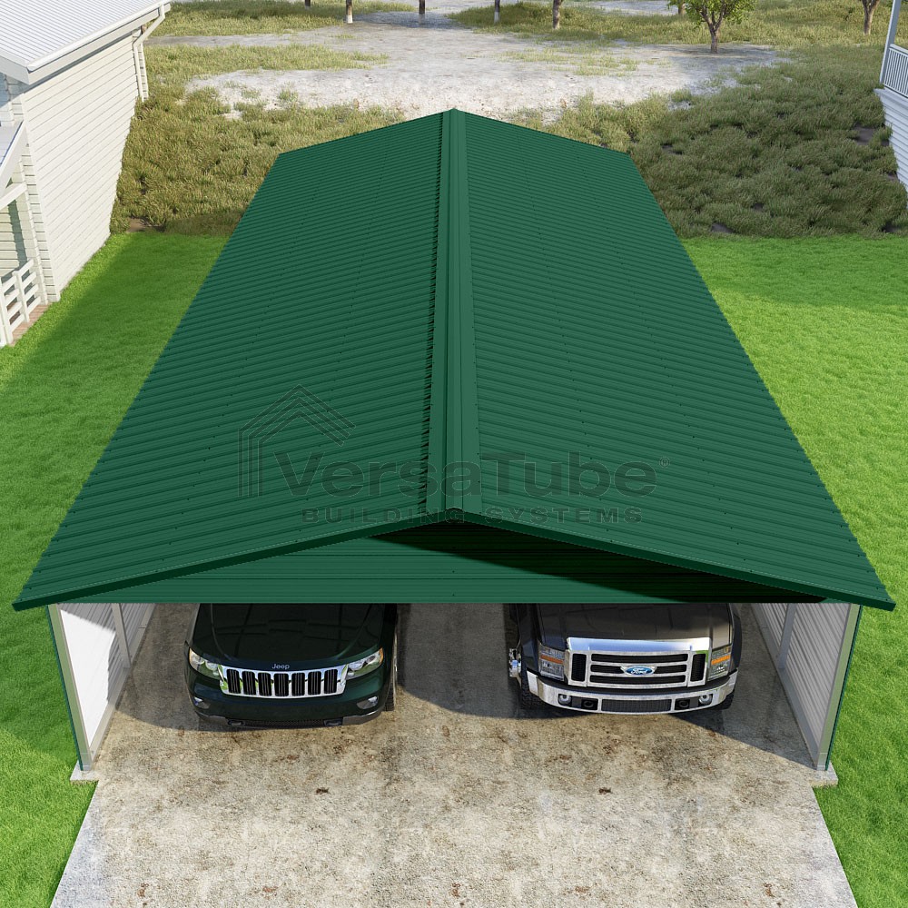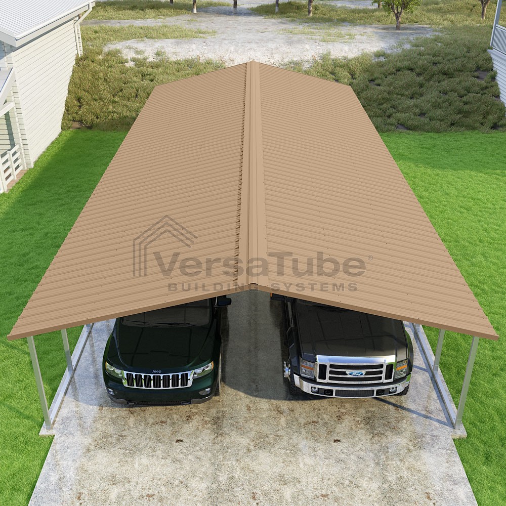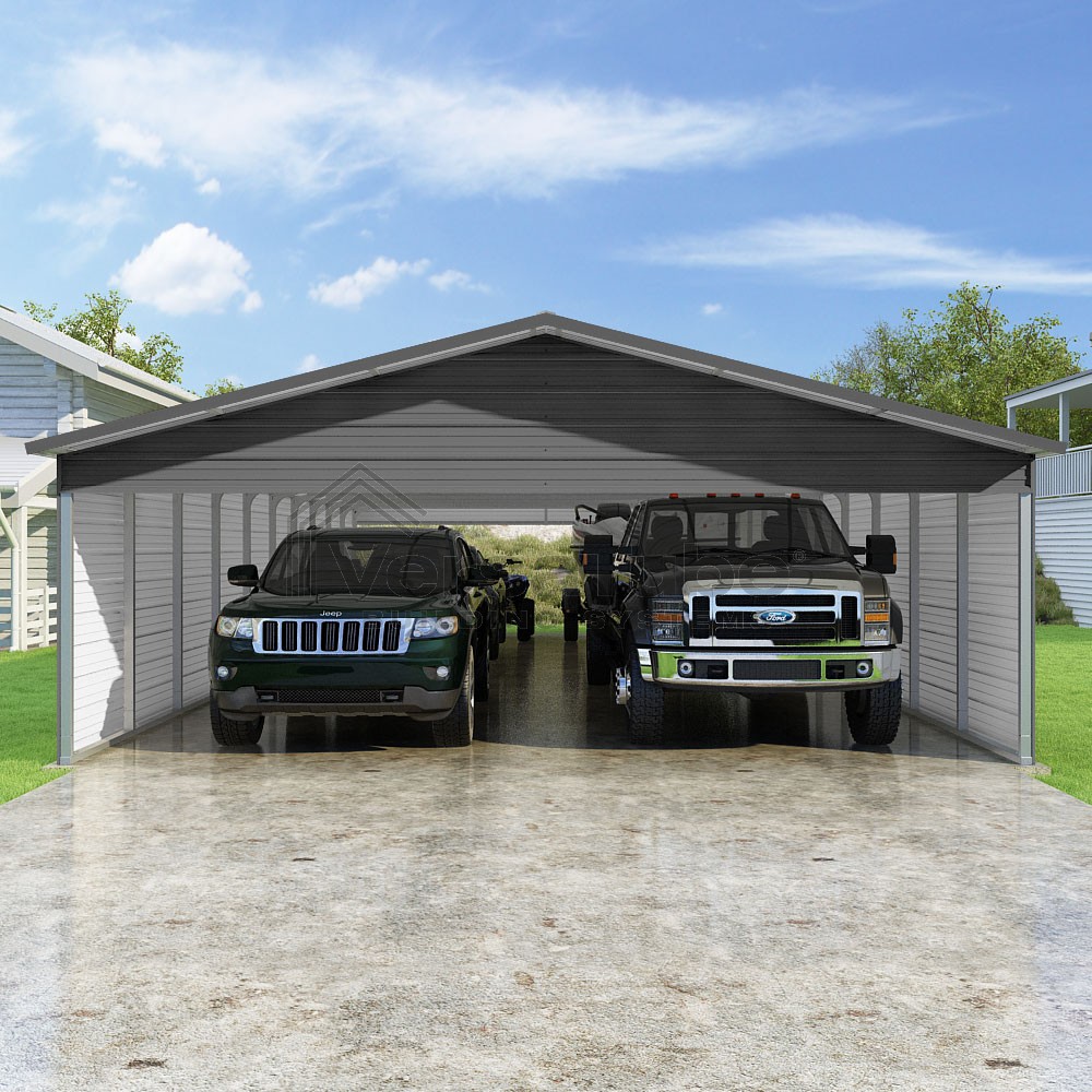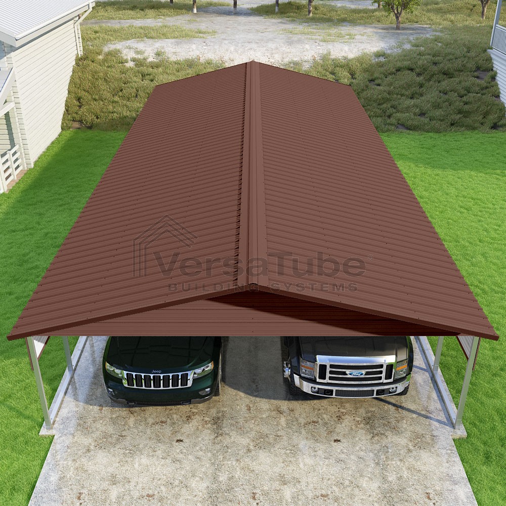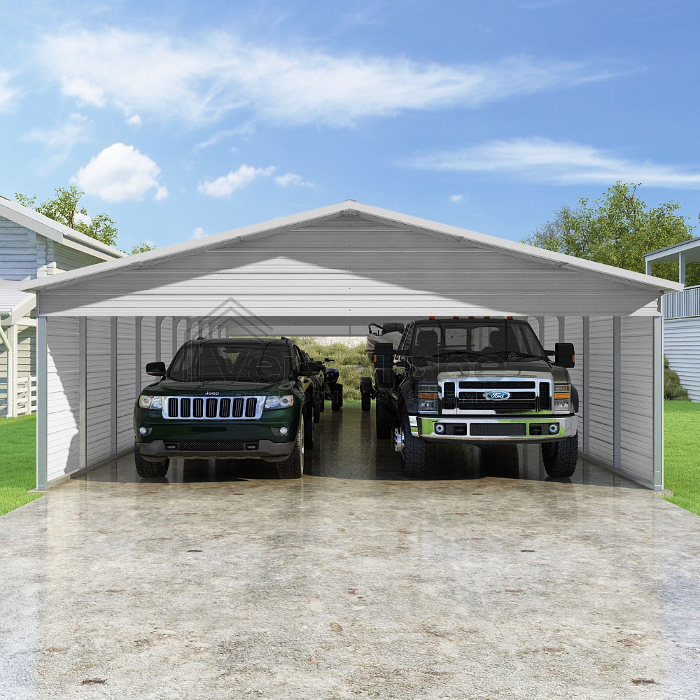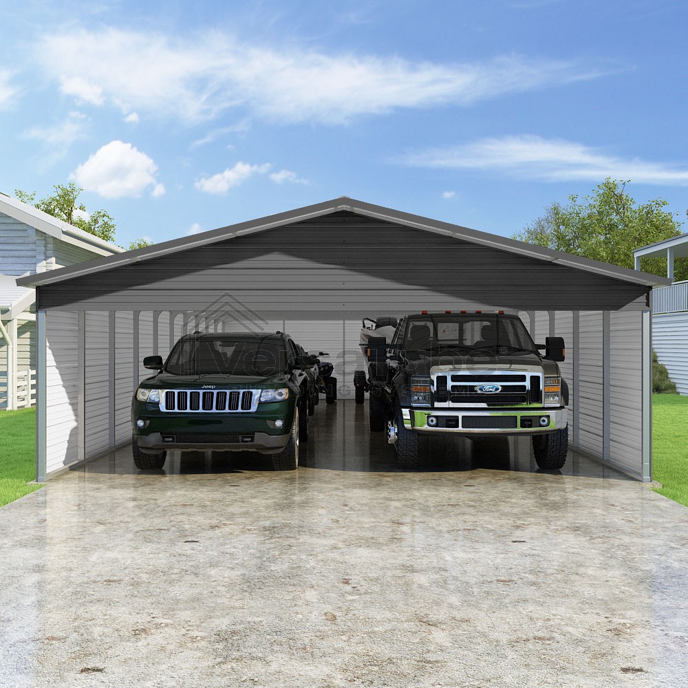 Pinnacle Series DIY carport kit features vertical sheet metal roof panels with ridge cap, gable and eave trim for an A-frame roof style and extended coverage on both ends.