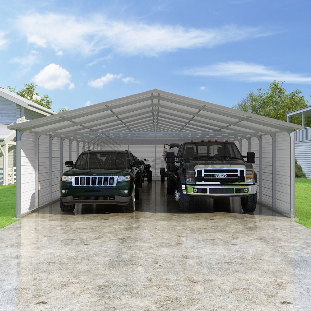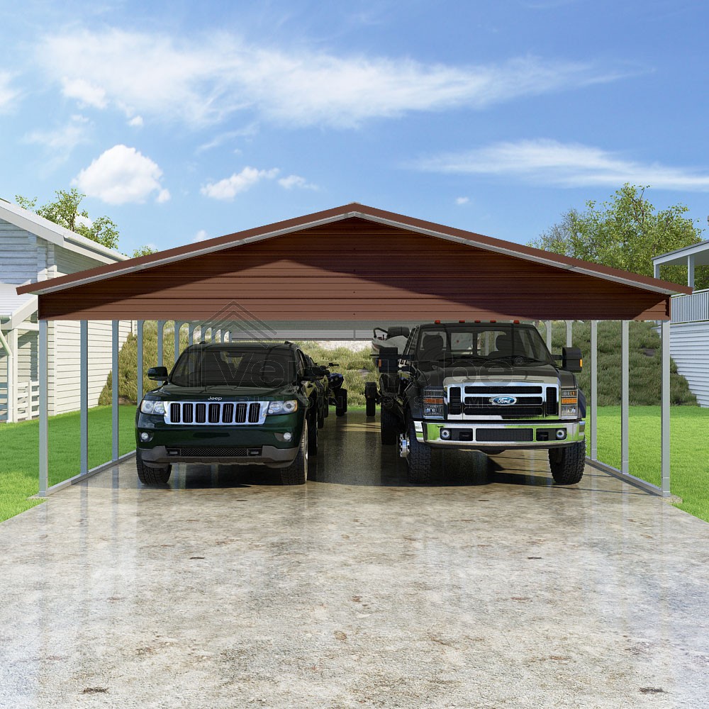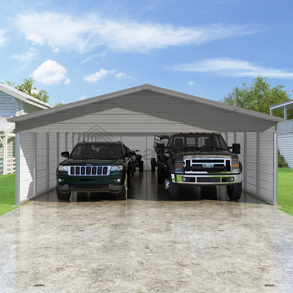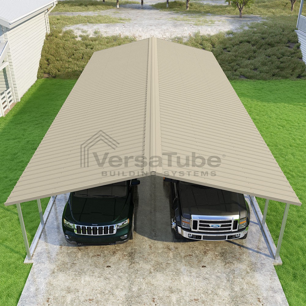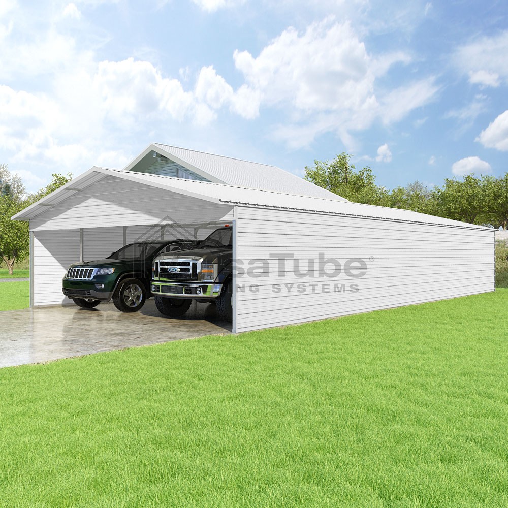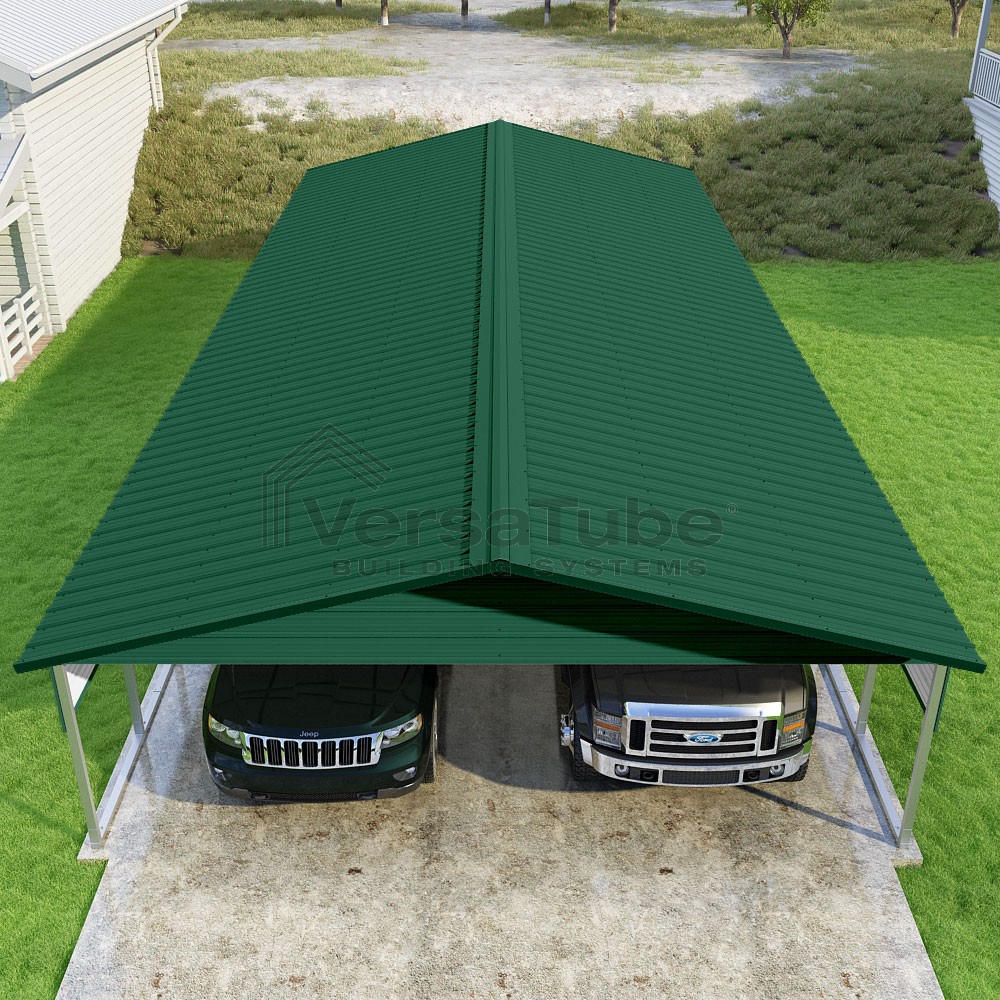 Pinnacle Series DIY carport kit features vertical sheet metal roof panels with ridge cap, gable and eave trim for an A-frame roof style and extended coverage on both ends.