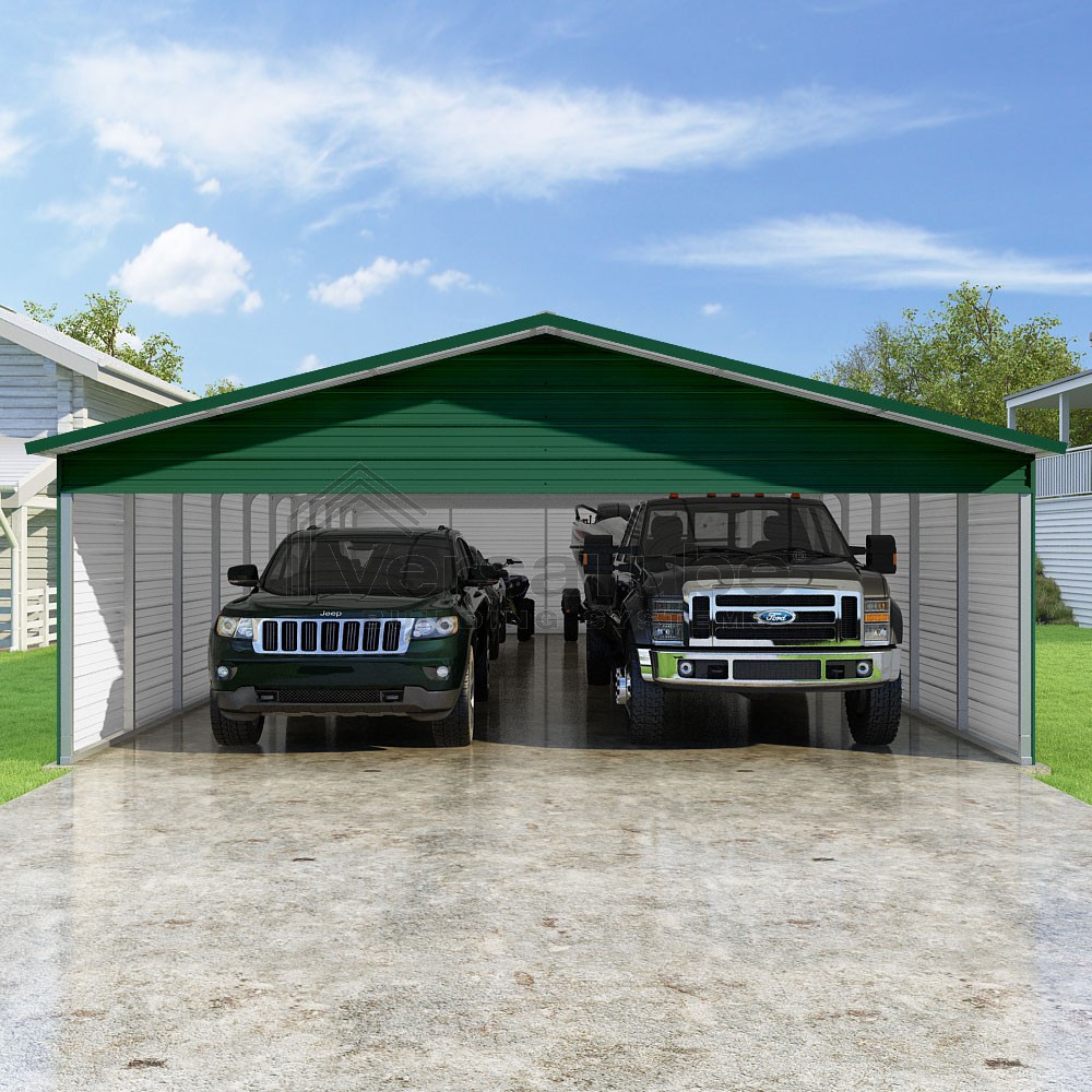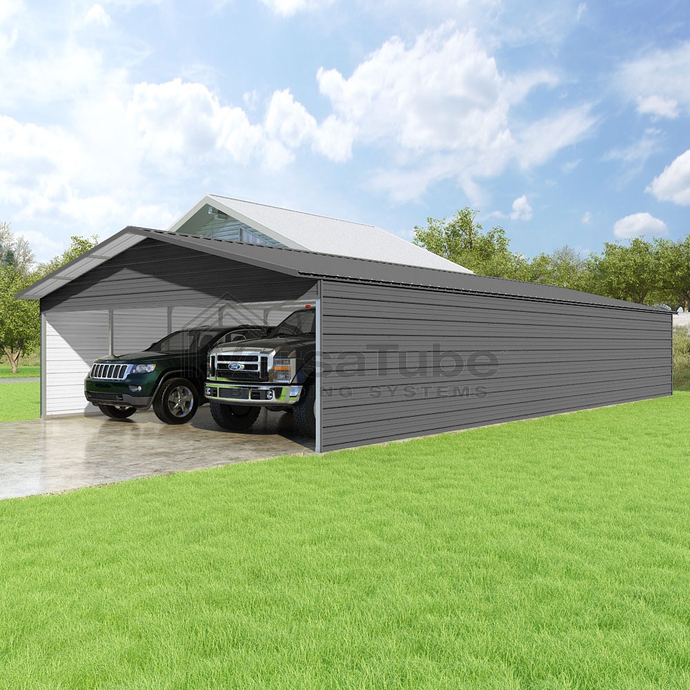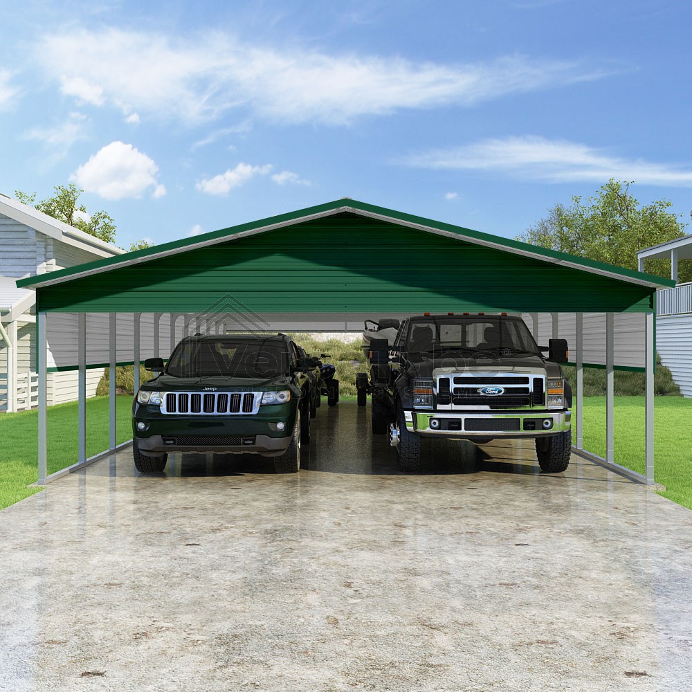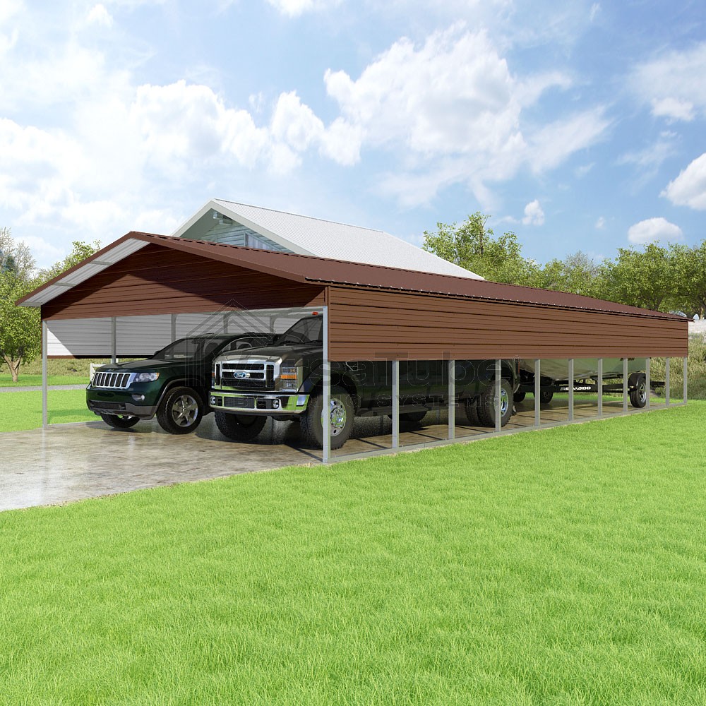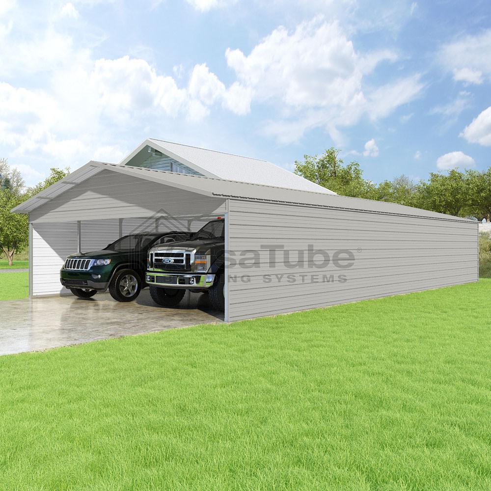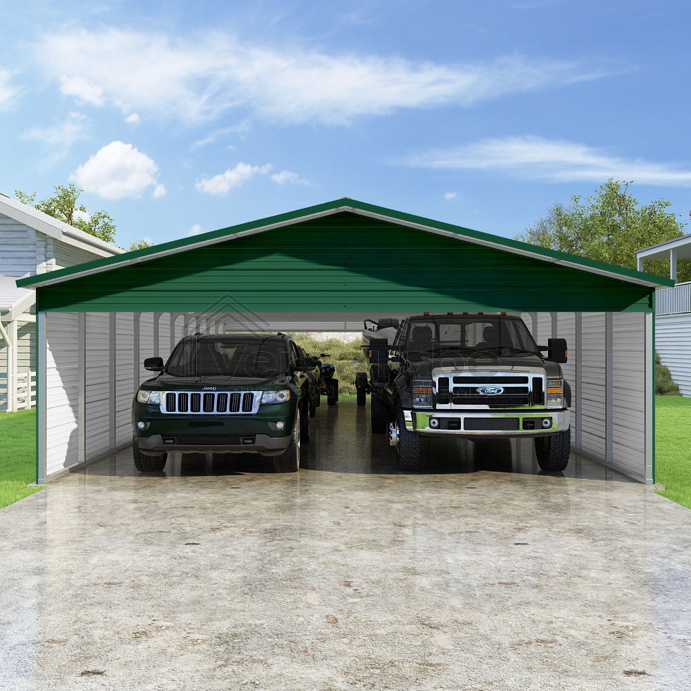 Pinnacle Series DIY carport kit features vertical sheet metal roof panels with ridge cap, gable and eave trim for an A-frame roof style and extended coverage on both ends.