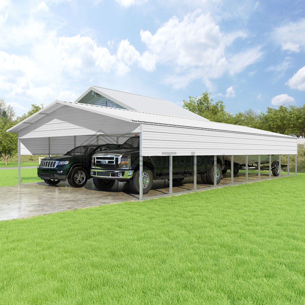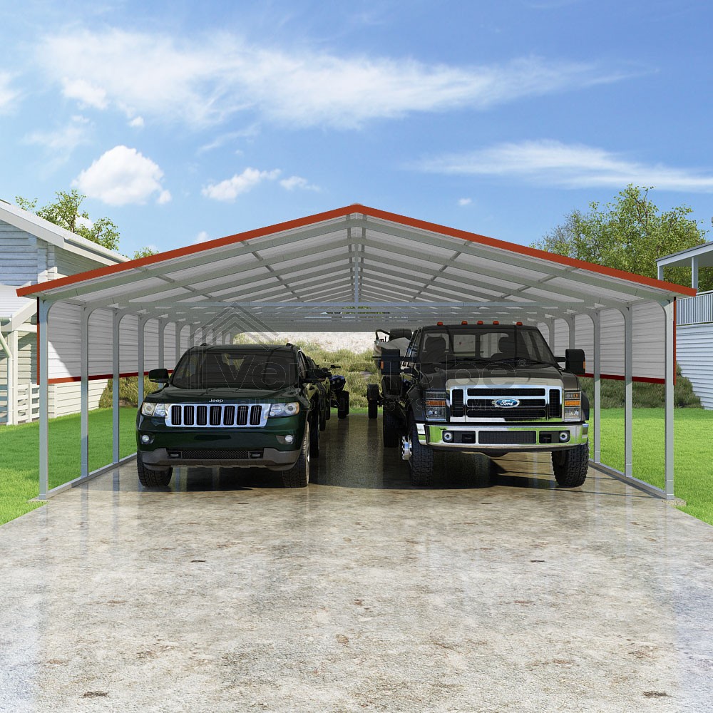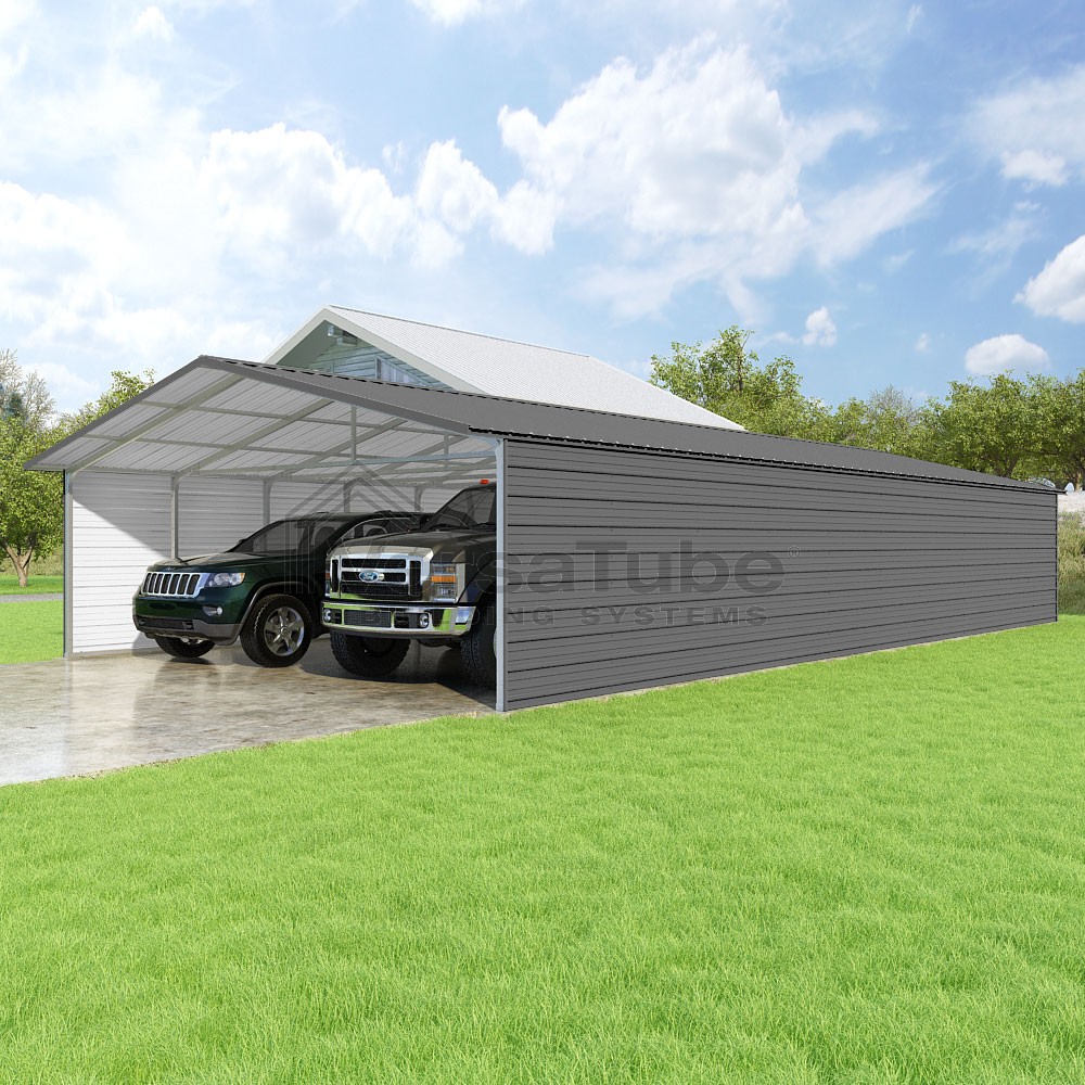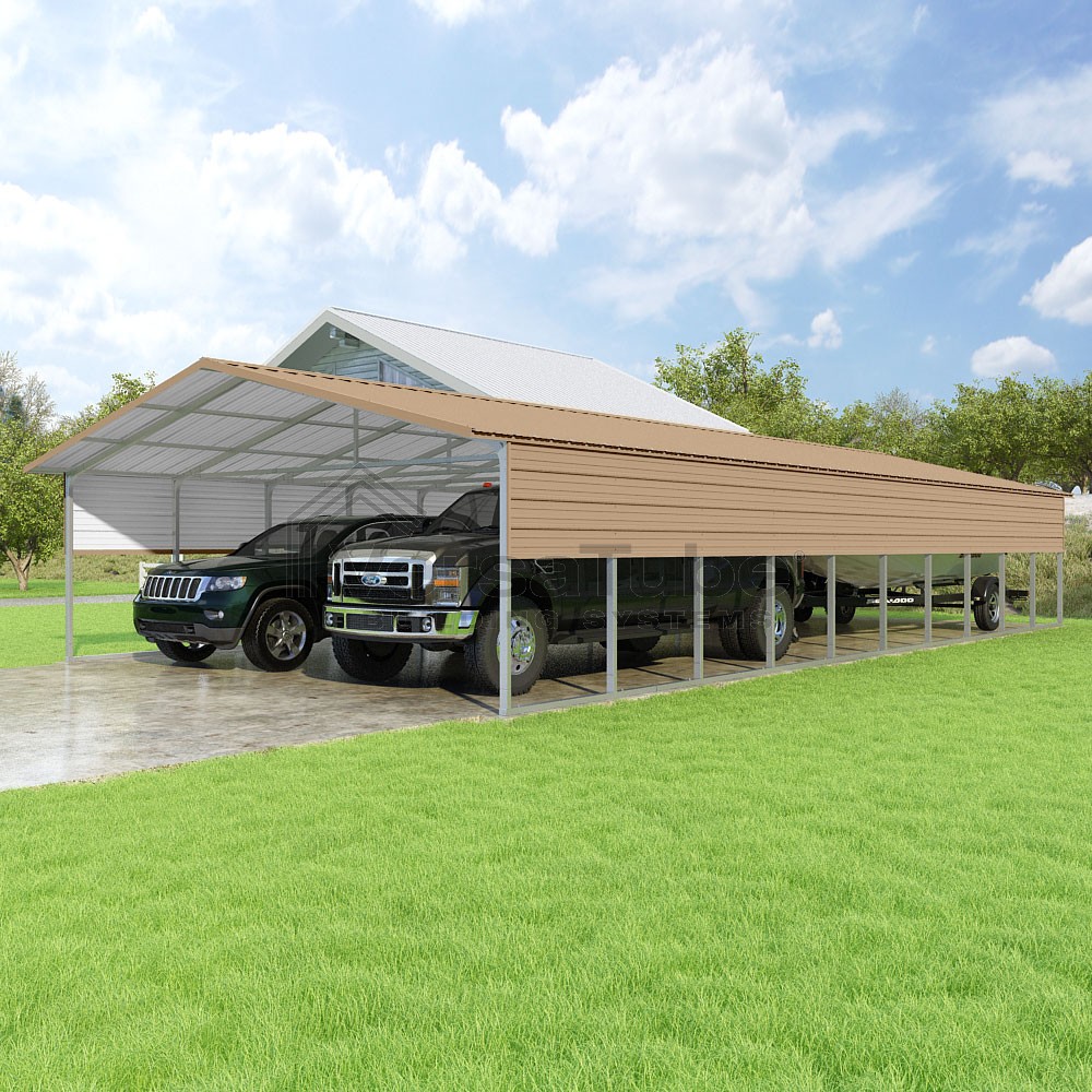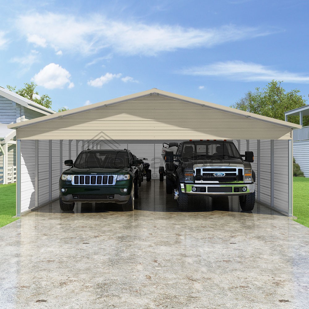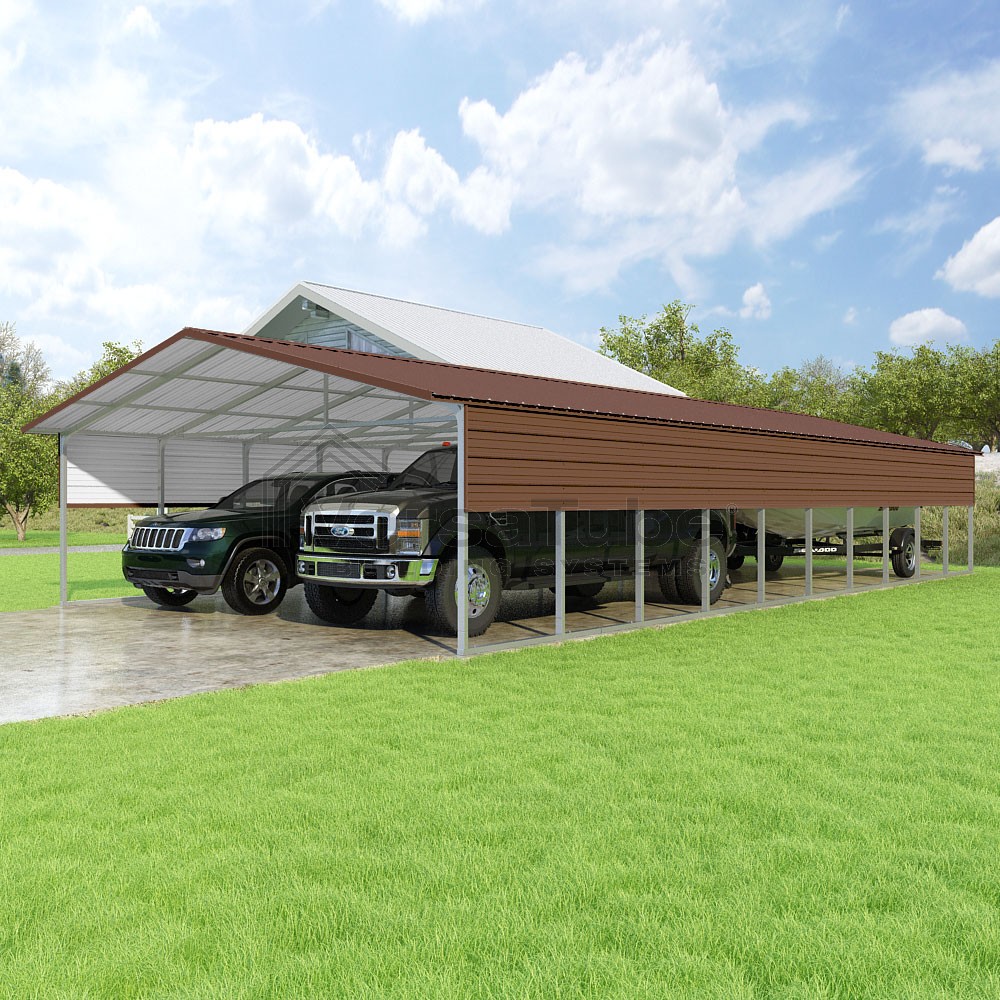 Pinnacle Series DIY carport kit features vertical sheet metal roof panels with ridge cap, gable and eave trim for an A-frame roof style and extended coverage on both ends.