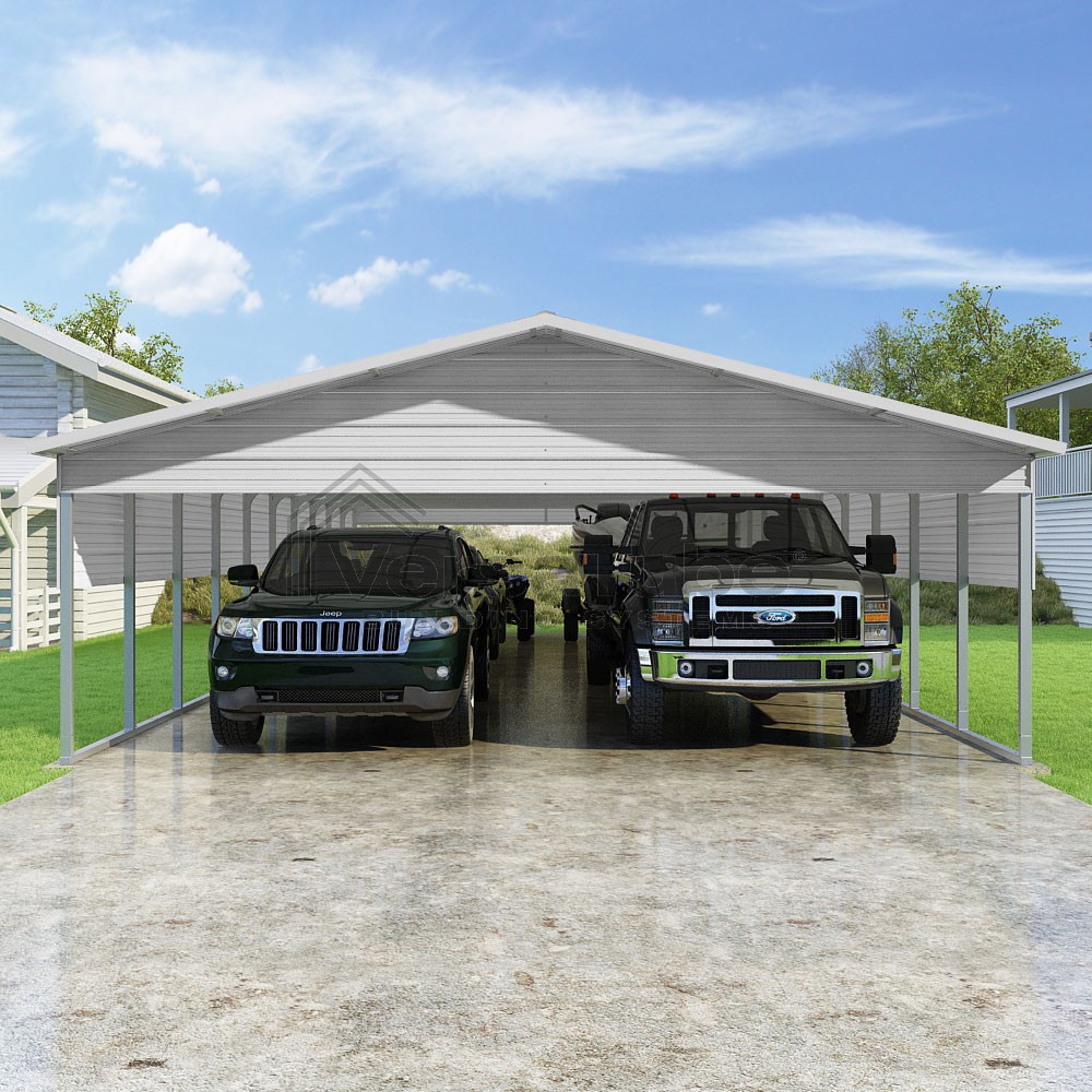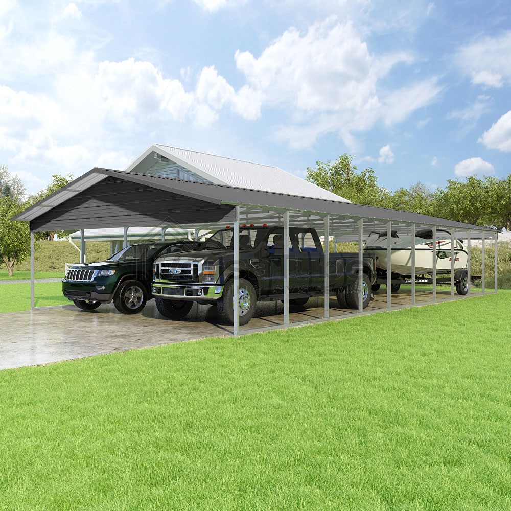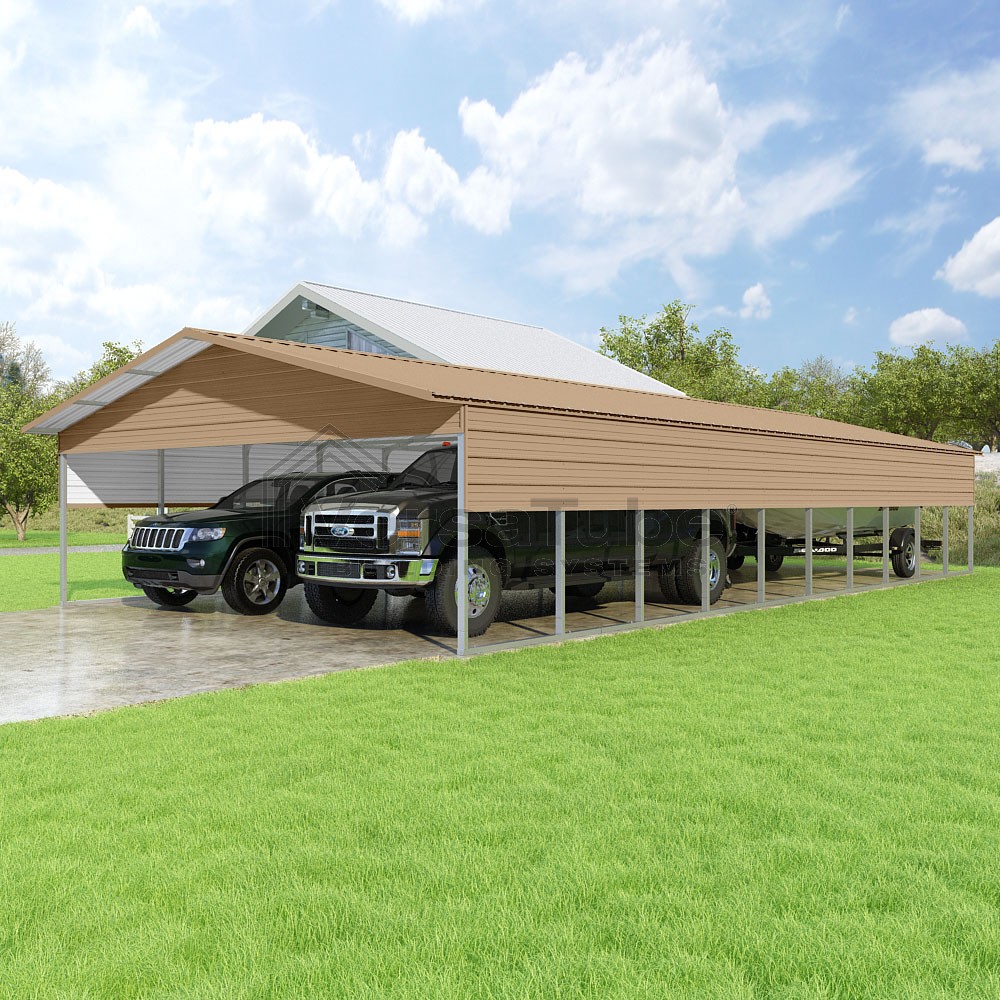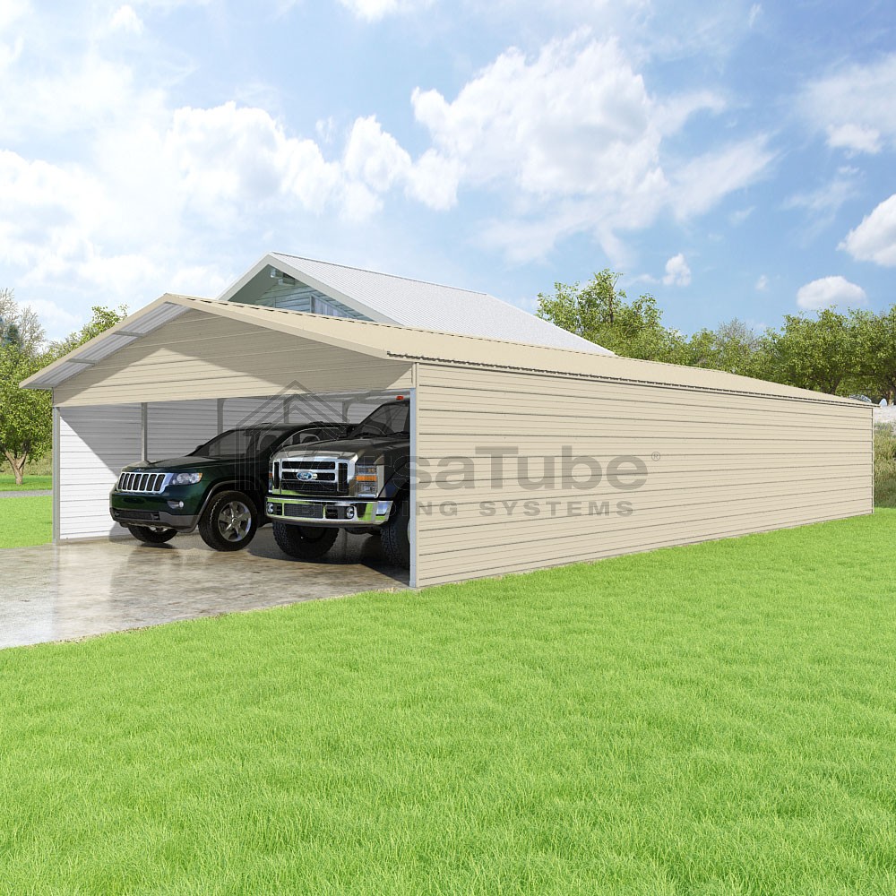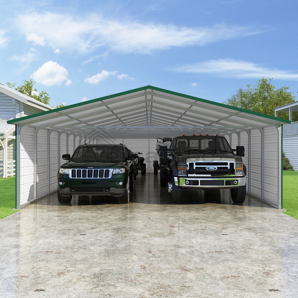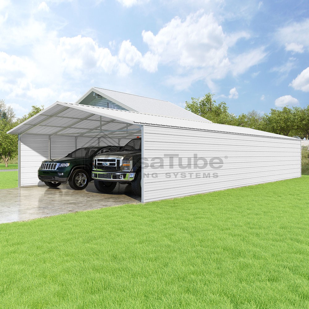 Pinnacle Series DIY carport kit features vertical sheet metal roof panels with ridge cap, gable and eave trim for an A-frame roof style and extended coverage on both ends.
