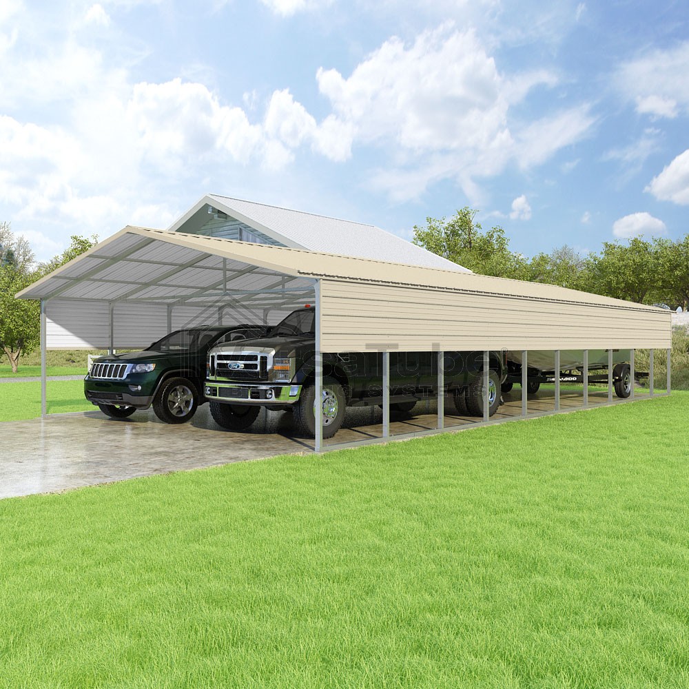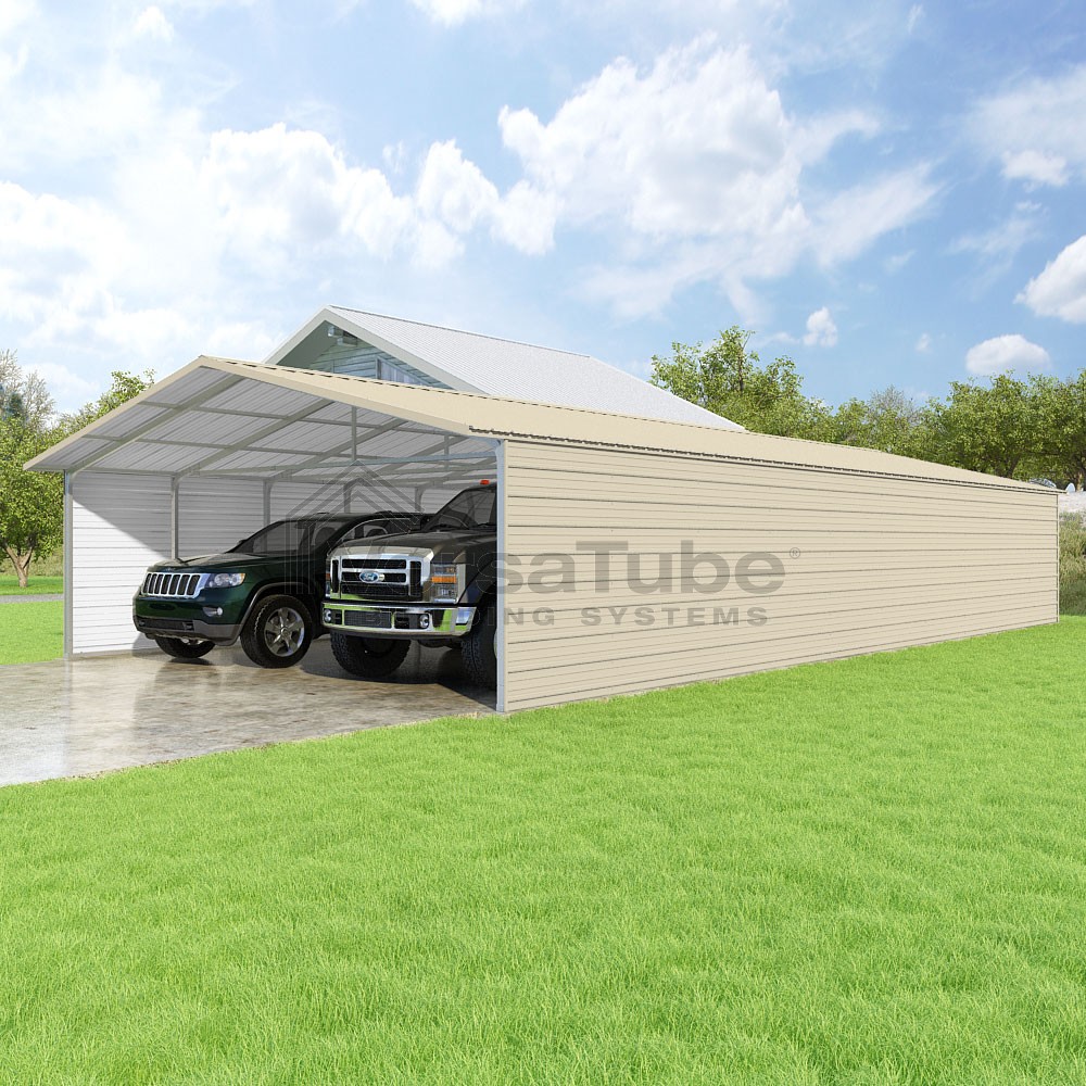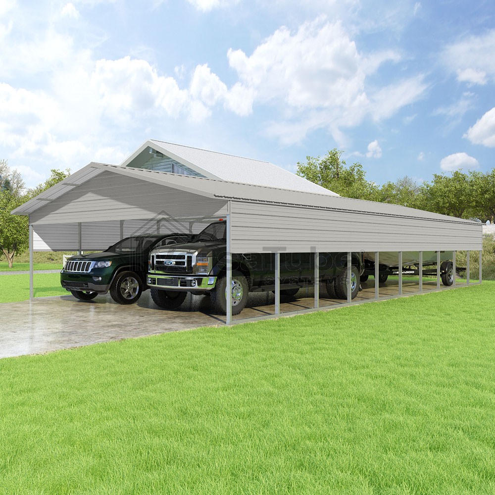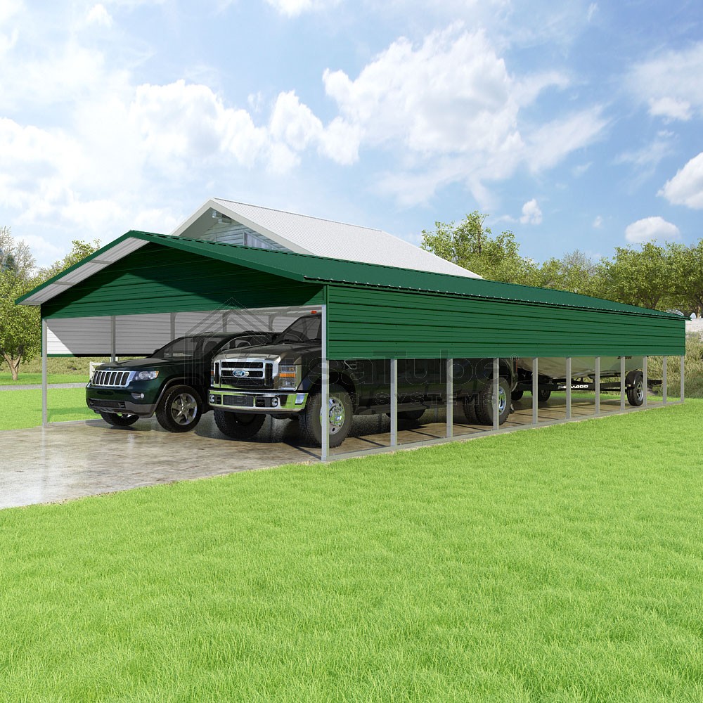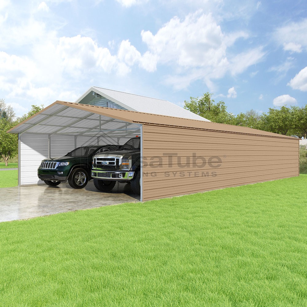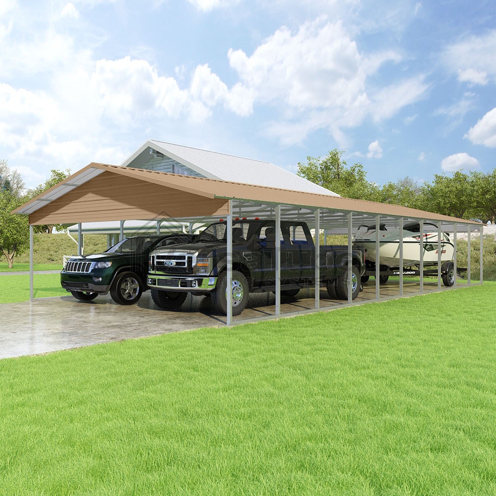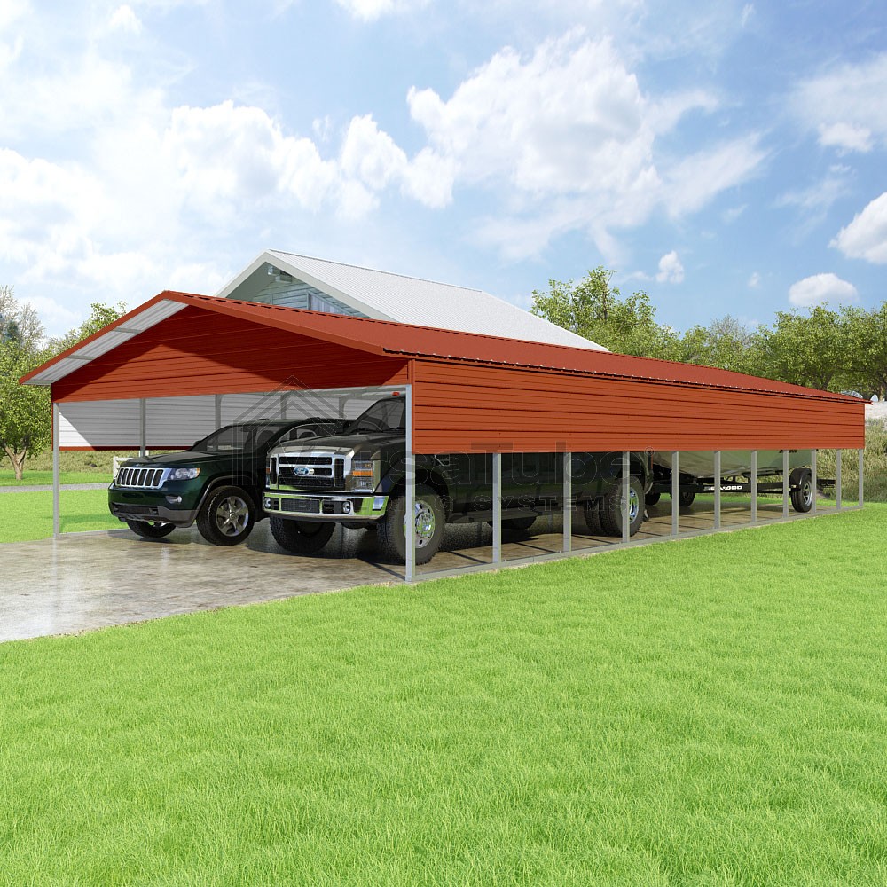 Pinnacle Series DIY carport kit features vertical sheet metal roof panels with ridge cap, gable and eave trim for an A-frame roof style and extended coverage on both ends.