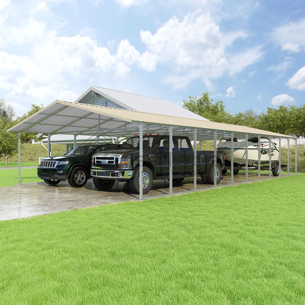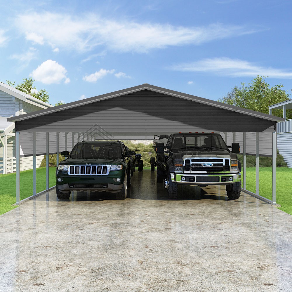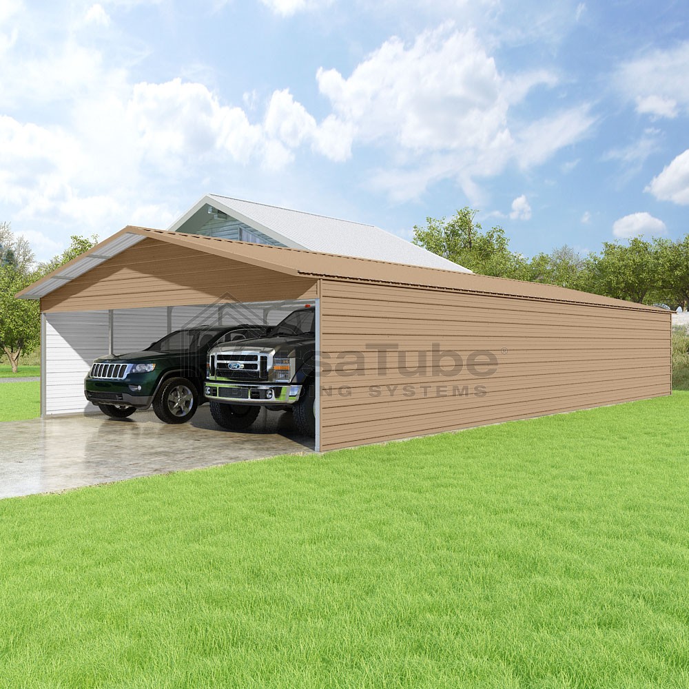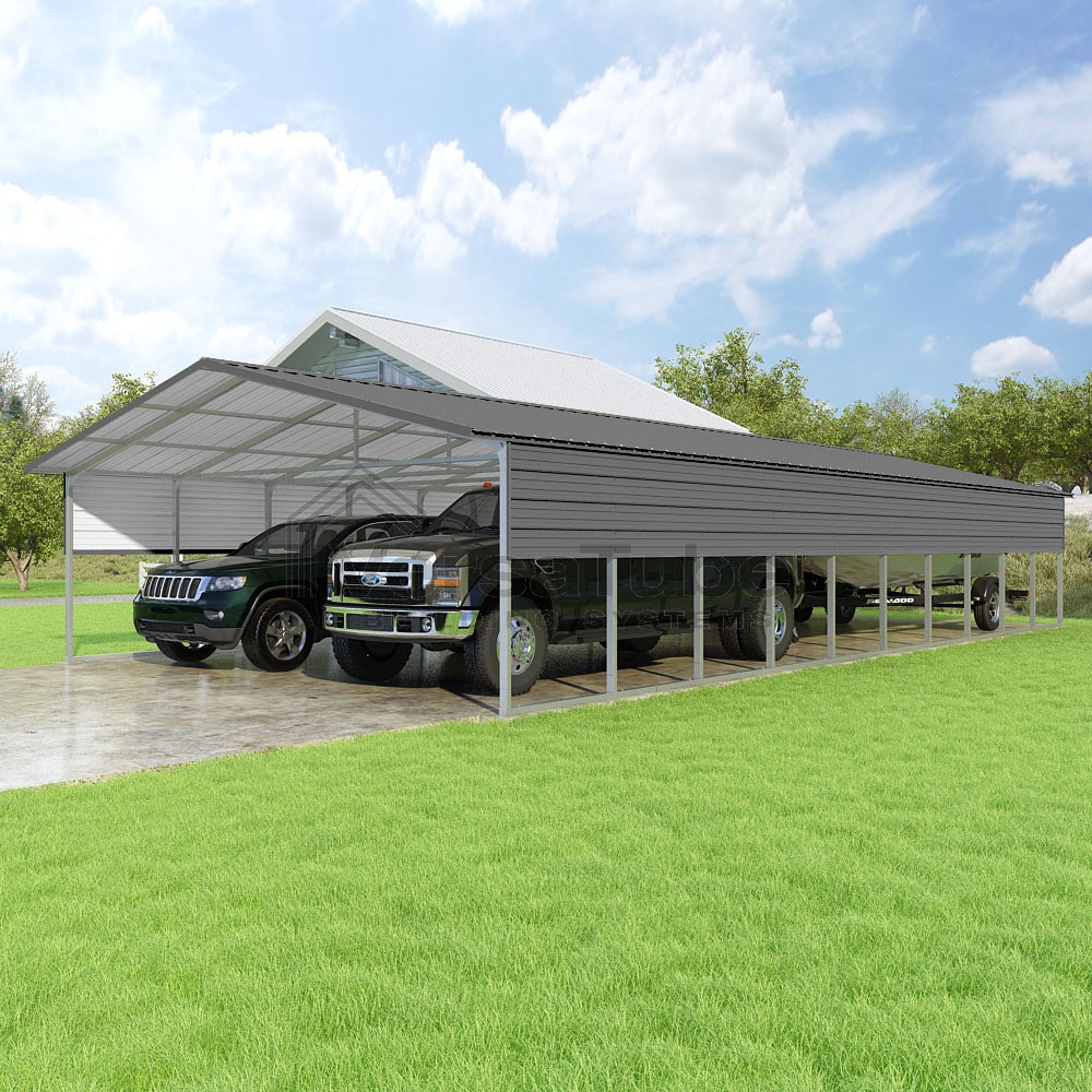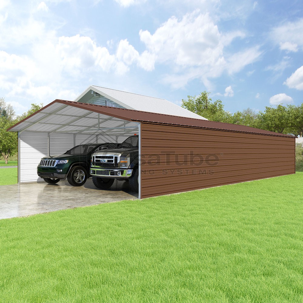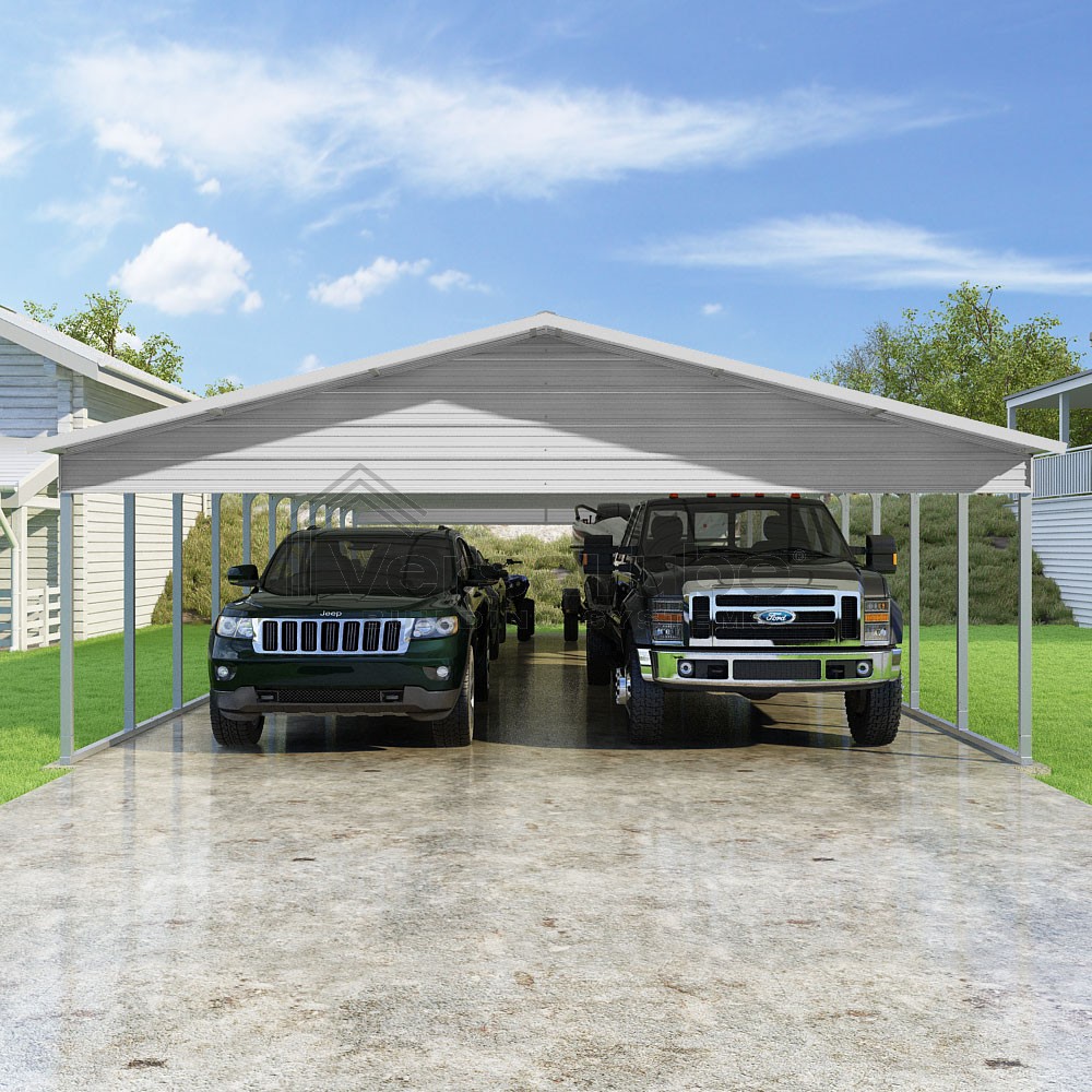 Pinnacle Series DIY carport kit features vertical sheet metal roof panels with ridge cap, gable and eave trim for an A-frame roof style and extended coverage on both ends.