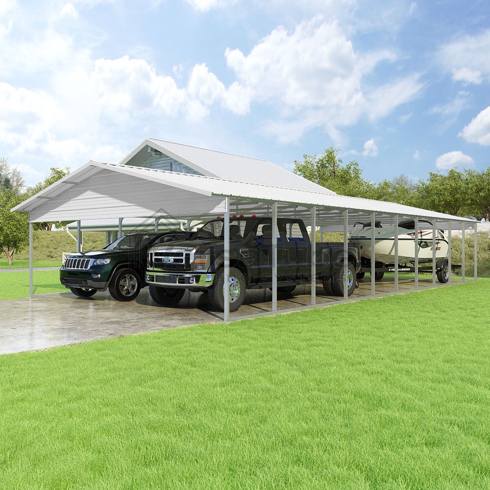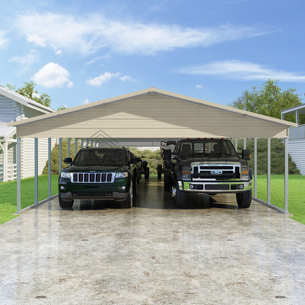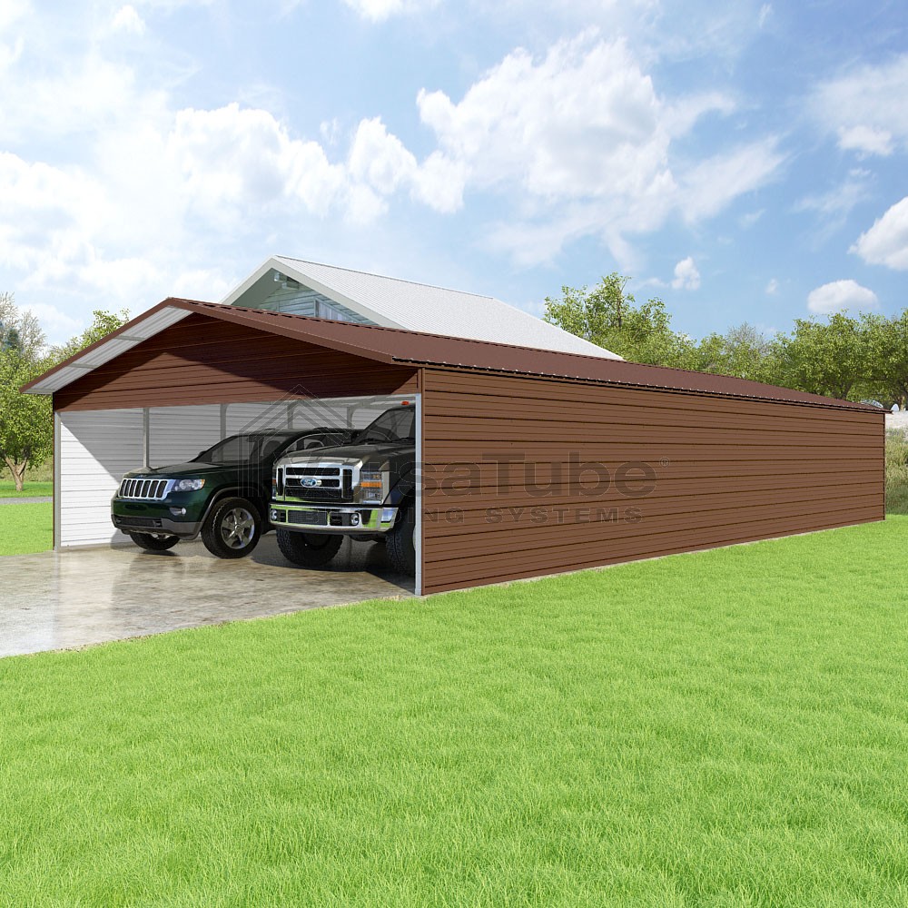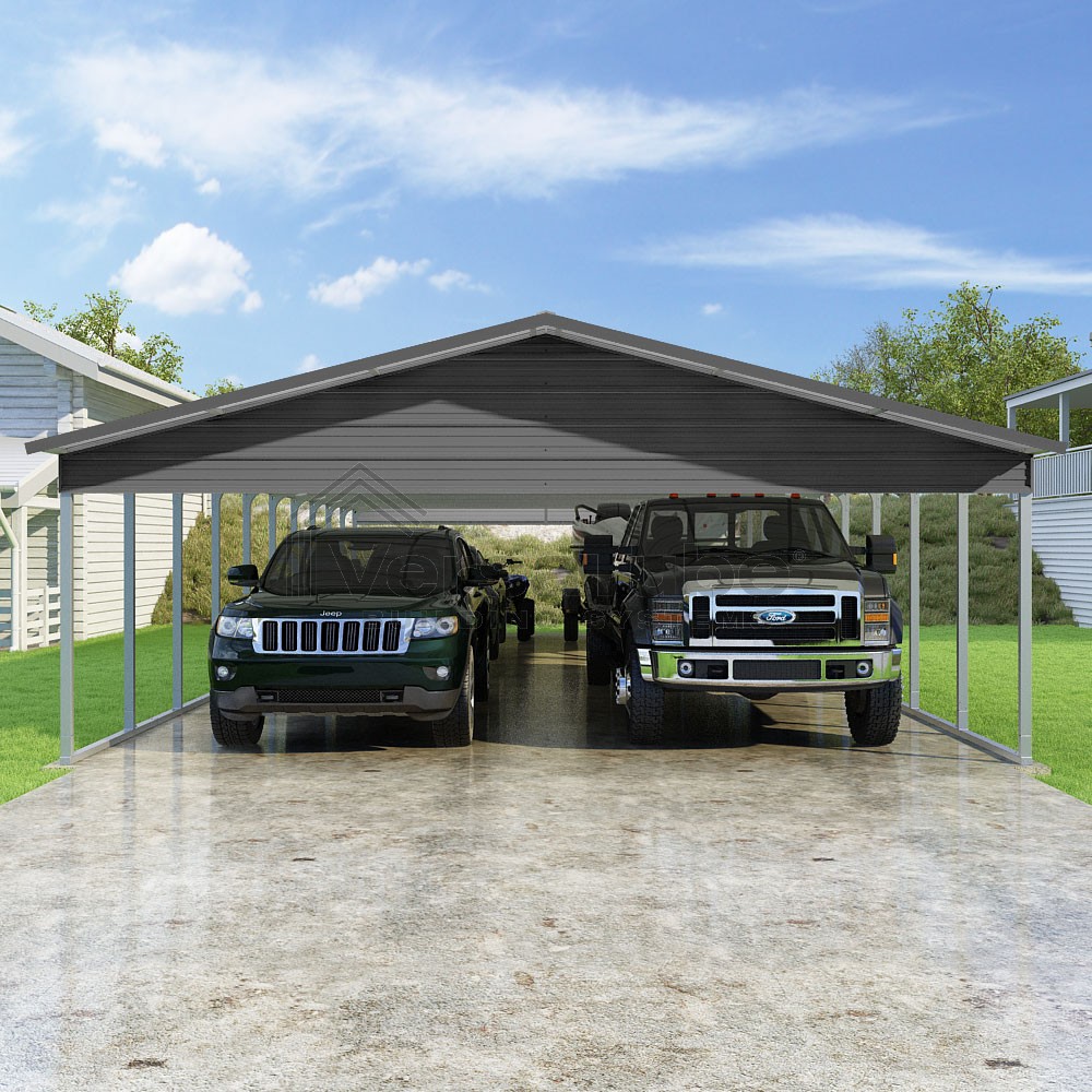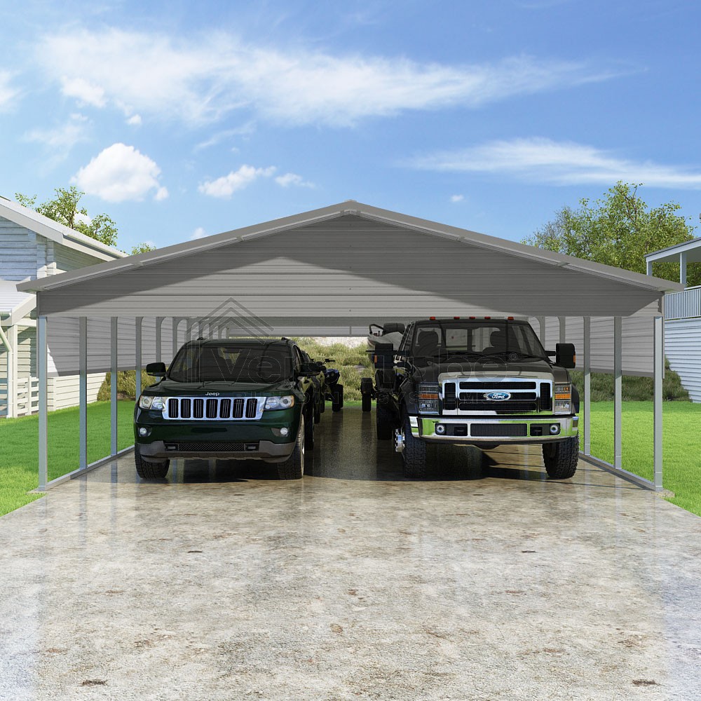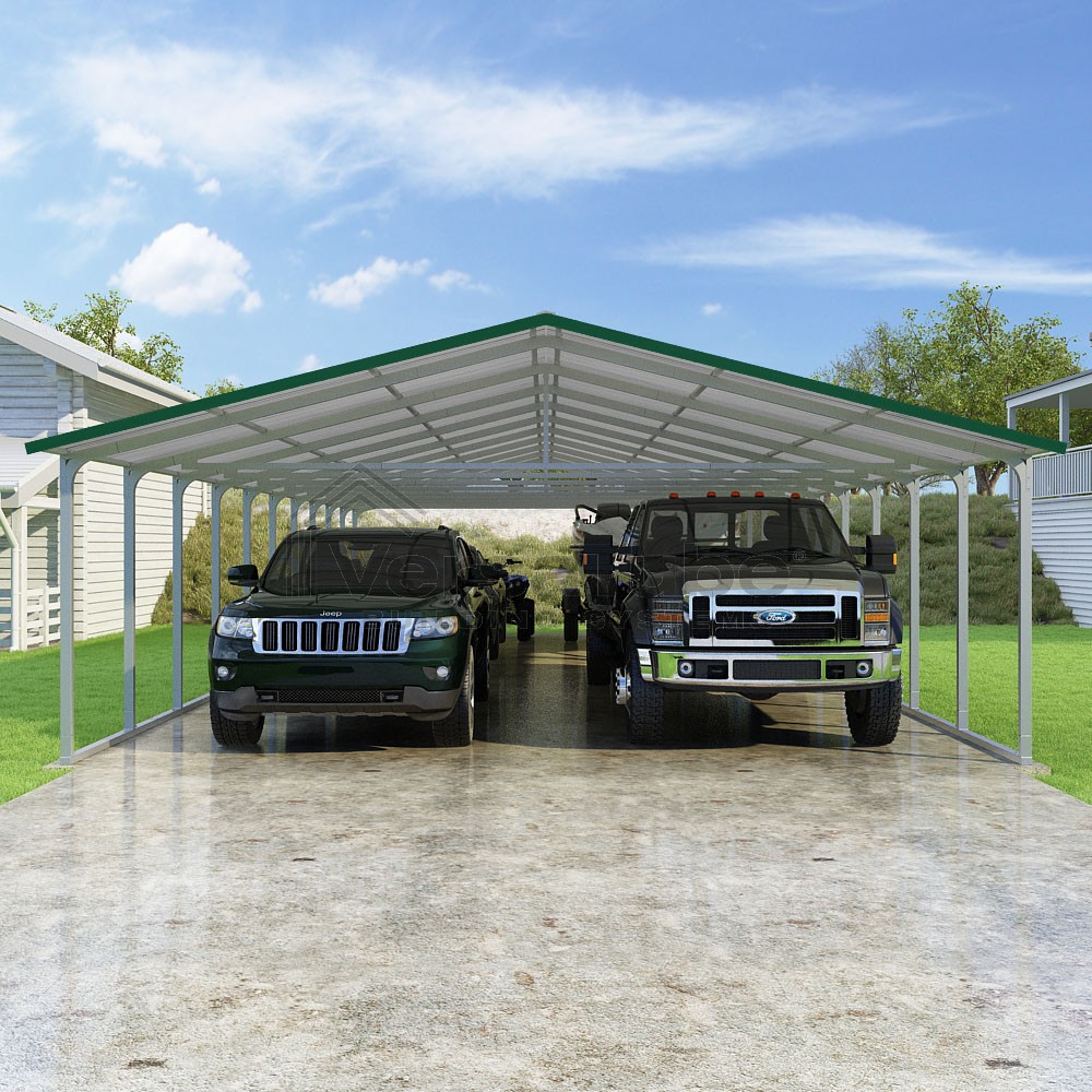 Pinnacle Series DIY carport kit features vertical sheet metal roof panels with ridge cap, gable and eave trim for an A-frame roof style and extended coverage on both ends.