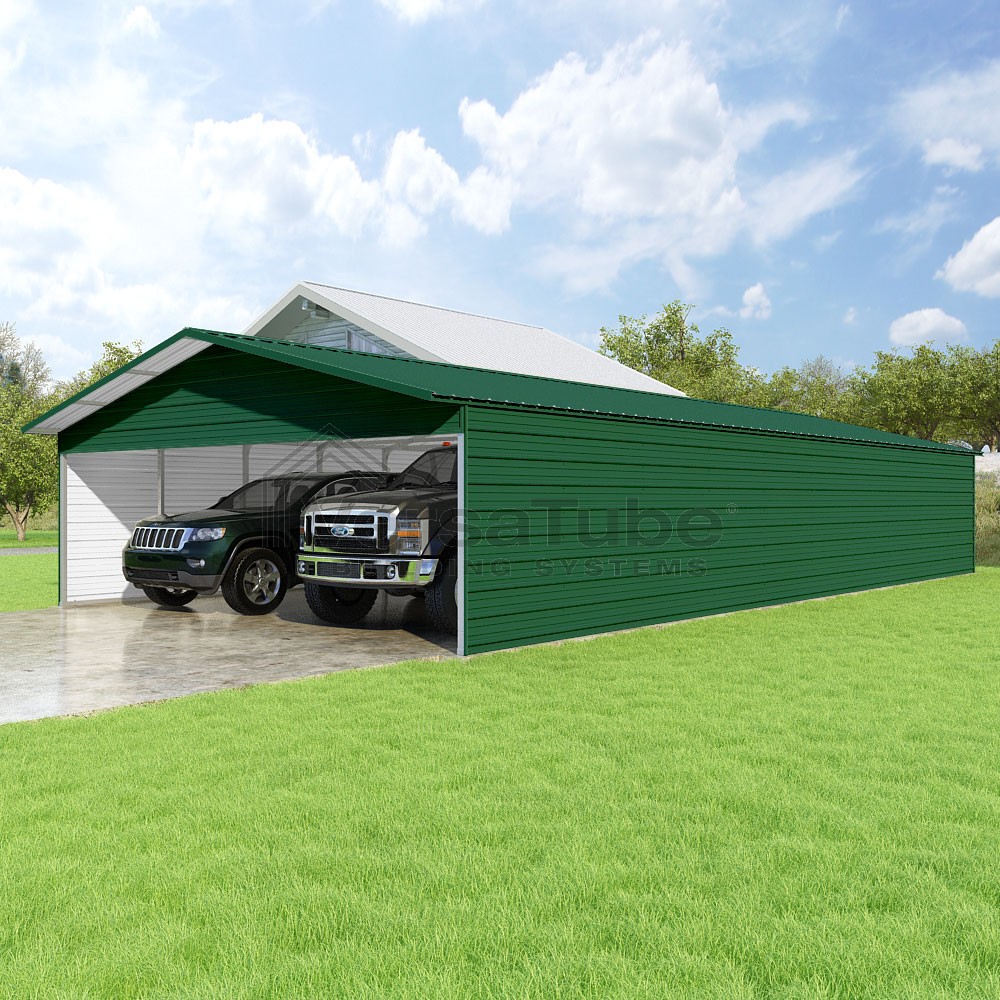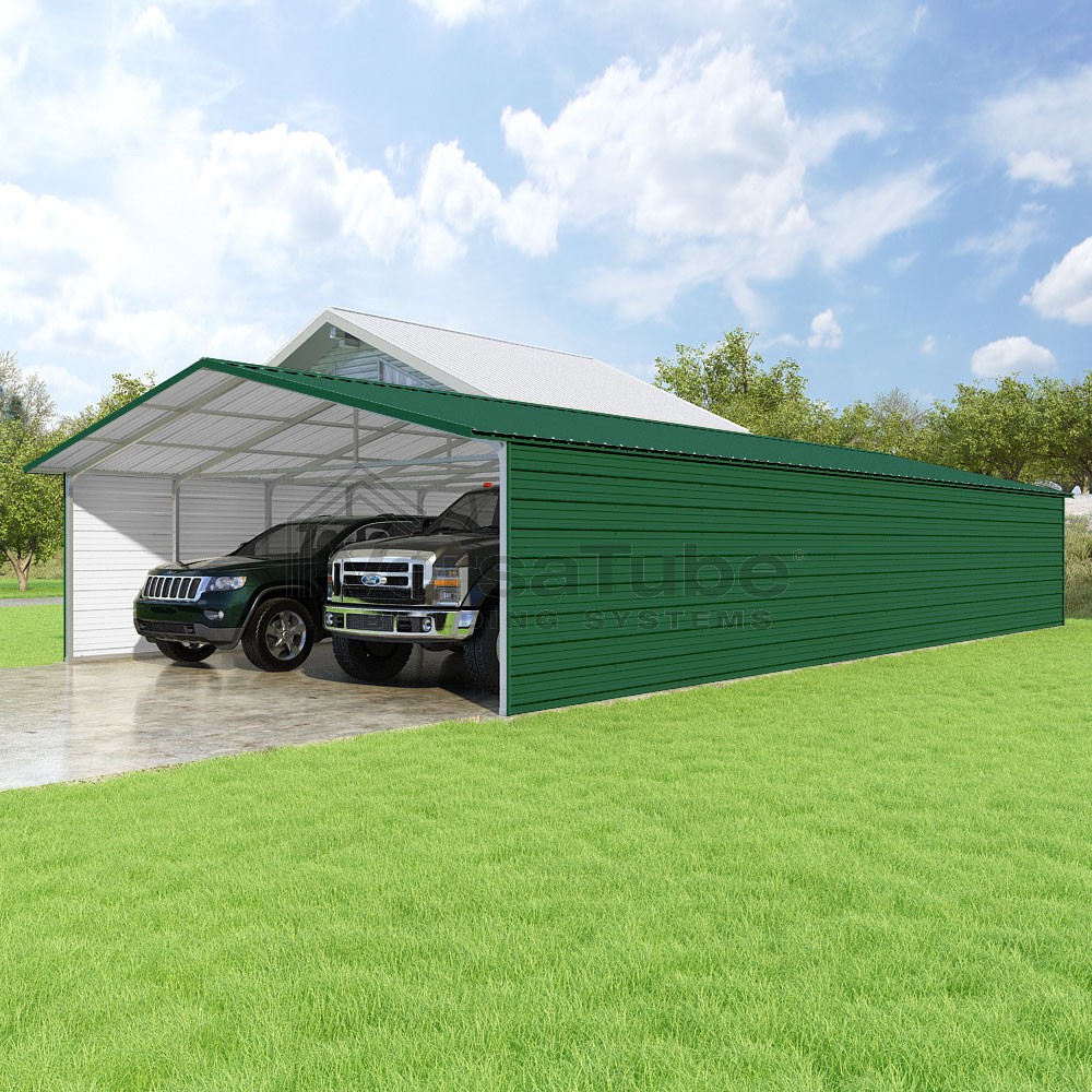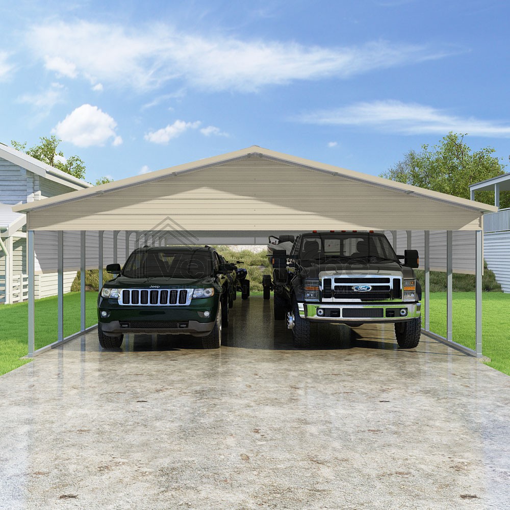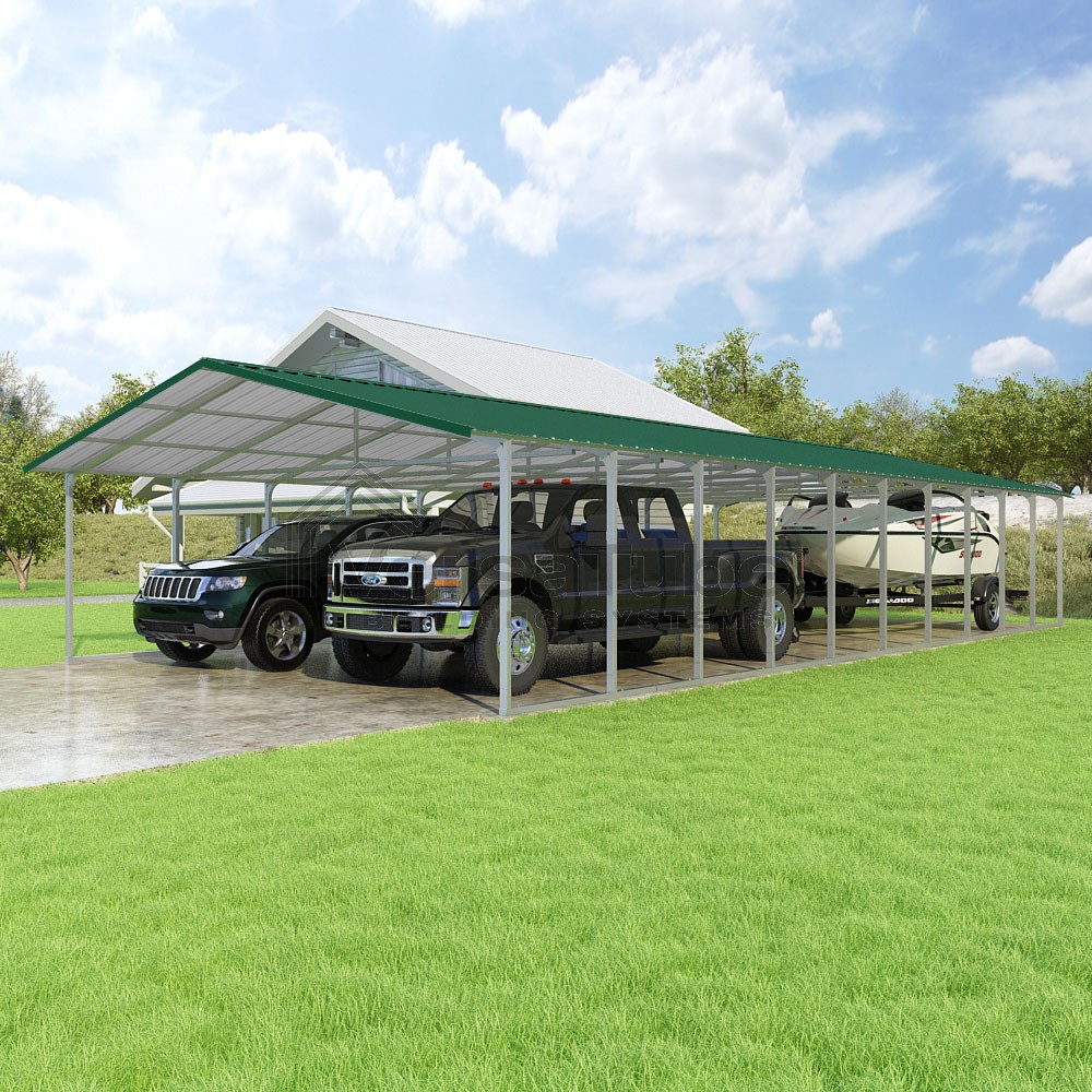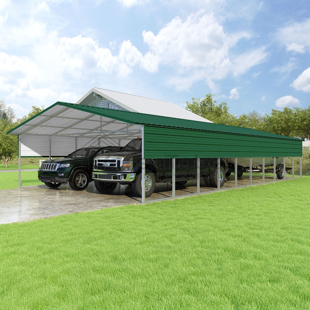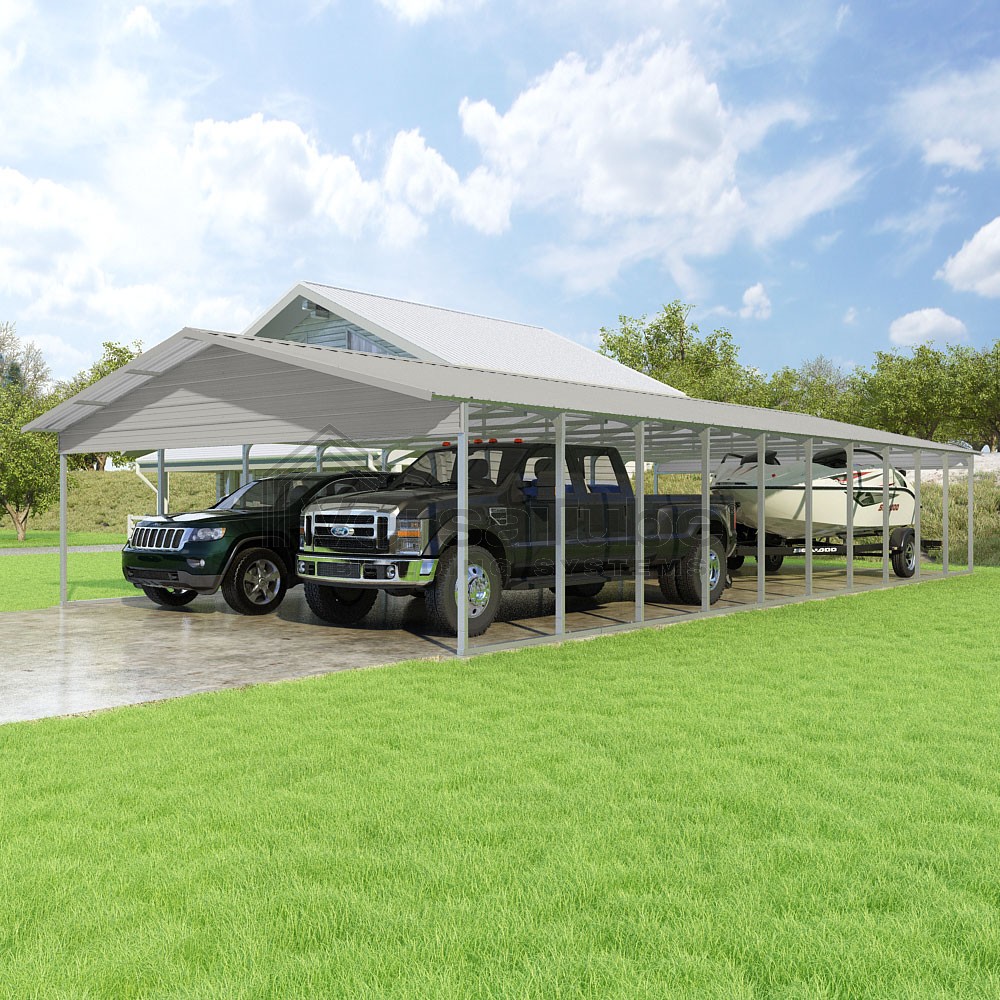 Pinnacle Series DIY carport kit features vertical sheet metal roof panels with ridge cap, gable and eave trim for an A-frame roof style and extended coverage on both ends.