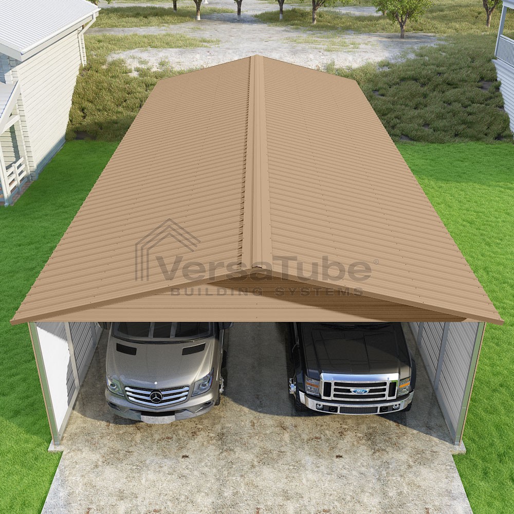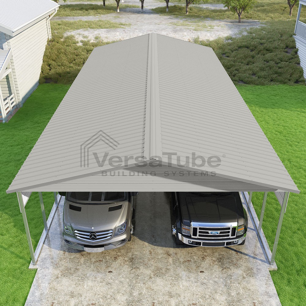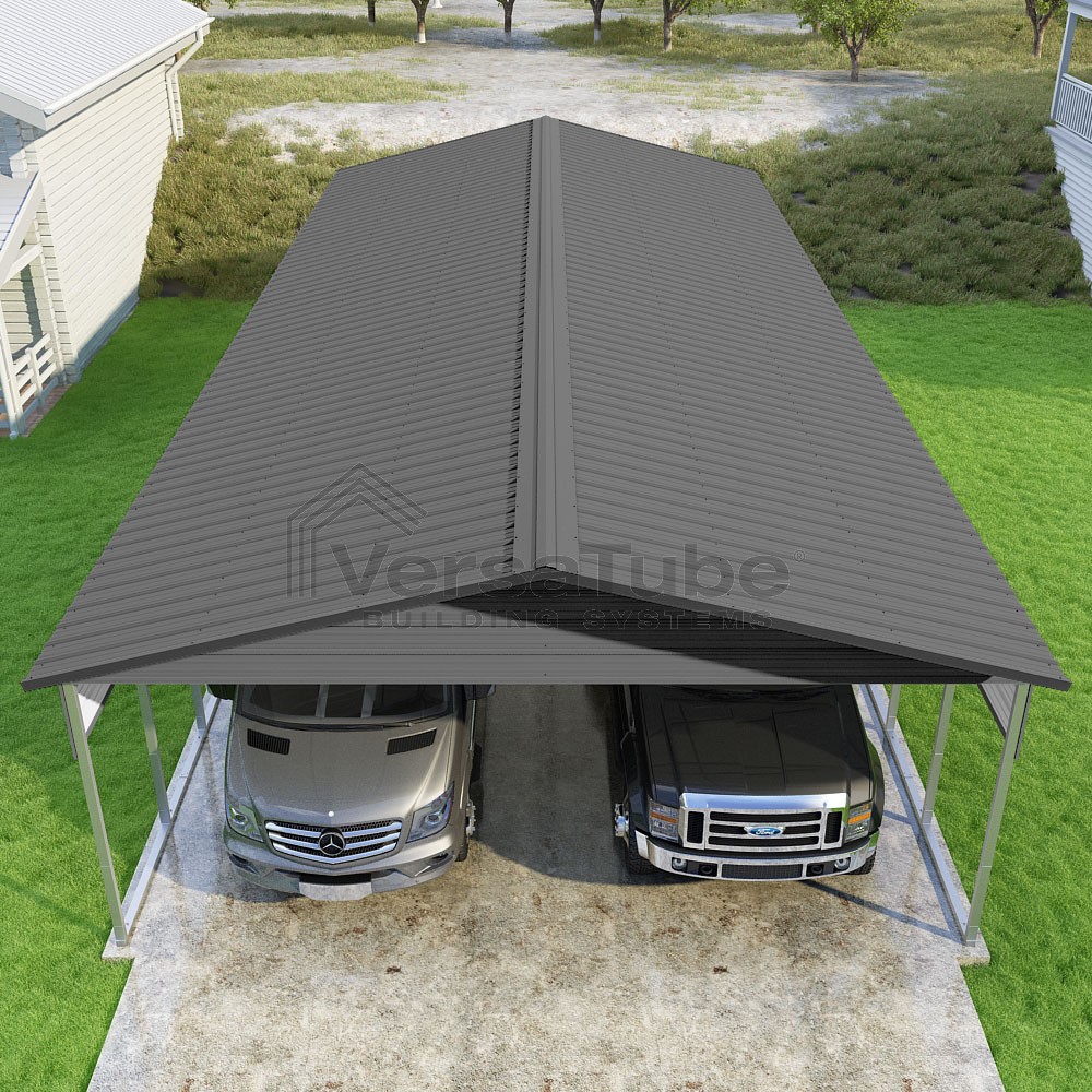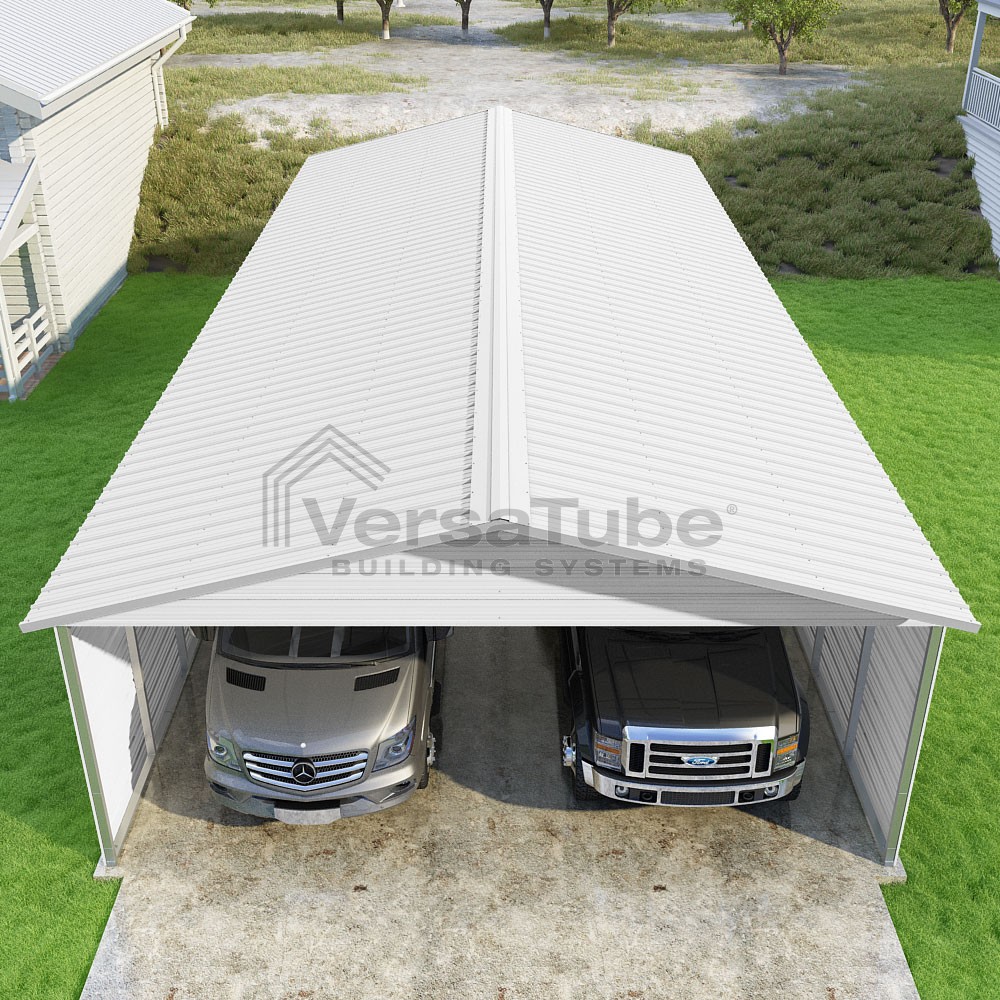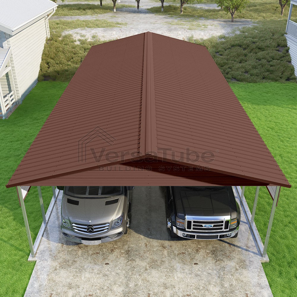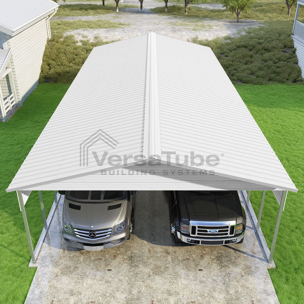 Pinnacle Series DIY carport kit features vertical sheet metal roof panels with ridge cap, gable and eave trim for an A-frame roof style and extended coverage on both ends.