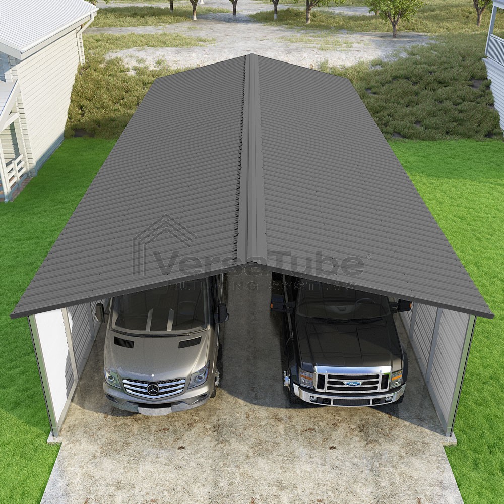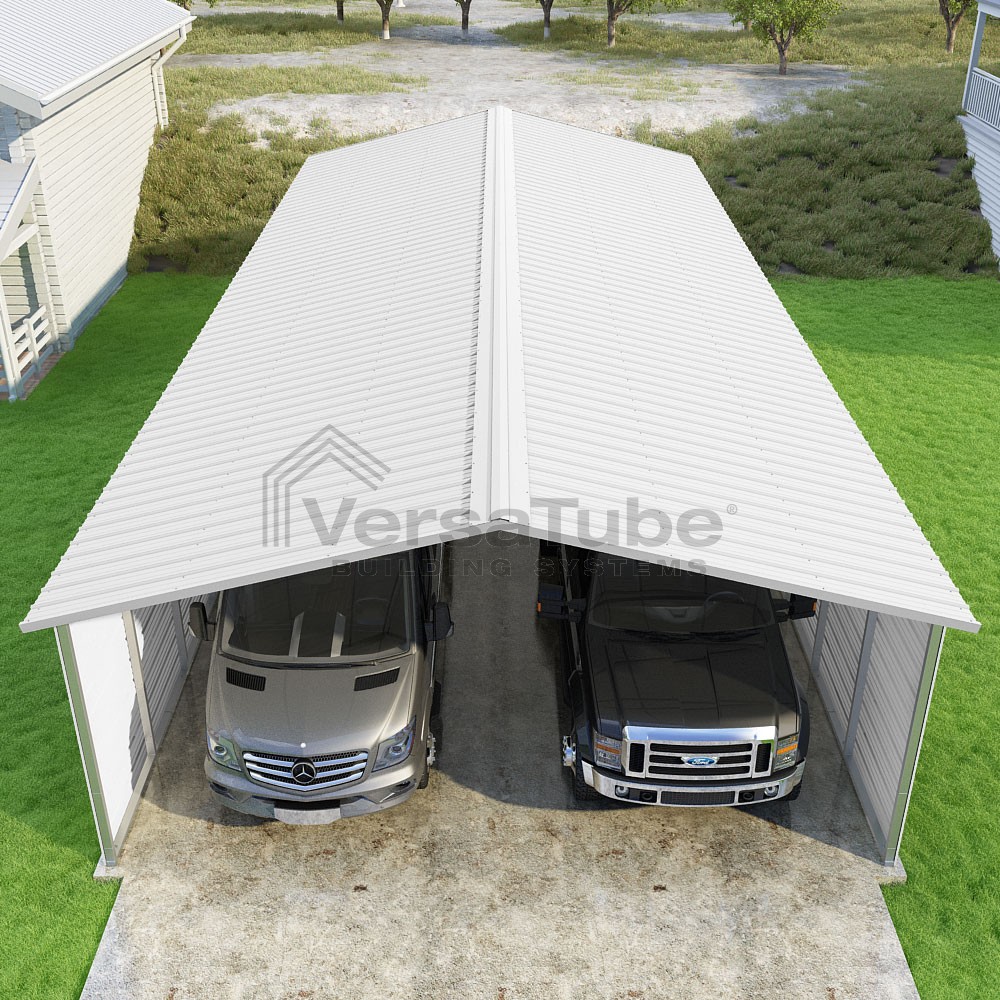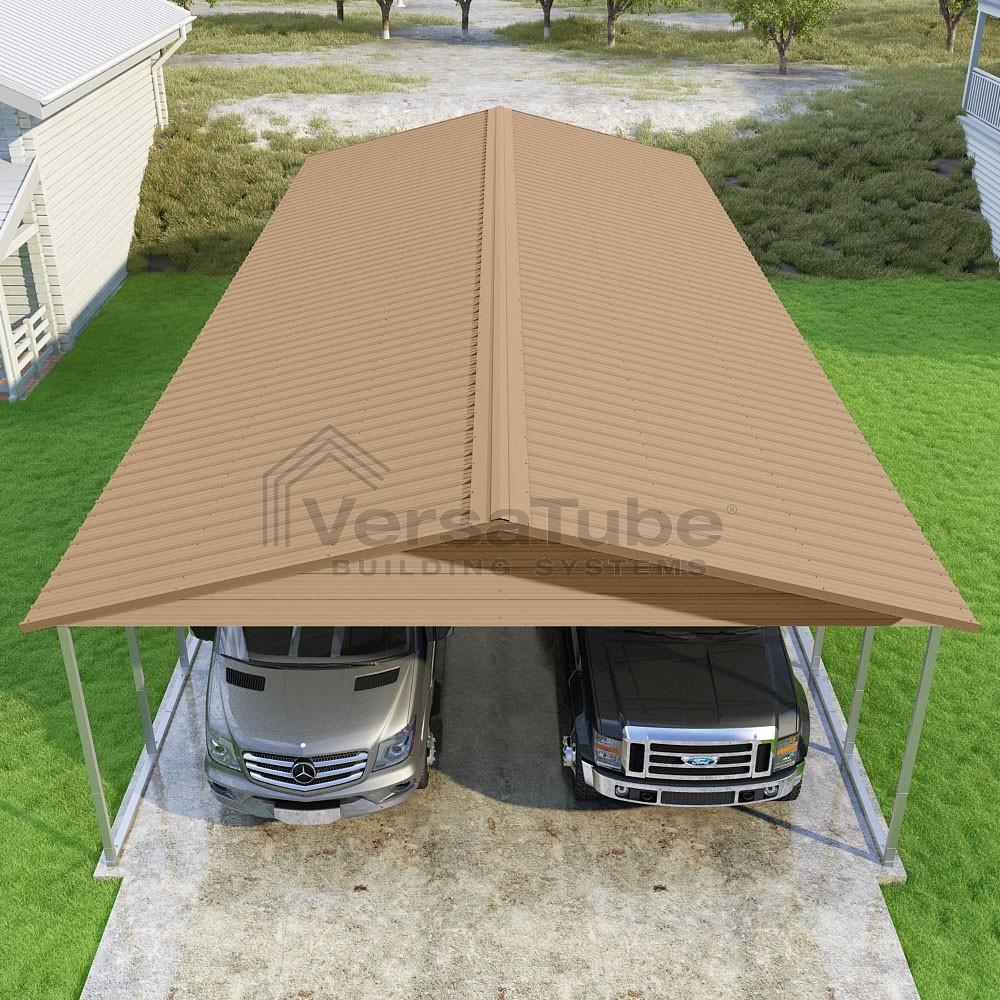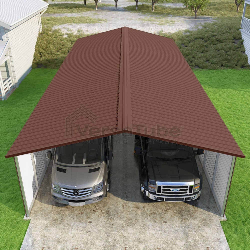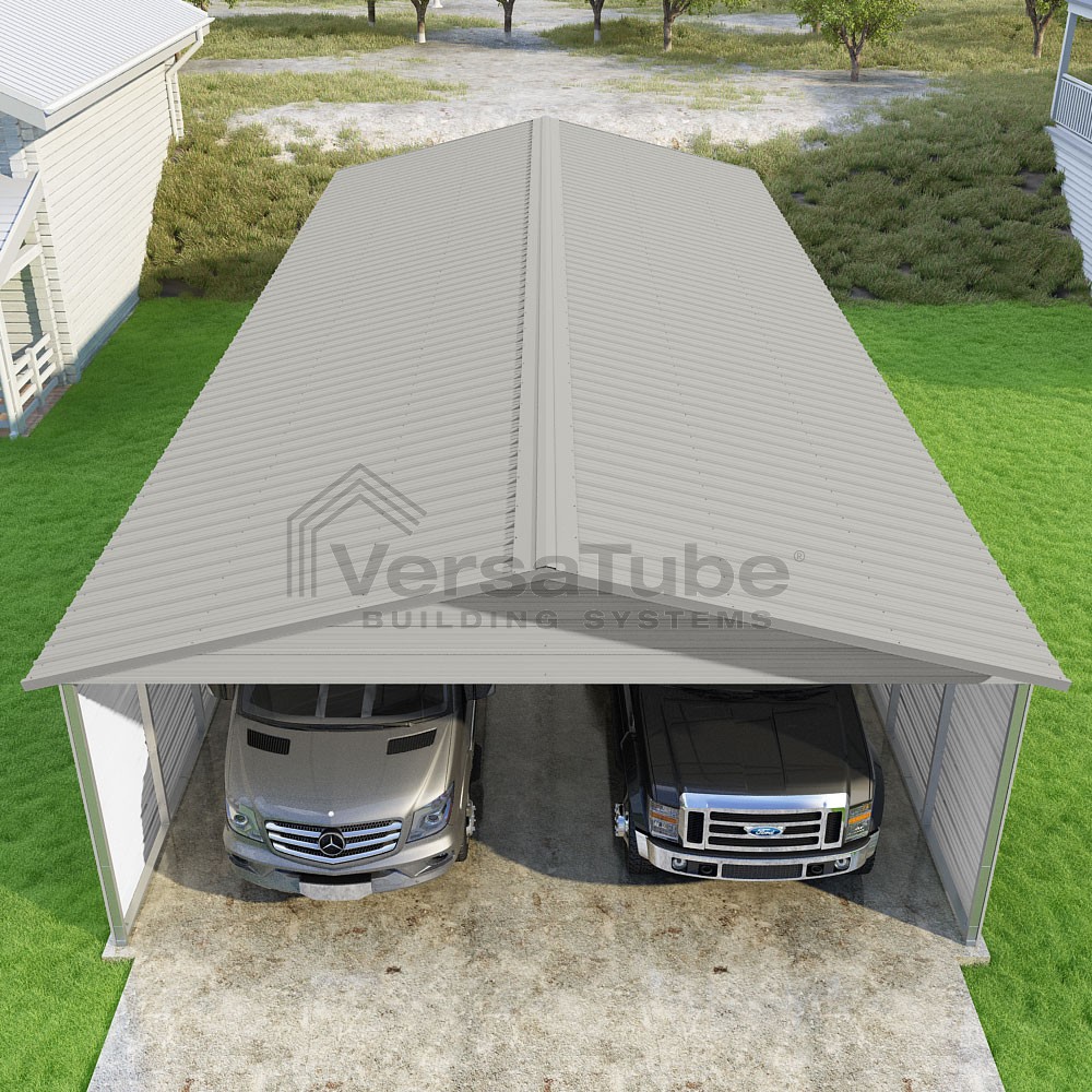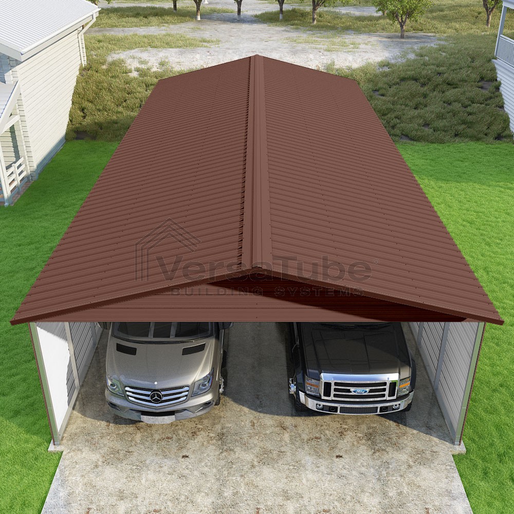 Pinnacle Series DIY carport kit features vertical sheet metal roof panels with ridge cap, gable and eave trim for an A-frame roof style and extended coverage on both ends.