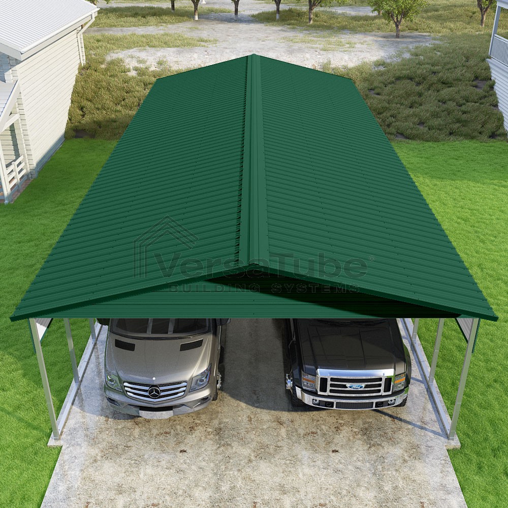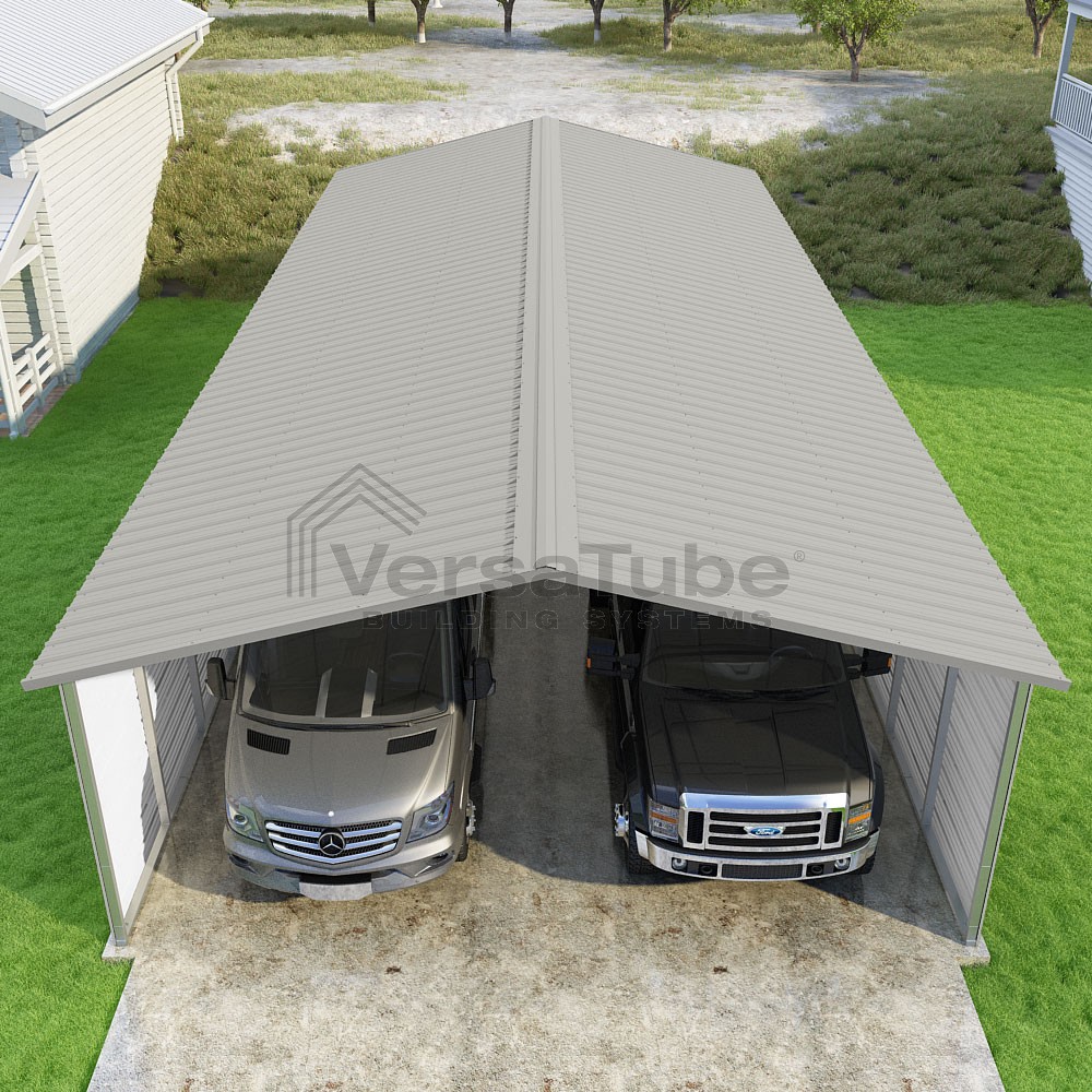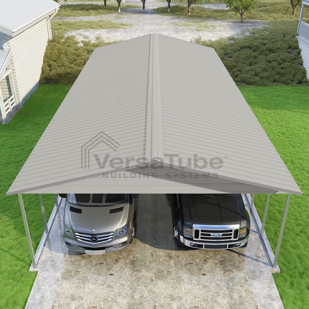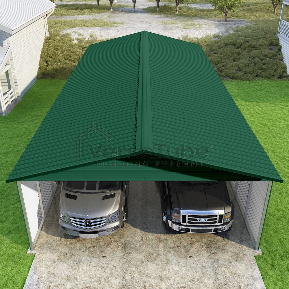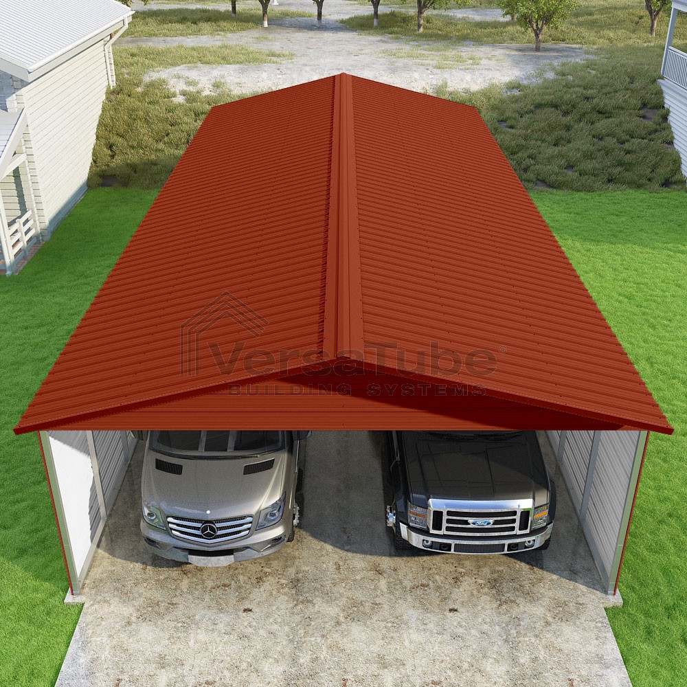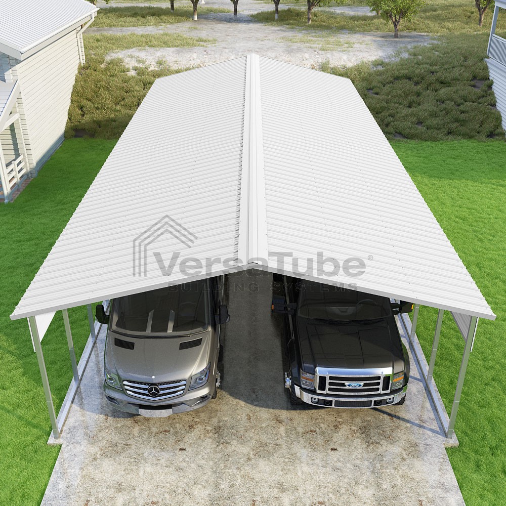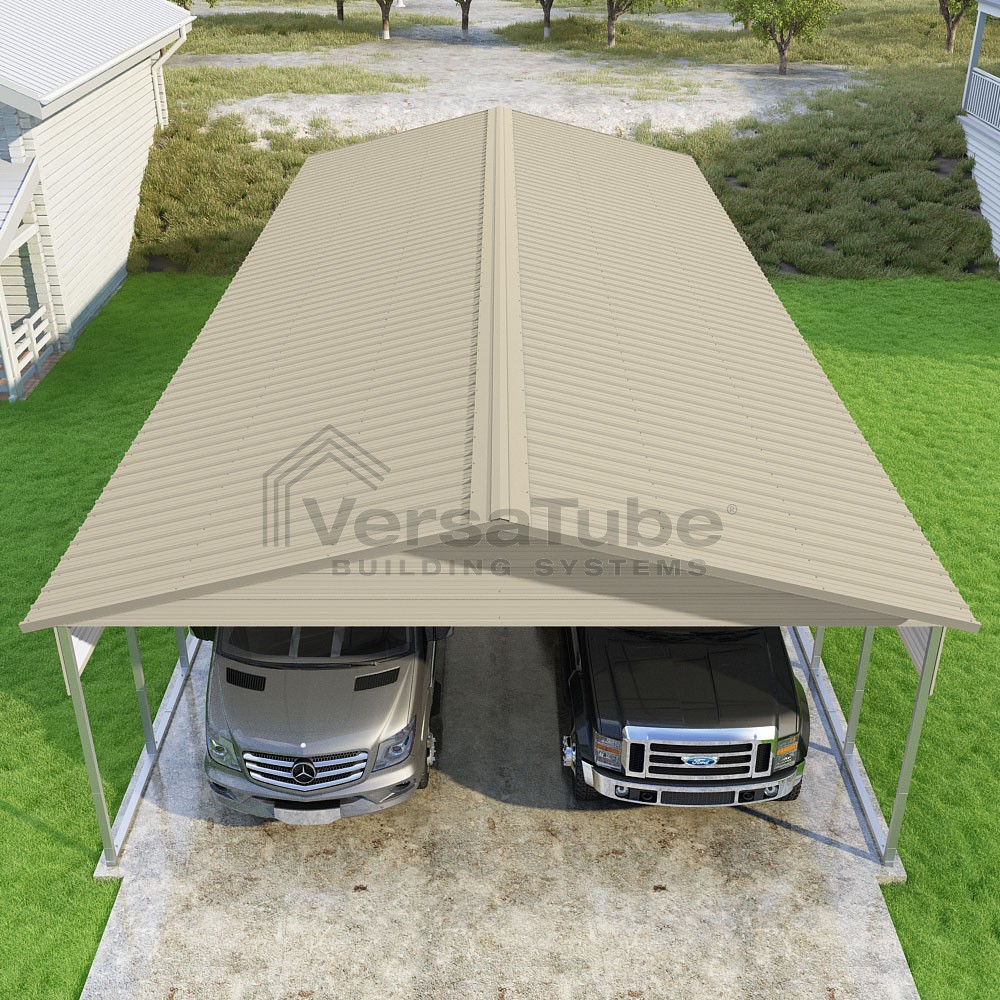 Pinnacle Series DIY carport kit features vertical sheet metal roof panels with ridge cap, gable and eave trim for an A-frame roof style and extended coverage on both ends.