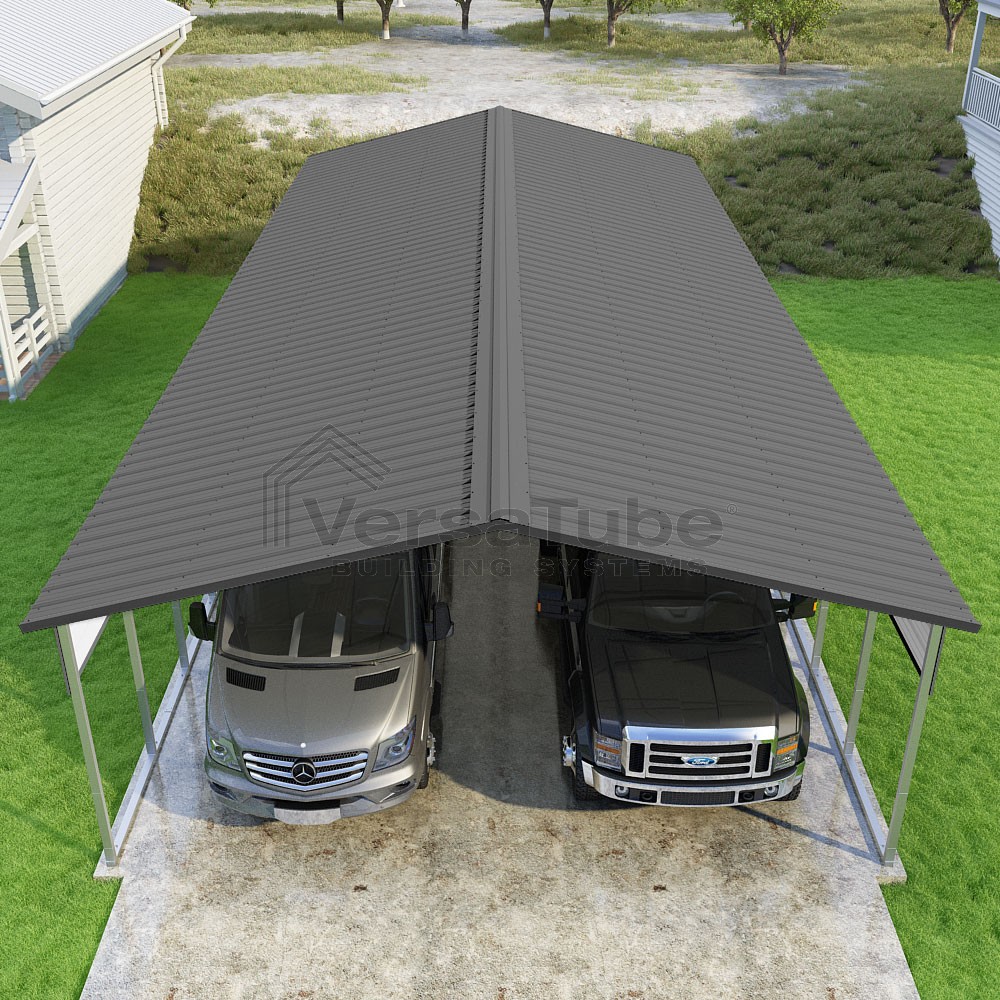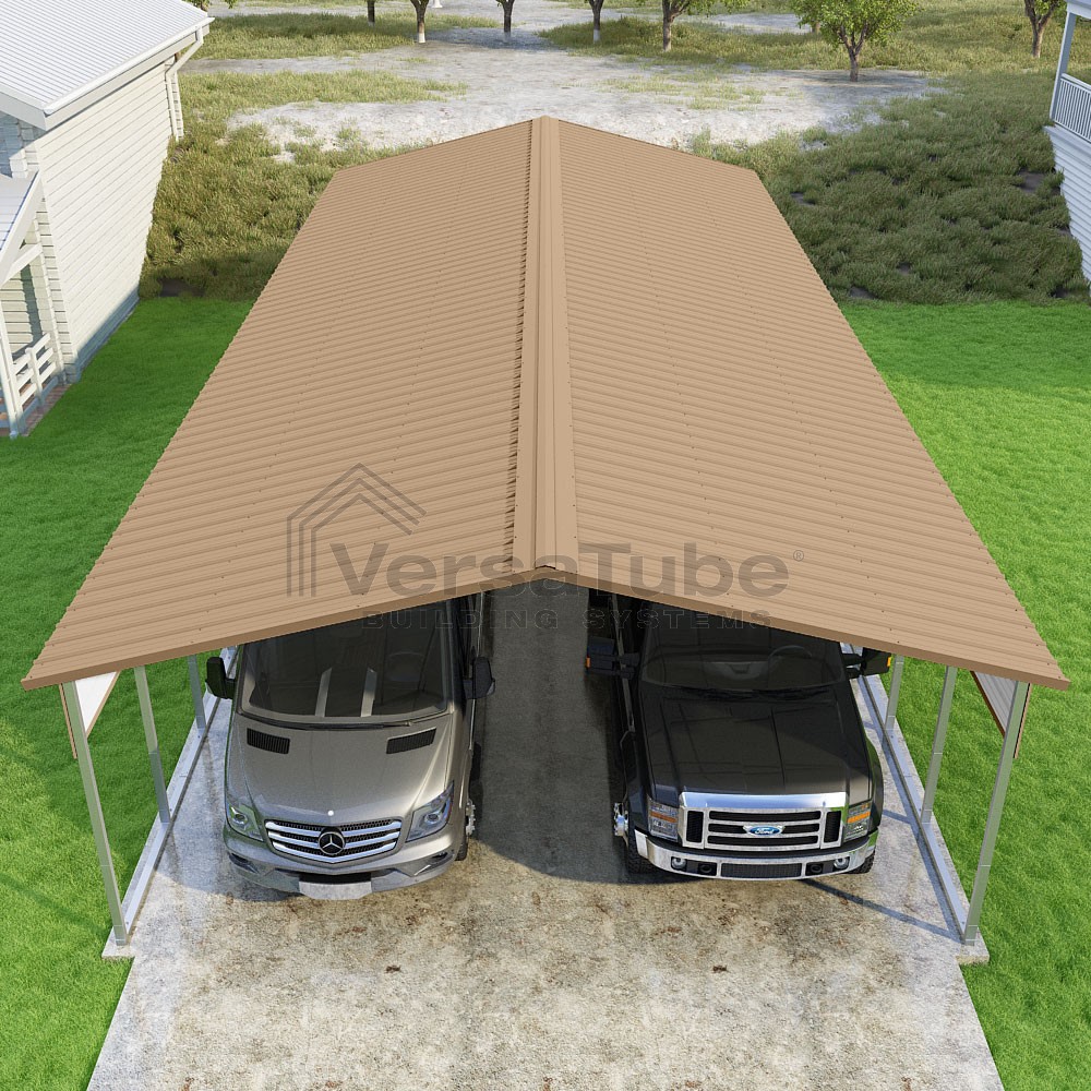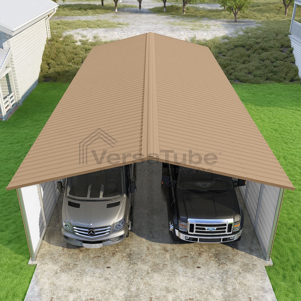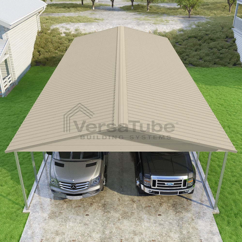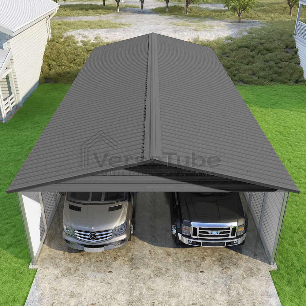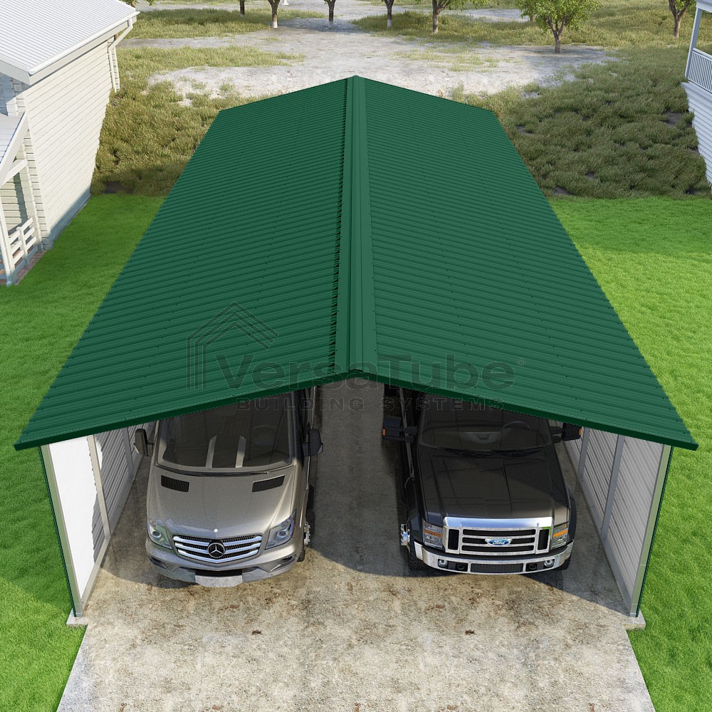 Pinnacle Series DIY carport kit features vertical sheet metal roof panels with ridge cap, gable and eave trim for an A-frame roof style and extended coverage on both ends.