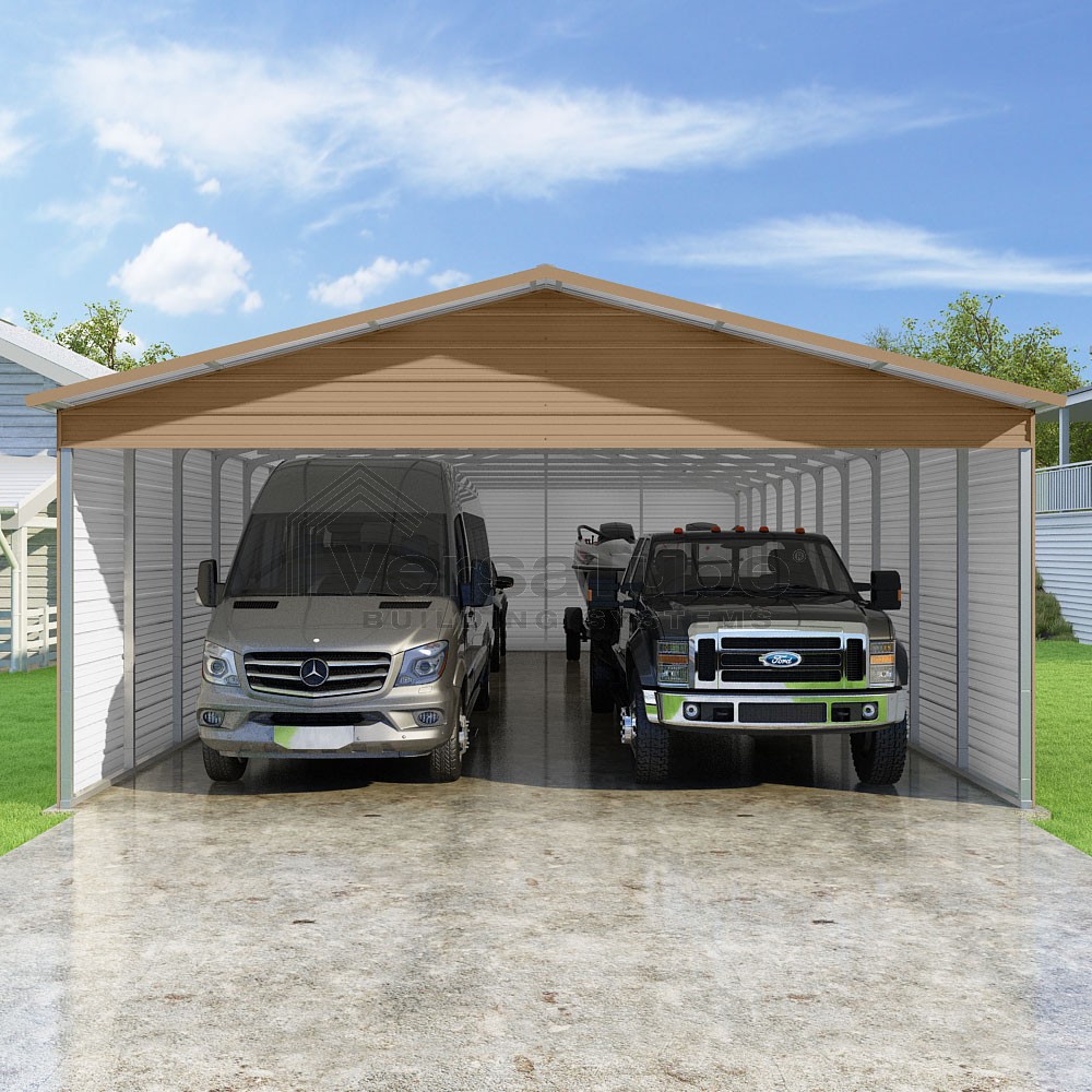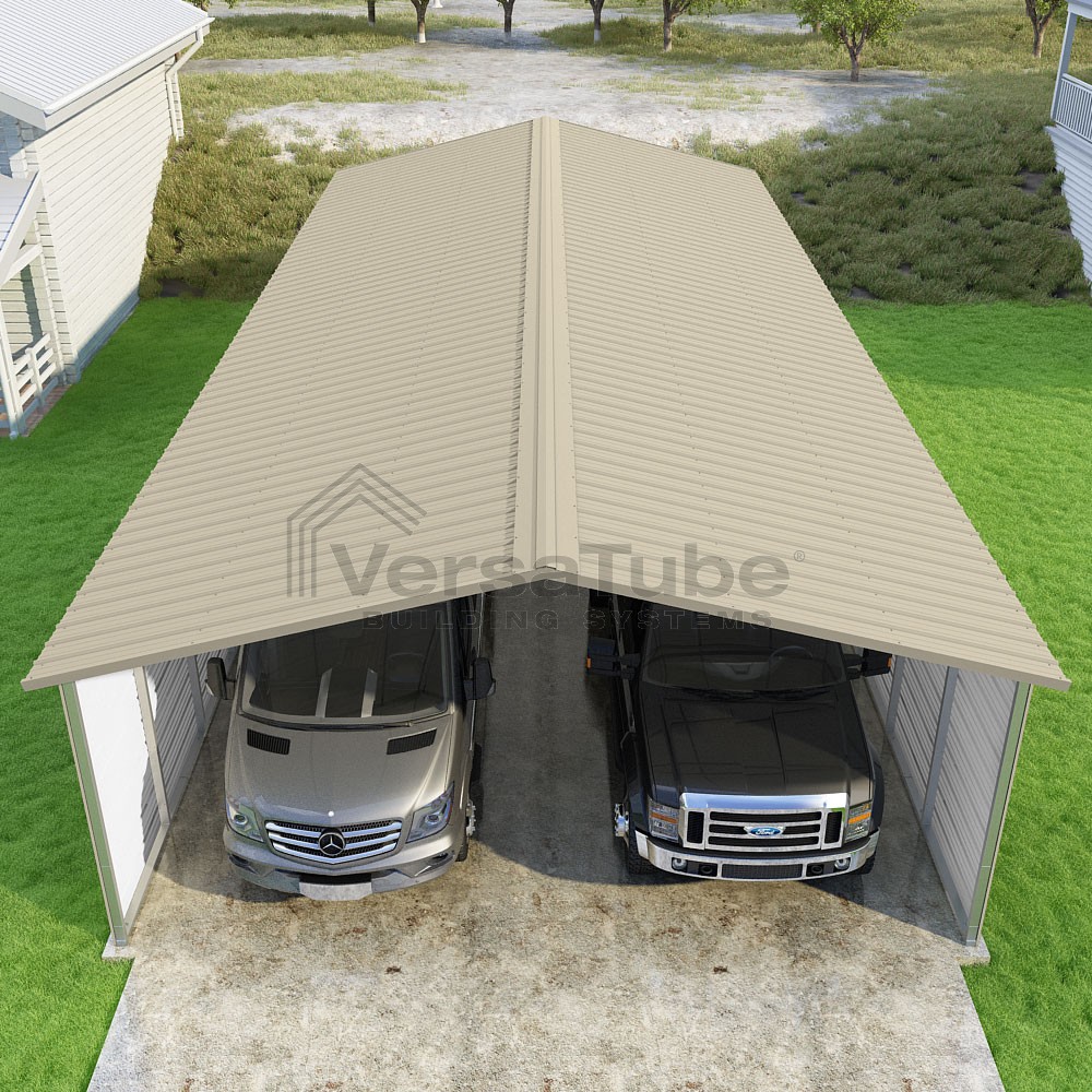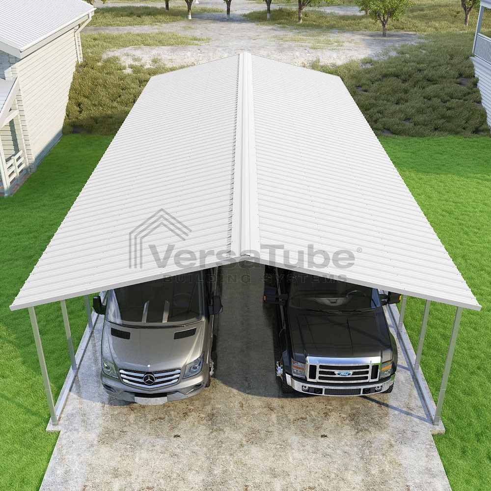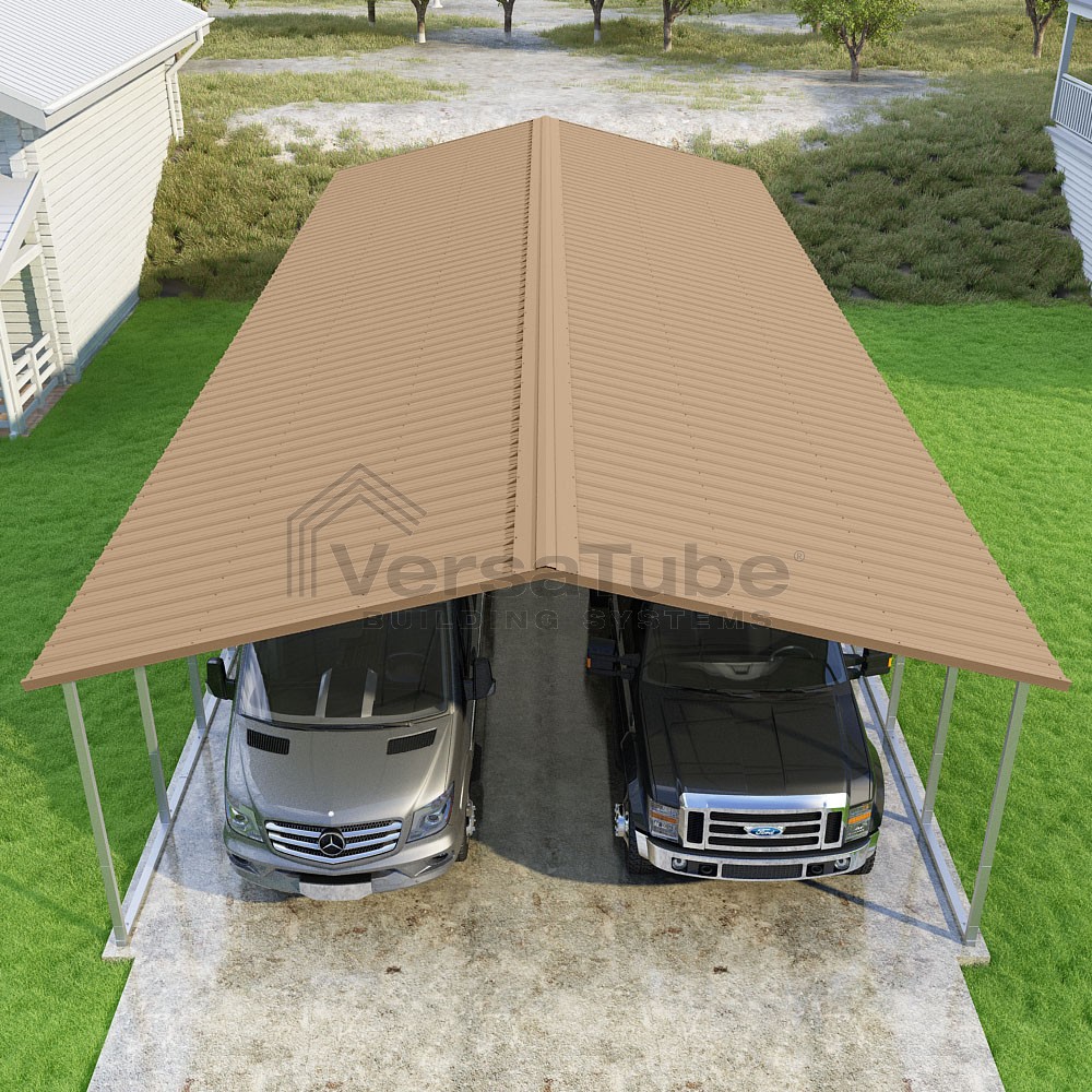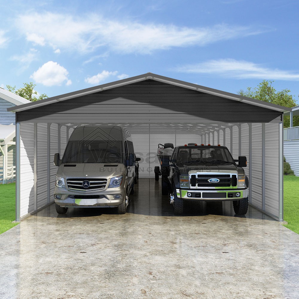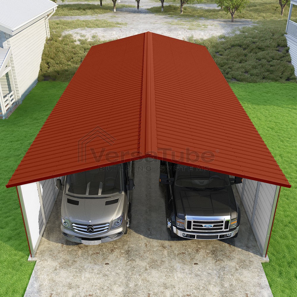 Pinnacle Series DIY carport kit features vertical sheet metal roof panels with ridge cap, gable and eave trim for an A-frame roof style and extended coverage on both ends.