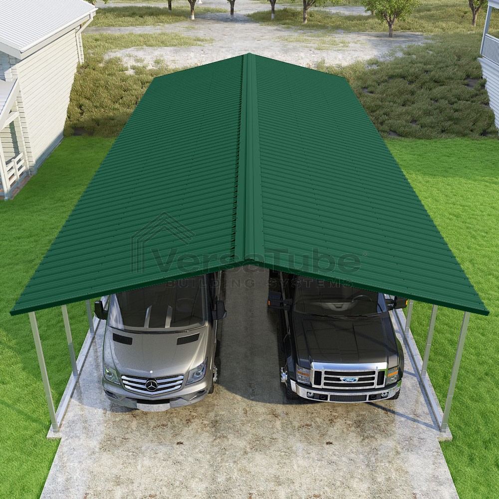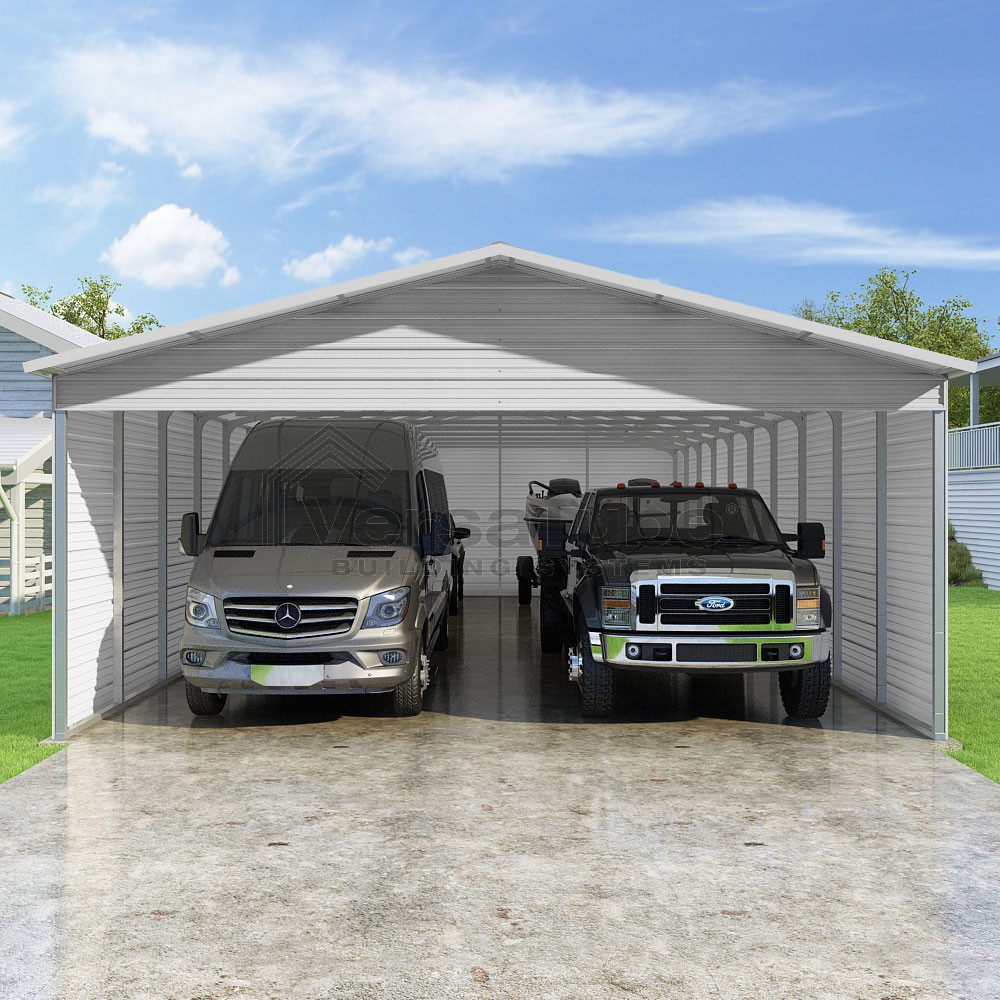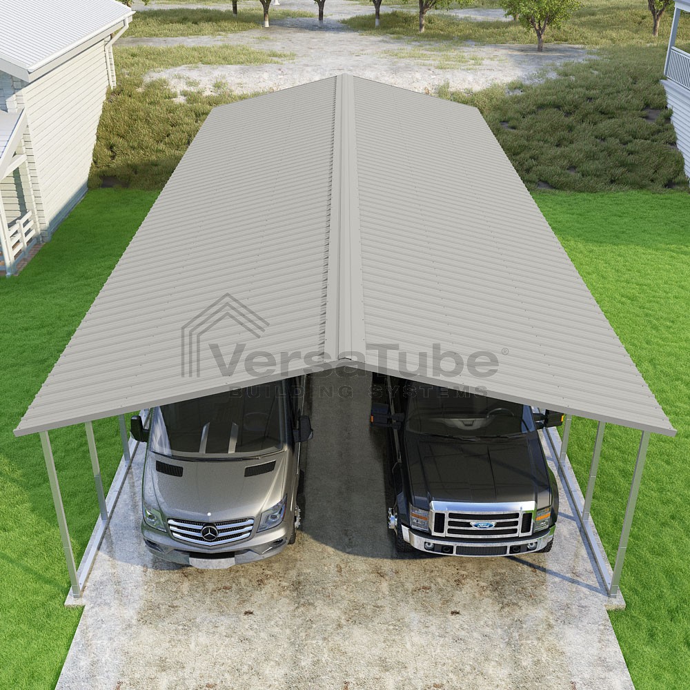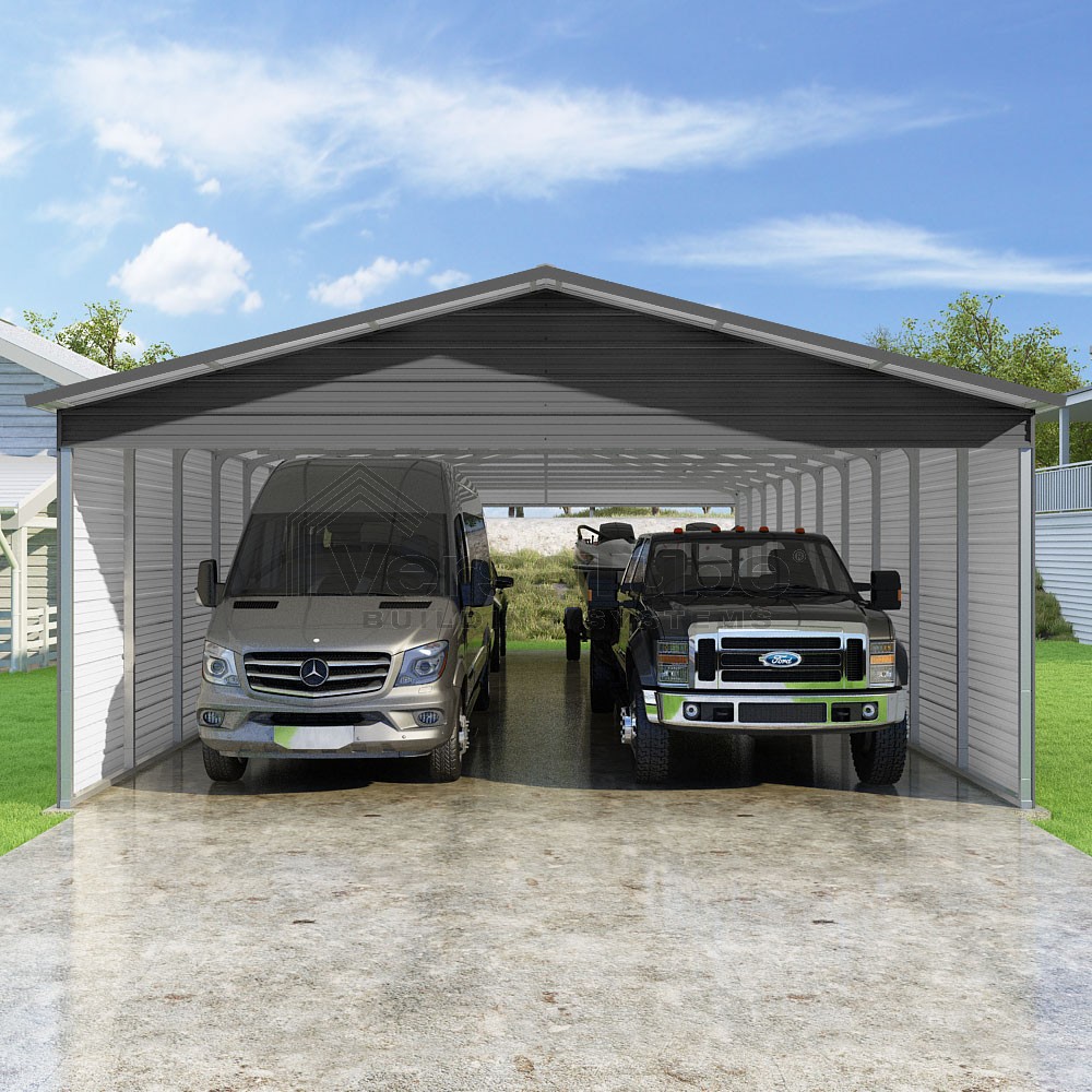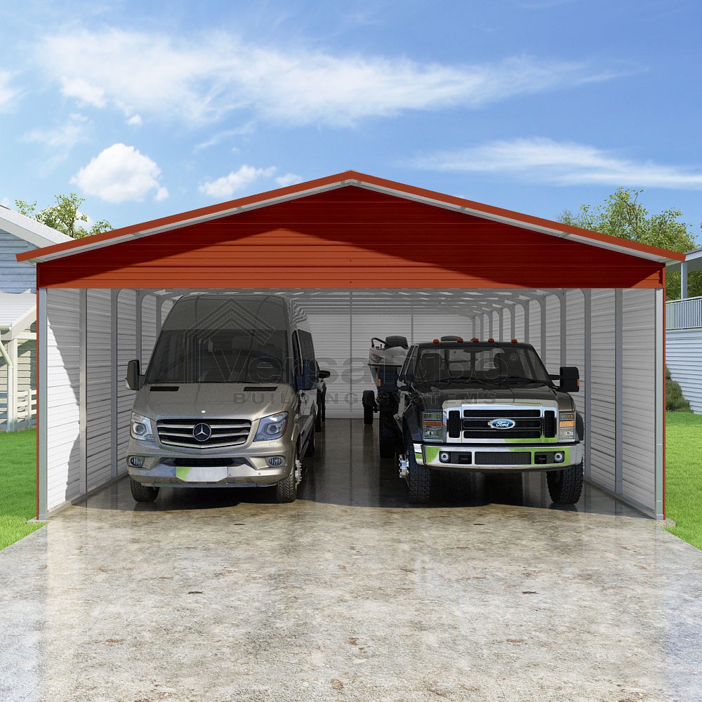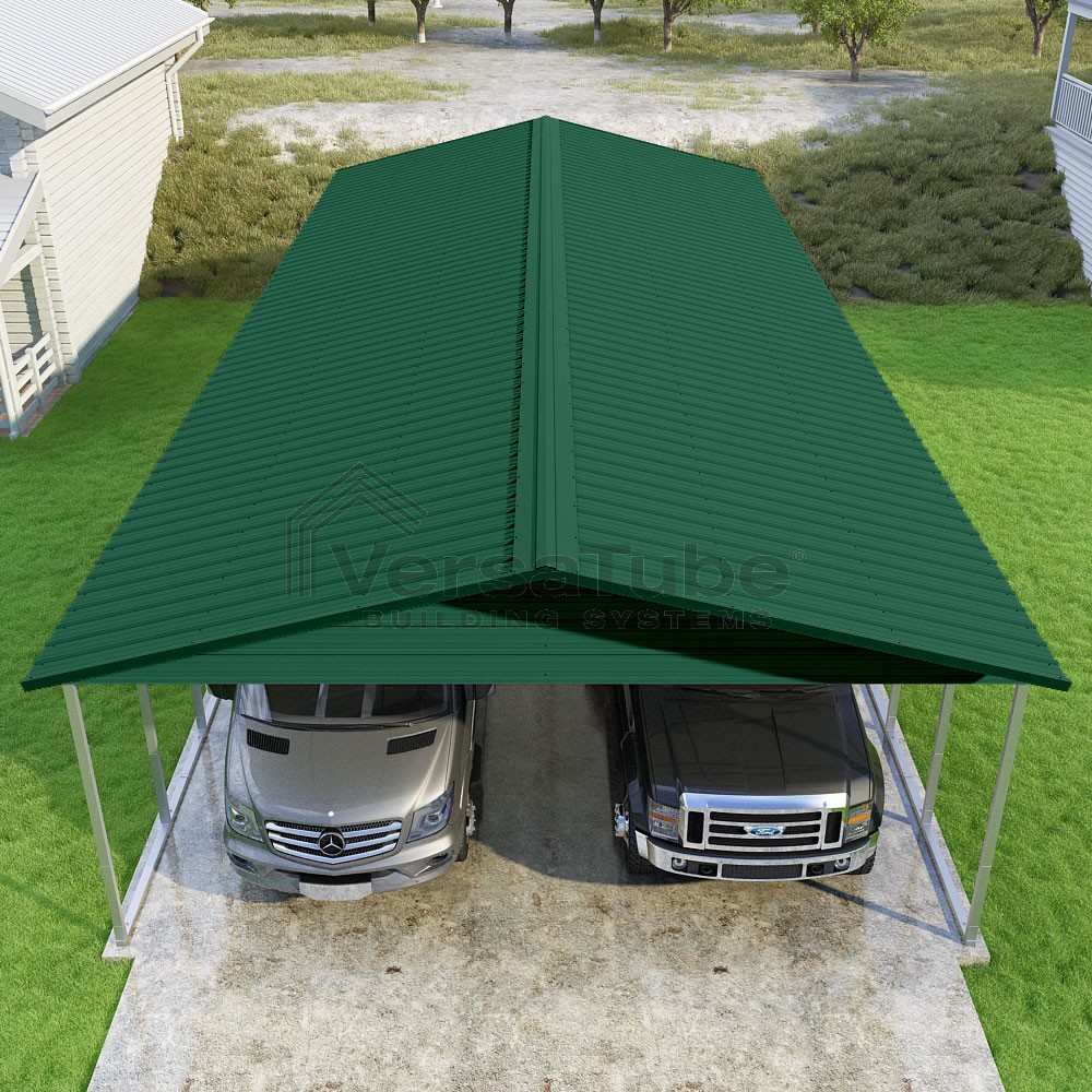 Pinnacle Series DIY carport kit features vertical sheet metal roof panels with ridge cap, gable and eave trim for an A-frame roof style and extended coverage on both ends.