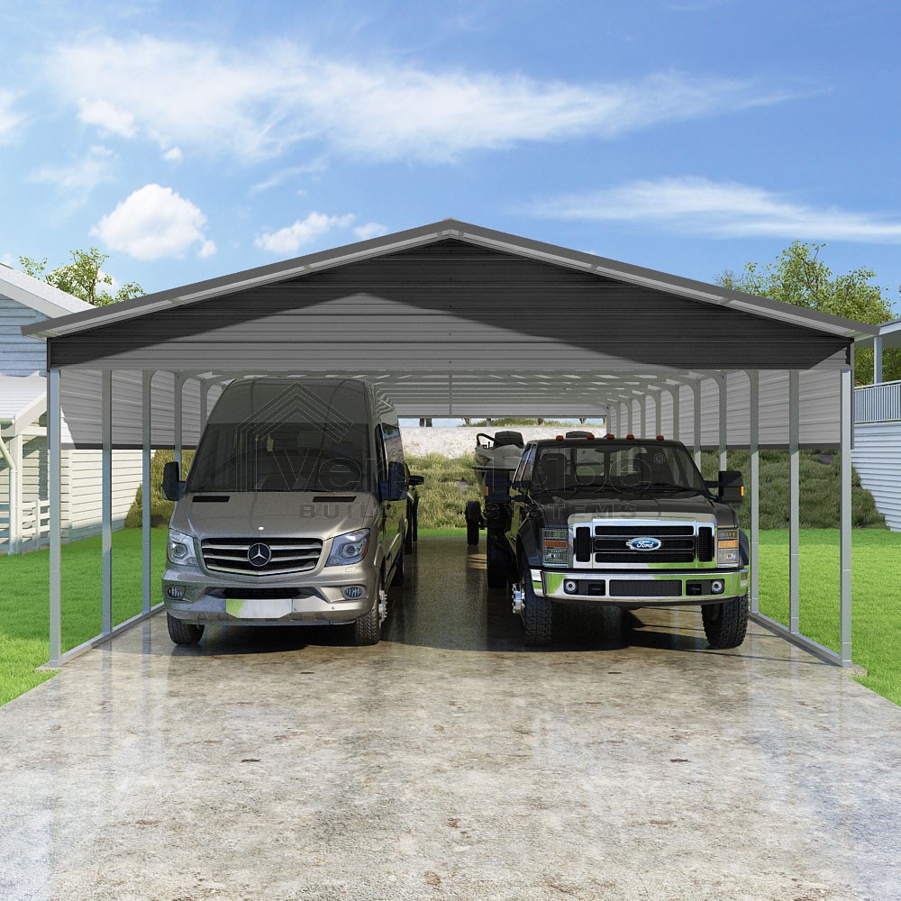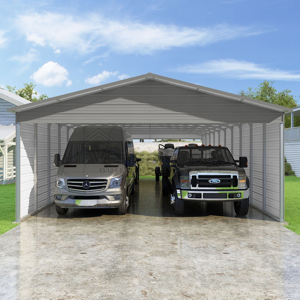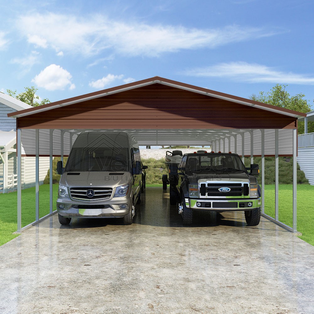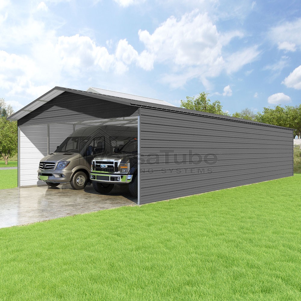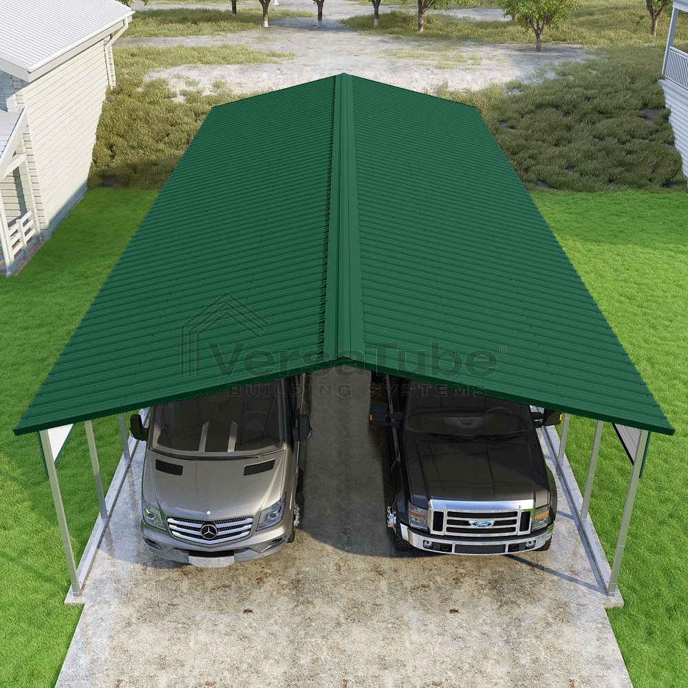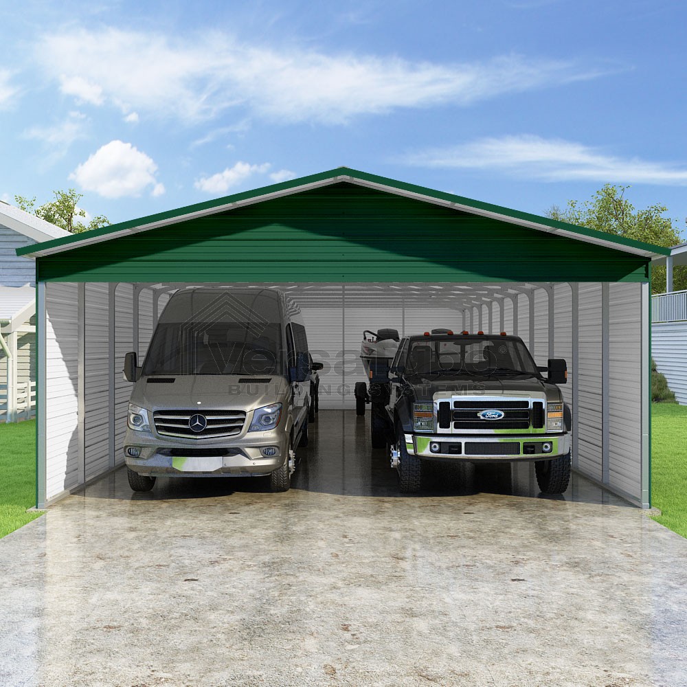 Pinnacle Series DIY carport kit features vertical sheet metal roof panels with ridge cap, gable and eave trim for an A-frame roof style and extended coverage on both ends.