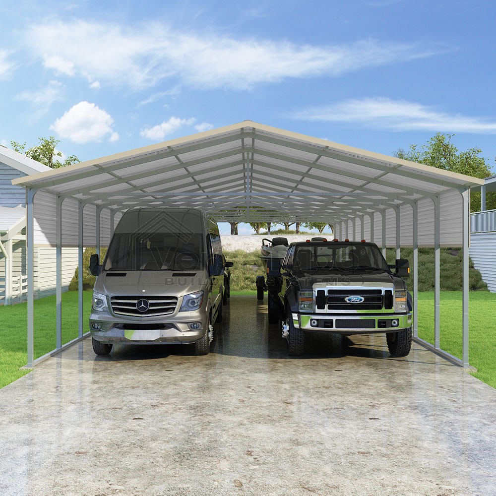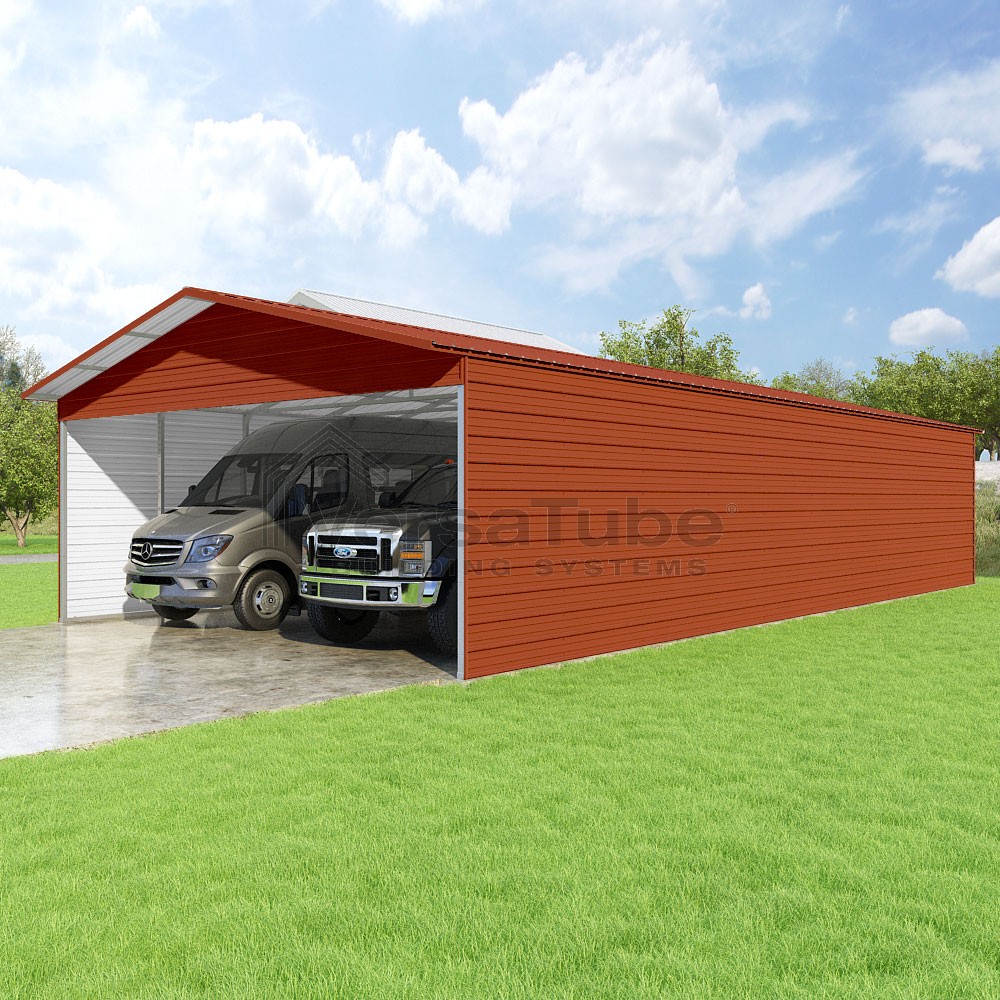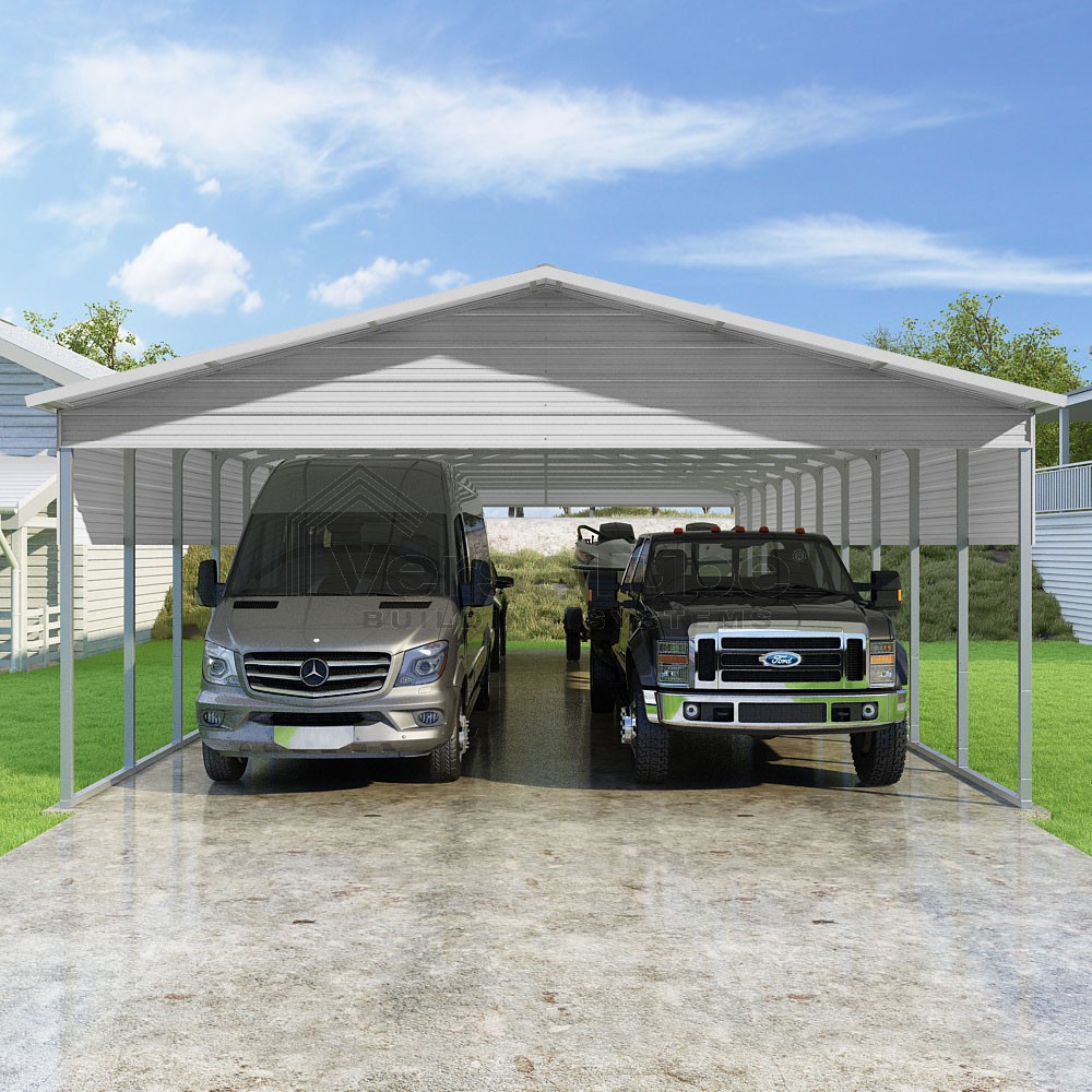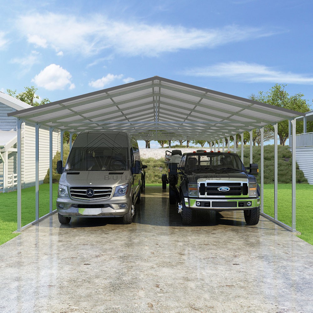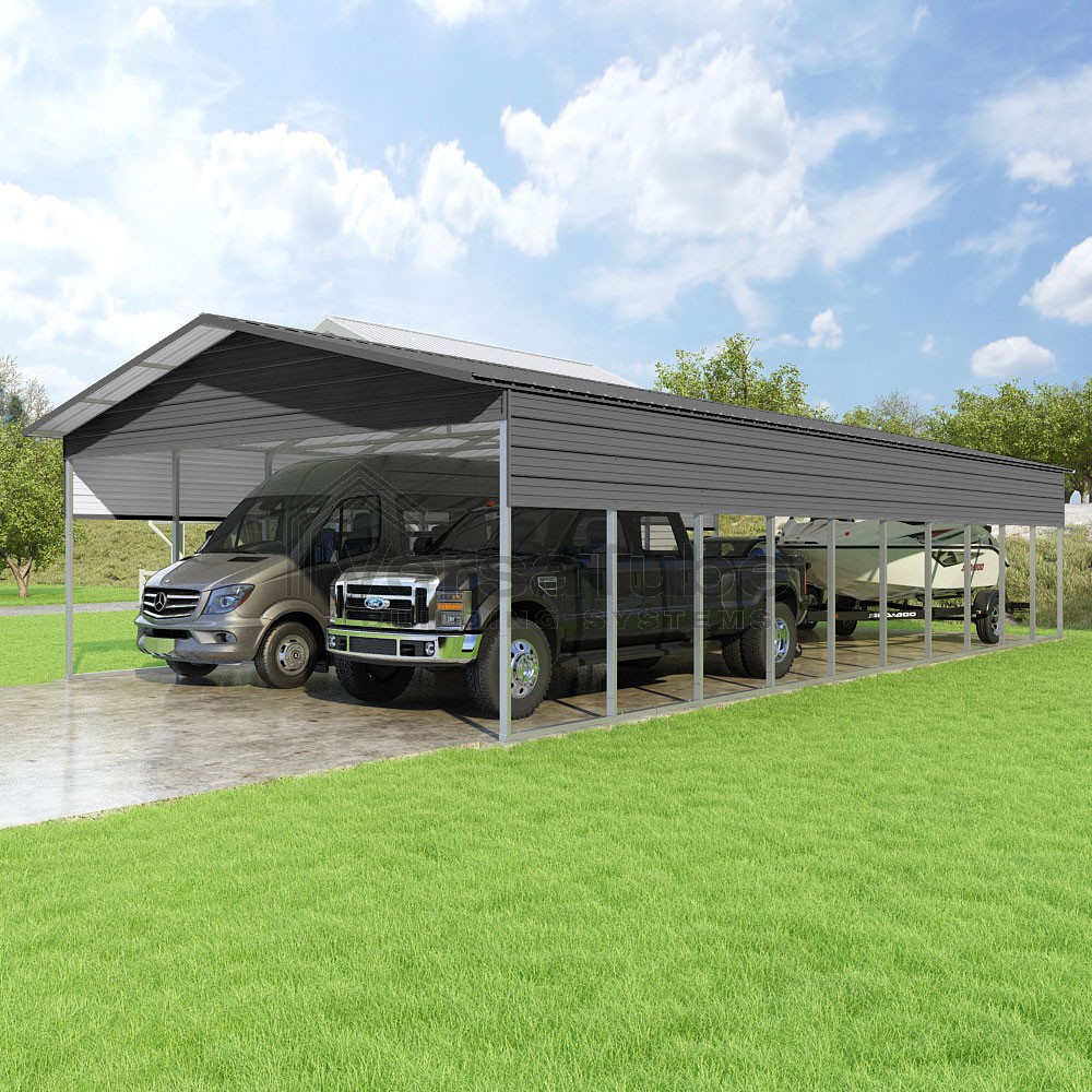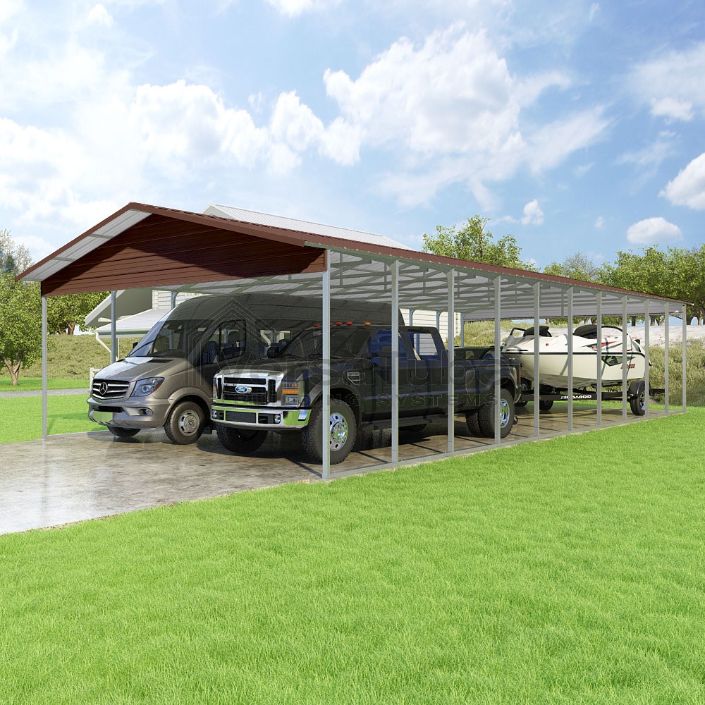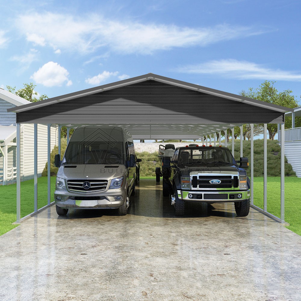 Pinnacle Series DIY carport kit features vertical sheet metal roof panels with ridge cap, gable and eave trim for an A-frame roof style and extended coverage on both ends.