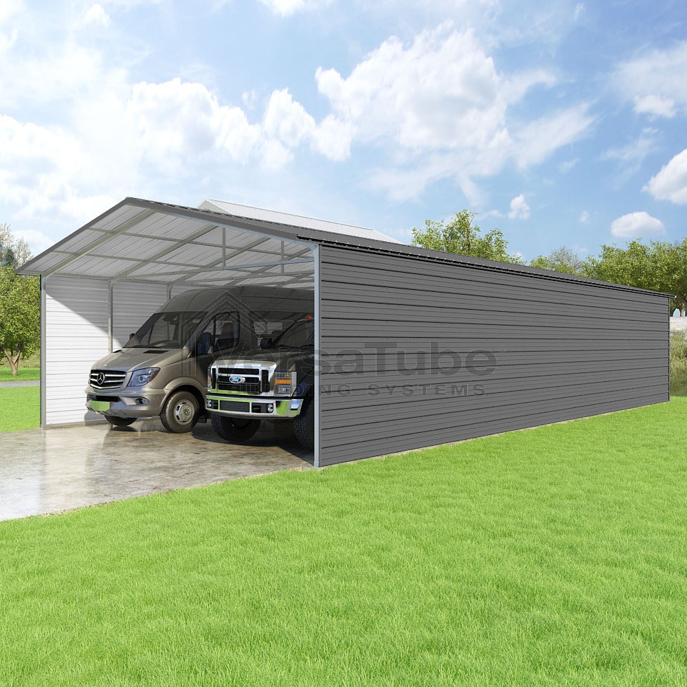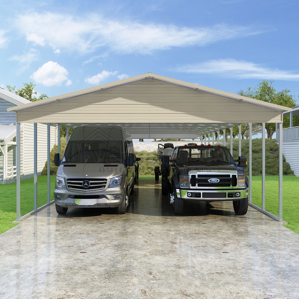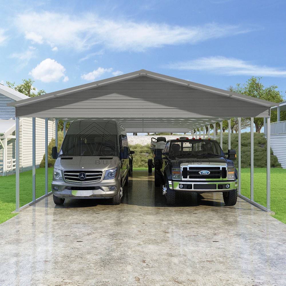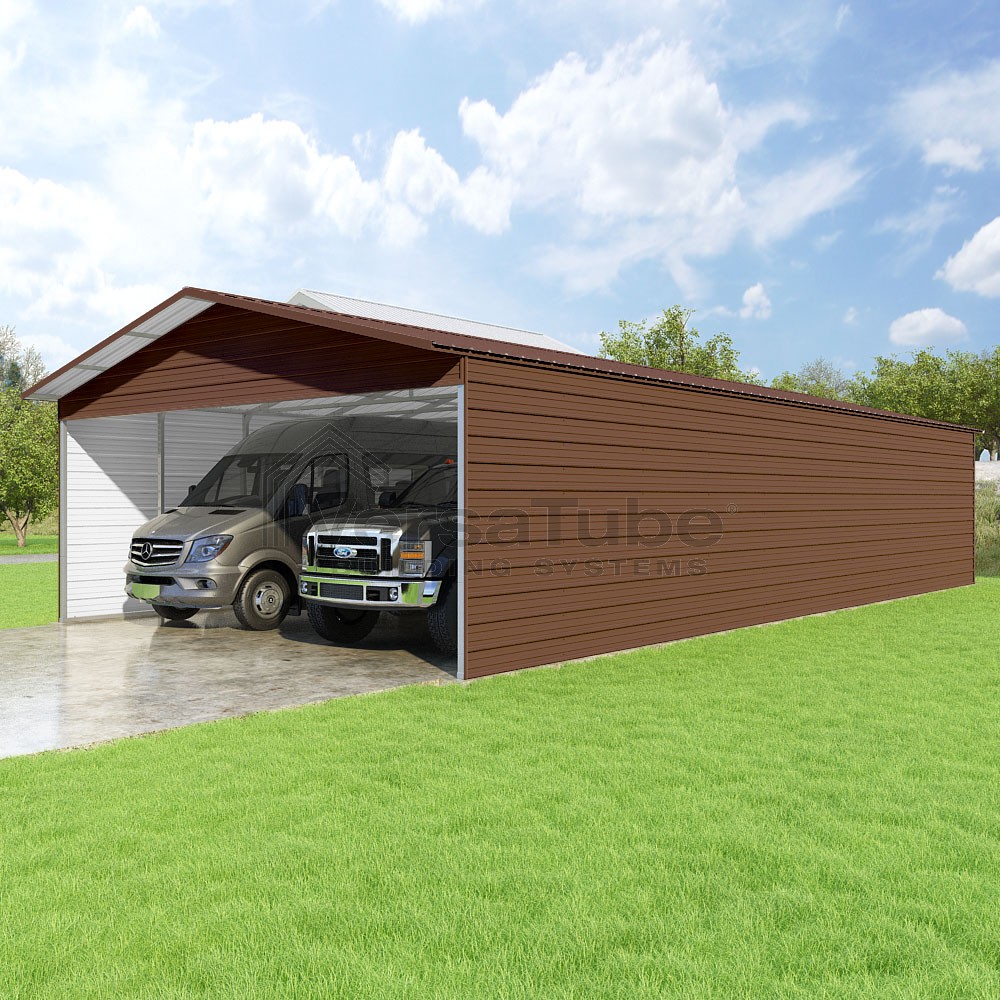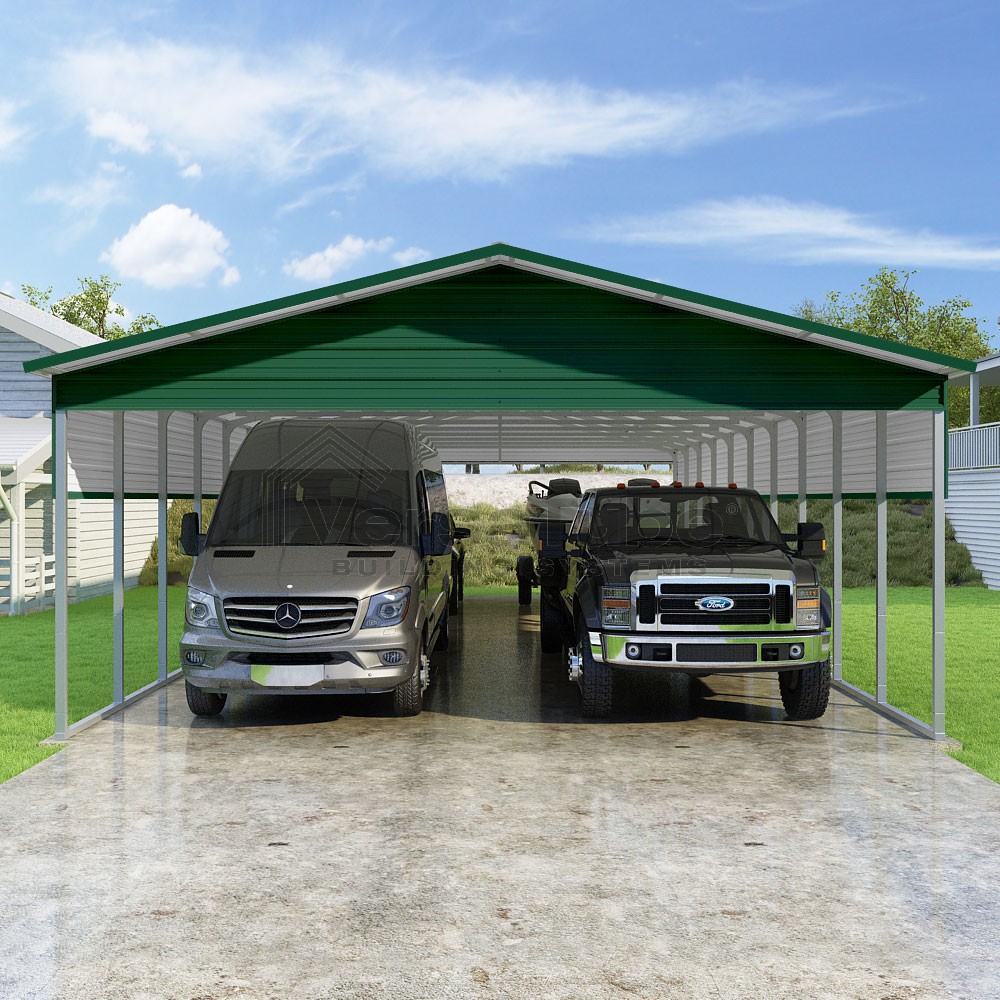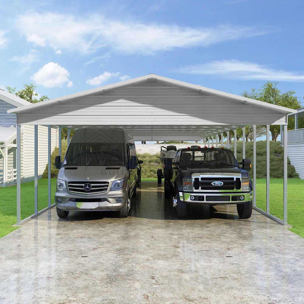 Pinnacle Series DIY carport kit features vertical sheet metal roof panels with ridge cap, gable and eave trim for an A-frame roof style and extended coverage on both ends.