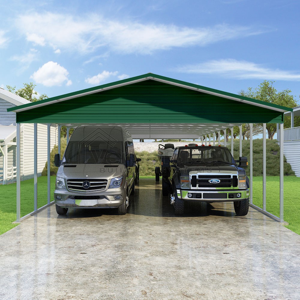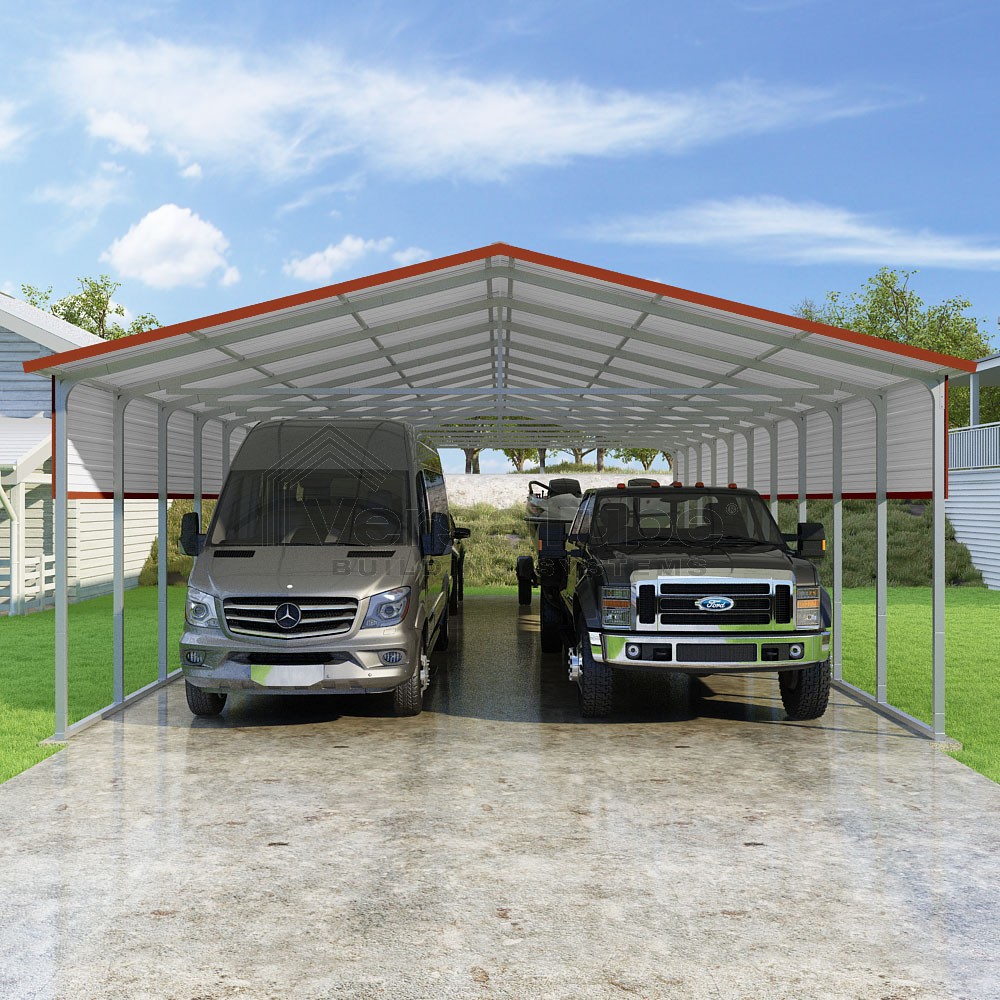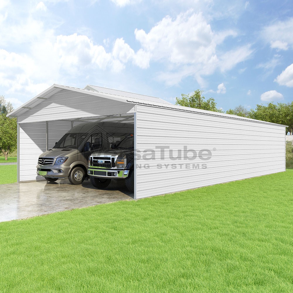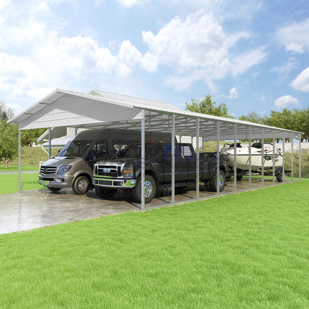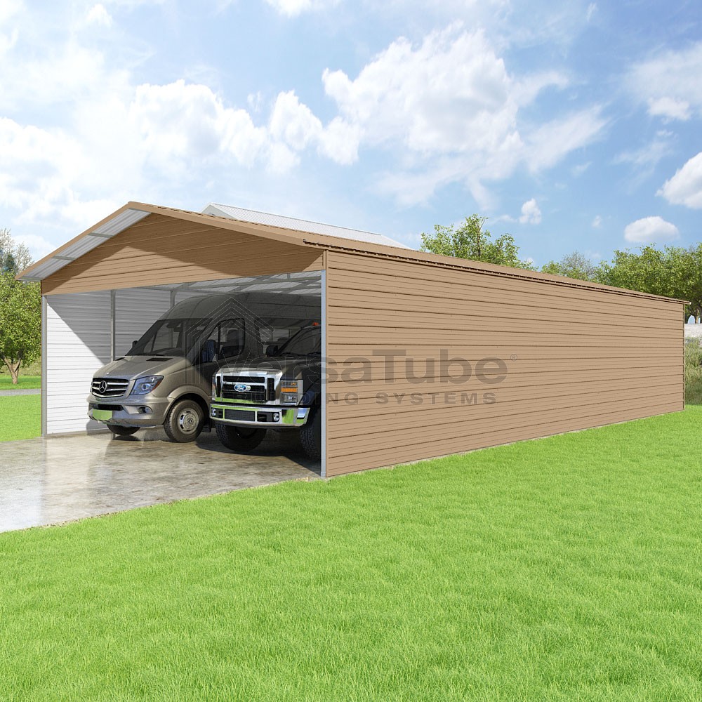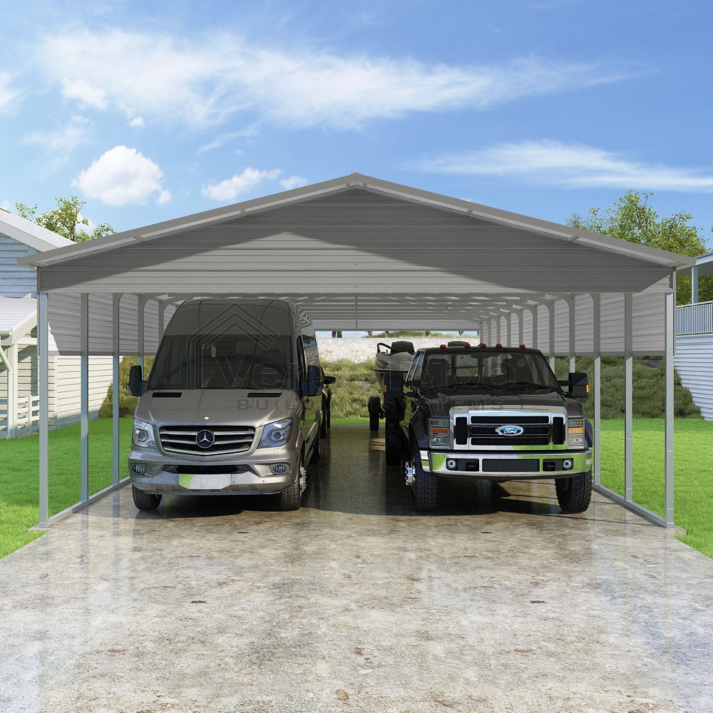 Pinnacle Series DIY carport kit features vertical sheet metal roof panels with ridge cap, gable and eave trim for an A-frame roof style and extended coverage on both ends.