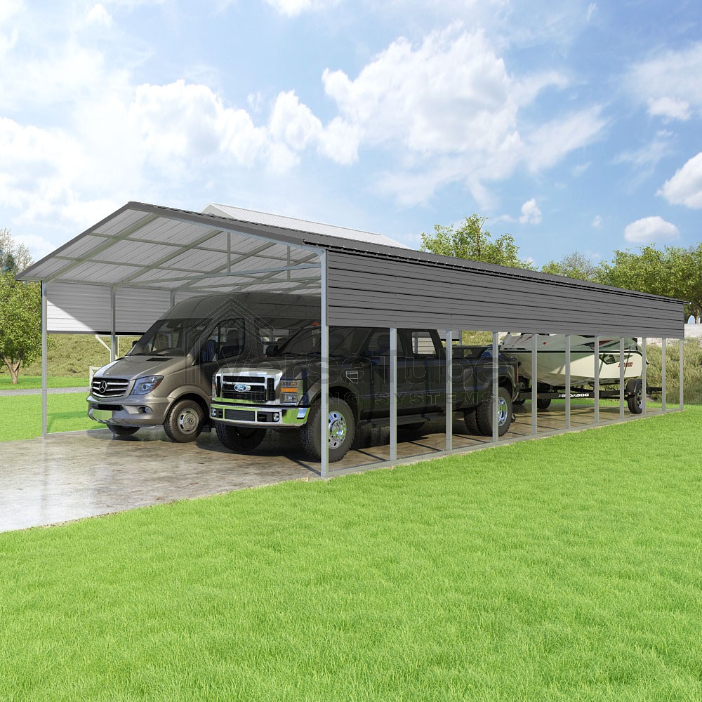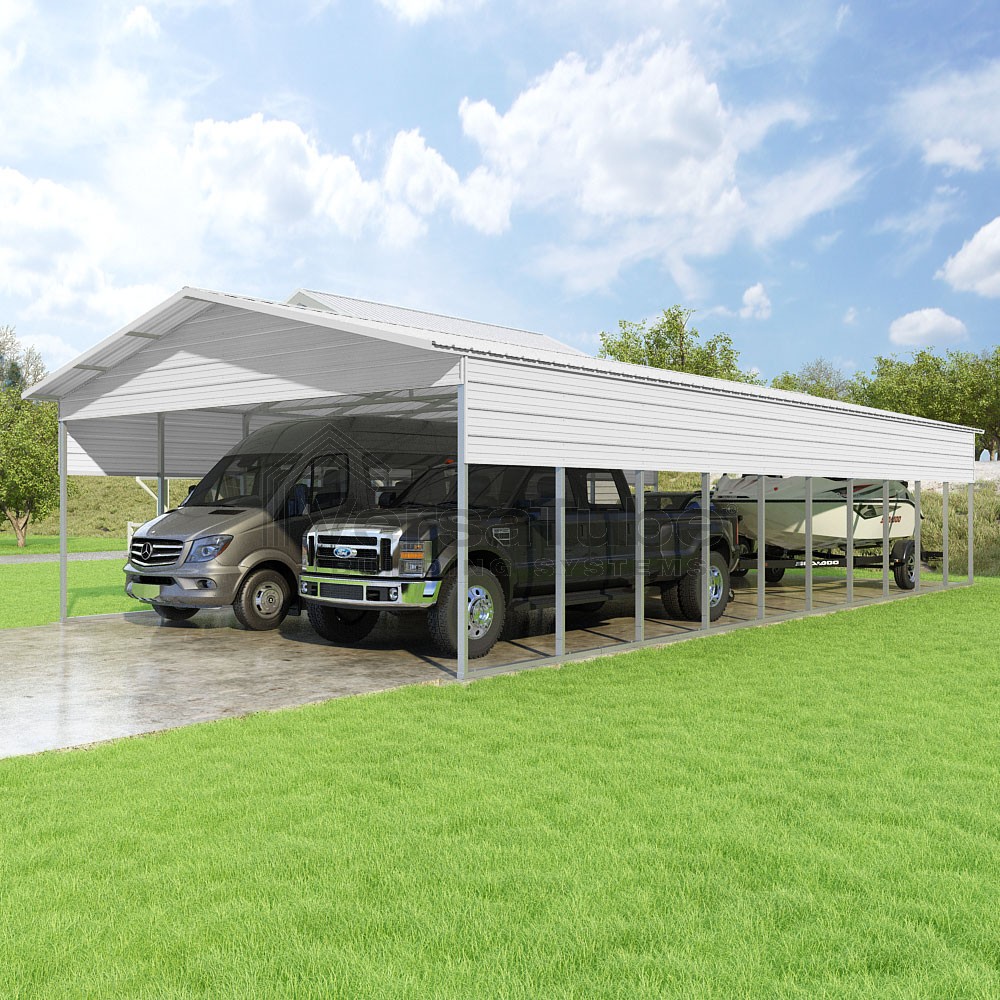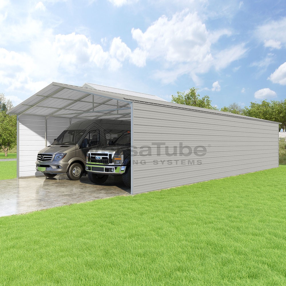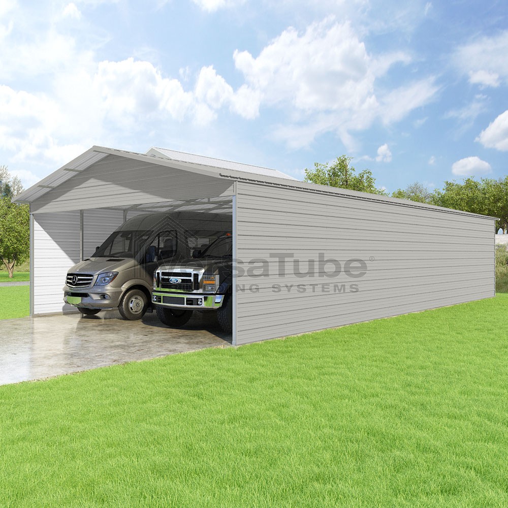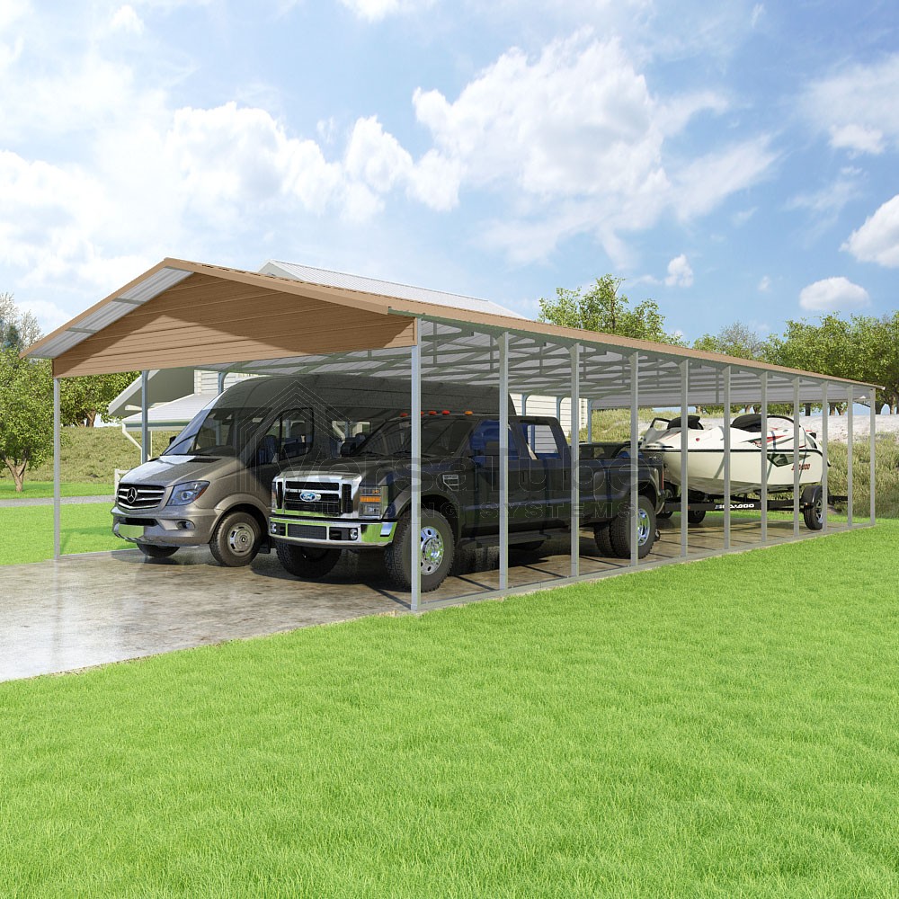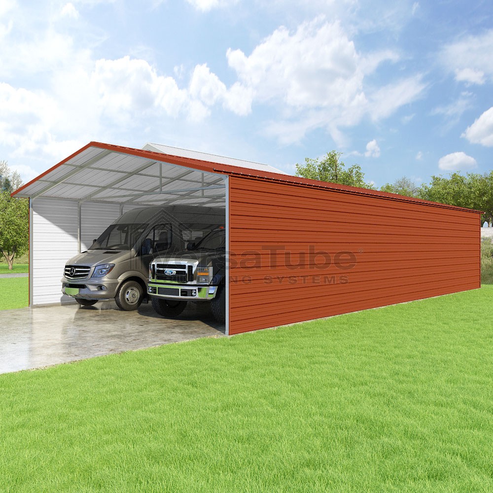 Pinnacle Series DIY carport kit features vertical sheet metal roof panels with ridge cap, gable and eave trim for an A-frame roof style and extended coverage on both ends.