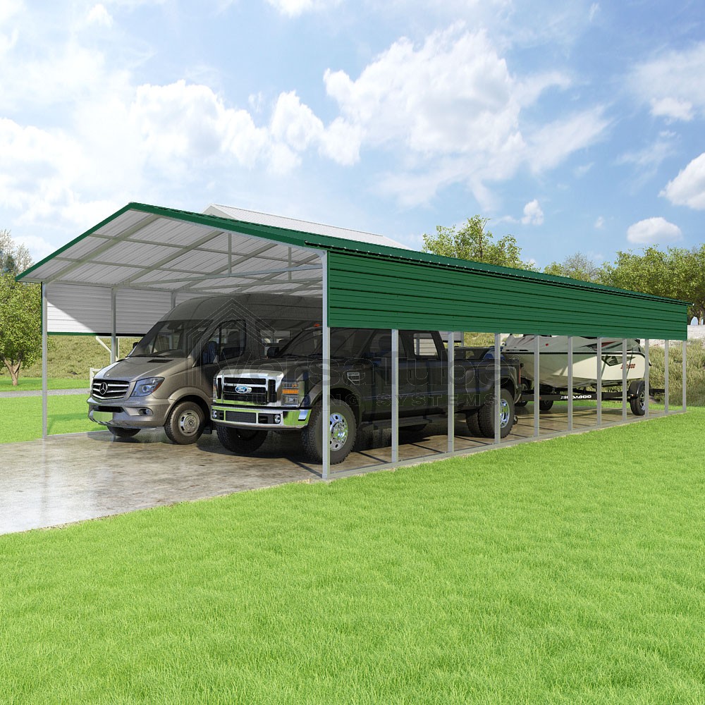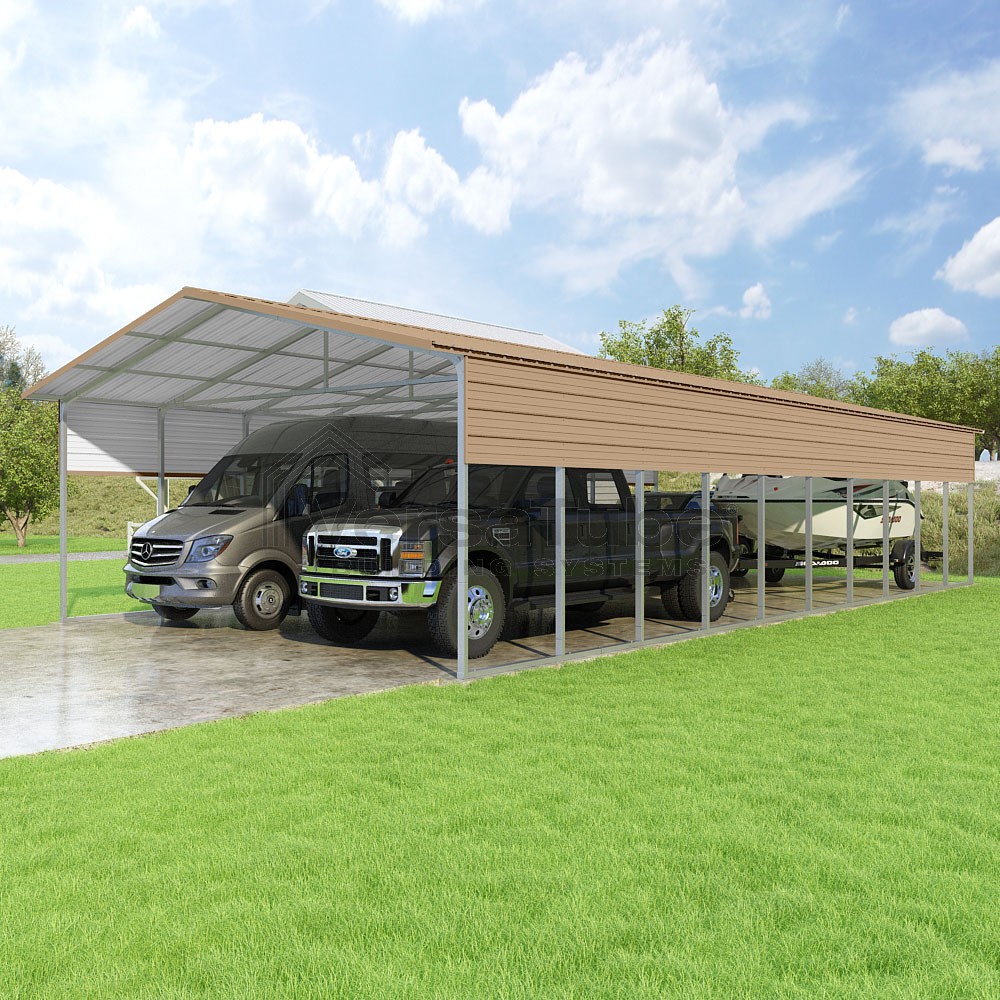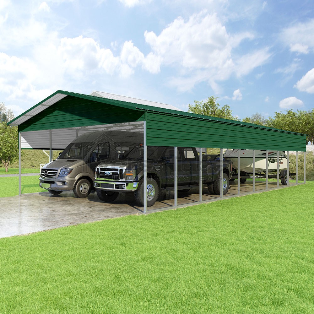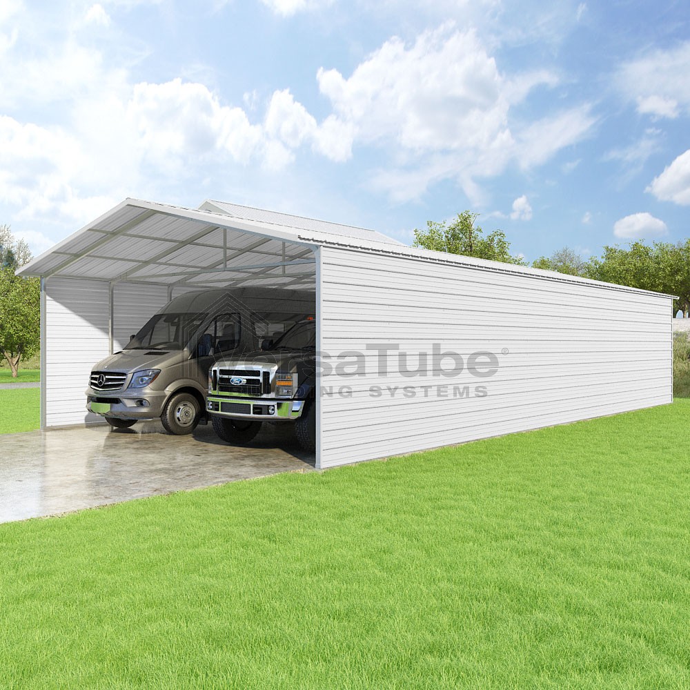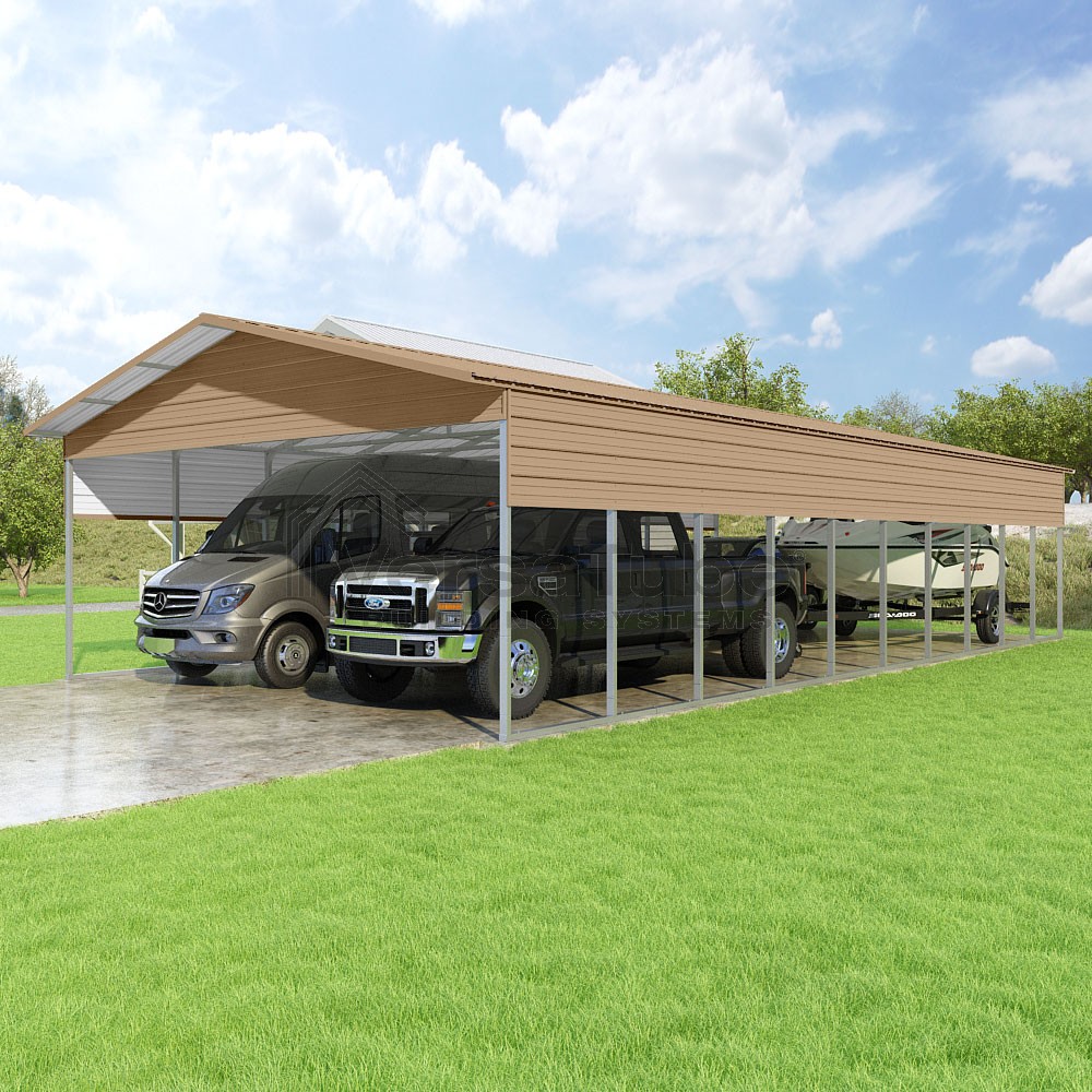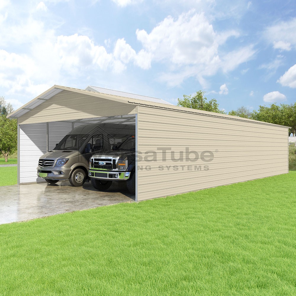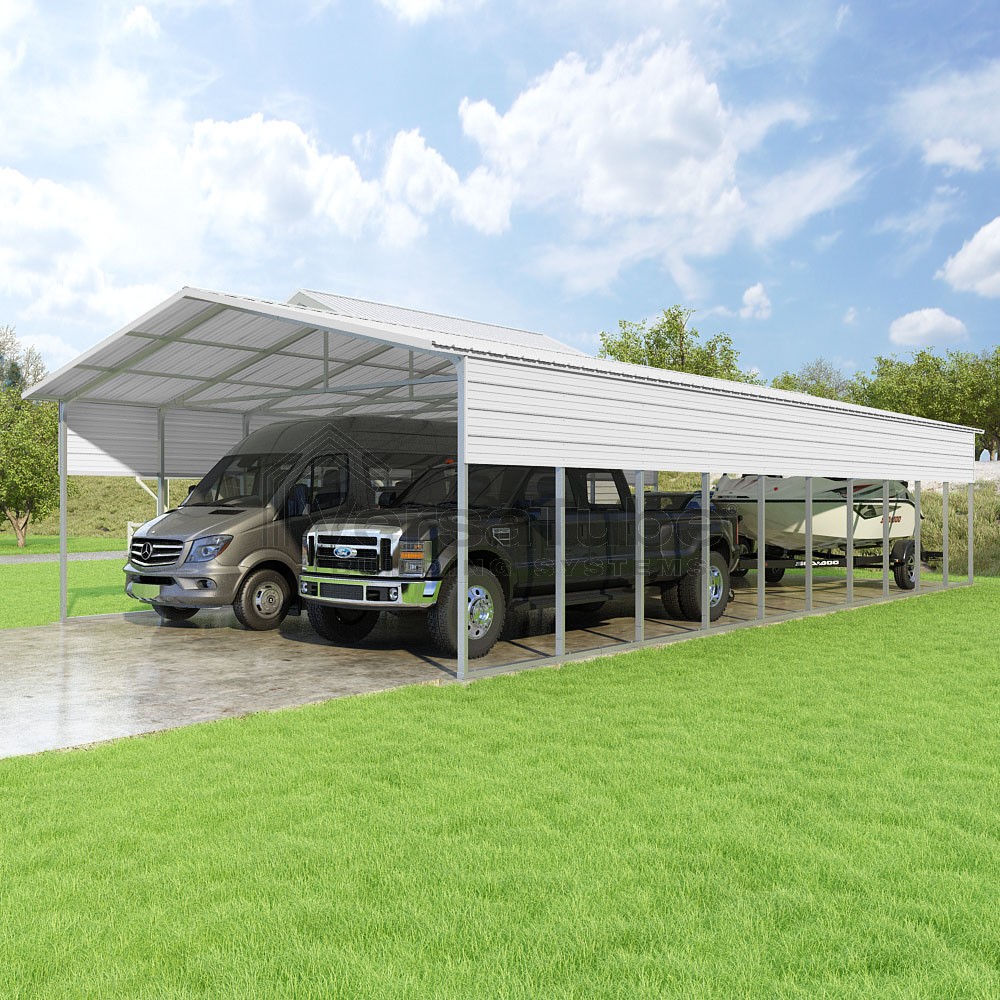 Pinnacle Series DIY carport kit features vertical sheet metal roof panels with ridge cap, gable and eave trim for an A-frame roof style and extended coverage on both ends.