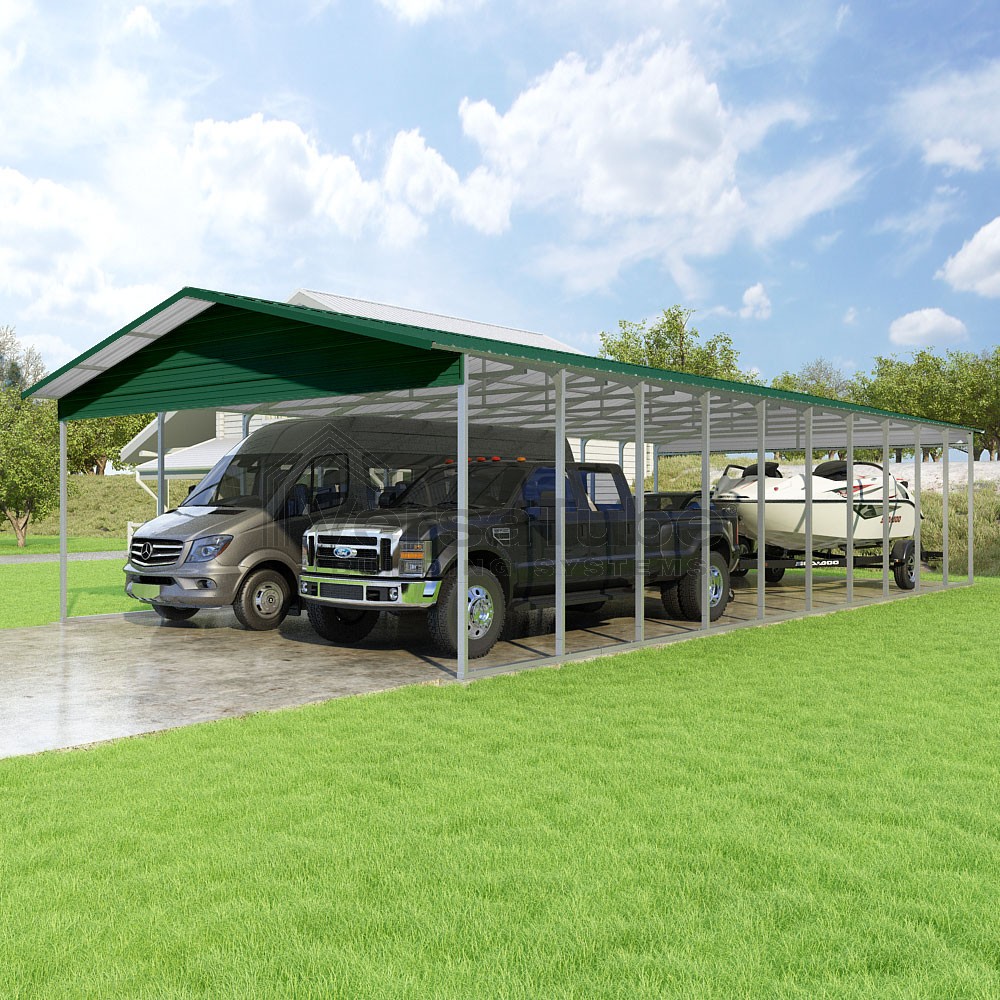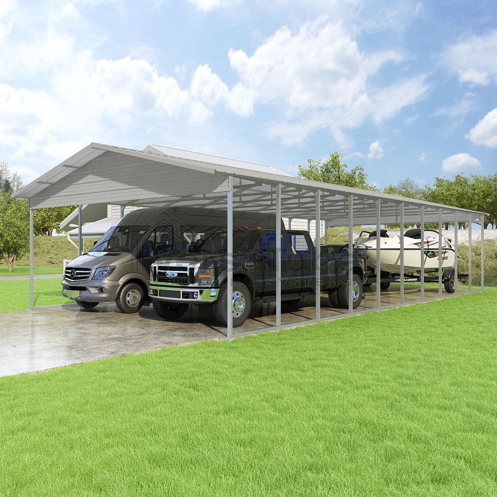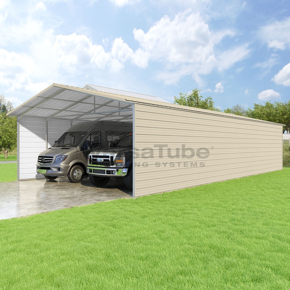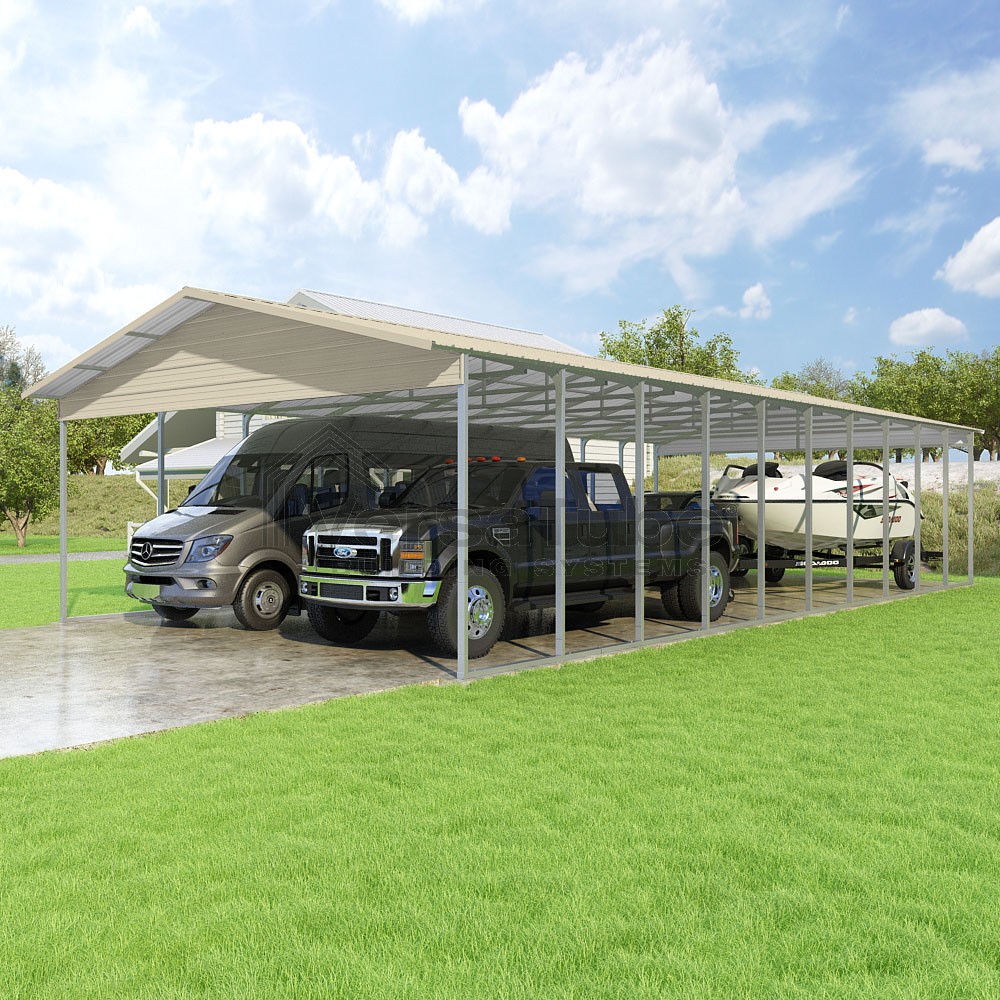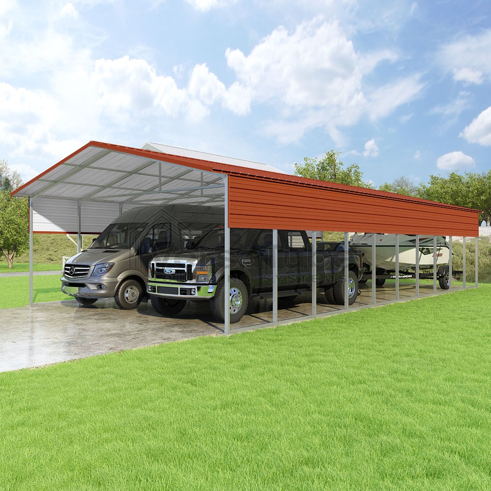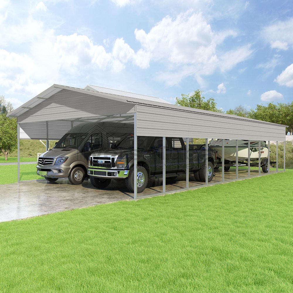 Pinnacle Series DIY carport kit features vertical sheet metal roof panels with ridge cap, gable and eave trim for an A-frame roof style and extended coverage on both ends.