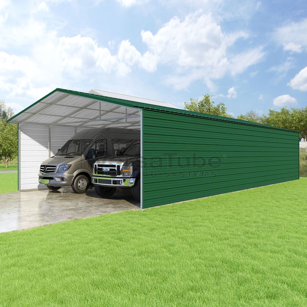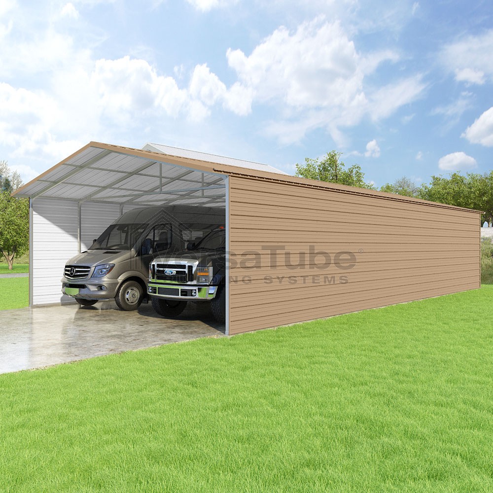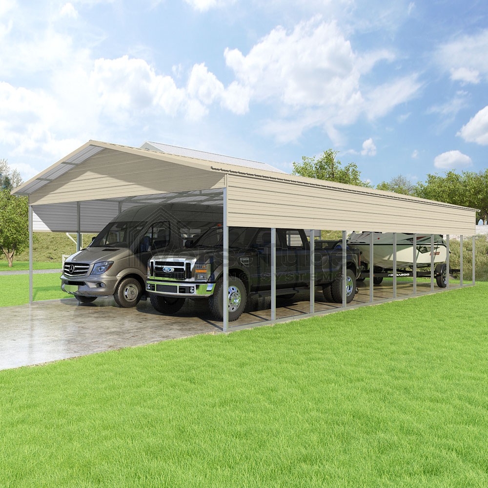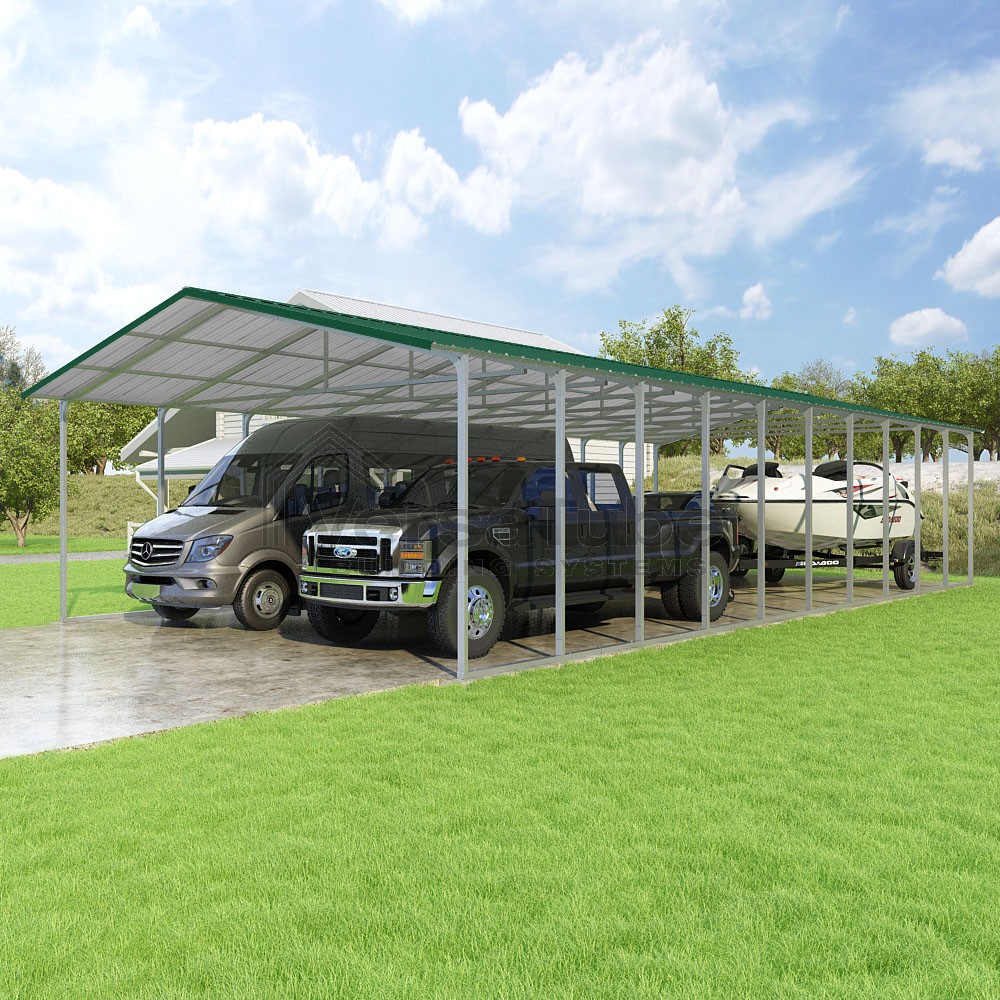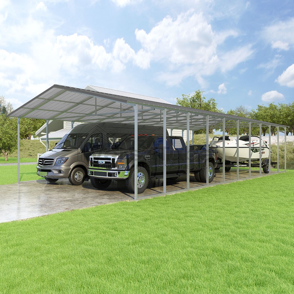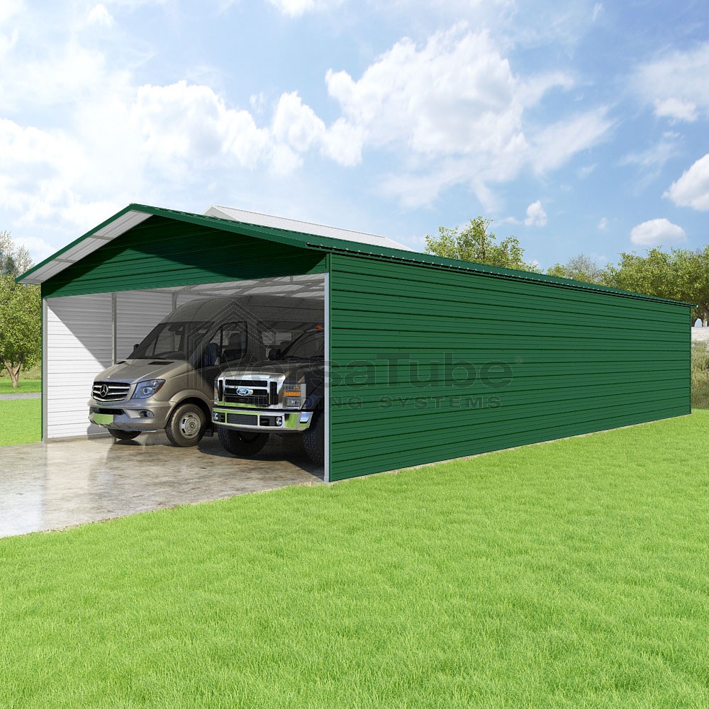 Pinnacle Series DIY carport kit features vertical sheet metal roof panels with ridge cap, gable and eave trim for an A-frame roof style and extended coverage on both ends.