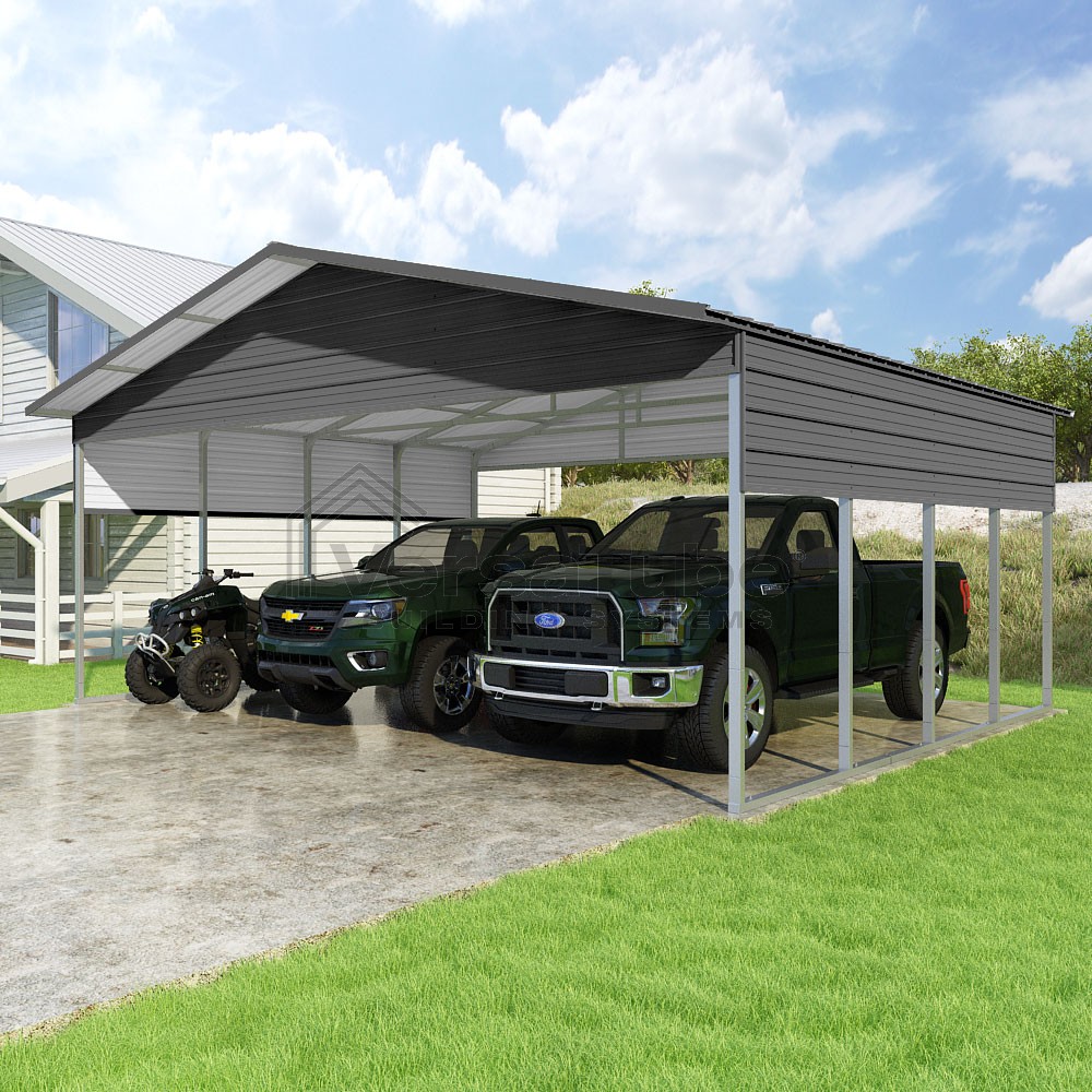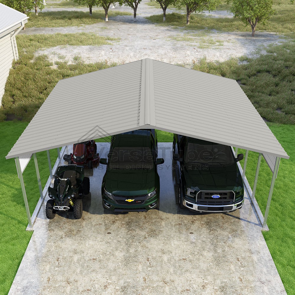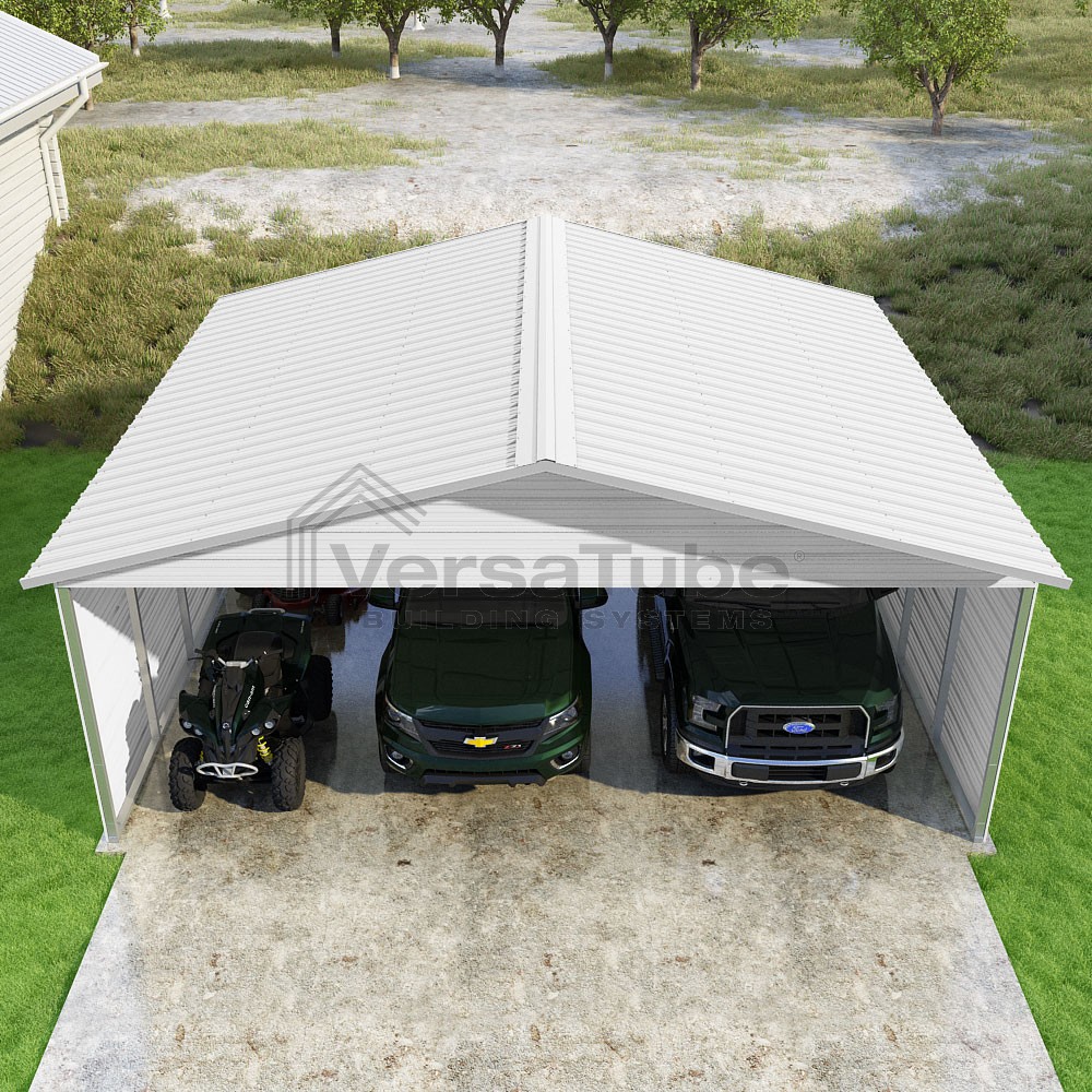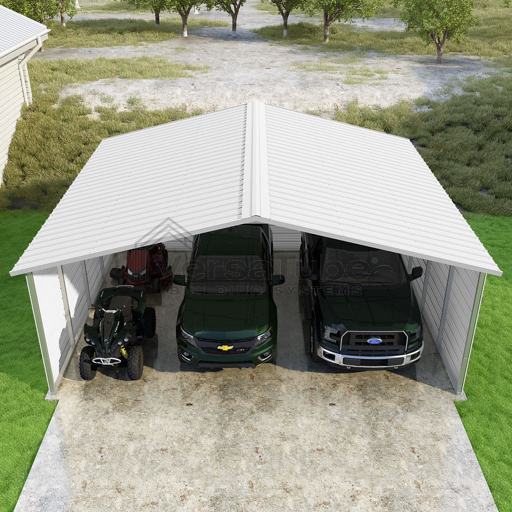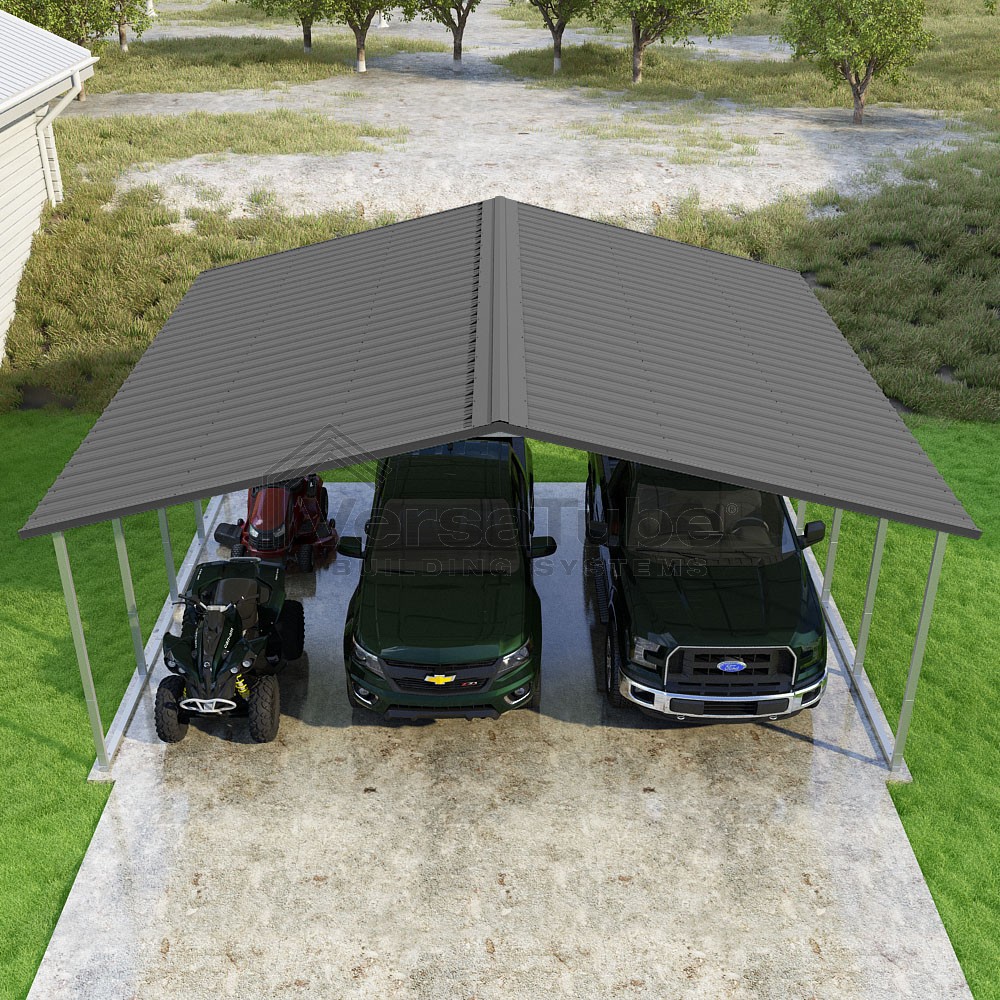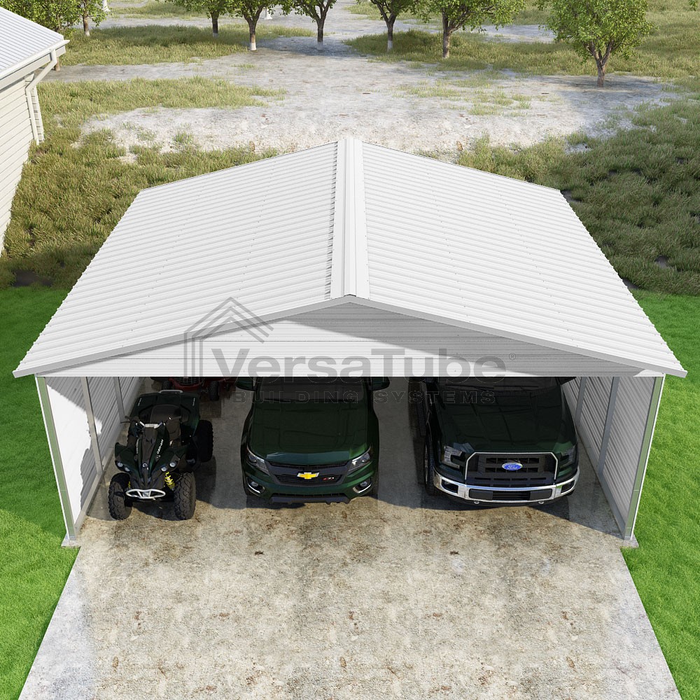 Pinnacle Series DIY carport kit features vertical sheet metal roof panels with ridge cap, gable and eave trim for an A-frame roof style and extended coverage on both ends.
