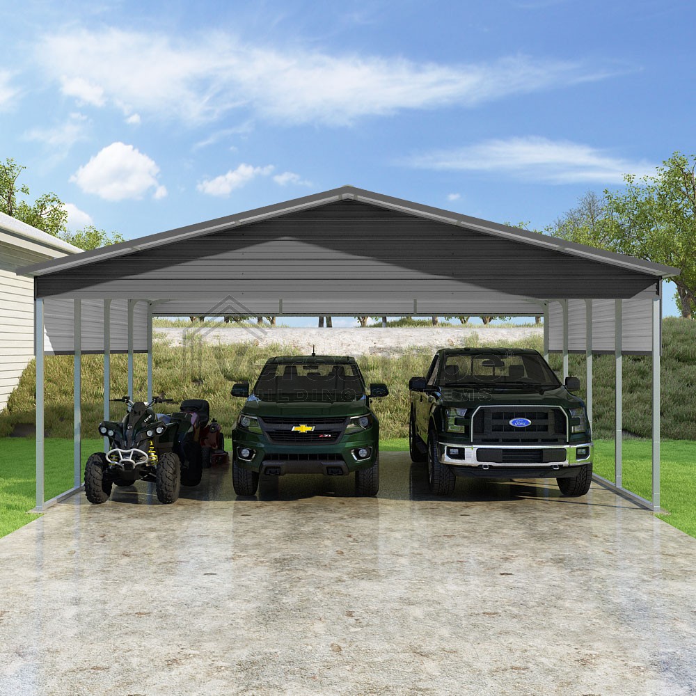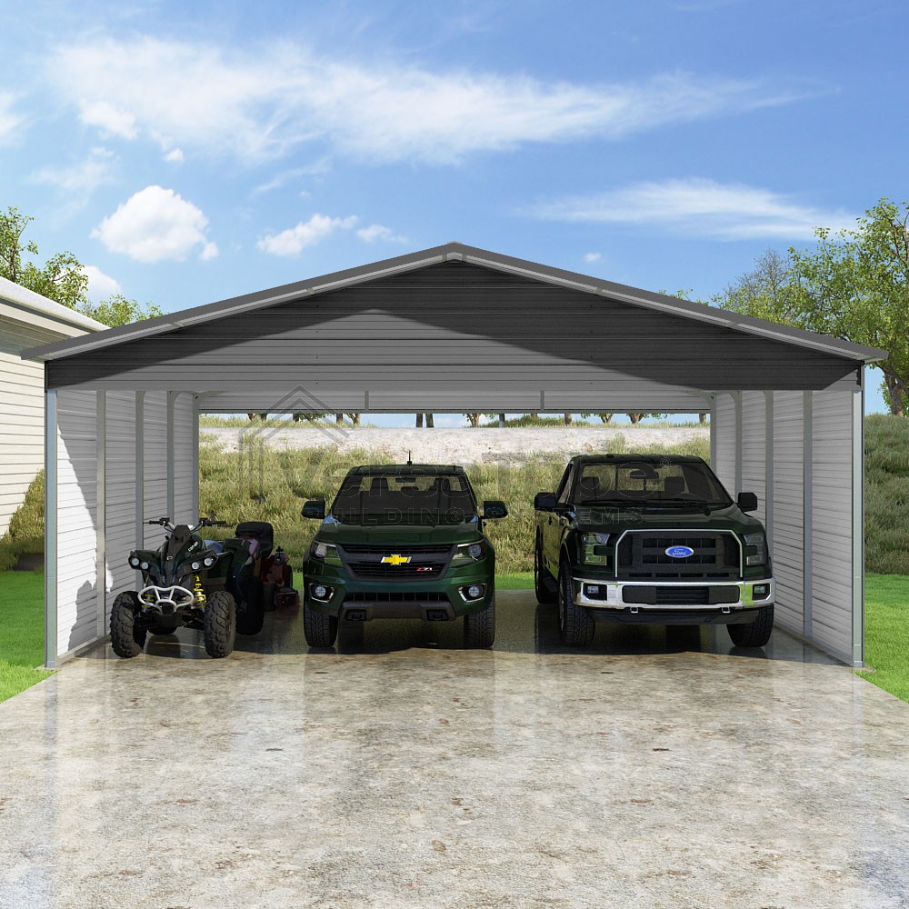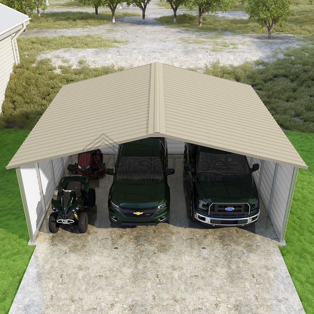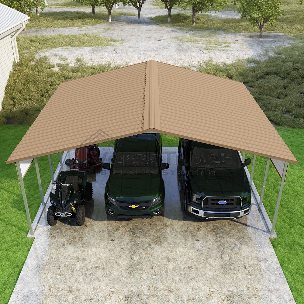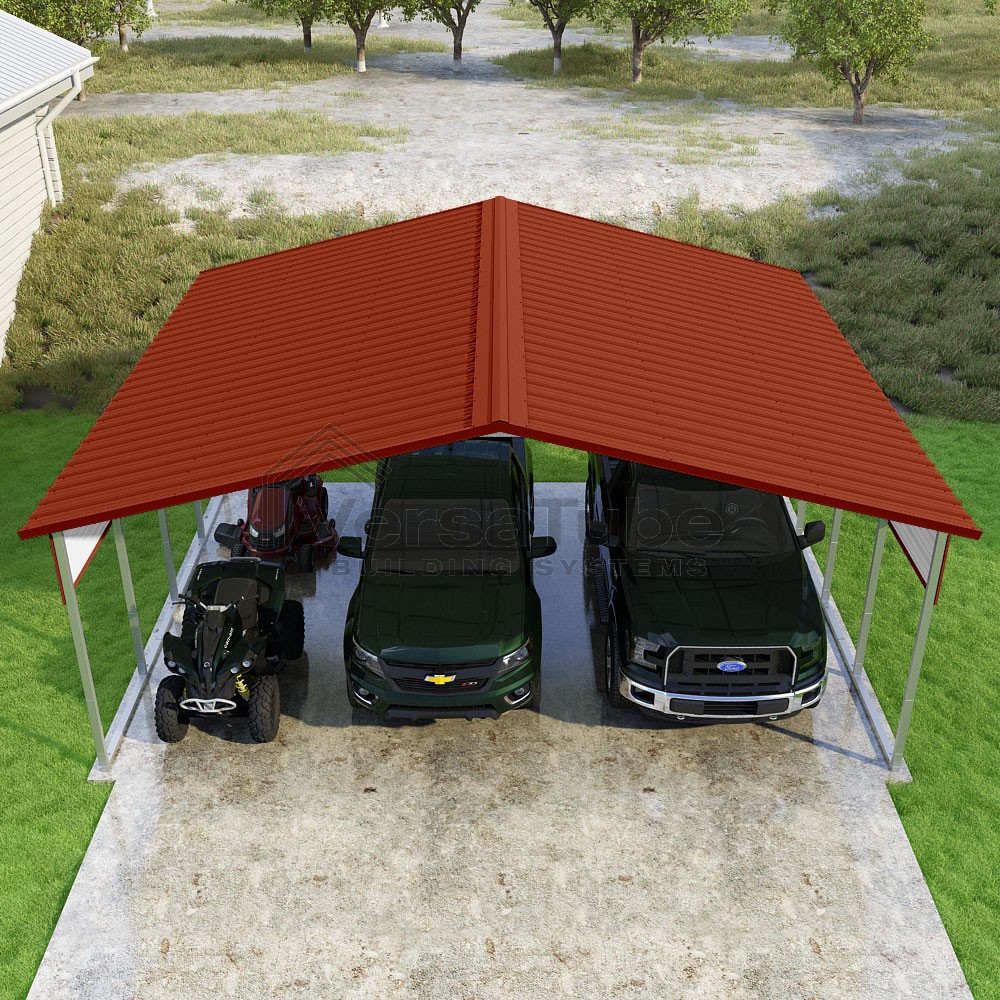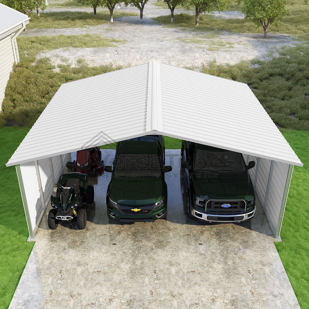 Pinnacle Series DIY carport kit features vertical sheet metal roof panels with ridge cap, gable and eave trim for an A-frame roof style and extended coverage on both ends.