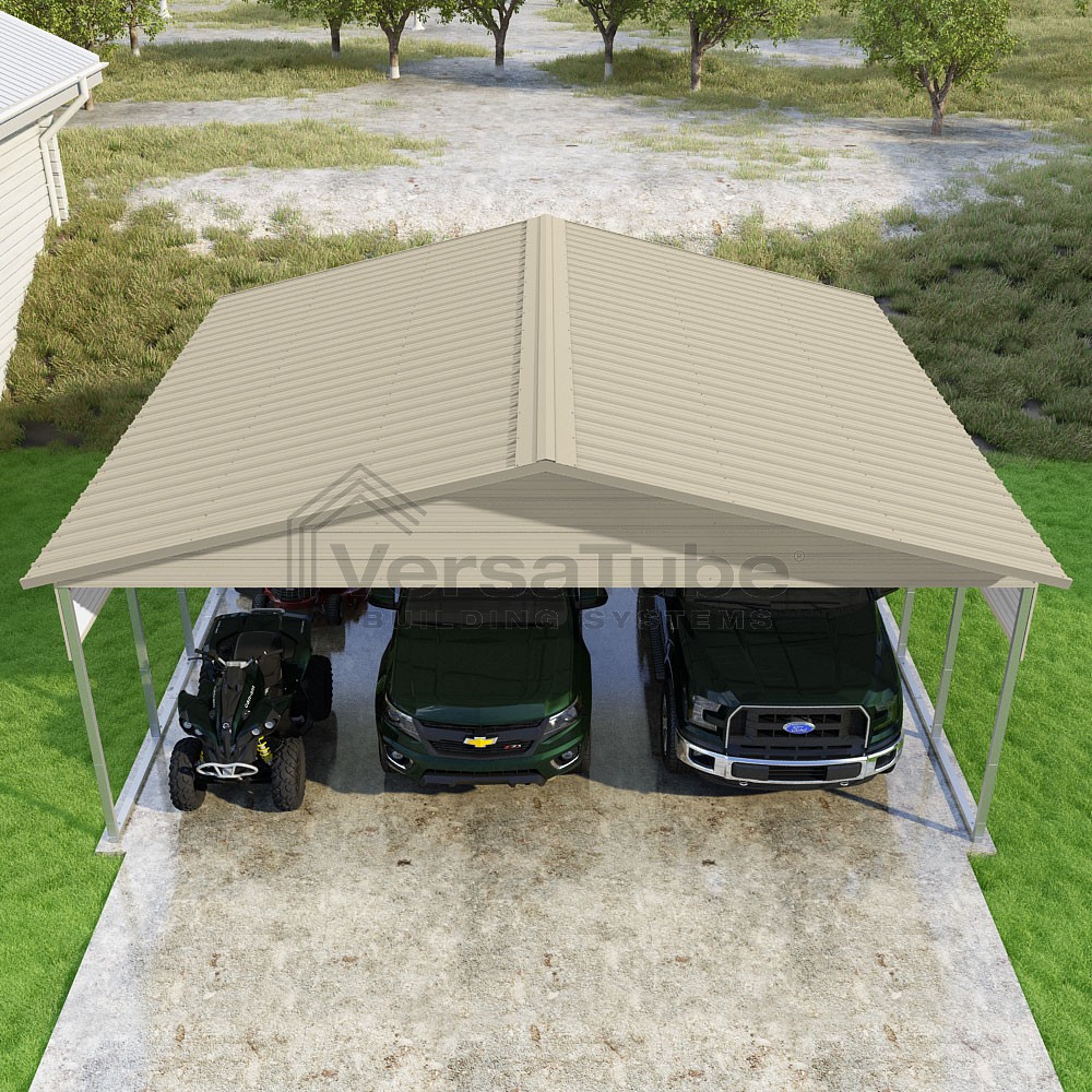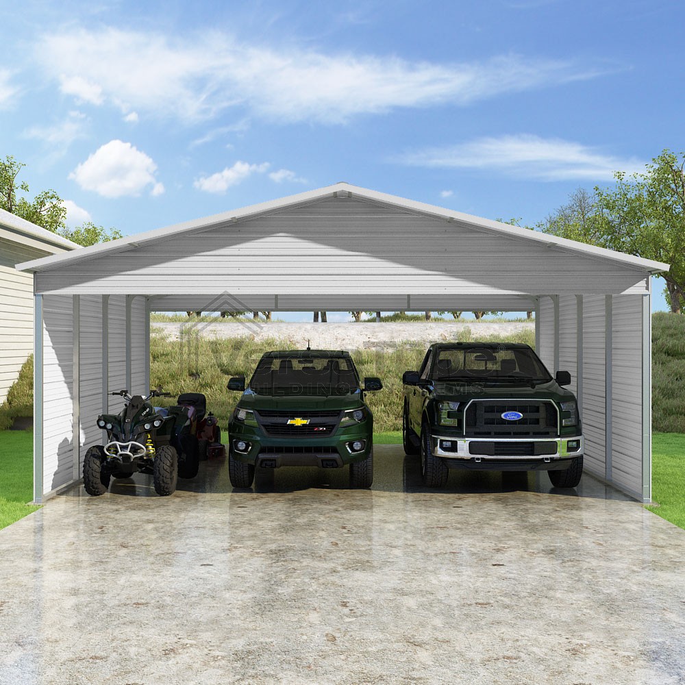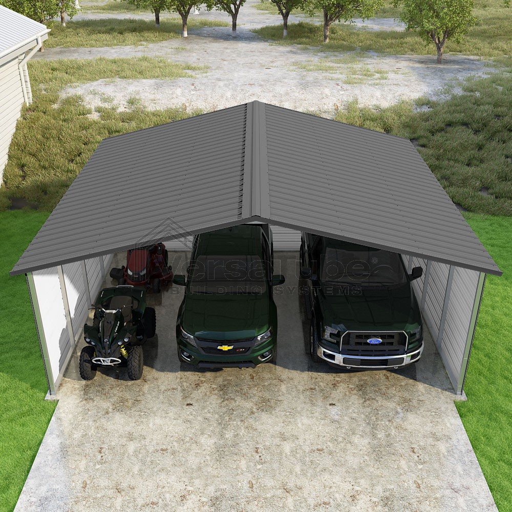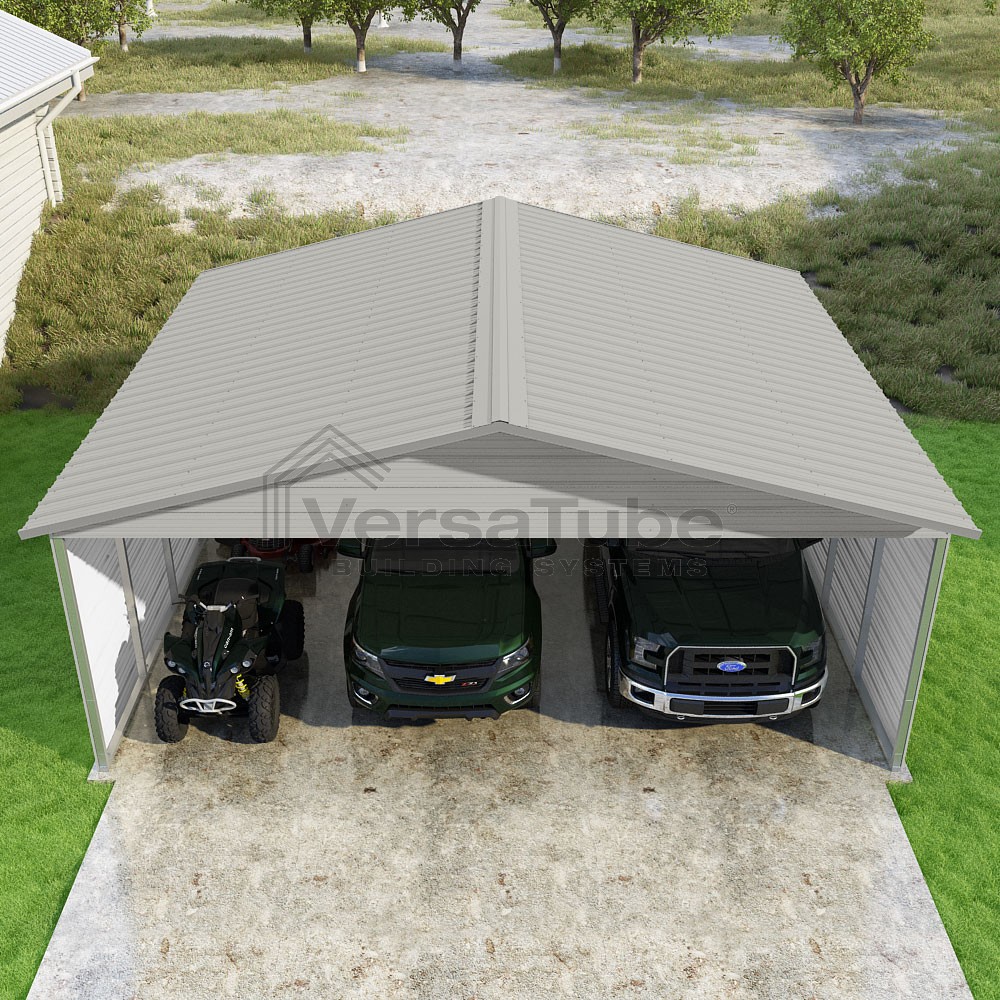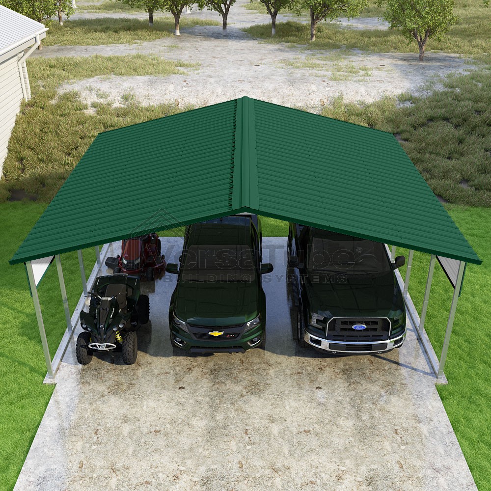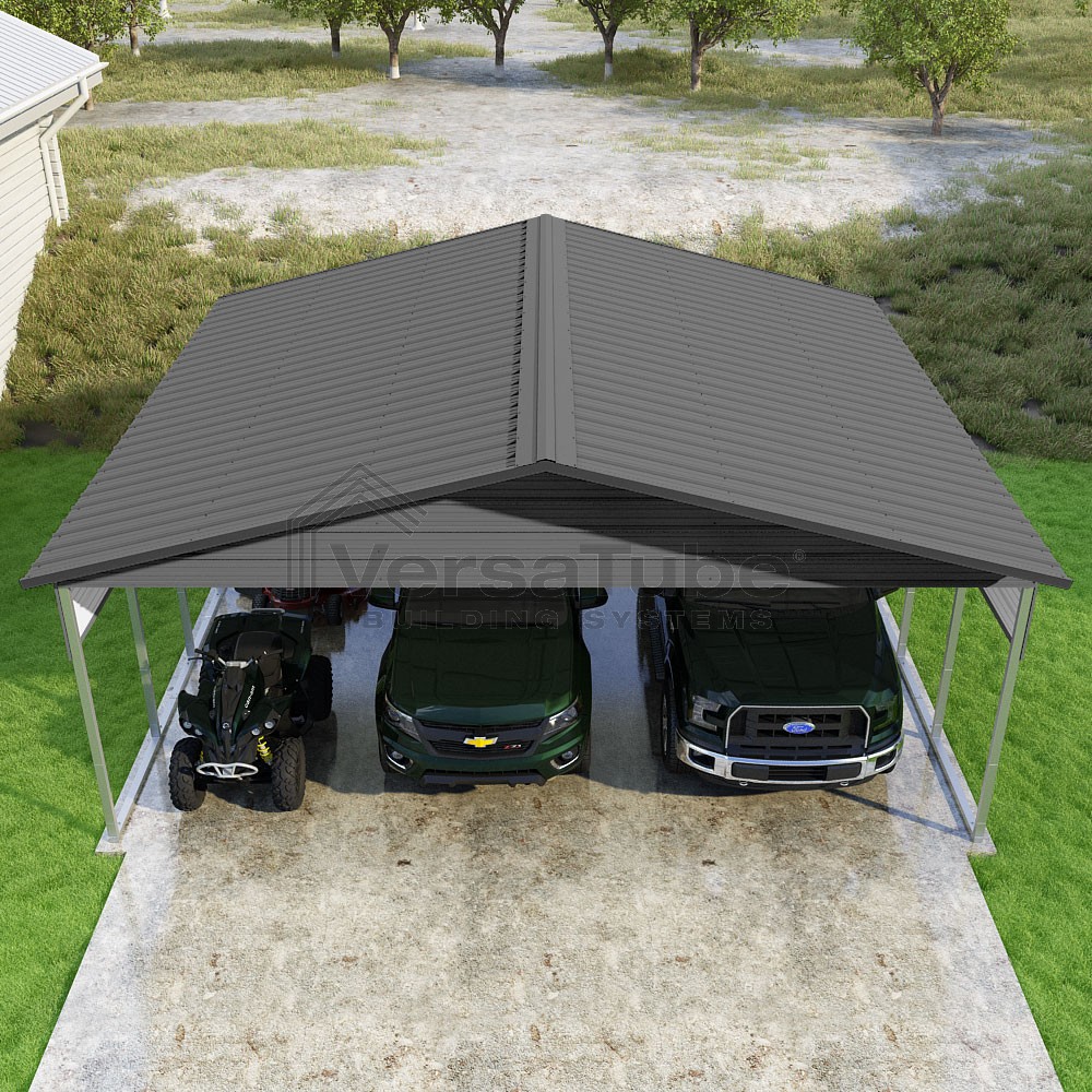 Pinnacle Series DIY carport kit features vertical sheet metal roof panels with ridge cap, gable and eave trim for an A-frame roof style and extended coverage on both ends.