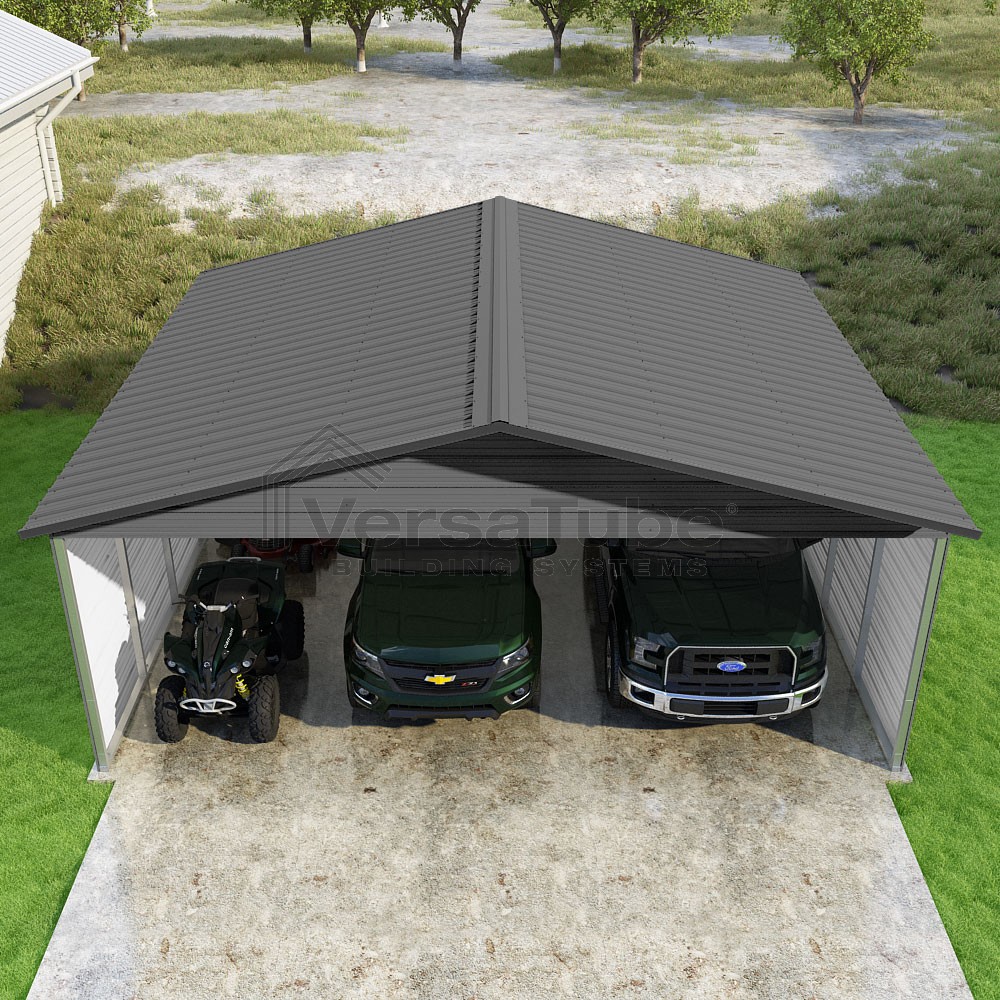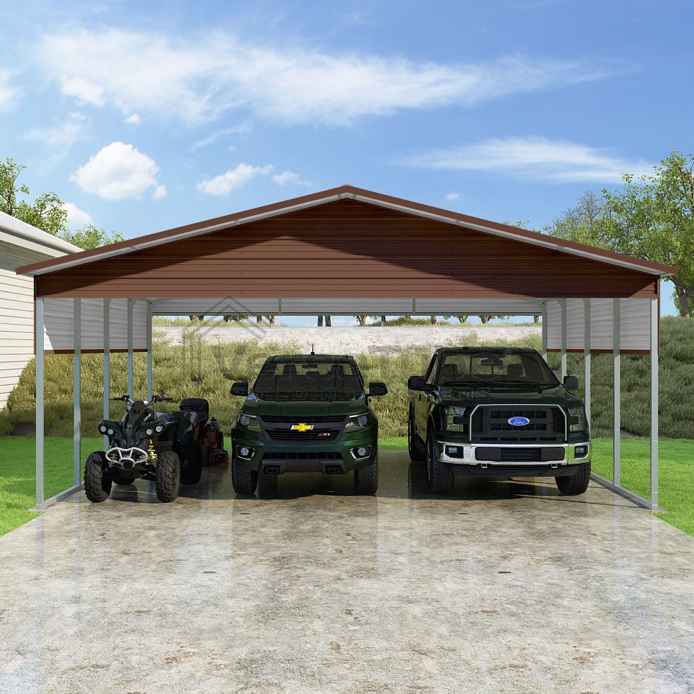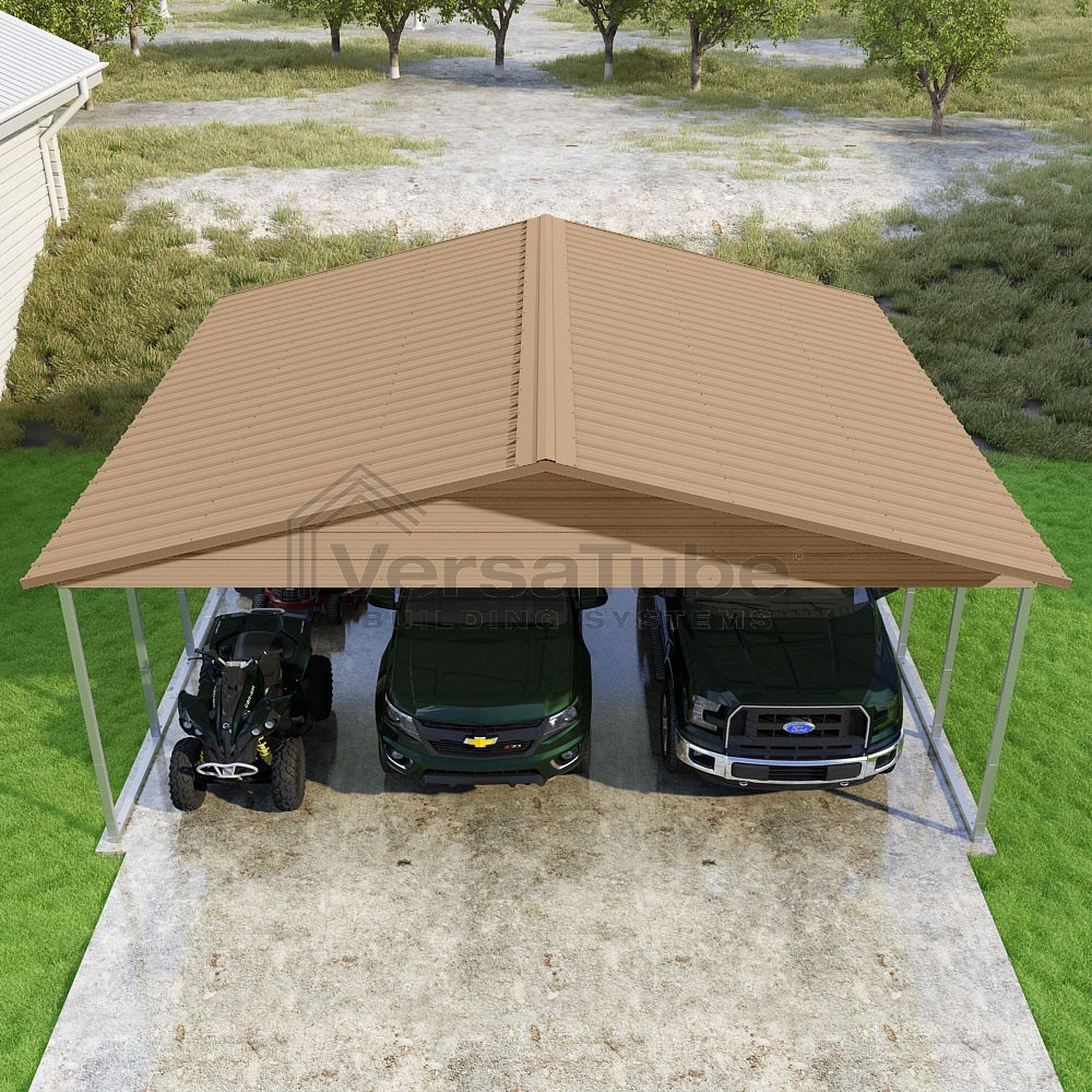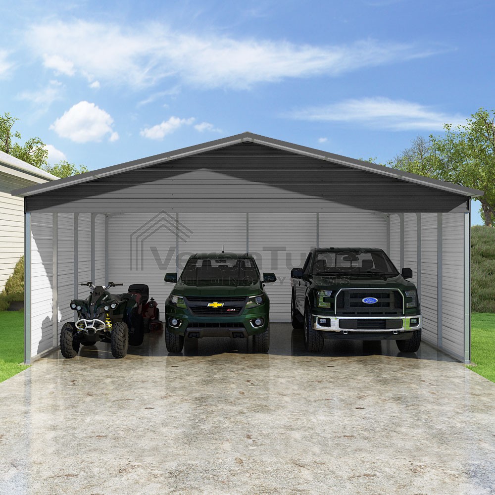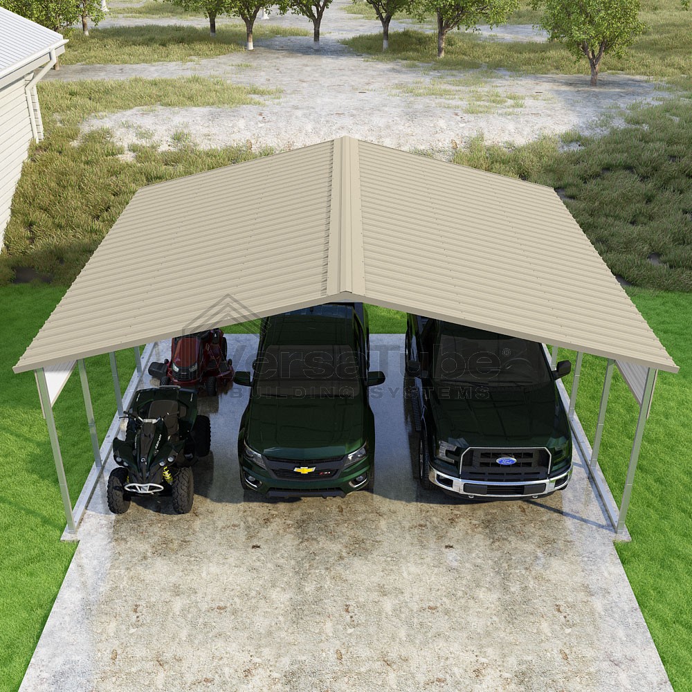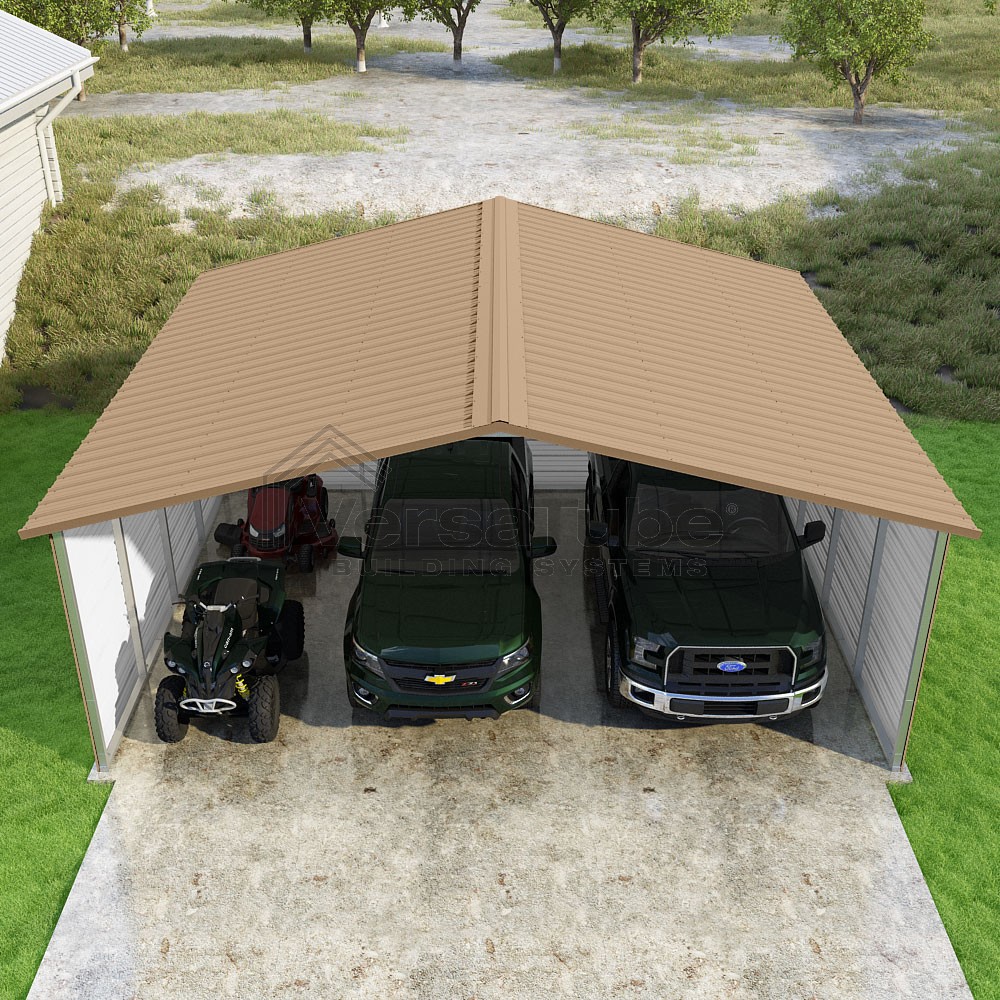 Pinnacle Series DIY carport kit features vertical sheet metal roof panels with ridge cap, gable and eave trim for an A-frame roof style and extended coverage on both ends.