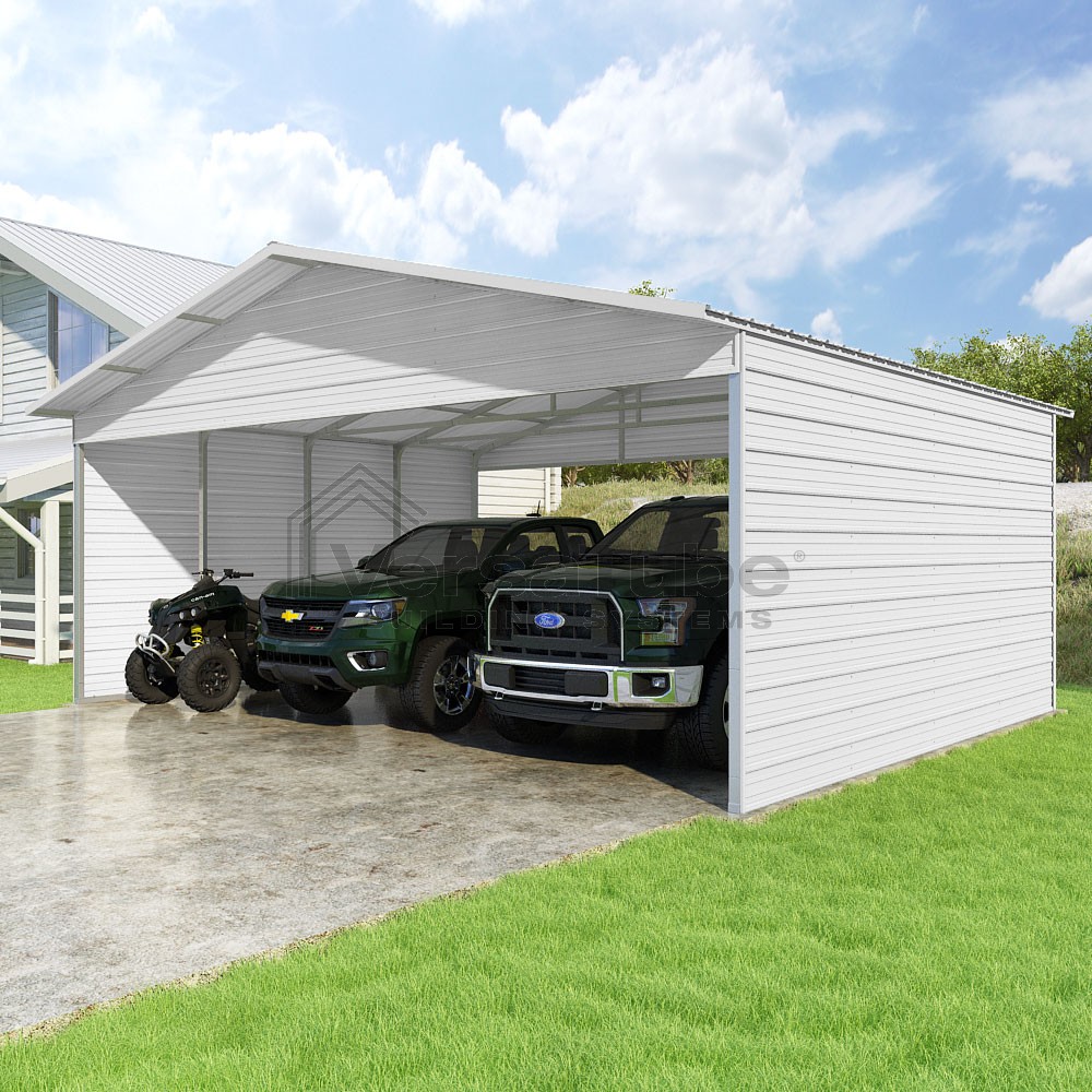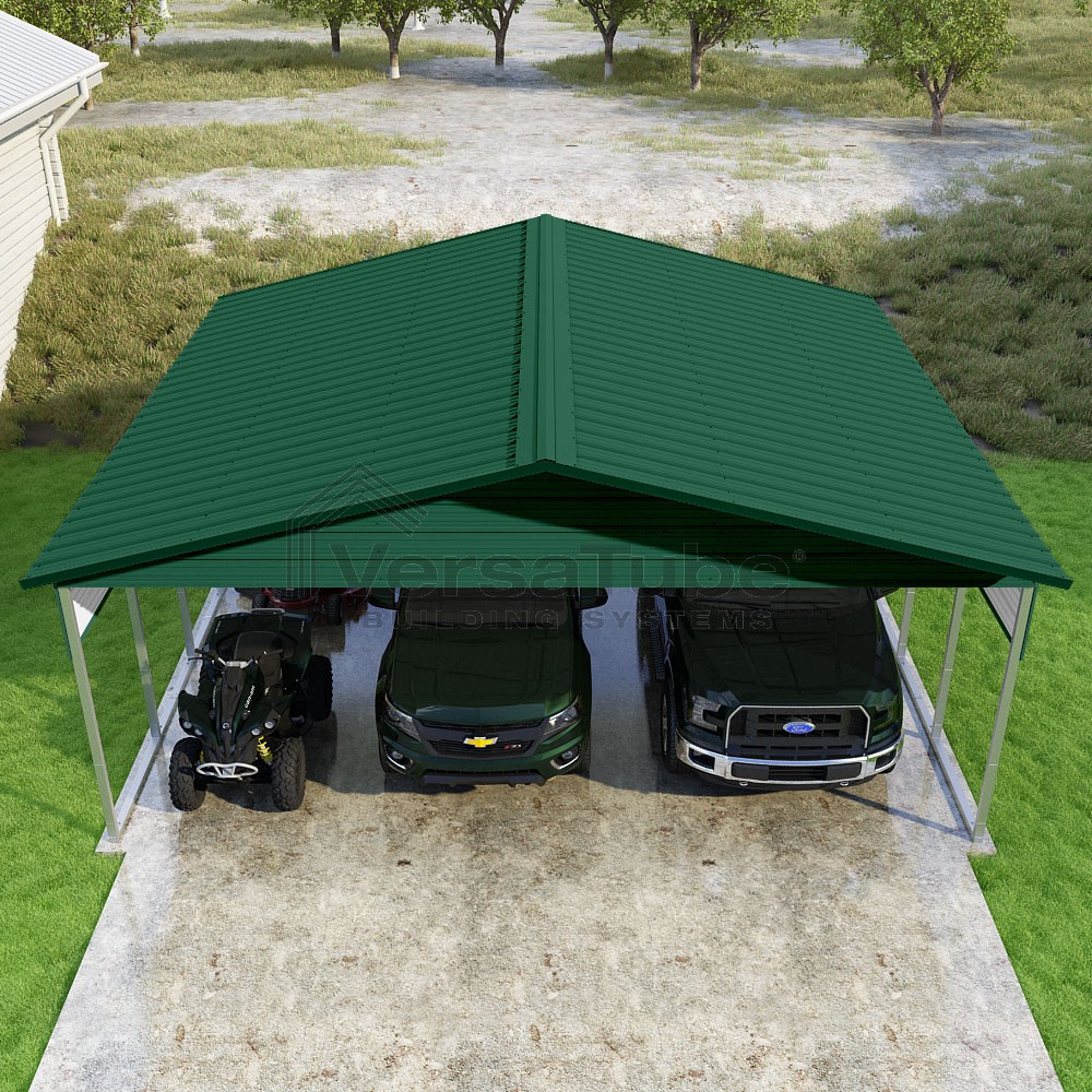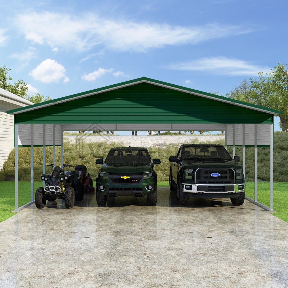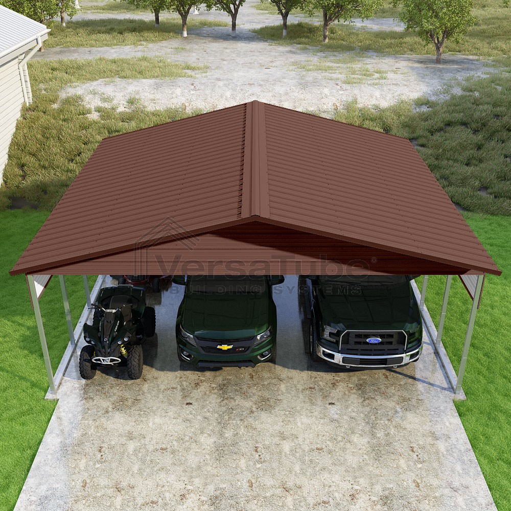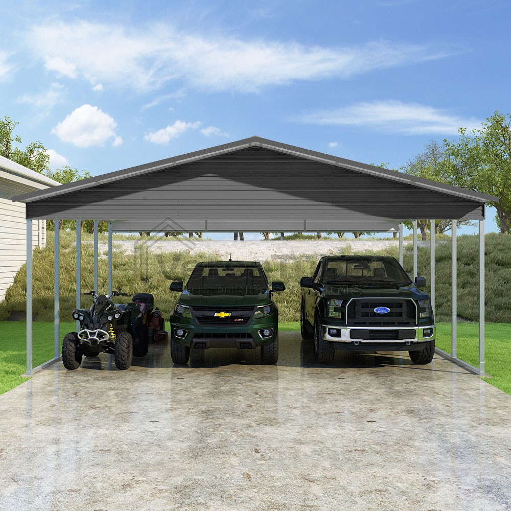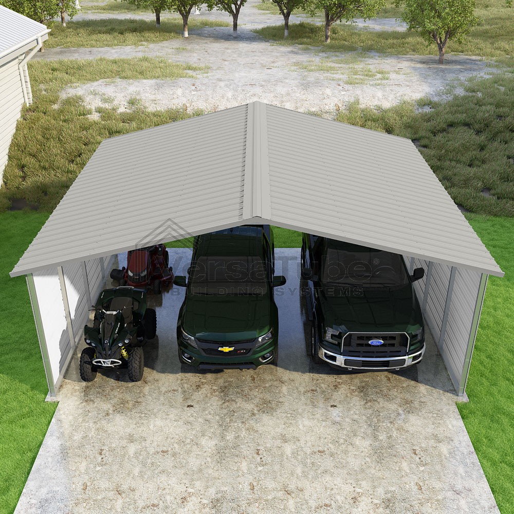 Pinnacle Series DIY carport kit features vertical sheet metal roof panels with ridge cap, gable and eave trim for an A-frame roof style and extended coverage on both ends.