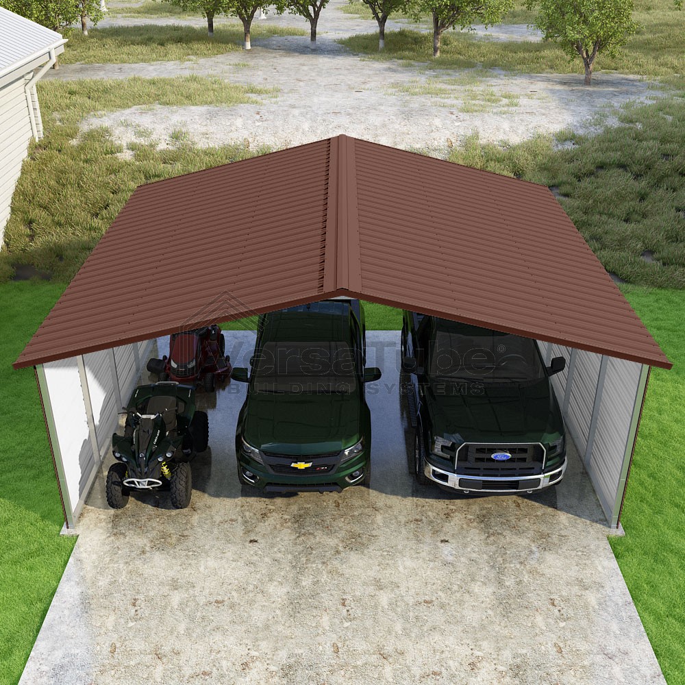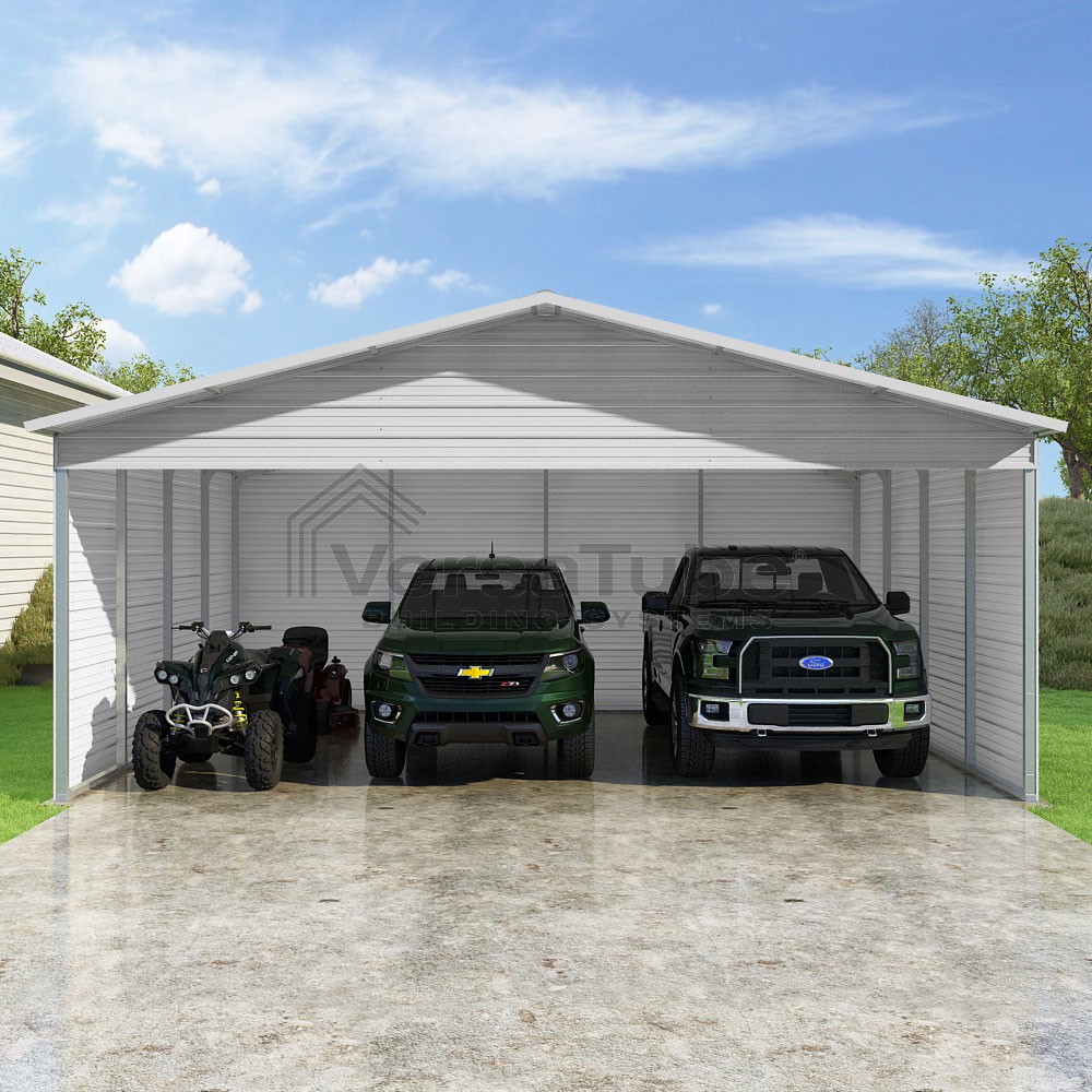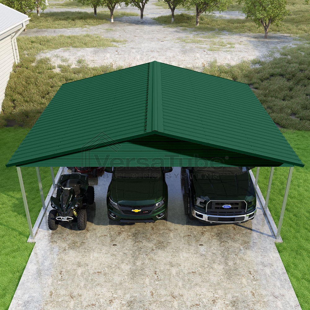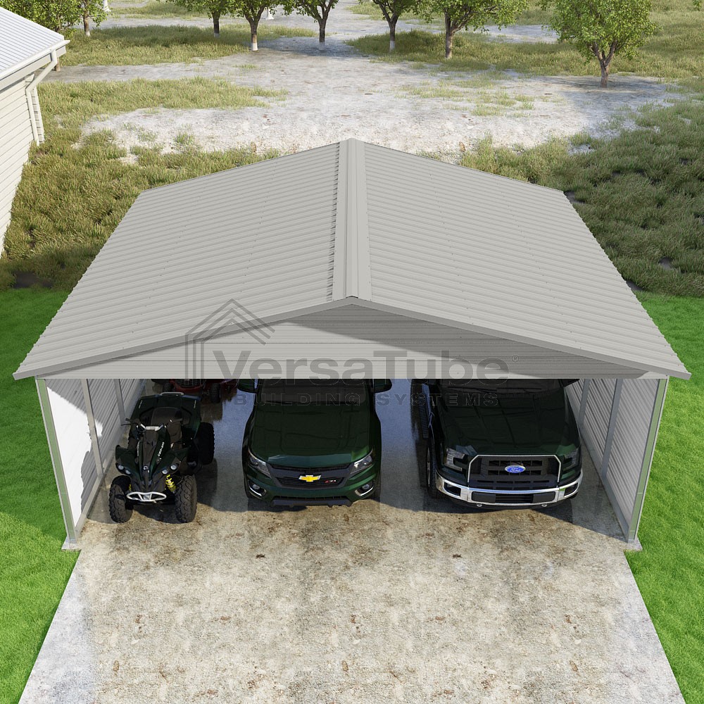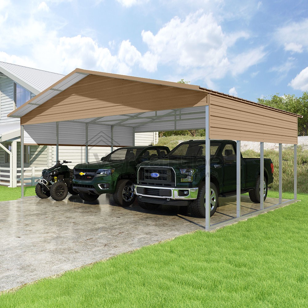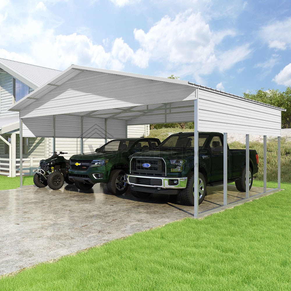 Pinnacle Series DIY carport kit features vertical sheet metal roof panels with ridge cap, gable and eave trim for an A-frame roof style and extended coverage on both ends.