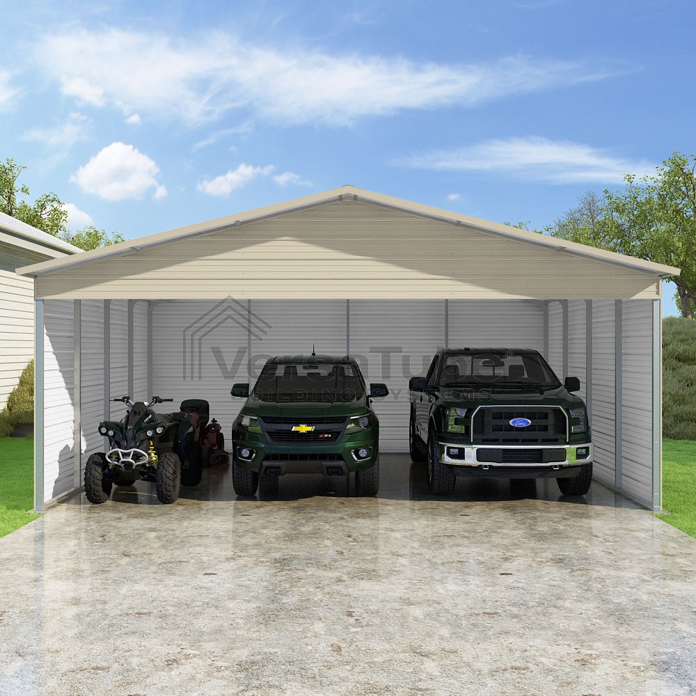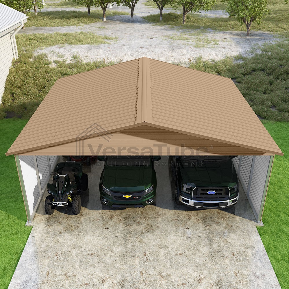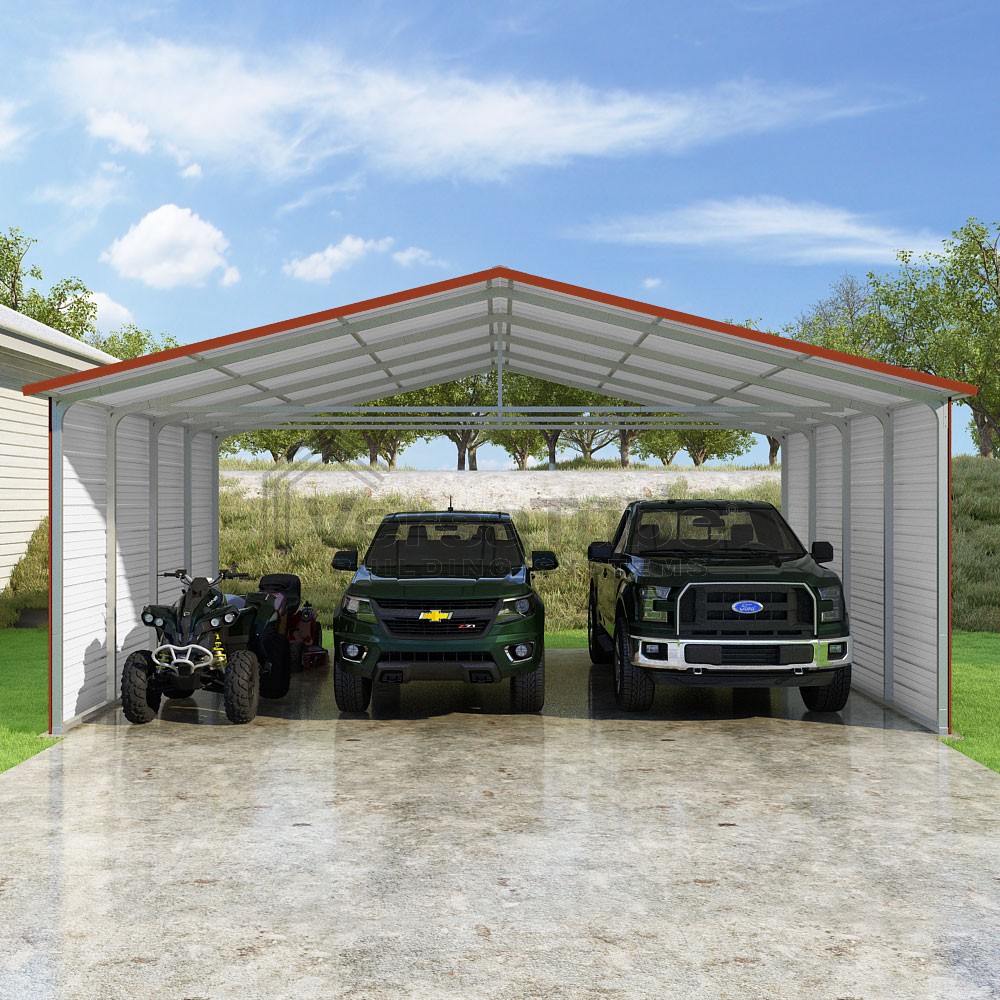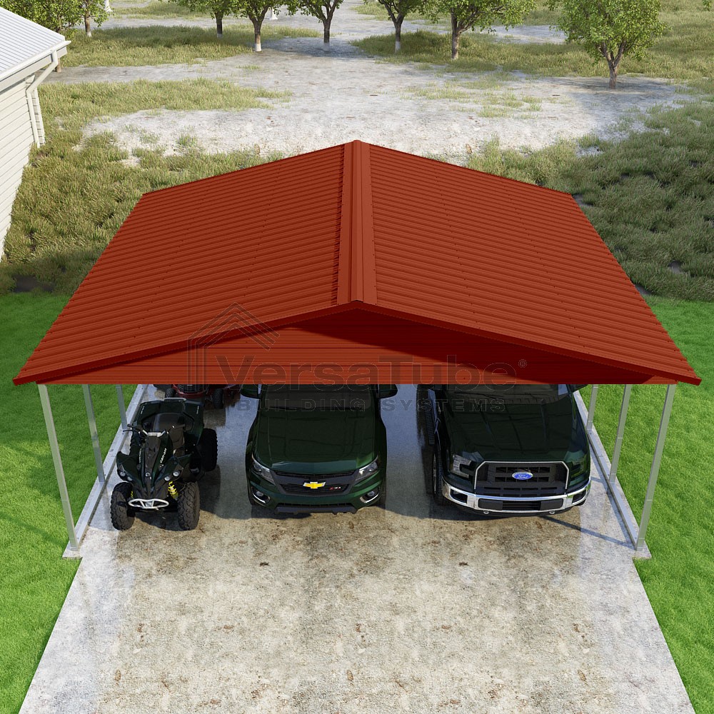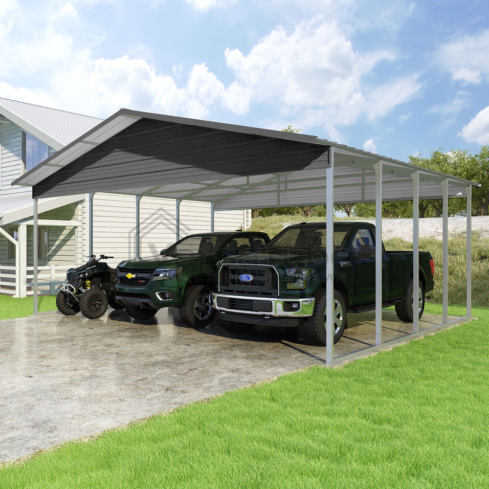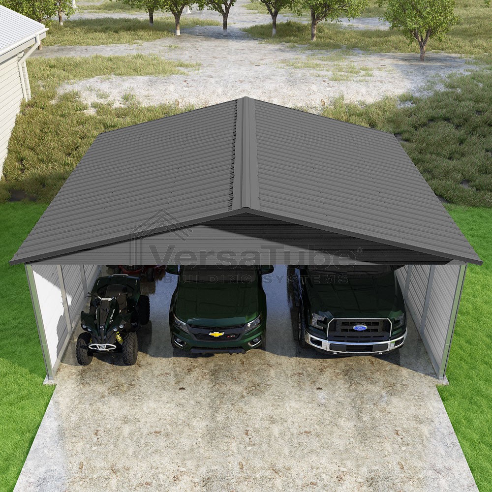 Pinnacle Series DIY carport kit features vertical sheet metal roof panels with ridge cap, gable and eave trim for an A-frame roof style and extended coverage on both ends.