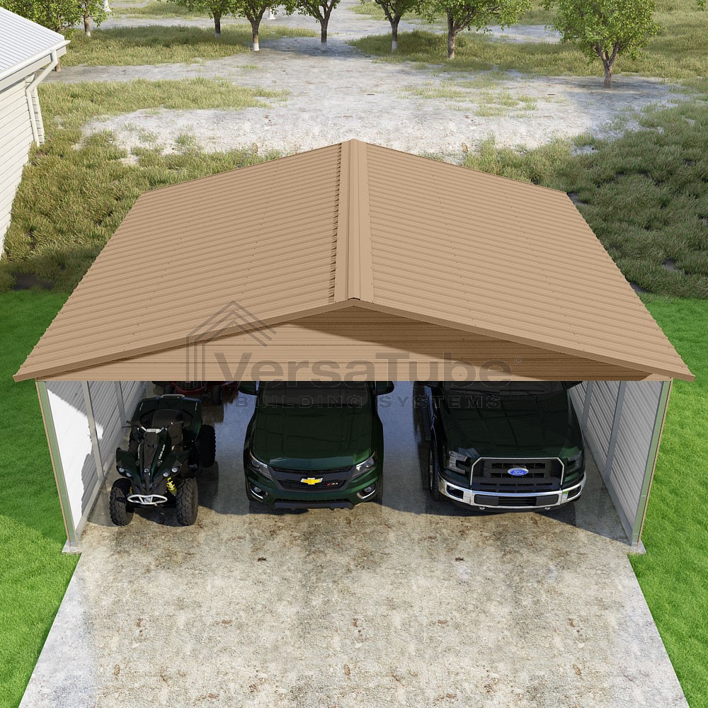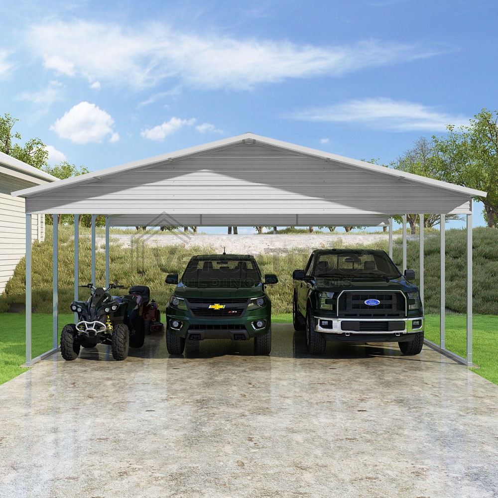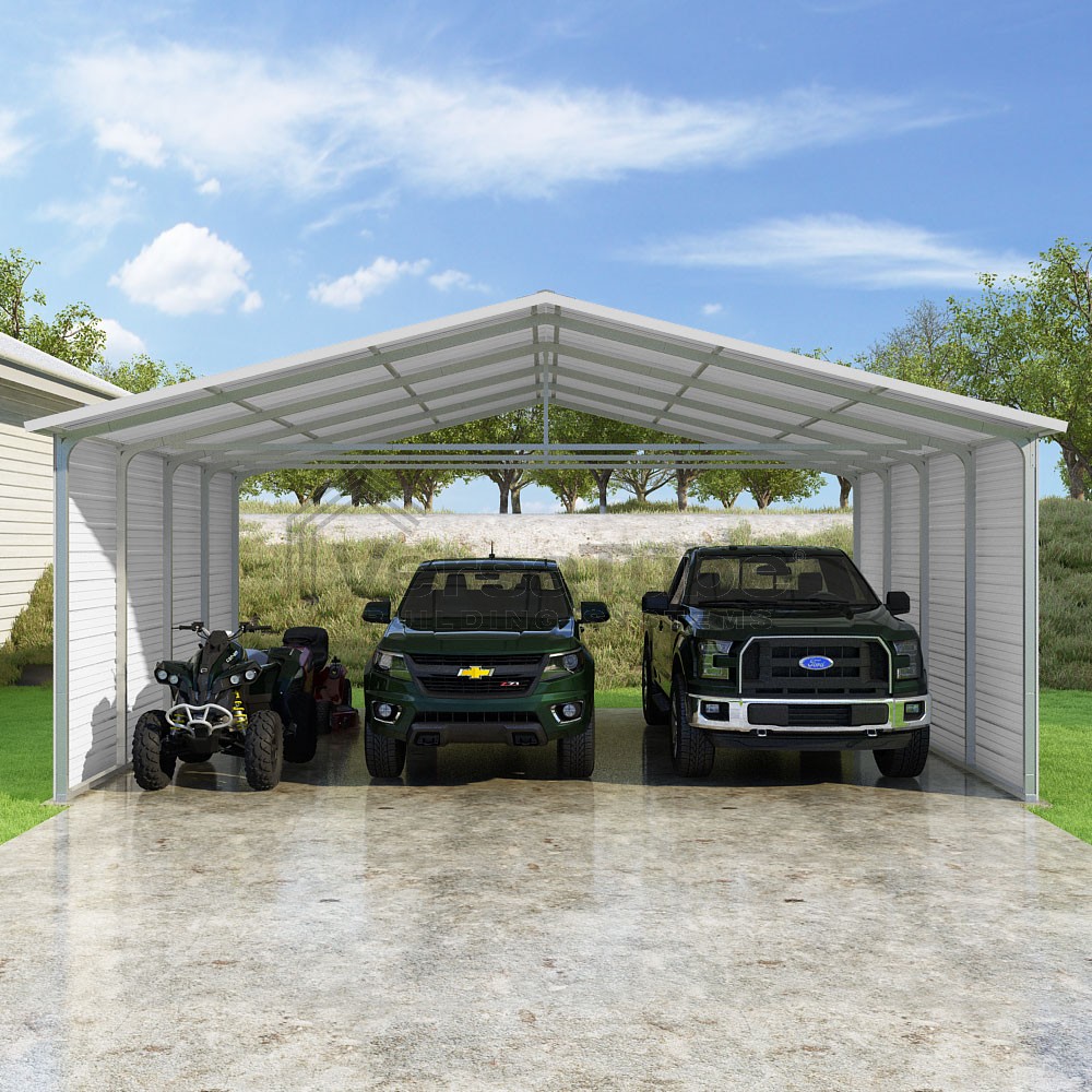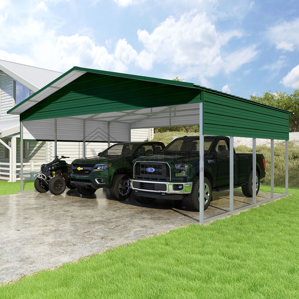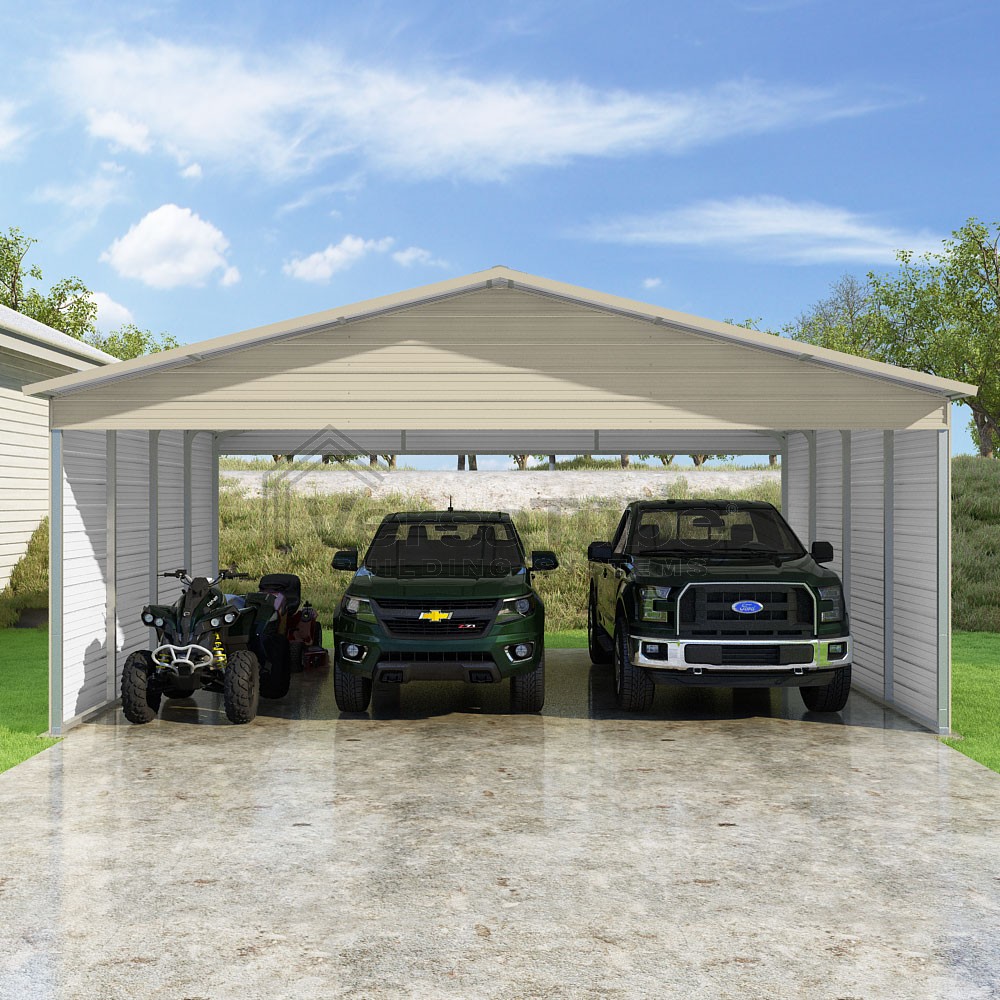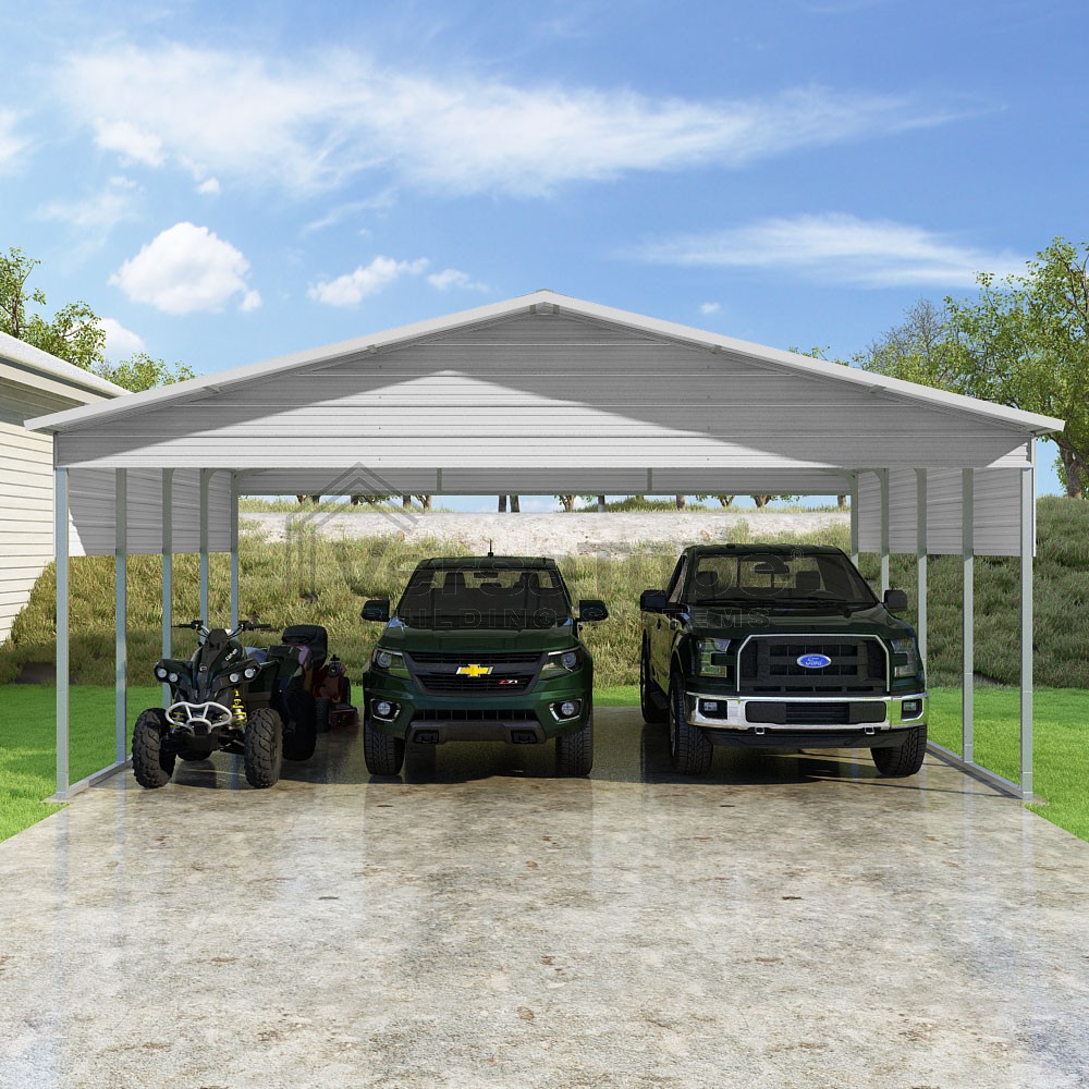 Pinnacle Series DIY carport kit features vertical sheet metal roof panels with ridge cap, gable and eave trim for an A-frame roof style and extended coverage on both ends.