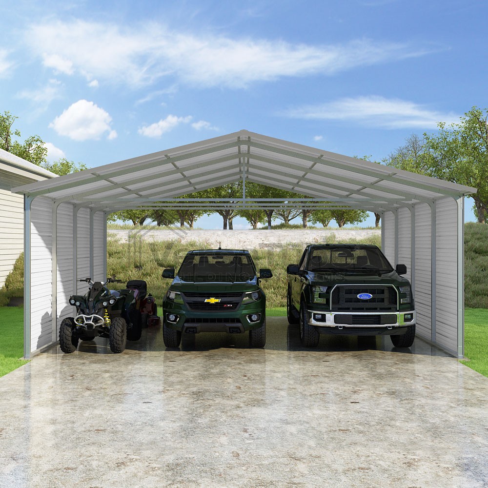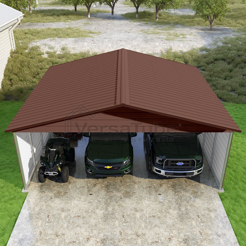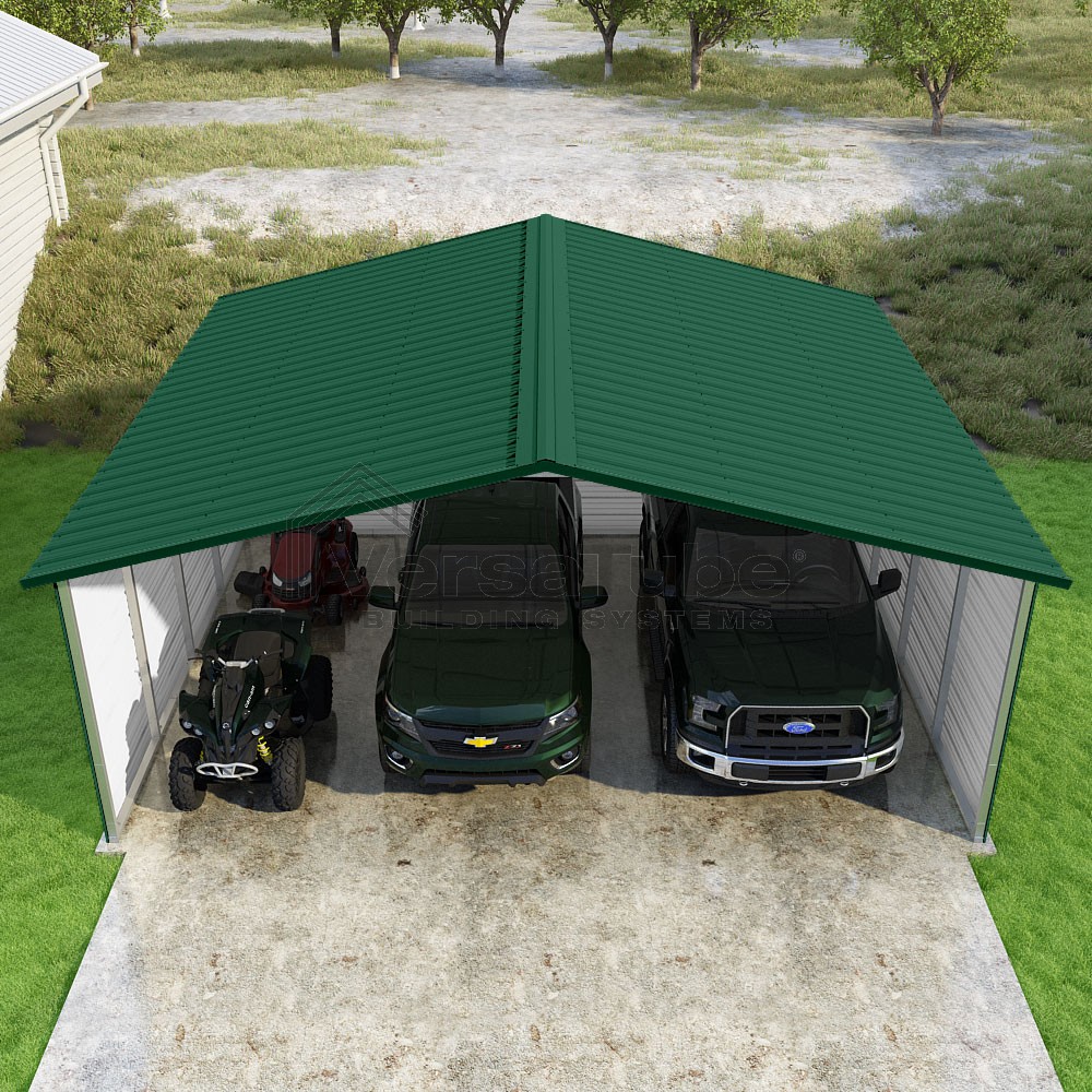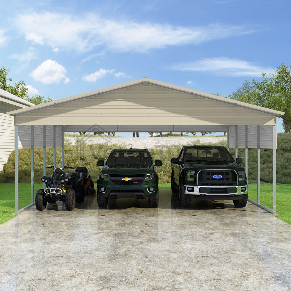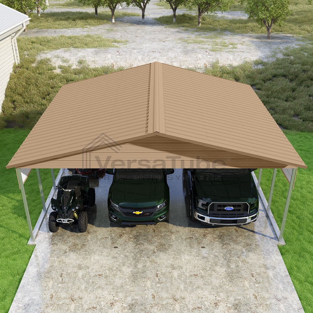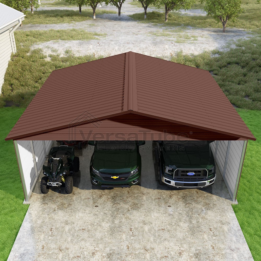 Pinnacle Series DIY carport kit features vertical sheet metal roof panels with ridge cap, gable and eave trim for an A-frame roof style and extended coverage on both ends.