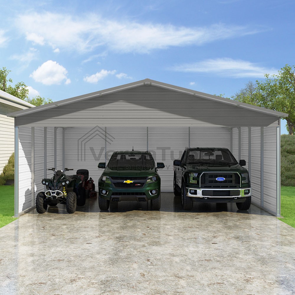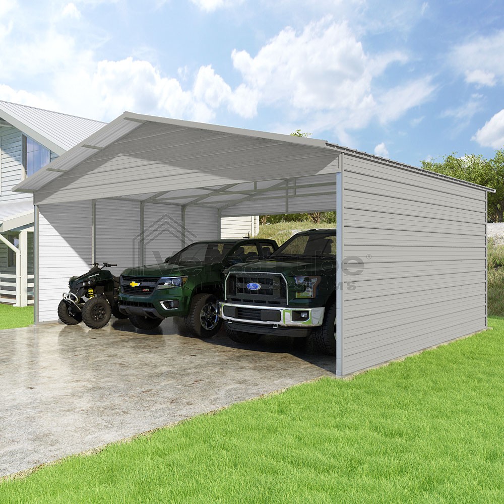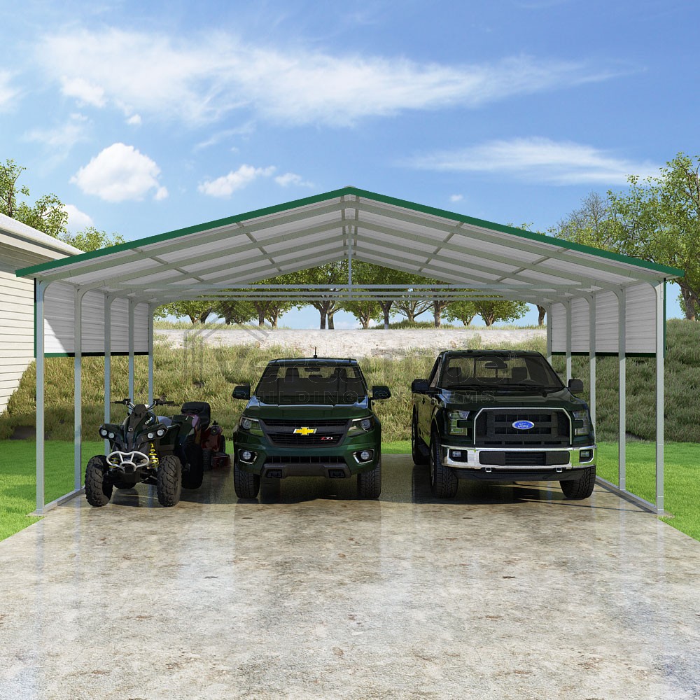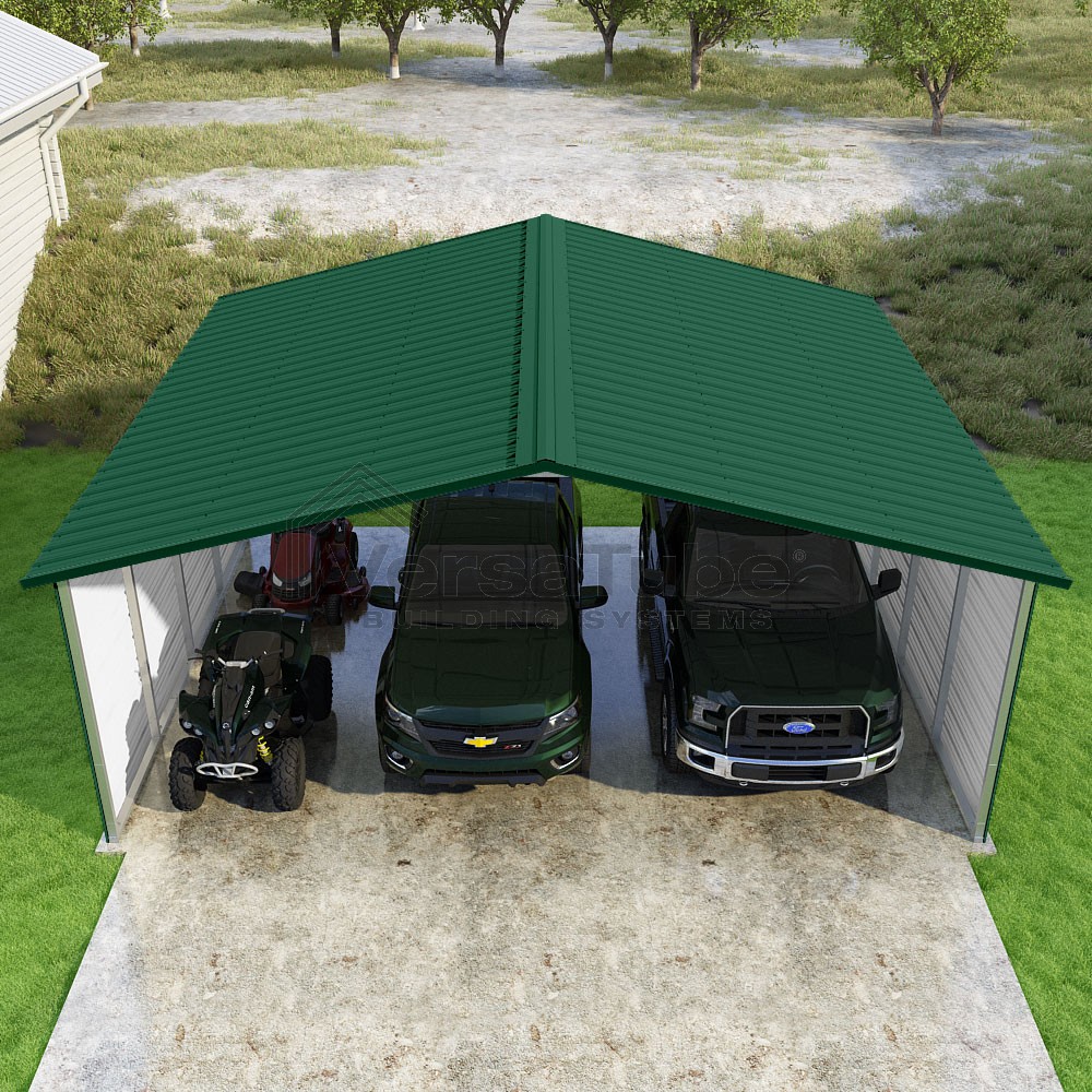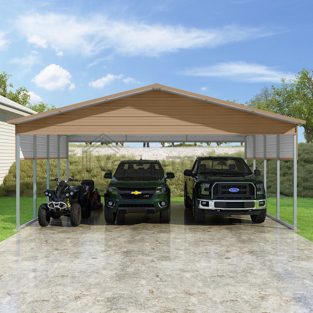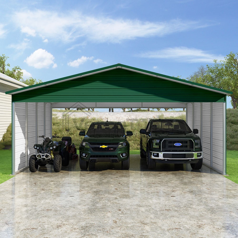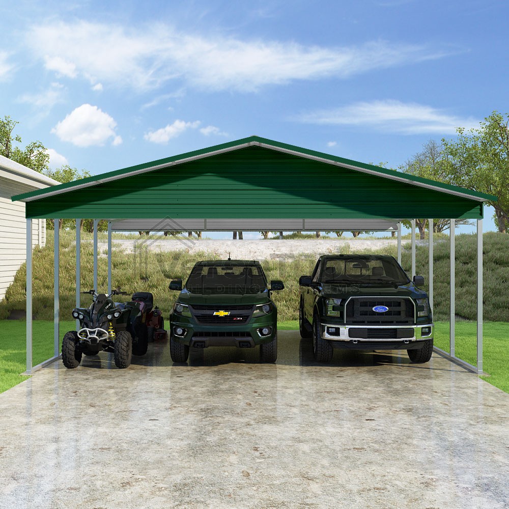 Pinnacle Series DIY carport kit features vertical sheet metal roof panels with ridge cap, gable and eave trim for an A-frame roof style and extended coverage on both ends.