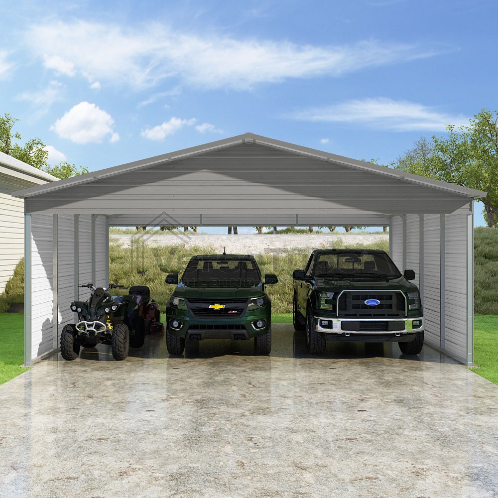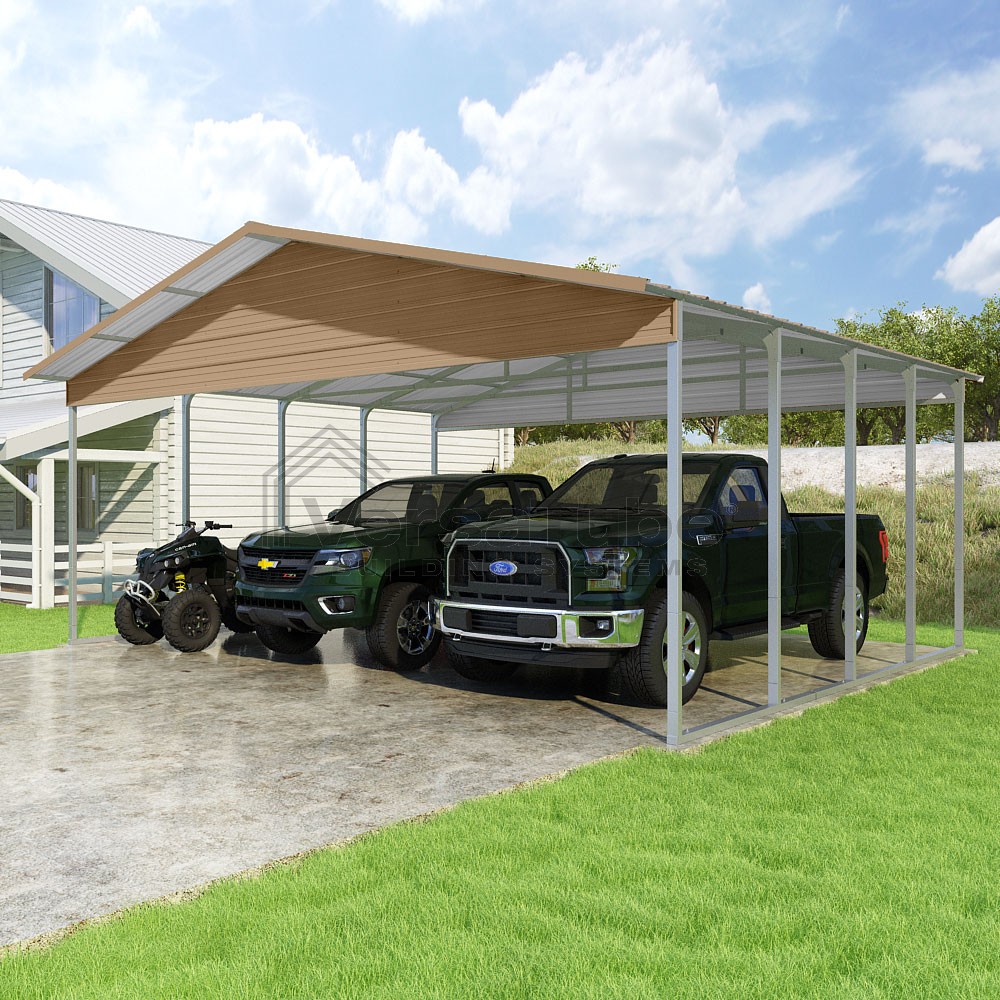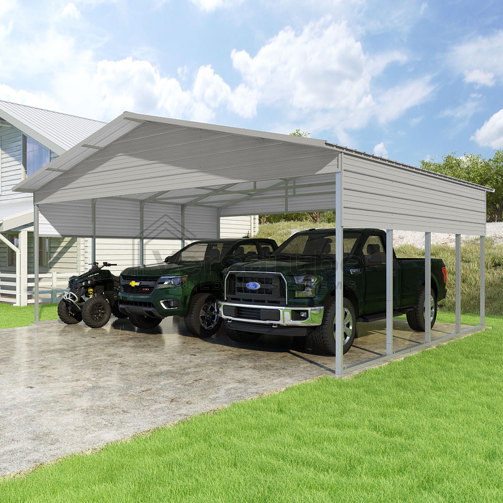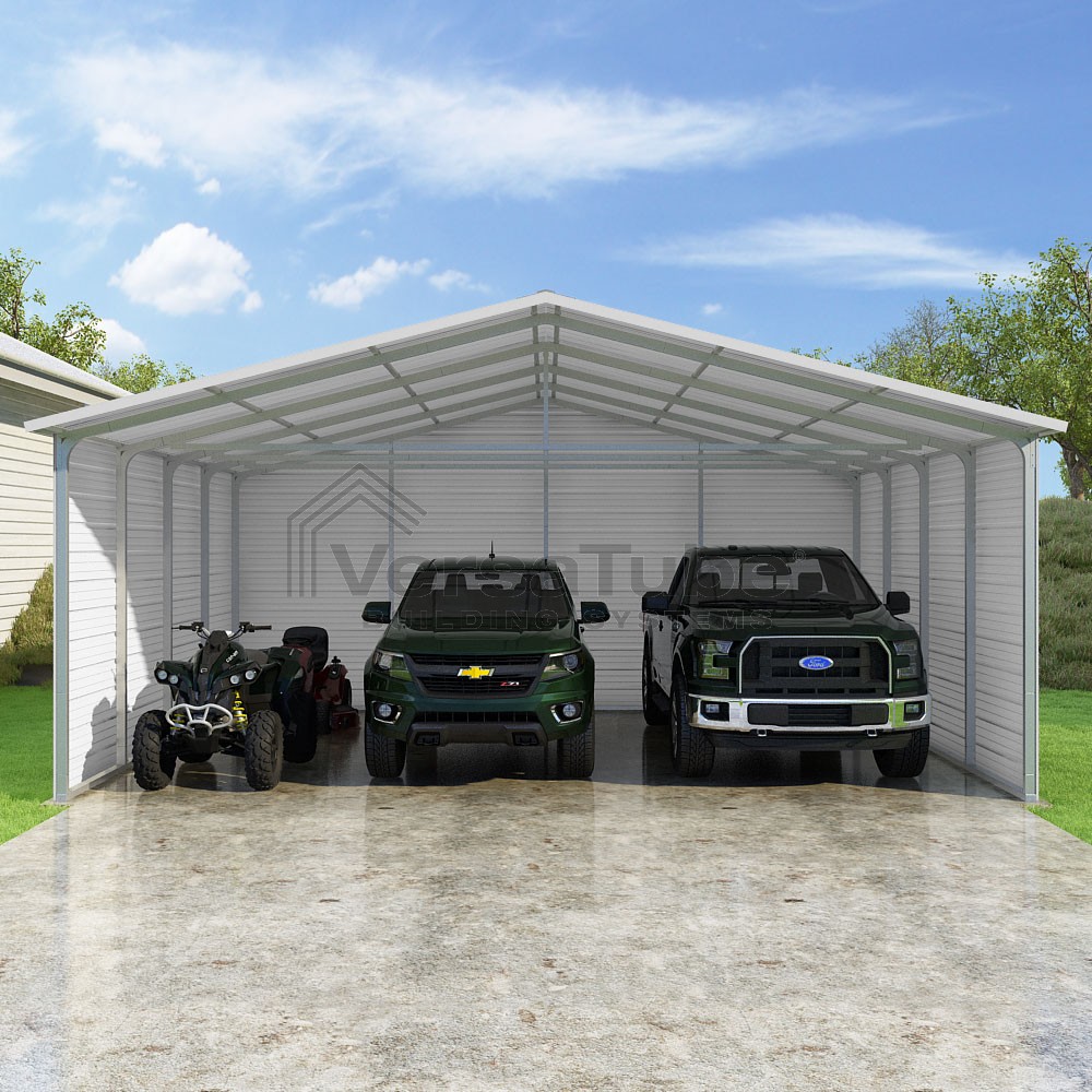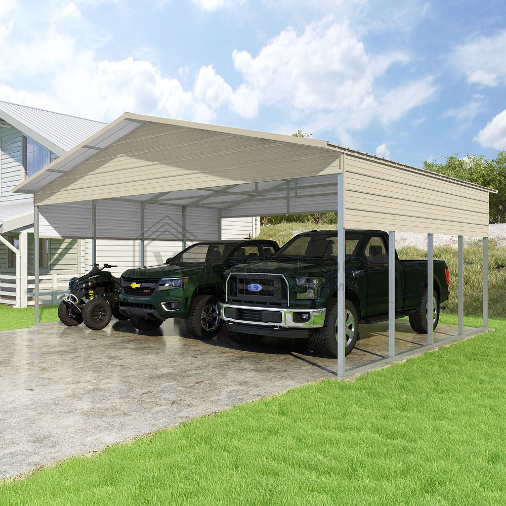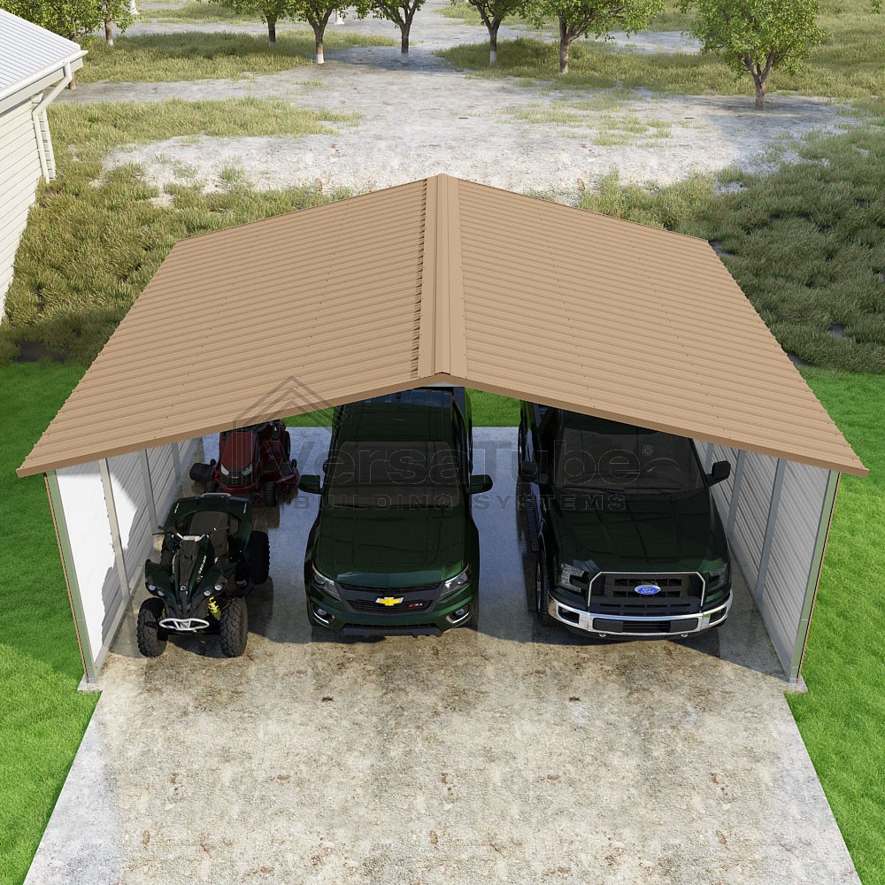 Pinnacle Series DIY carport kit features vertical sheet metal roof panels with ridge cap, gable and eave trim for an A-frame roof style and extended coverage on both ends.