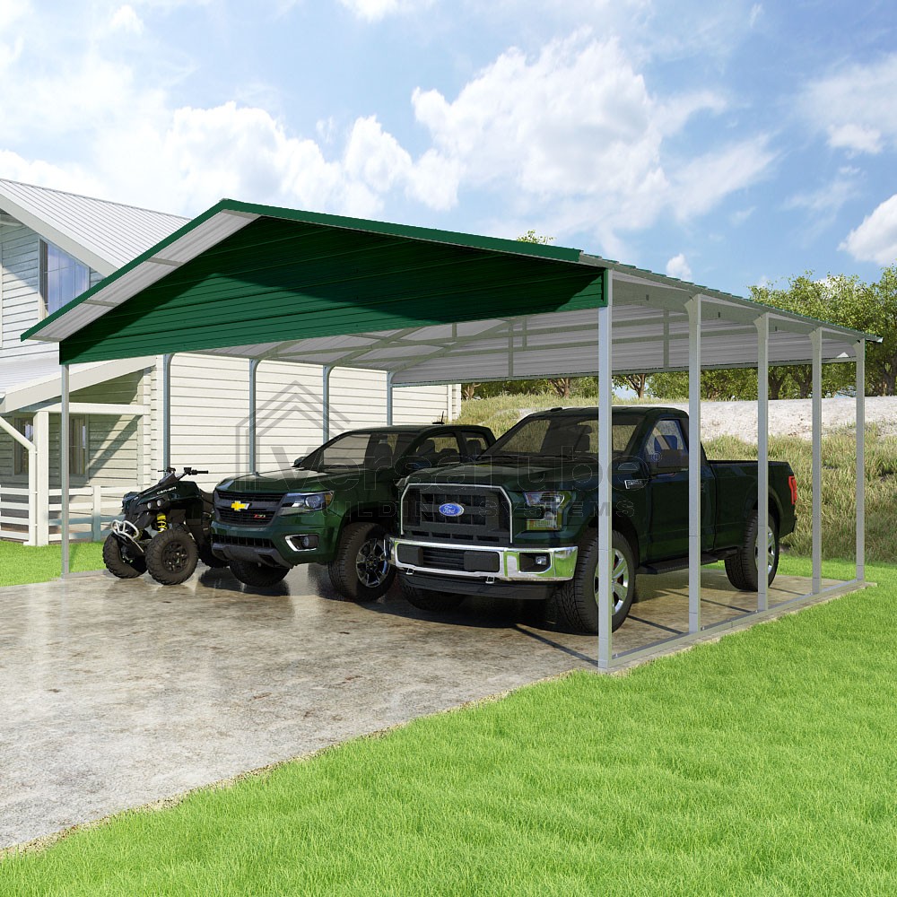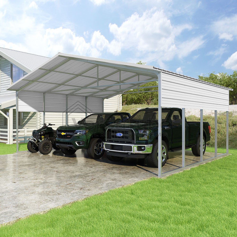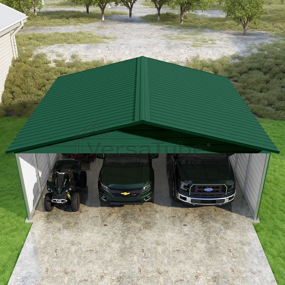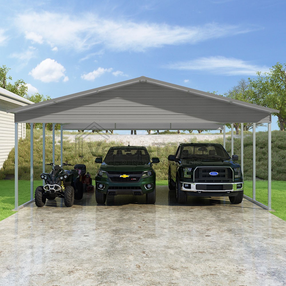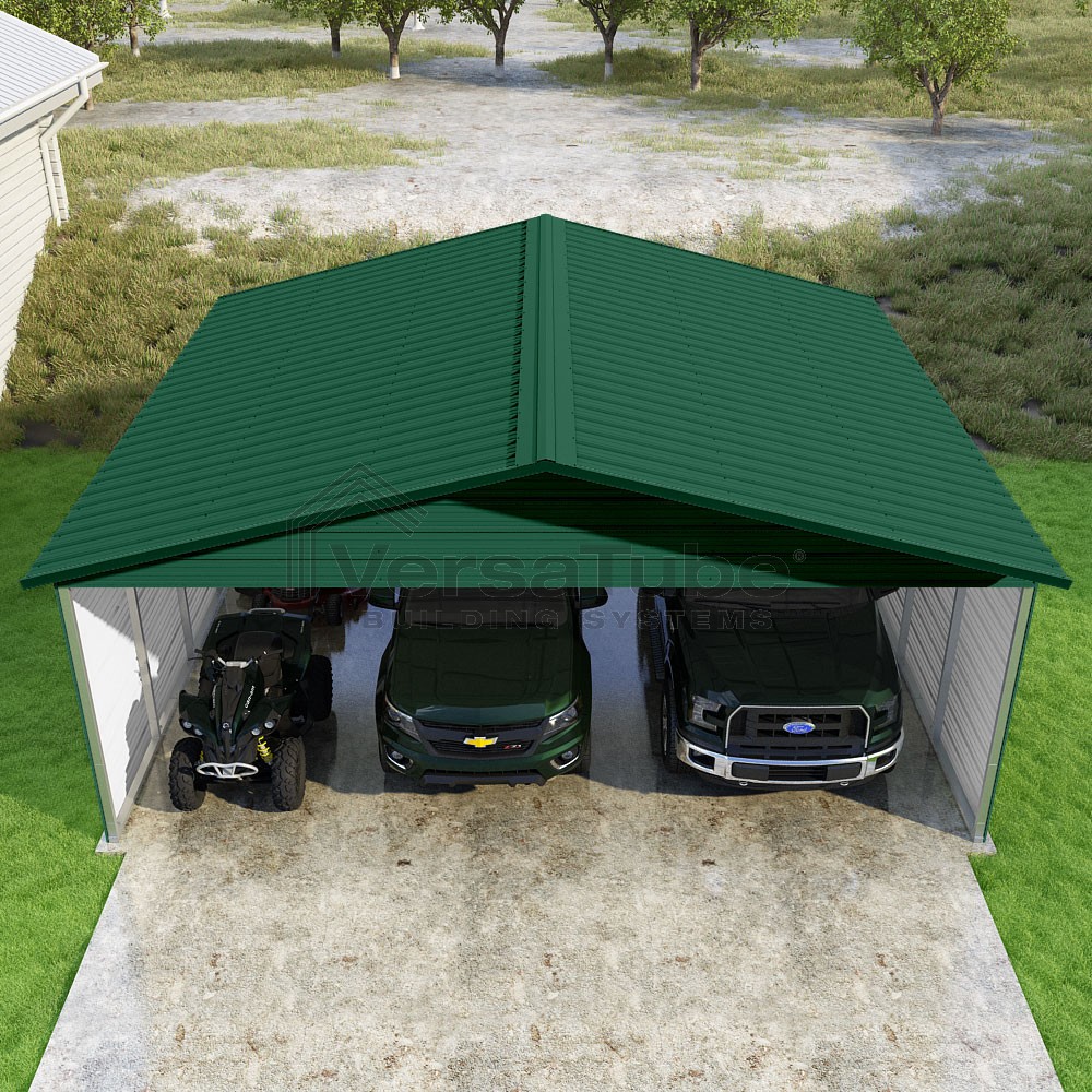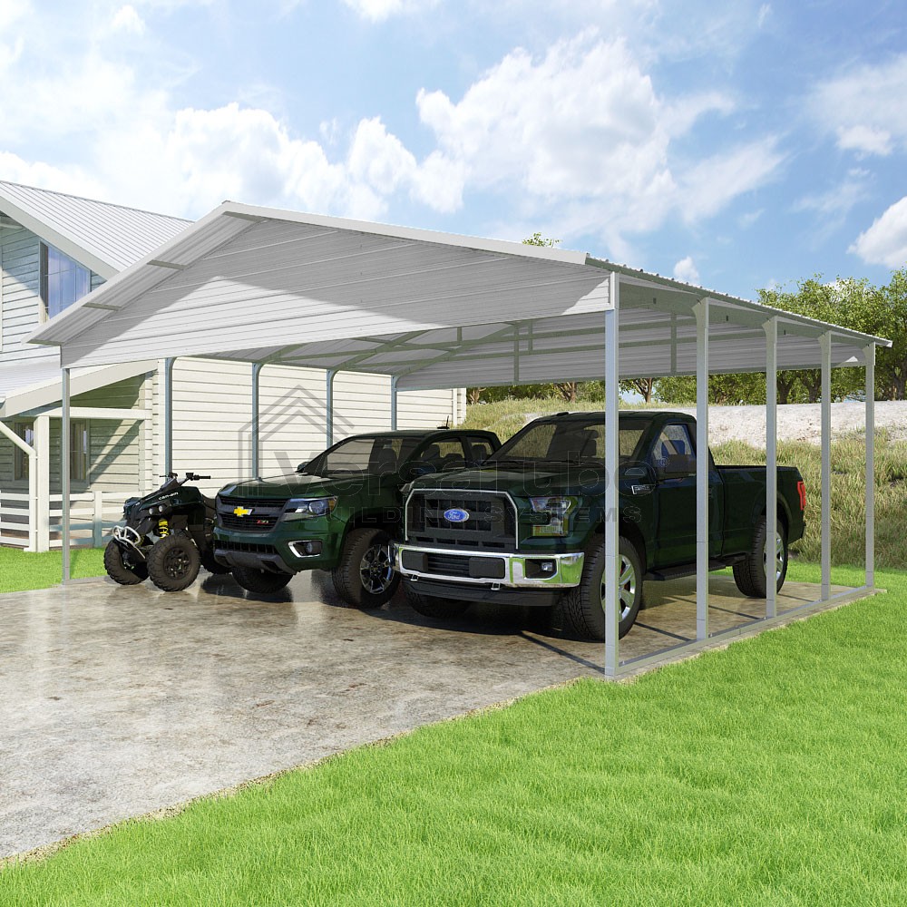 Pinnacle Series DIY carport kit features vertical sheet metal roof panels with ridge cap, gable and eave trim for an A-frame roof style and extended coverage on both ends.