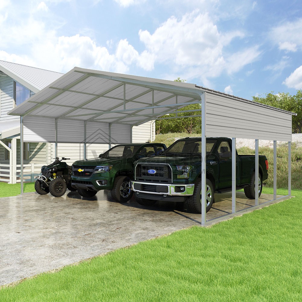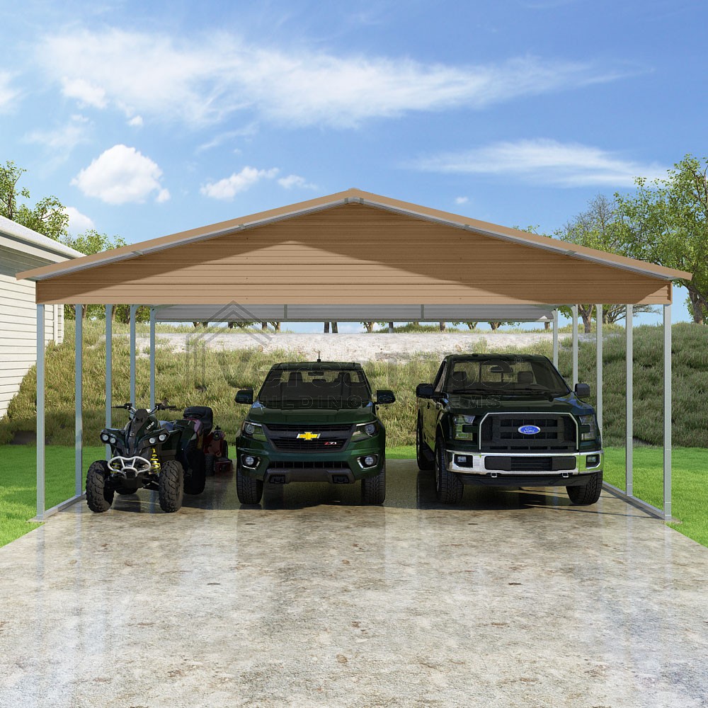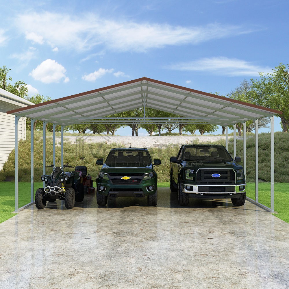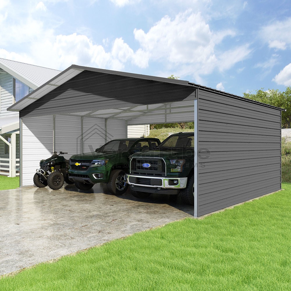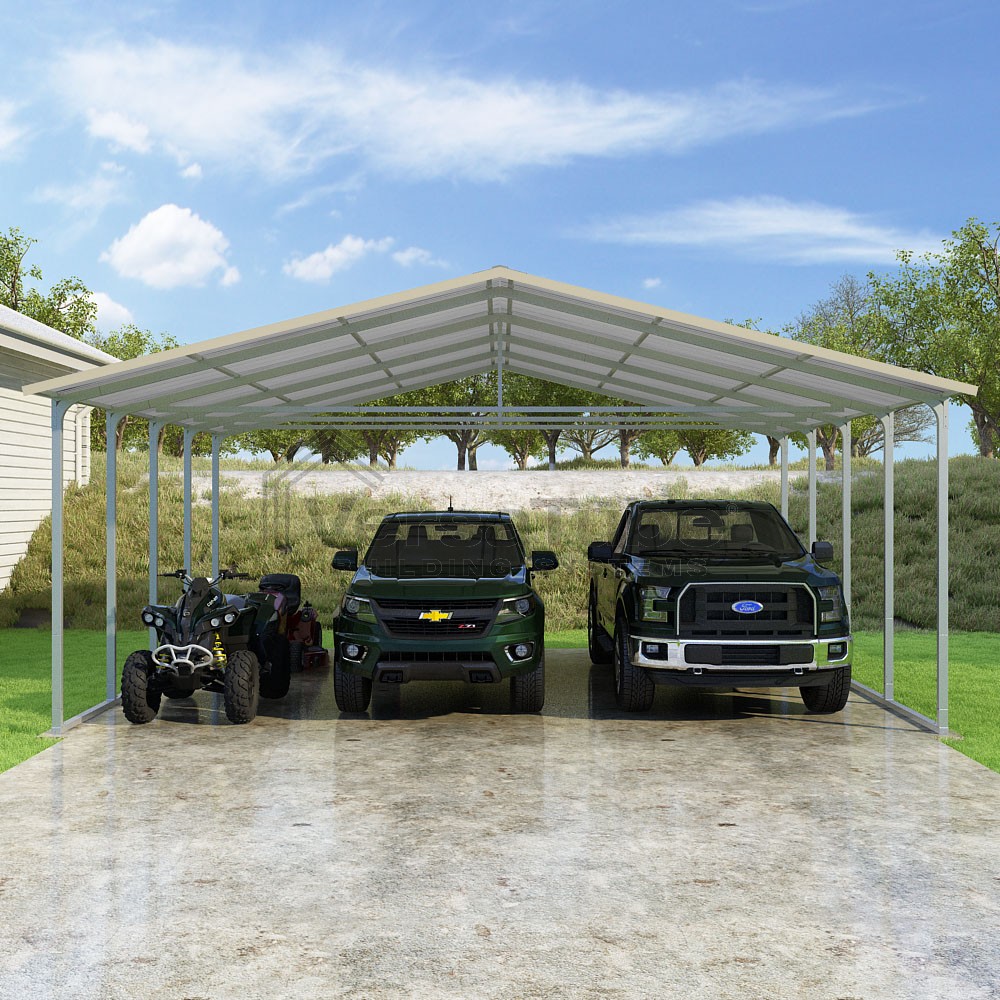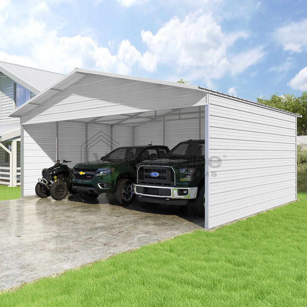 Pinnacle Series DIY carport kit features vertical sheet metal roof panels with ridge cap, gable and eave trim for an A-frame roof style and extended coverage on both ends.