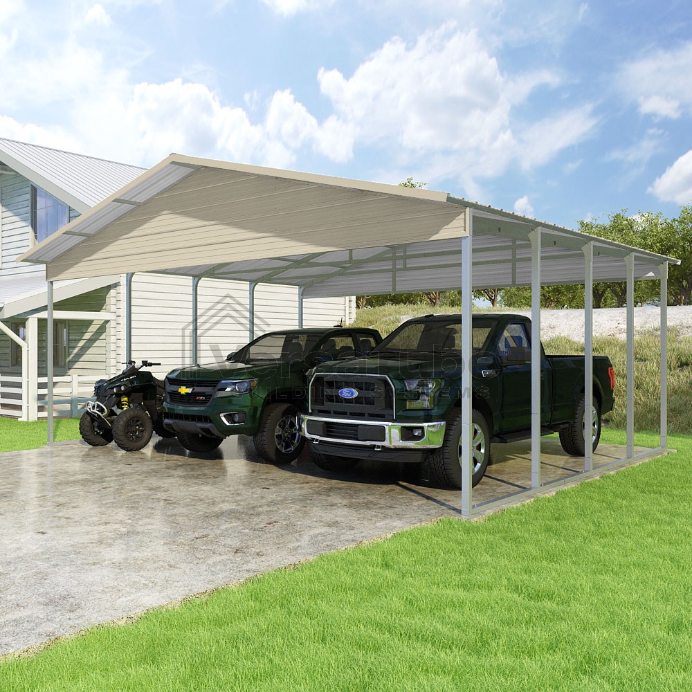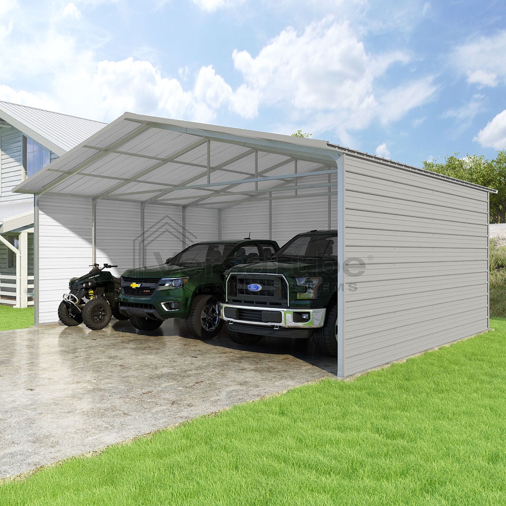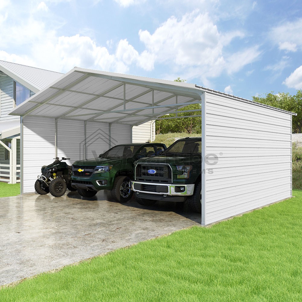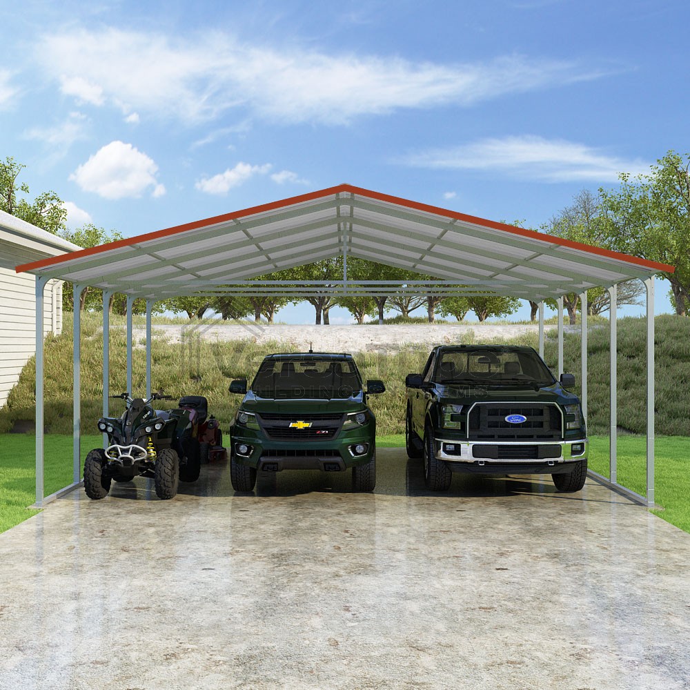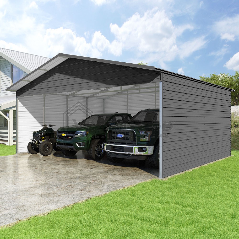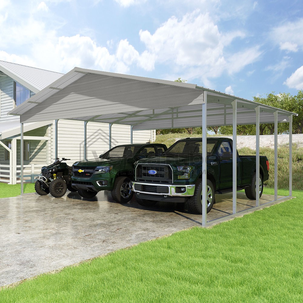 Pinnacle Series DIY carport kit features vertical sheet metal roof panels with ridge cap, gable and eave trim for an A-frame roof style and extended coverage on both ends.