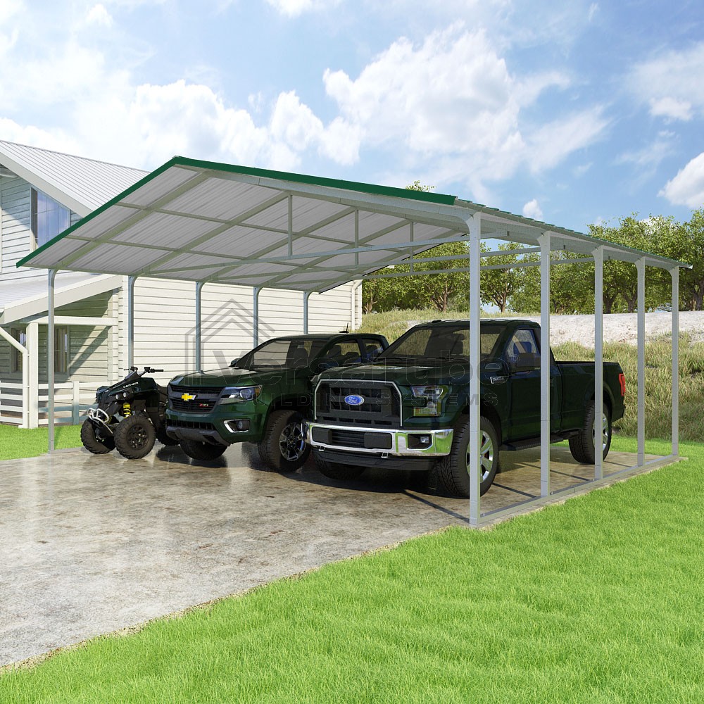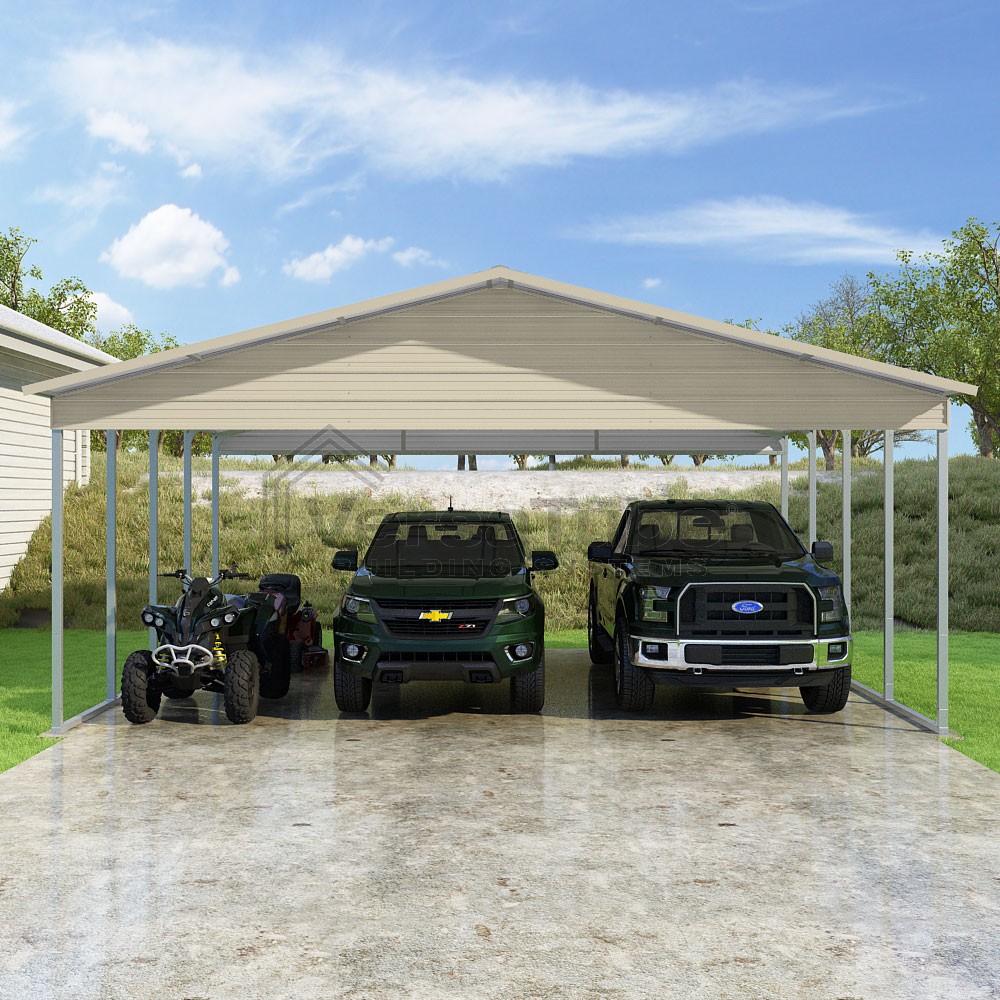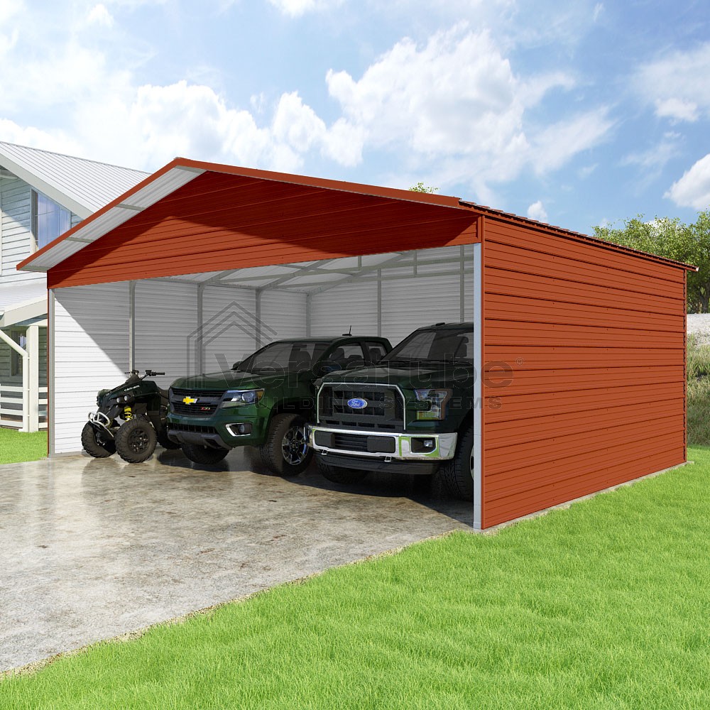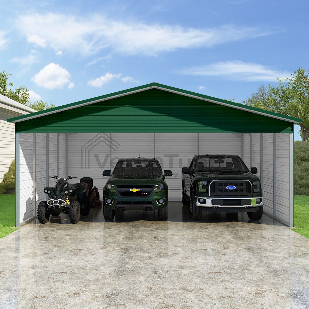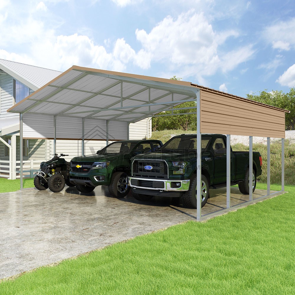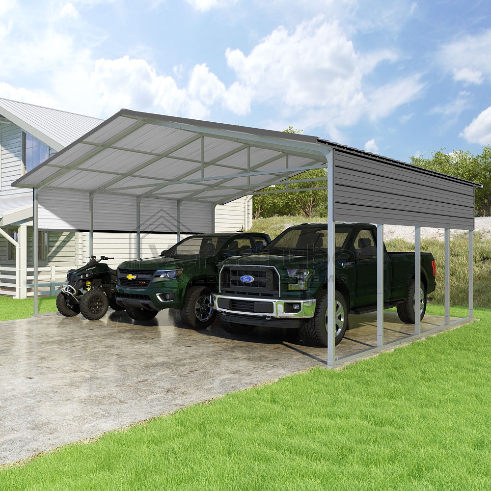 Pinnacle Series DIY carport kit features vertical sheet metal roof panels with ridge cap, gable and eave trim for an A-frame roof style and extended coverage on both ends.